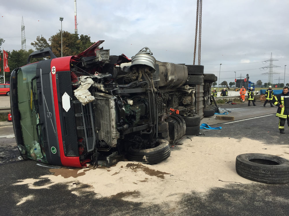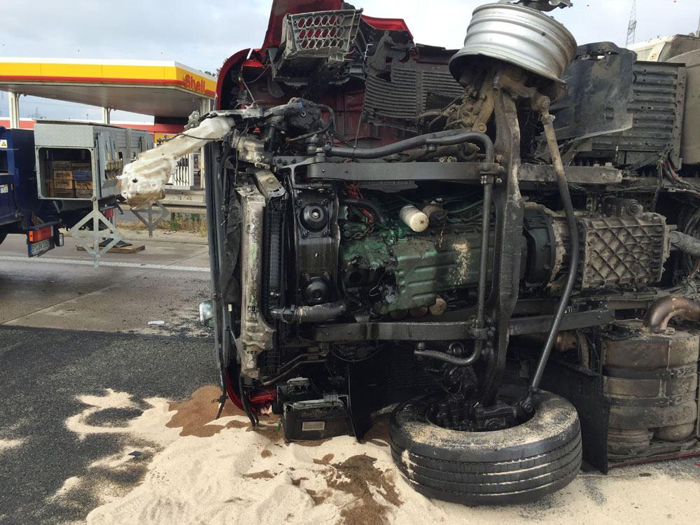 Sämtliche Fahrzeuginsassen hatten sich bereits vor Eintreffen der Feuerwehr aus den Fahrzeugen befreit, waren jedoch teils verletzt und mussten vom Rettungsdienst behandelt und in Krankenhäuser transportiert werden. Durch den Unfall war die Ladung des LKW (ca. 60.000 große Dosen Haarspray) teilweise in Brand geraten und konnte jedoch sehr schnell durch die Einsatzkräfte gelöscht werden. Desweiteren wurden größere Mengen auslaufender Betriebsstoffe mittels Bindemittel abgestreut und mehrere hundert Liter Kraftstoff aus dem LKW abgepumpt. Nach Aufnahme der Unfallspuren durch eine spezielle Einheit der Polizei wurde der Sattelauflieger durch die Feuerwehr kontrolliert ent- und die Ladung in Container umgeladen. Im Anschluss konnten LKW und Sattelauflieger durch ein Bergungsunternehmen aufgerichtet und abgeschleppt werden.