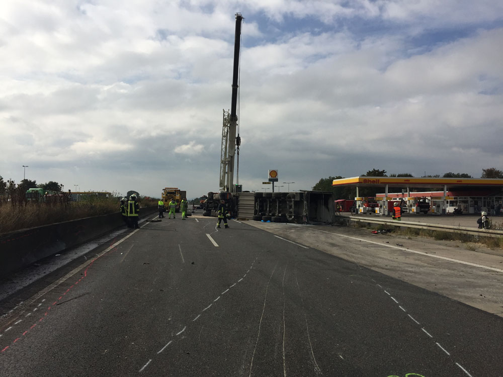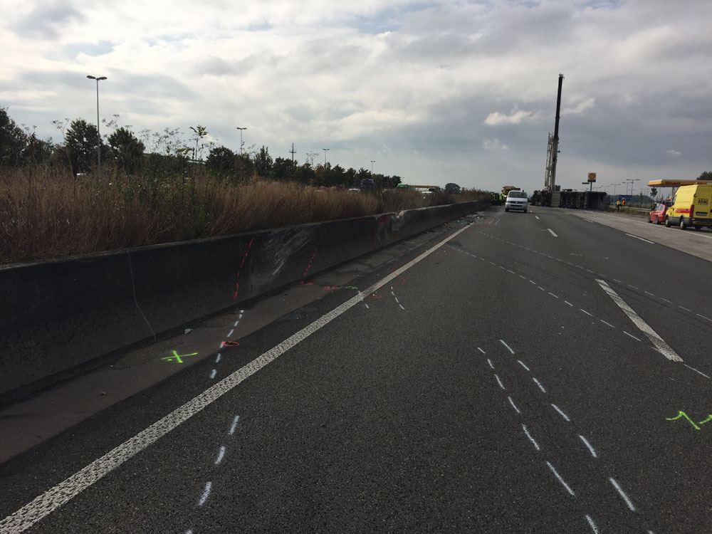Bei Eintreffen der ersten Feuerwehreinsatzkräfte an der Einsatzstelle auf Höhe der Raststätte Aachener Land zeigte sich eine großflächige und nicht zuletzt wegen der Dunkelheit teils unübersichtliche Einsatzstelle. Ein LKW lag inklusive seines Sattelaufliegers komplett über drei Spuren auf der Seite. Ein PKW befand sich stark beschädigt auf der gegenüberliegenden Richtungsfahrbahn. Weitere PKW und LKW waren über mehrere hundert Meter verteilt zum Stehen gekommen und teilweise ebenfalls massiv beschädigt.