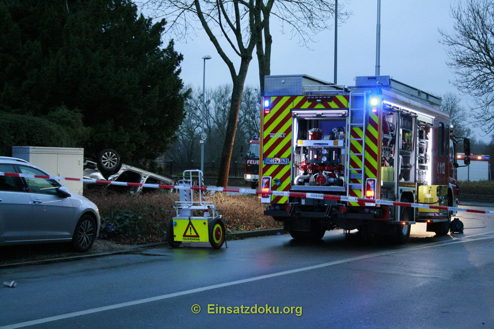 Die Feuerwehr Eschweiler wurde zu einem Verkehrsunfall mit eingeklemmter Person auf Höhe des Kreisverkehrs Wardener Straße/Kinzweiler Straße alarmiert. Ein PKW-Fahrer war mit seinem Fahrzeug in den Kreisverkehr gefahren und hatte sich dann überschlagen. Der Fahrer befand sich bei Eintreffen der ersten Einsatzkräfte noch im PKW, war jedoch nicht eingeklemmt. Gemeinsam mit dem Rettungsdienst wurde eine „patientenorientierte Rettung“ abgestimmt. Hierzu wurden einzelne Türen des Fahrzeuges entfernt und der Patient dann schonend aus dem verunfallten PKW herausgeholt. Der schwer verletzte PKW-Fahrer wurde dann mit dem Rettungswagen in ein Krankenhaus zur weiteren Behandlung gebracht.
