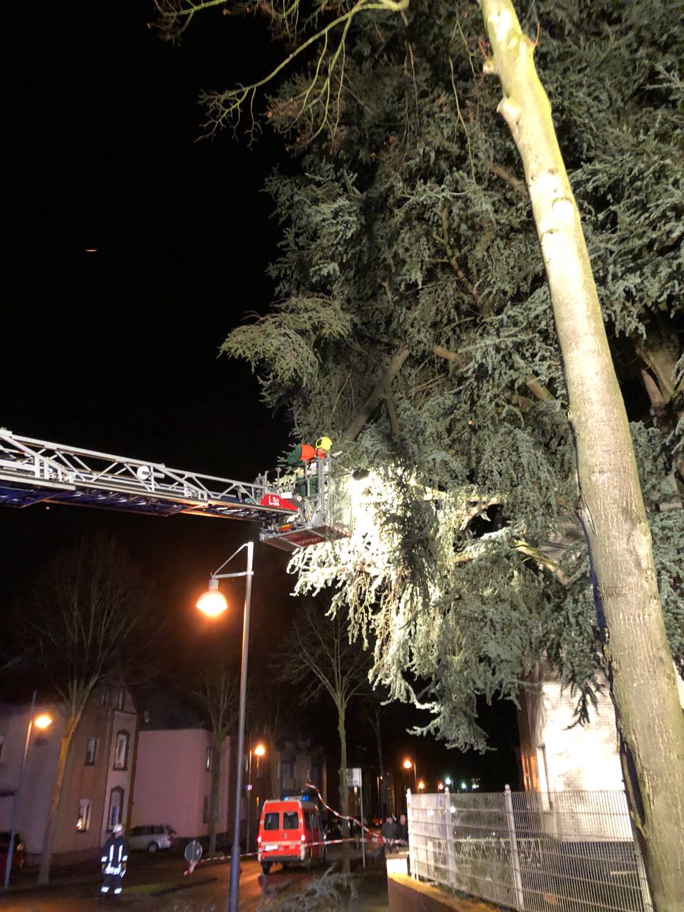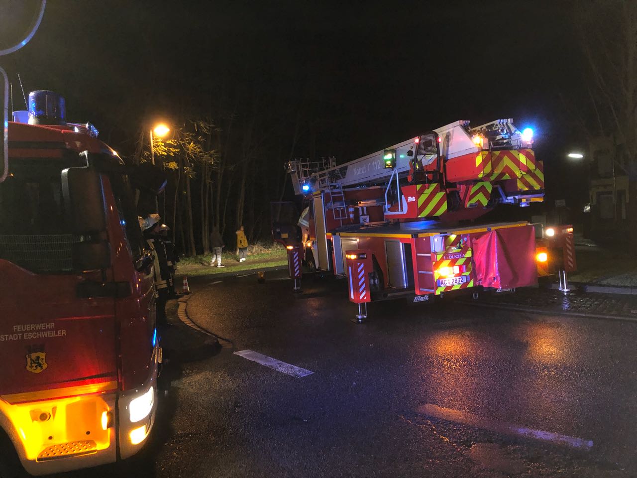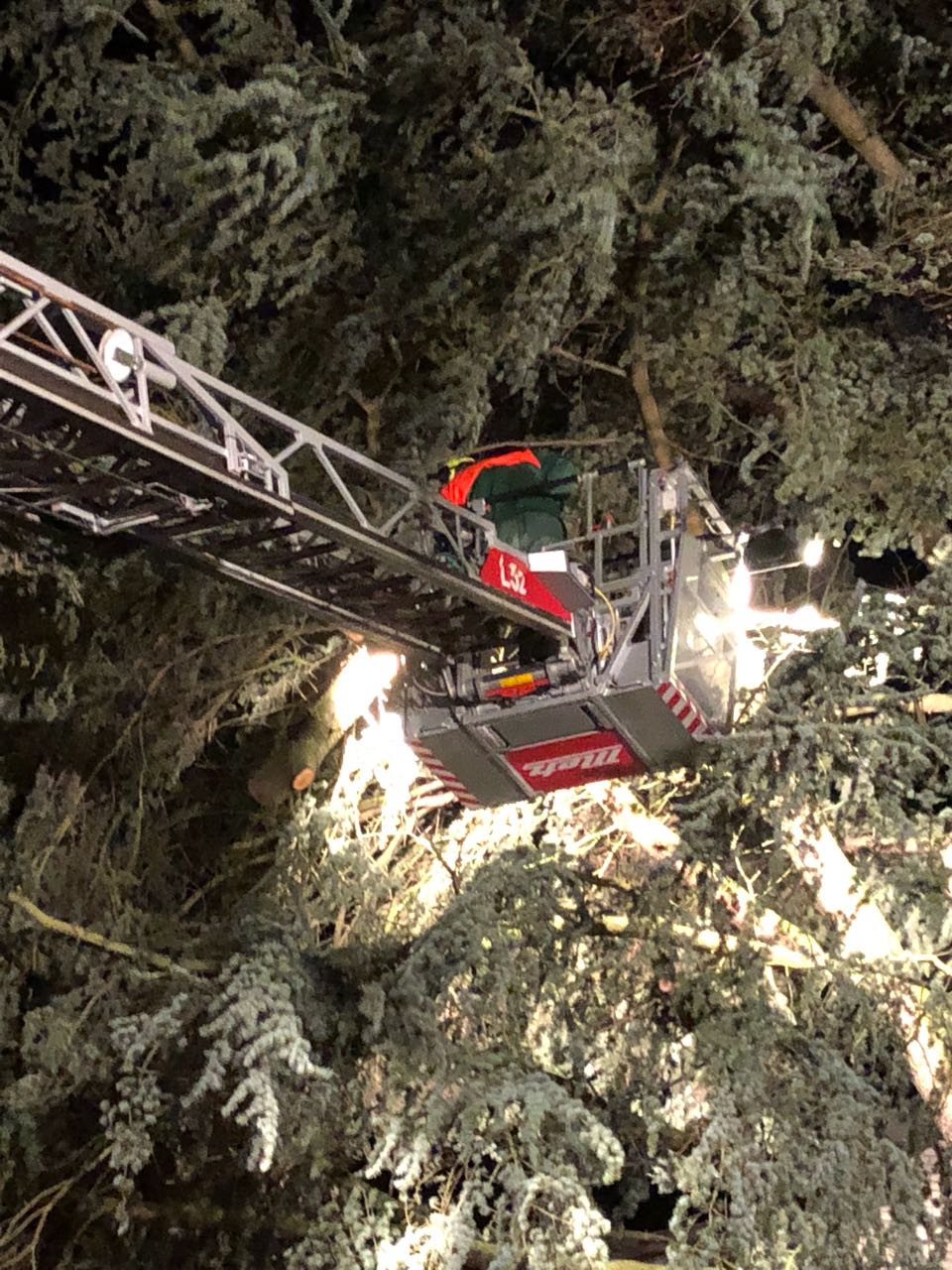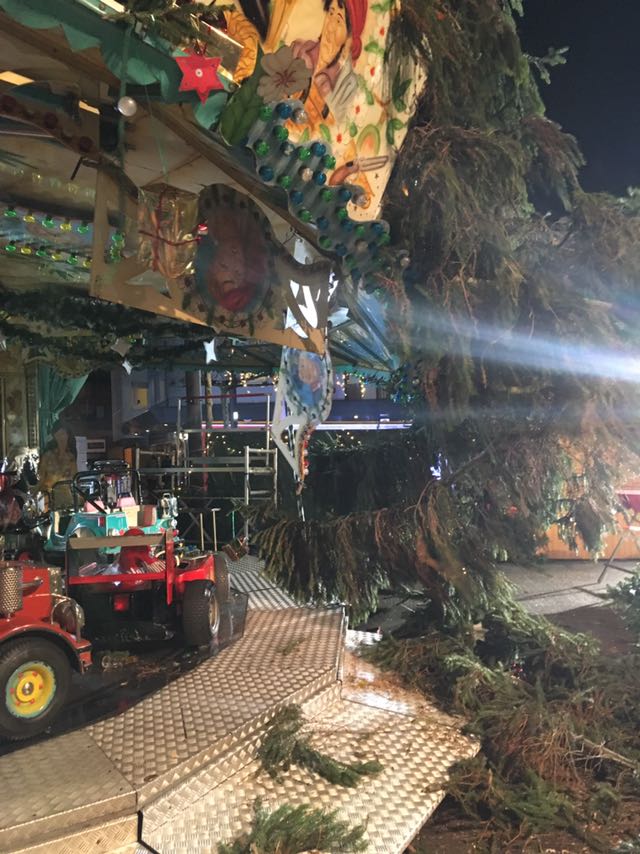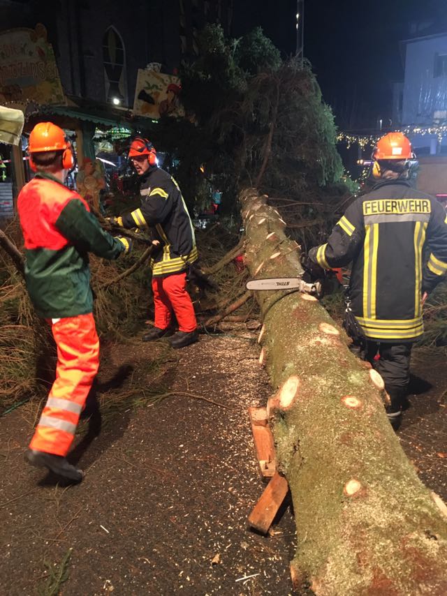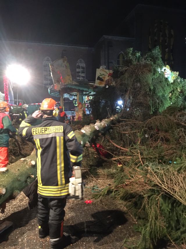 Der ca. 15 m hohe Weihnachtsbaum auf dem Marktplatz war aus noch nicht geklärter Ursache umgestürzt und teilweise auf einem Kinderkarussel zum liegen gekommen. Insgesamt wurden sechs Personen verletzt, vor Ort medizinisch versorgt und 4 Stück in Krankenhäuser gebracht. Eine weitere leicht verletzte Person begab sich selbständig ins Krankenhaus Eschweiler. Nach Absicherung und Ausleuchtung der Einsatzstelle wurde die Polizei zunächst bei der Unfall- und Beweisaufnahme unterstützt. Nach der Freigabe des Baumes durch die Kriminalpolizei zerlegten die Einsatzkräfte den umgestürzten Baum und räumten den betroffenen Bereich frei. Gegen 22:00 Uhr war der Einsatz für die Feuerwehr Eschweiler beendet.