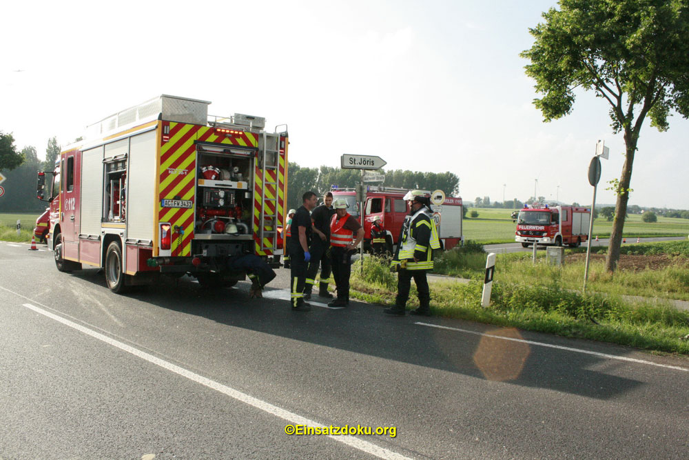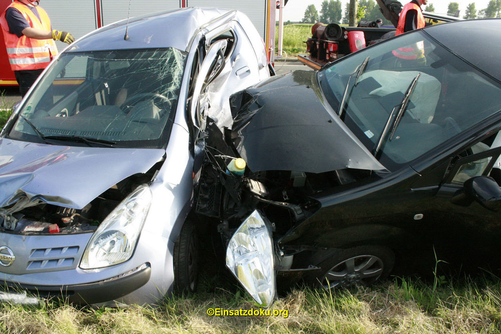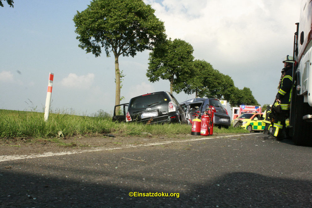 Der Feuerwehr wurde über Notruf ein Verkehrsunfall mit eingeklemmter Person gemeldet. Vor Ort fanden die Einsatzkräfte zwei PKW im Straßengraben vor. Eine Person war bereits von Ersthelfern vor Ort aus ihrem PKW gerettet worden.