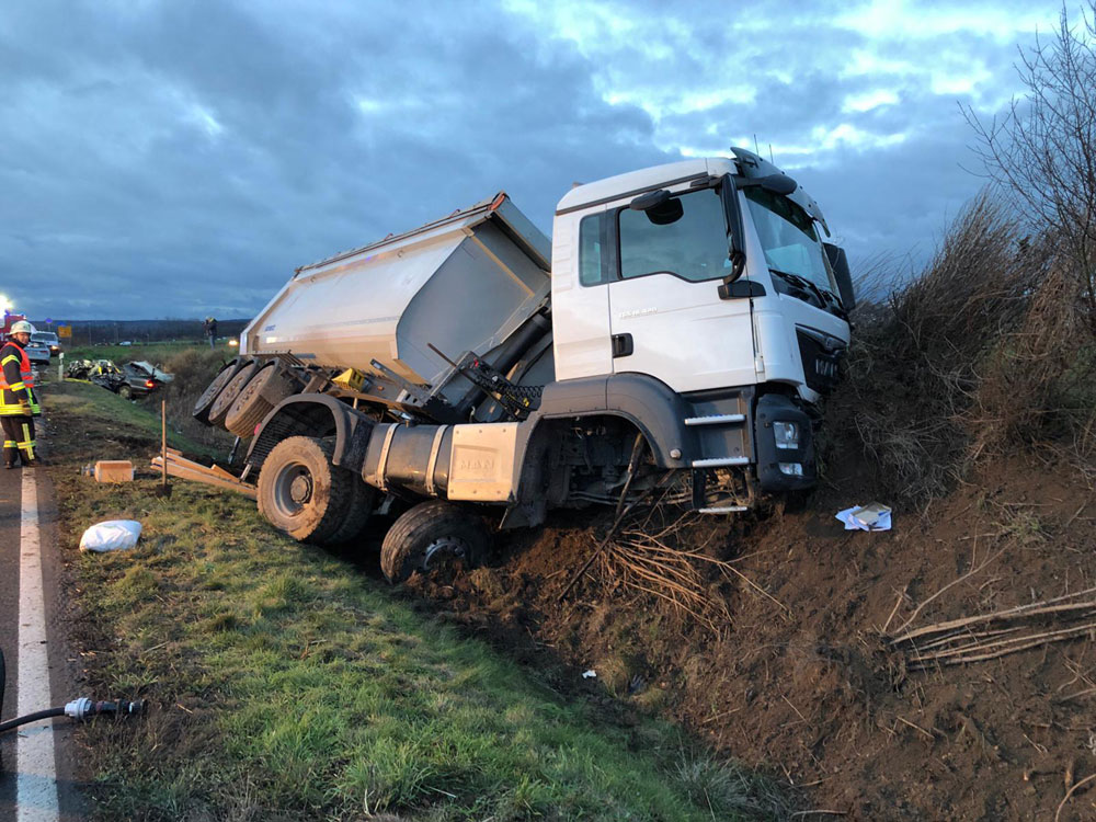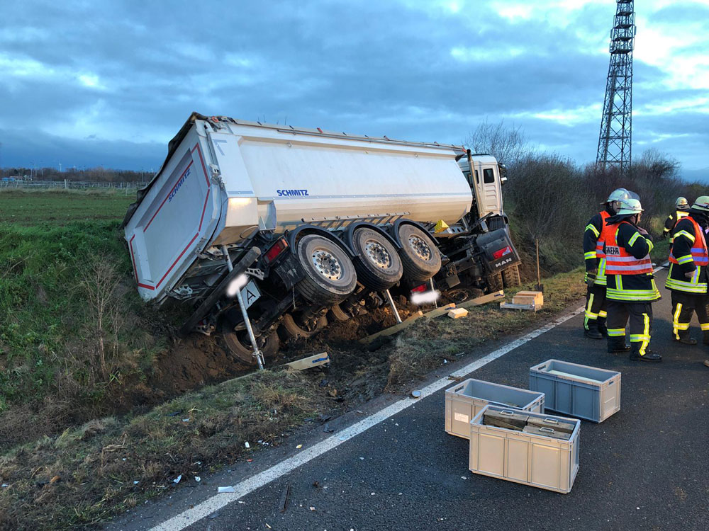 Vor Ort fanden die Einsatzkräfte einen PKW und einen LKW im Graben vor. Unverzüglich wurden die Löschzüge 31 und 42 ebenfalls zur Einsatzstelle alarmiert und die Löschzüge 11 und 12 zur Sicherstellung des Grundschutzes auf die Feuerwache geordert. Im LKW war der schwer verletzte Fahrer eingeschlossen, aber nicht eingeklemmt. Er konnte über eine Rettungsplattform aus dem Fahrzeug gerettet und dem Rettungsdienst zum Transport ins Krankenhaus übergeben werden.