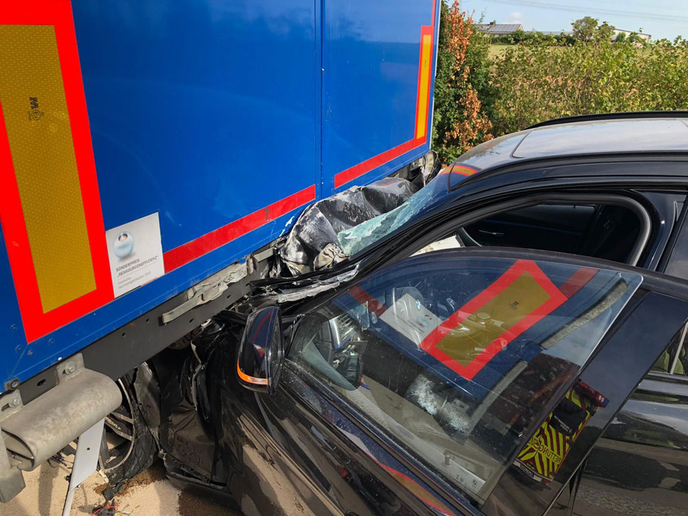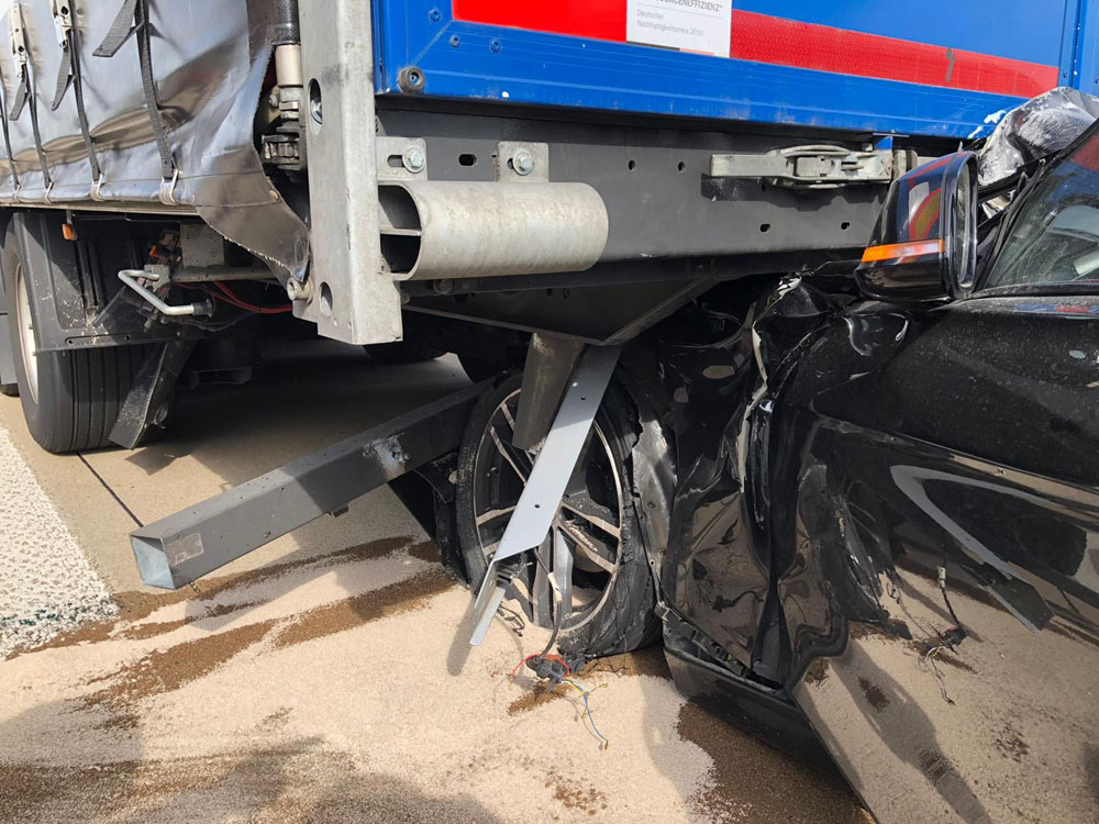 Vor Ort stellten die Einsatzkräfte fest, dass ein PKW auf den Sattelauflieger eines LKW gefahren war und sich dort bis an die Windschutzscheibe verkeilt hatte. Der LKW-Fahrer hatte den Unfall nicht korrekt zugeordnet und war noch einige 100 Meter weiter gefahren, bis er von anderen Verkehrsteilnehmern gestoppt wurde. Der Fahrer des PKW war nicht im Fahrzeug eingeklemmt, jedoch schwer verletzt. Nach Erstversorgung durch Notarzt und Rettungsdienst wurde er in ein Krankenhaus gefahren. Der Fahrer des LKW blieb unverletzt.