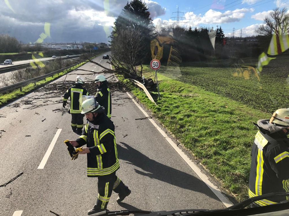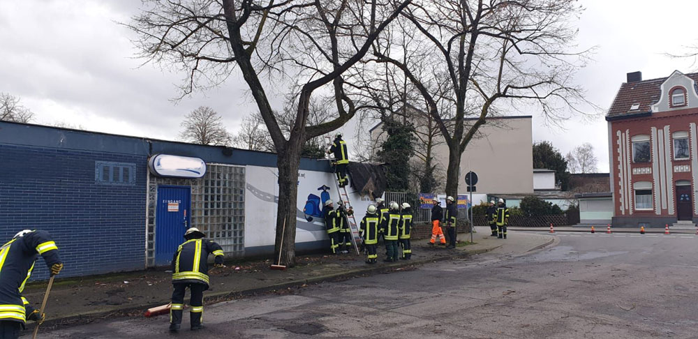 Die Feuerwehr Eschweiler verschonte es leider auch nicht vollkommen. Auf einer Einsatzfahrt wurde von Sturmböen ein Rettungsboot vom Dach eines Feuerwehrfahrzeuges geweht – die Halterung hatte den schweren Böen nicht standgehalten. Das Boot konnte jedoch wieder aufgenommen und befestigt werden.