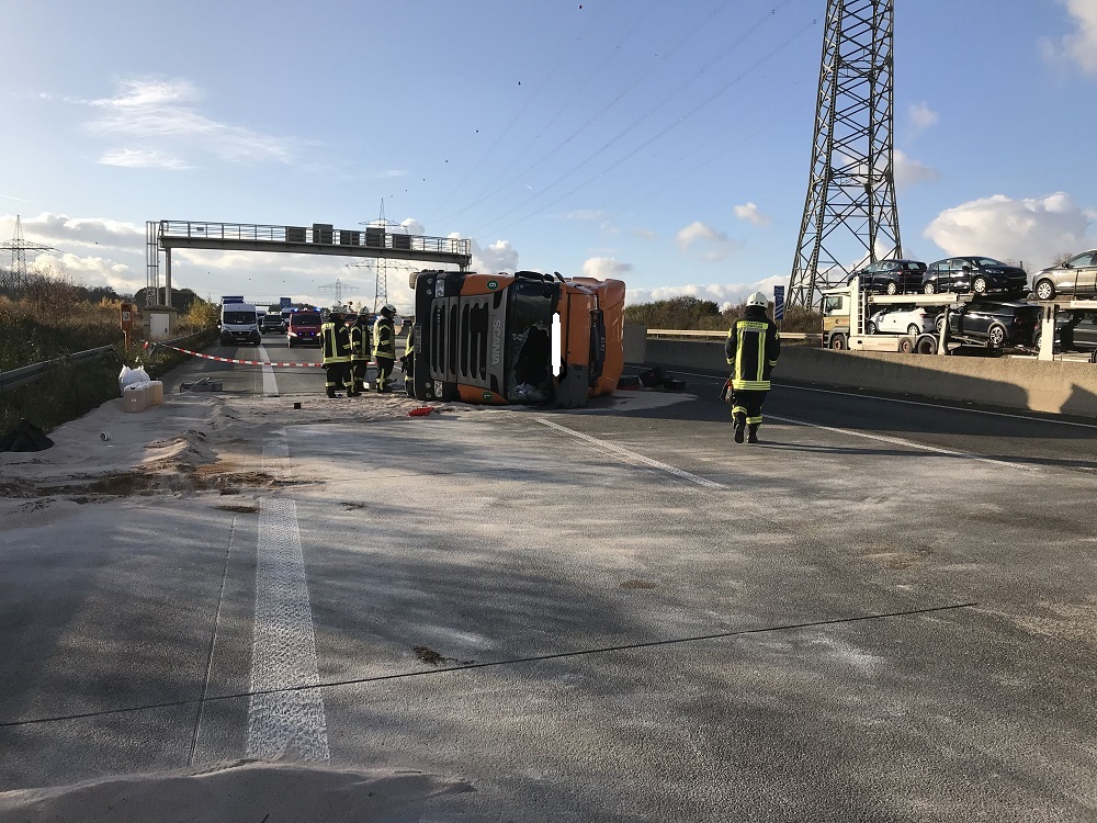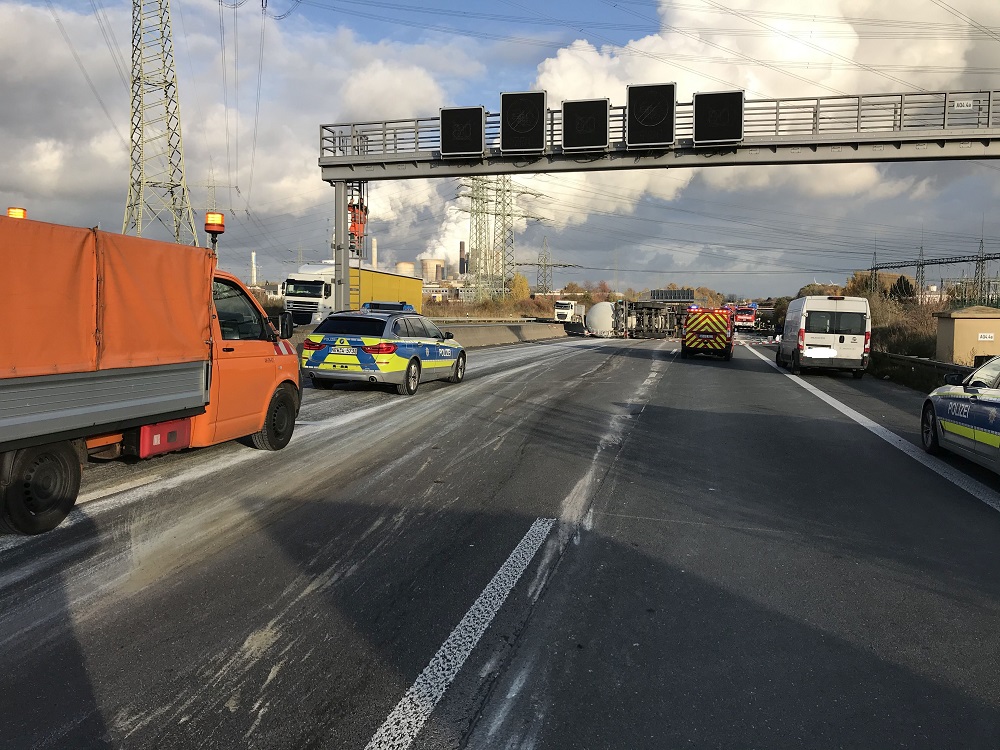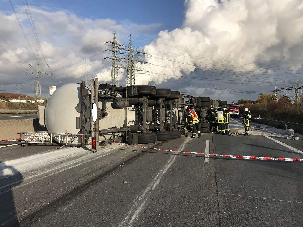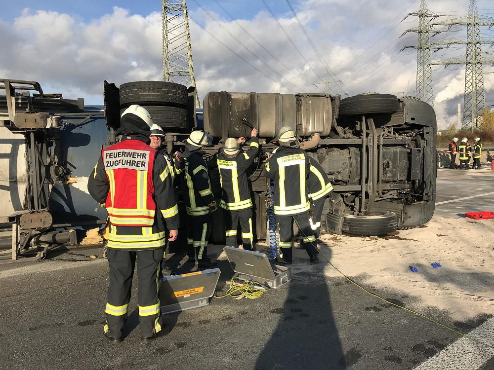Bei Eintreffen an der Einsatzstelle fanden die Einsatzkräfte um Einsatzleiter OBR Axel Johnen einen Silo-Tankzug vor, der auf der Fahrerseite liegend alle drei Fahrstreifen der Autobahn blockiert. Der Fahrer konnte bereits vor Eintreffen der Einsatzkräfte der Feuerwehr über die zerstörte Windschutzscheibe seines Fahrzeuges befreit werden und wurde unmittelbar zur medizinischen Behandlung in einen Rettungswagen gebracht.