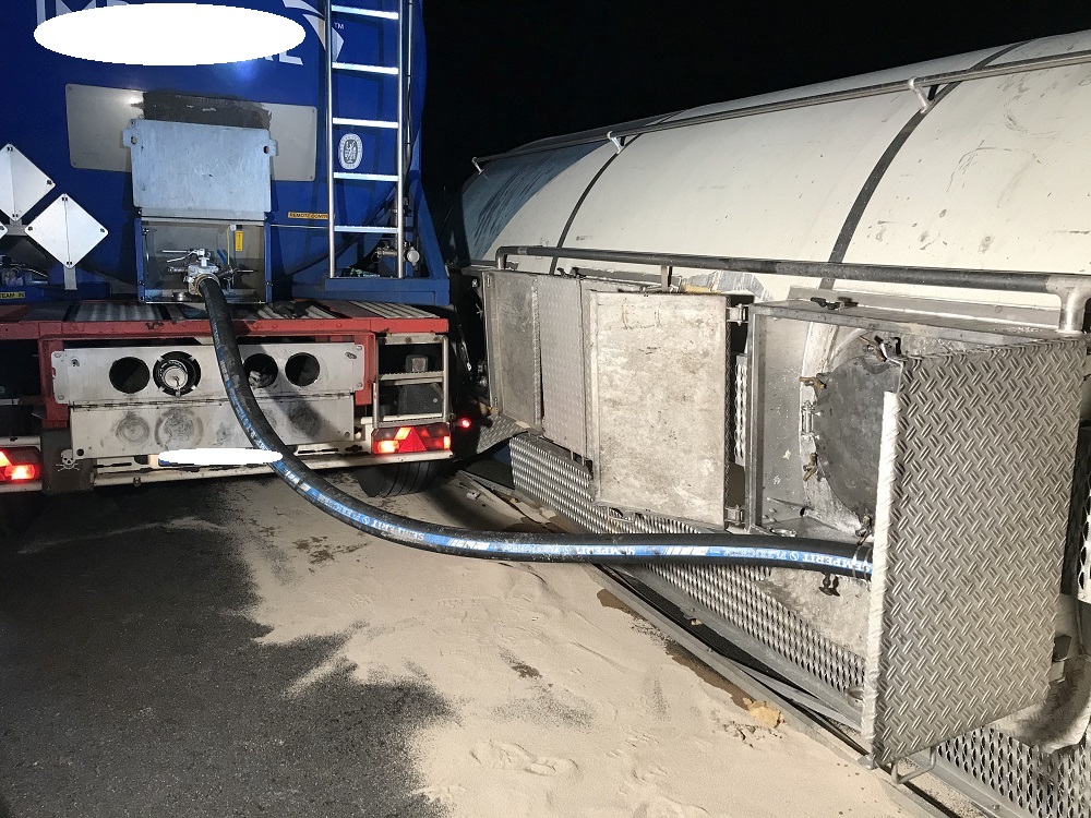 Bis zum Eintreffen der Spedition mit einem Ersatzfahrzeug wurde die Einsatzstelle weiter abgesichert und der Umfüllvorgang vorbereitet. Durch ein Bergungsunternehmen wurde die Zugmaschine schon abgeschleppt.