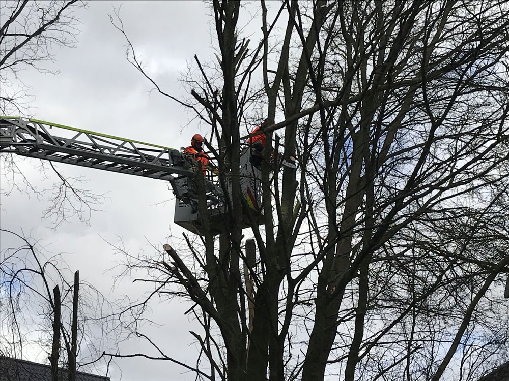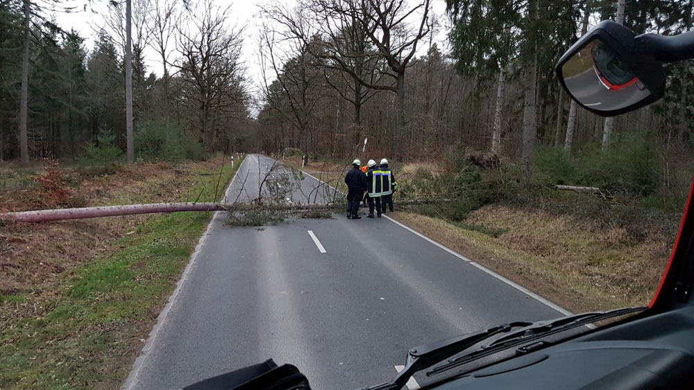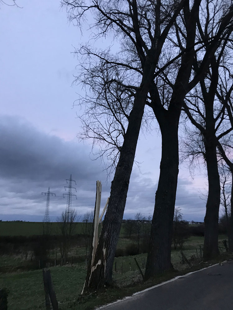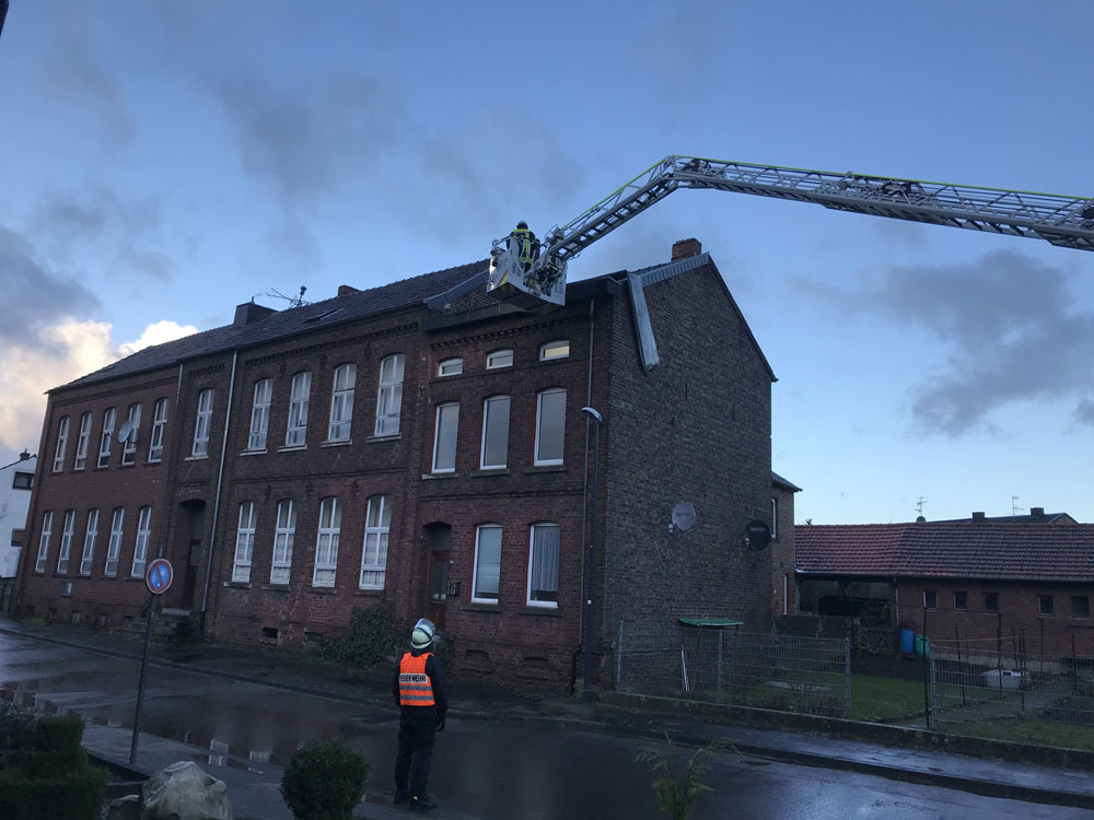 Am Sonntag um 11:48 Uhr erfolgte dann der erste wetterbedingte Einsatz. Ein ca. 7 m langer Ast war auf der Stolberger Straße abgebrochen und auf Fußweg bzw. Fahrbahn gefallen. Die Kräfte der hauptamtlichen Wache beseitigten die Gefahrenstelle umgehend. In den folgenden zwei Stunden folgten noch wenige weitere Gefahrenstellen (umgestürzte Bäume, herabstürzende Dachteile), bevor um 13:52 Uhr der Löschzug Weisweiler als erste freiwillige Einheit alarmiert wurde. Ab dann ging es Schlag auf Schlag und bis ca. 17 Uhr wurden mit und mit alle freiwilligen Löschzüge der Feuerwehr Eschweiler alarmiert.