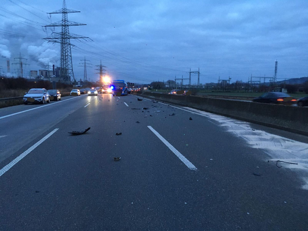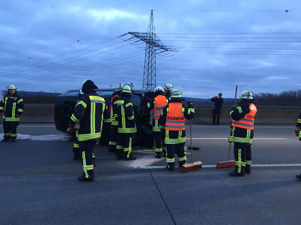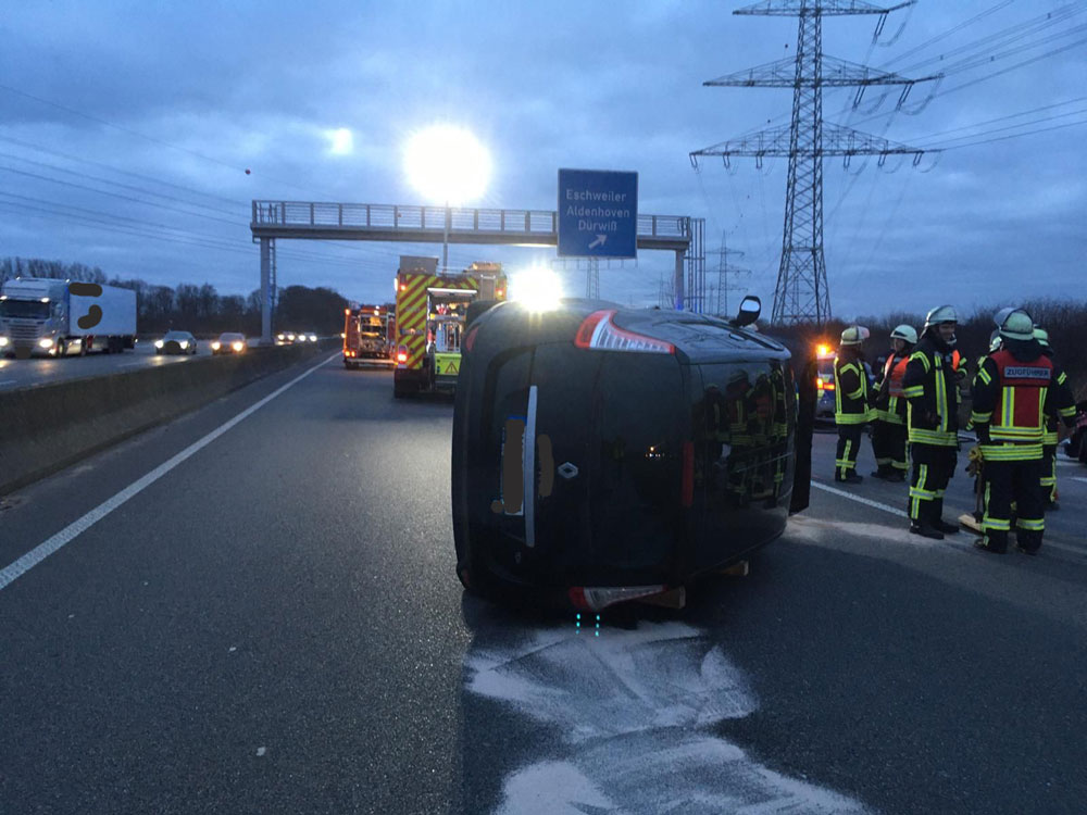 Um kurz vor 17:30 Uhr wurde der Feuerwehr ein schwerer Verkehrsunfall auf der BAB 4 in Fahrtrichtung Aachen gemeldet. Aufgrund der Meldung, dass sich noch Personen in einem PKW befinden sollten, wurden unverzüglich die hauptamtliche Feuerwache, der Löschzug Weisweiler, drei Rettungswagen und ein Notarzt alarmiert.