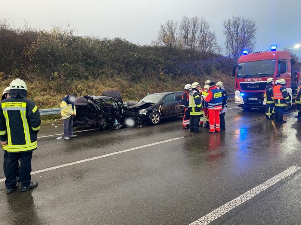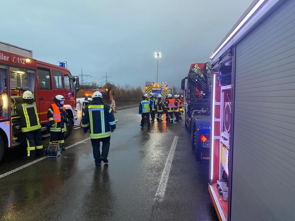Um circa 07:15 Uhr erreichte die Leitstelle der Städteregion Aachen ein Notruf, in dem ein schwerer Verkehrsunfall in diesem Straßenabschnitt in Fahrtrichtung Köln gemeldet wurde. Unverzüglich wurden durch die Leitstelle die zuständige Feuerwehr Eschweiler sowie ein Notarzt informiert/alarmiert. Durch die Einsatzzentrale der Feuerwehr Eschweiler wurden die hauptamtliche Feuer- und Rettungswache, der Löschzug Weisweiler, der A- und B-Dienst sowie drei Rettungswagen alarmiert und auf die Autobahn entsandt.