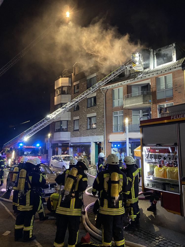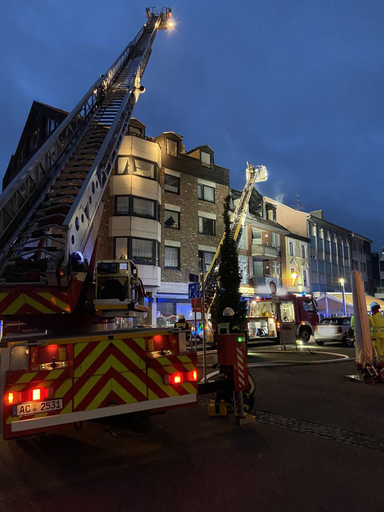 Um kurz vor 5:00 Uhr am Sonntagmorgen erreichte der Notruf über einen Zimmerbrand am Markt unsere Einsatzzentrale. Unverzüglich wurden die Kräfte der Feuer- und Rettungswache sowie der Löschzüge Stadtmitte alarmiert. Aufgrund weiterer Notrufe und der Meldung, dass eventuell noch Personen im Gebäude sein könnten, wurde das Alarmstichwort auf "Feuer mit Menschenleben in Gefahr" erhöht und die Löschzüge Weisweiler und Bohl alarmiert.