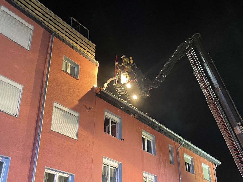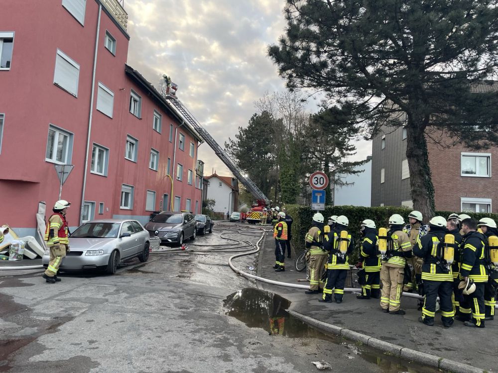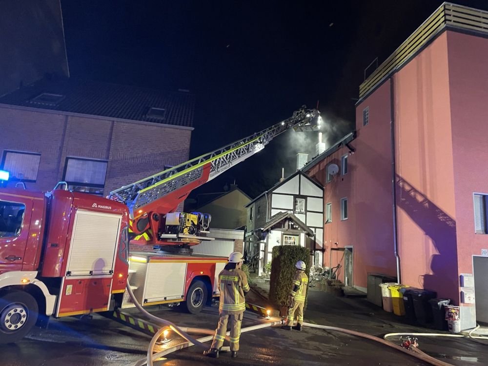 An der Einsatzstelle schlugen aus dem Dachstuhl eines Mehrfamilienreihenhauses bereits meterhohe Flammen. Glücklicherweise hatten sich alle Bewohner bereits vor unserem Eintreffen unverletzt aus dem Gebäude retten können. So konnten unverzüglich zwei Trupps einen Innenangriff beginnen. Gleichzeitig wurden beide Drehleitern in Position gebracht, um den Brand von außen zu bekämpfen. Relativ schnell breitete sich der Brand im gesamten Dachstuhl so weit aus, dass der Innenangriff für unsere Einsatzkräfte vorübergehend zu gefährlich wurde. Von mehreren Gebäudeseiten sowie über die beiden Drehleitern wurde der Brand so zunächst von außen eingedämmt, bis anschließend auch wieder Löschmaßnahmen im Gebäude vorgenommen werden konnten.