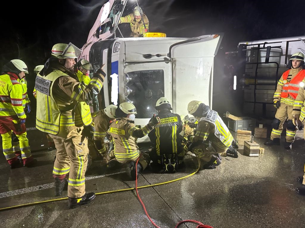 An der Unfallstelle wurde ein umgestürzter Sattelauflieger - beladen mit Reis - vorgefunden, wobei der Fahrer mit einem Arm unter der Fahrerkabine eingeklemmt war. Sofort wurde eine Menschenrettung mittels Hebekissen eingeleitet und der Verletzte bereits im Fahrzeug medizinisch betreut. Nach rund einer Stunde konnte er erfolgreich gerettet und zu einem Rettungswagen gebracht werden. Der Patient wurde anschließend zur weiteren medizinischen Behandlung in die Uniklinik Aachen transportiert.
