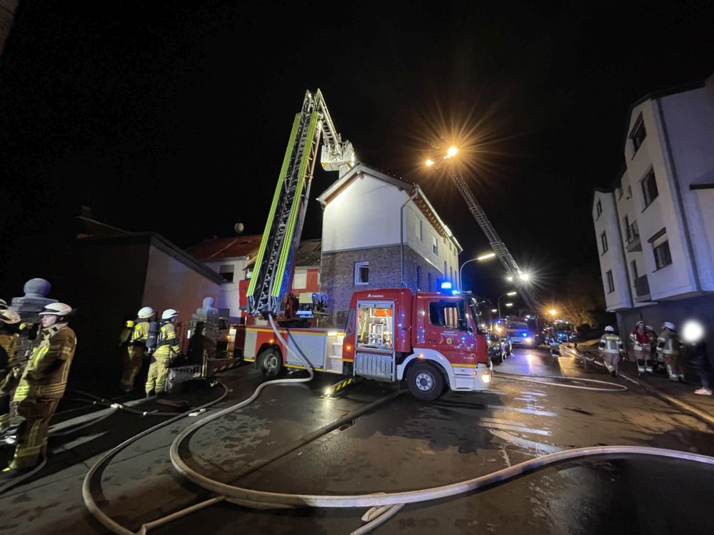 Als die ersten Fahrzeuge am Einsatzort eintrafen, schlugen bereits Flammen aus dem Dach des betroffenen Gebäudes. Unverzüglich wurden aus den akut gefährdeten Nachbargebäuden die noch anwesenden Personen heraus geführt und zeitgleich drei Strahlrohre, unter anderem über die Drehleiter, vorgenommen.