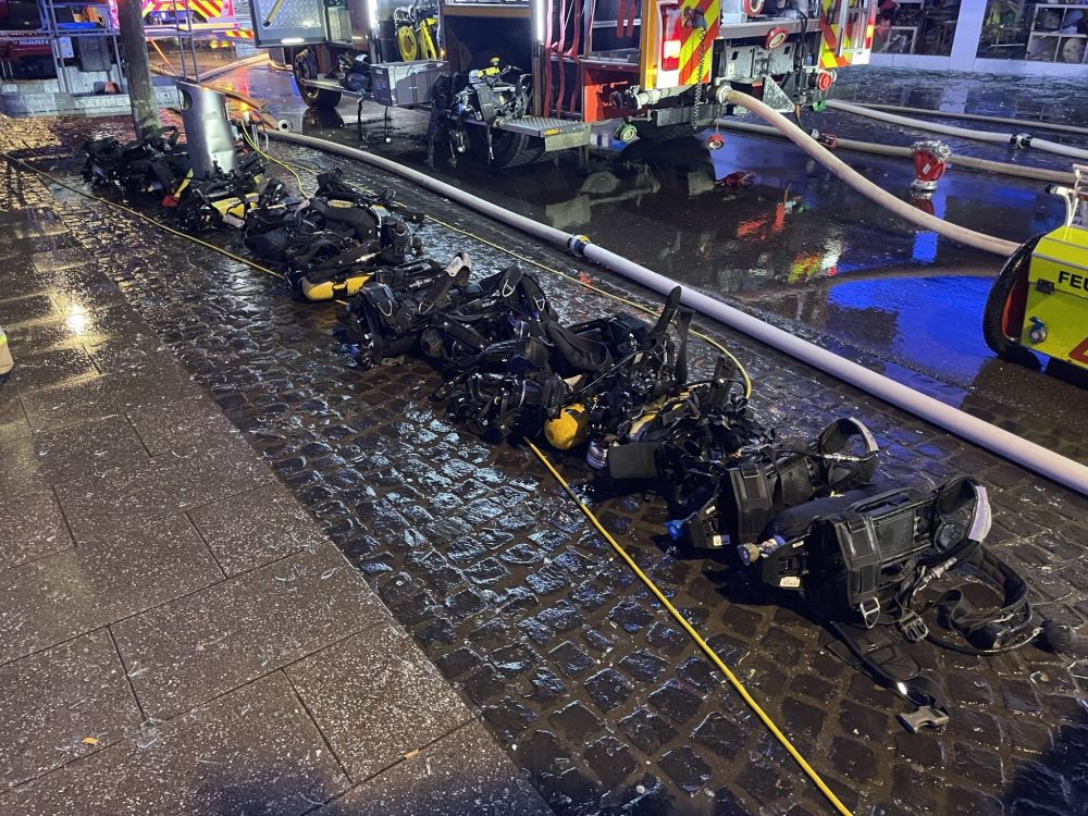 Im Anschluss an die Menschenrettung wurde die Brandbekämpfung im Gebäude gestartet. Hierzu wurde die Einsatzstelle durch unseren Einsatzleiter und Leiter der Feuerwehr, Axel Johnen, in insgesamt drei Einsatzabschnitte unterteilt, in denen jeweils mehrere Strahlrohre im Außenangriff sowie im Innenangriff eingesetzt wurden. Insgesamt waren zeitgleich bis zu drei Drehleitern an der Einsatzstelle im Einsatz.