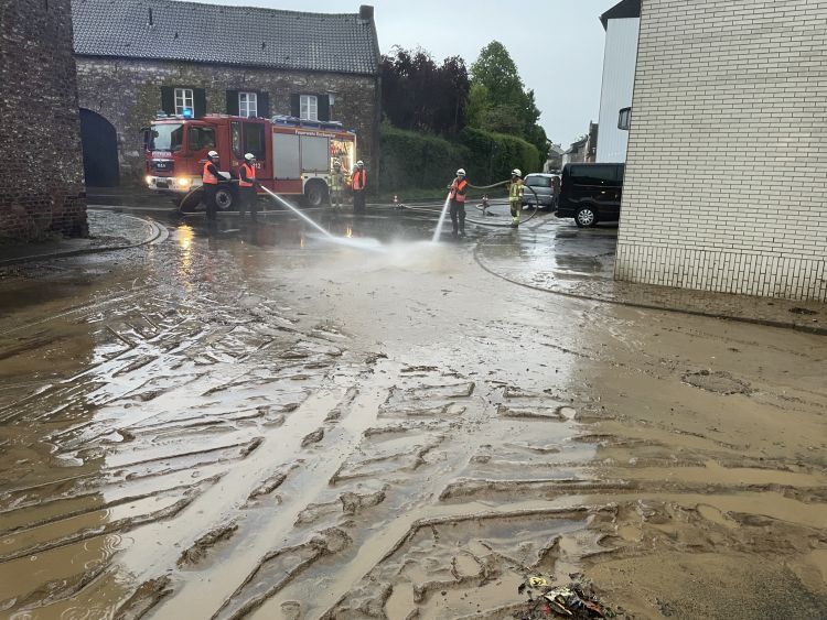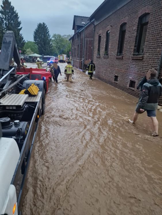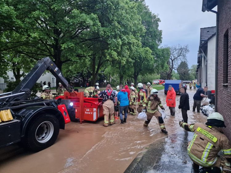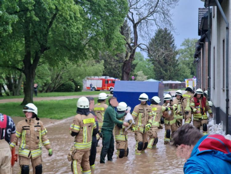 Der Omerbach in Nothberg war am Ortseingang über die Ufer getreten und bedrohte zahlreiche Häuser. Neben den großen Niederschlägen sorgte ein scheinbar verstopftes Abflussgitter für zusätzliche Gefahr. Zahlreiche Einsatzkräfte verbauten hunderte Sandsäcke zum Schutz von Gebäuden und pumpten voll gelaufene Keller leer. Die Einsatzmaßnahmen zogen sich hier über mehrere Stunden hin.