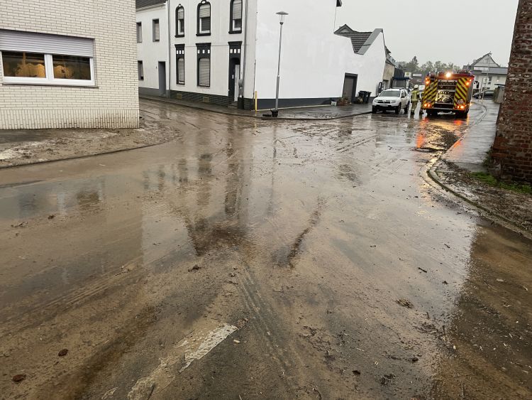 In Kinzweiler wurden Schlamm und Geröll von angrenzenden Feldern auf die Kirchstraße gespült und verstopfen dort sämtliche Kanaleinläufe. In der Folge strömte das Wasser, teils auf gesamter Straßenbreite auf einer Höhe bis zu 25 cm, in Richtung Ortsmitte. Auch hier waren die Einsatzkräfte mehrere Stunden beschäftigt Schlamm und Geröll von der Straße zu räumen und die Gefahrenstellen zu beseitigen.