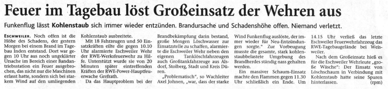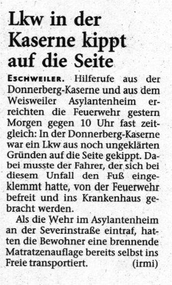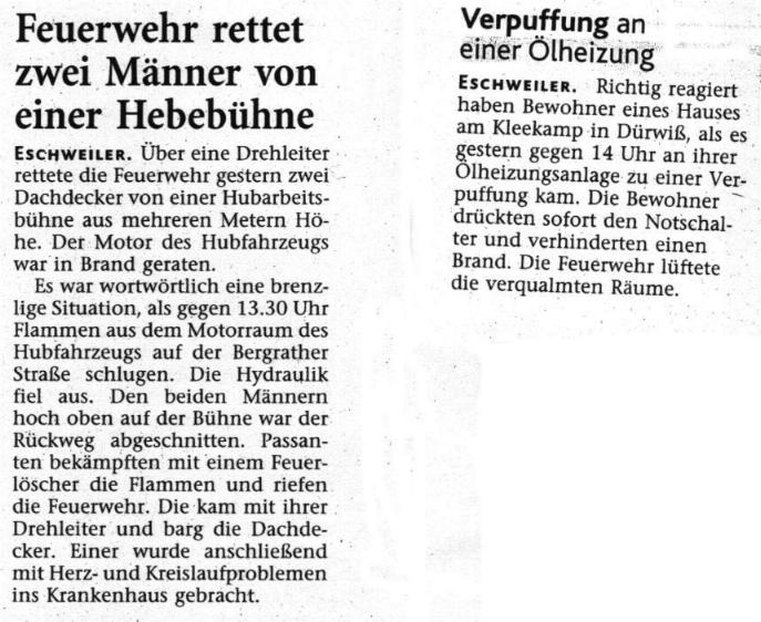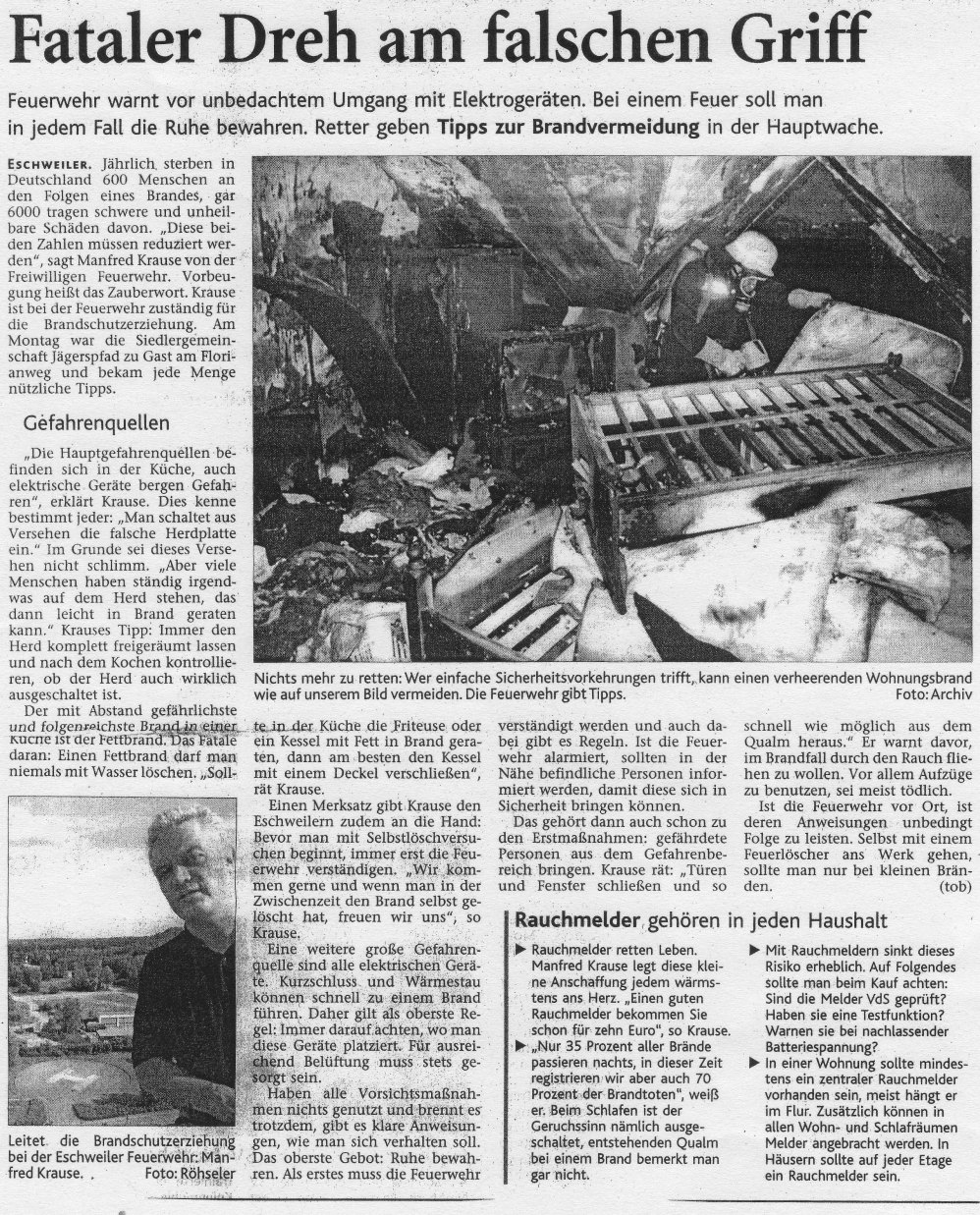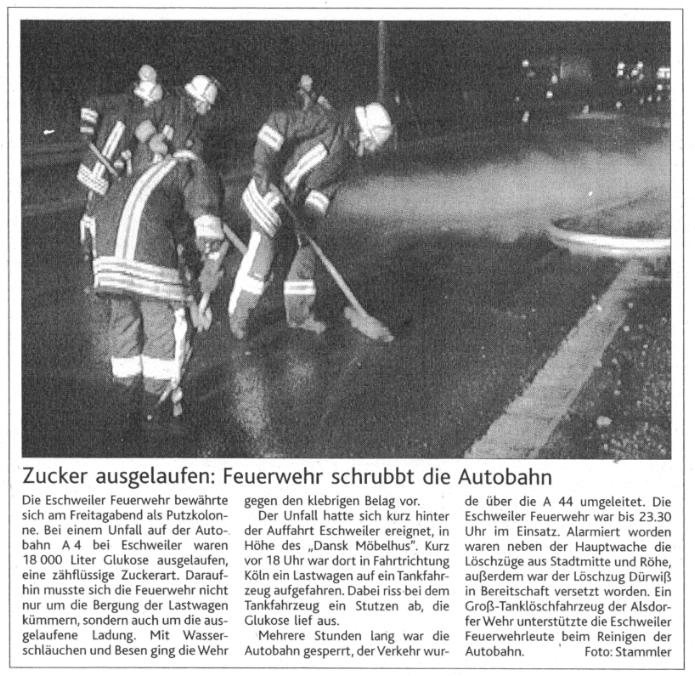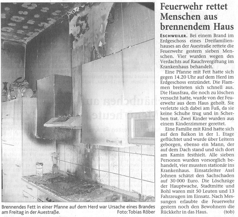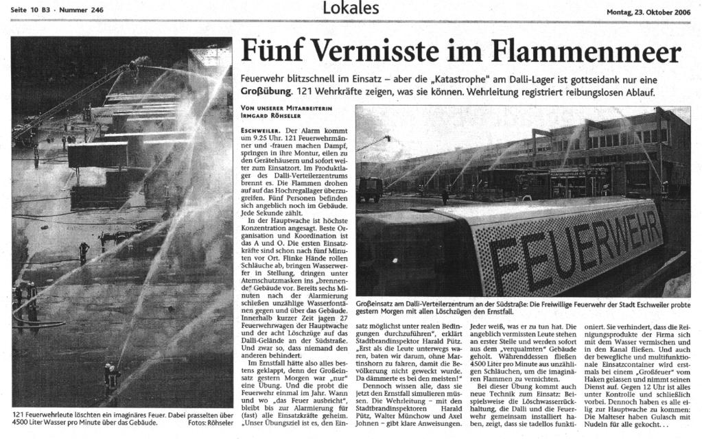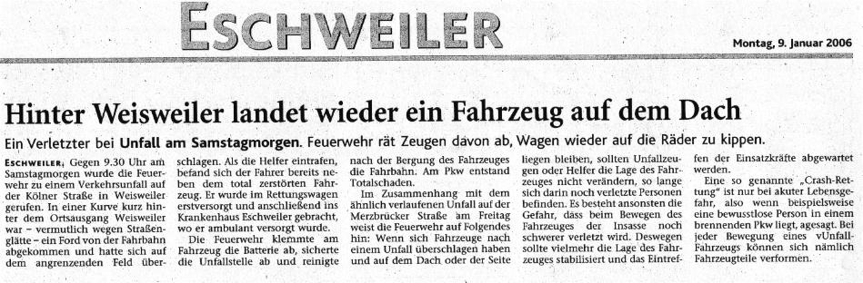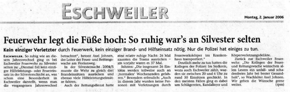 2006 31.12.2006 Geld in die Sicherheit investiert EN / EZ 22.12.2006 Feuerwehr spart, aber nicht am falschen Ende EN / EZ 26.11.2006 Tödlicher Unfall - Zusammenstoß mit Lkw Super Sonntag 24.11.2006 Bei der Feuerwehr wird begeistert getrommelt... EN / EZ 23.11.2006 Die Gefahren sollen weggebaggert werden EN / EZ 23.11.2006 Auch harte Männer dürfen weinen EN / EZ 23.11.2006 Schock und Trauer nach den tödlichen Unfällen EN / EZ 22.11.2006 Drei Tote bei schwerem Unfall gestern Abend... EN / EZ 21.11.2006 Vier Menschen aus Eschweiler sterben bei... EN / EZ 16.11.2006 Seniorin kämpft sich durch die Flammen EN / EZ 30.10.2006 Auch zwei Damen büffeln für den Ernstfall EN / EZ 28.10.2006 Küchenbrand im Restaurant zerstört die Abluftanlage EN / EZ 25.10.2006 Weg in Weisweiler nach Sturmschaden entsperrt EN / EZ 23.10.2006 Fünf Vermisste im Flammenmeer EN / EZ 19.10.2006 Leitstelle nicht zum Call-Center abstufen EN / EZ 16.10.2006 Im Hochhaus-Keller brennt Unrat EN / EZ 28.09.2006 Kochtopf auf dem Herd vergessen EN / EZ 16.09.2006 Brennende Kartons an der Marktstraße EN / EZ 12.09.2006 Lkw in der Kaserne kippt auf die Seite EN / EZ 02.09.2006 Feuerwehr rettet Menschen aus brennendem Haus EN / EZ 28.08.2006 Schleudertour mit Wagen endet auf den Schienen... EN / EZ 25.08.2006 Drei Verletzte nach frontalem Zusammenstoß auf... EN / EZ 23.08.2006 Fataler Dreh am falschen Griff EN / EZ 21.08.2006 24 Stunden lang löschen, bergen, retten EN / EZ 17.08.2006 Feuerwehreinsatz nach Trinkgelage EN / EZ 14.08.2006 Rauchmelder rettet Familie das Leben EN / EZ 08.08.2006 Feuerwehr unterhält auch die Kinder EN / EZ 29.07.2006 Hunderte Keller nach Unwetter unter Wasser EN / EZ 27.07.2006 Nach 90 Minuten ist Arentino gerettet EN / EZ 25.07.2006 Flammen über dem Blausteinsee EN / EZ 07.07.2006 Herabstürzender Stahlträger verletzt Arbeiter... EN / EZ 06.07.2006 Wehrleute lernen vieles, nur nicht Daumen drehen EN / EZ 06.07.2006 Feuerwehr birgt Regenfass aus der Inde EN / EZ 05.07.2006 Feuer in der Uferstraße: 50 000 Euro Schaden EN / EZ 27.06.2006 Blitz schlägt in Haus an der Luisenstraße ein EN / EZ 27.06.2006 Lohner Wehr feiert mit Groß und Klein EN / EZ 26.06.2006 Rauch und Ruß legen ganze Häuserzeile lahm EN / EZ 24.06.2006 Bohls Jugendfeuerwehr schaut Kölner Kollegen... EN / EZ 20.06.2006 Panik, wenn es brennt? Das ist falsch, lernen... EN / EZ 06.06.2006 Küche brennt: Mutter und Kind verletzt EN / EZ 30.05.2006 Kinder übers Dach gerettet EN / EZ 22.05.2006 Orkanböen sorgen nicht nur im Wald für eine... EN / EZ 18.05.2006 Timo will jetzt zur Feuerwehr EN / EZ 17.05.2006 Nach Autobahn-Unfall Stunden im Stau EN / EZ 11.05.2006 Kellerbrand in der Elbinger Straße EN / EZ 09.05.2006 Feuer im Tagebau löst Großeinsatz der Wehren aus EN / EZ 06.05.2006 Land unter in der Kinzweiler Grundschule EN / EZ 26.04.2006 Vorreiterrolle bei der ABC-Gefahrenabwehr EN / EZ 24.04.2006 Dichter Rauch über der Mülldeponie EN / EZ 18.04.2006 Insgesamt 9040 Mal rückt die Feuerwehr aus EN / EZ 13.04.2006 Kommunen im Kreis bilden ihren... EN / EZ 12.04.2006 Wehrleute sammeln Müll im Grünen EN / EZ 09.04.2006 Feuerwehrleute lernen gemeinsam EN / EZ 03.04.2006 Ein musikalisches Feuerwerk EN / EZ 24.03.2006 80-Jährige nach Unfall im Krankenhaus EN / EZ 14.03.2006 Bürgermeister lobt Helfer und Feuerwehr EN / EZ 13.03.2006 Vater nimmt sein Neugeborenes als Geisel EN / EZ 07.03.2006 Wendemanöver endet im Eschweiler Krankenhaus EN / EZ 01.03.2006 Rettungskräfte rücken weniger oft aus EN / EZ 27.02.2006 Hauptwache der Feuerwehr drei Stunden außer... EN / EZ 18.02.2006 Starker Rauch aus dem Obergeschoss EN / EZ 14.02.2006 Nachwuchssorgen für die Feuerwehr kein Thema EN / EZ 11.02.2006 Breite Ölspur an der Wasserwiese EN / EZ 09.02.2006 Feuerwehr rettet zwei Männer von einer Hebebühne EN / EZ 09.02.2006 Straße im Stadtteil Aue stundenlang überflutet EN / EZ 08.02.2006 Kripo: Es war Branddstiftung EN / EZ 08.02.2006 Der alte Löschwagen der Röher Feuerwehr ist nach... EN / EZ 04.02.2006 Panische Hilfeschreie vom Dach EN / EZ 24.01.2006 Tödlicher Unfall bei Kinzweiler EN / EZ 21.01.2006 Gardetenöre LZ31 EN / EZ 16.01.2006 Zucker ausgelaufen: Feuerwehr schrubbt die... EN / EZ 10.01.2006 Kompressor in Flammen EN / EZ 09.01.2006 Kurz notiert: Feuerwehr bietet warmen Unterschlupf EN / EZ 09.01.2006 Hinter Weisweiler landet wieder ein Fahrzeug auf... EN / EZ 02.01.2006 Feuerwehr legt die Füße hoch: So ruhig war's an Silverster selten EN / EZ