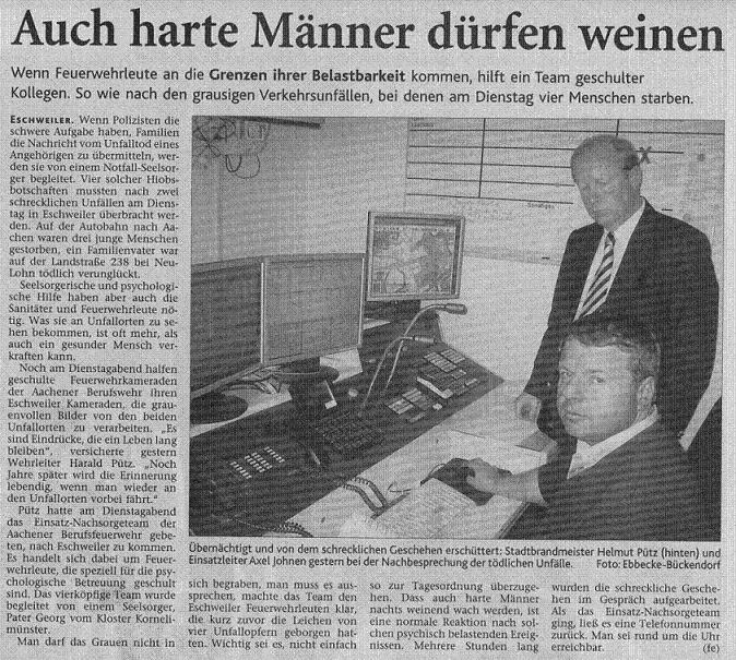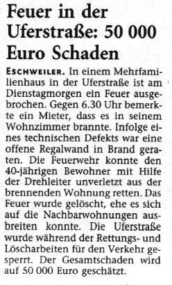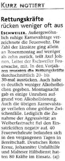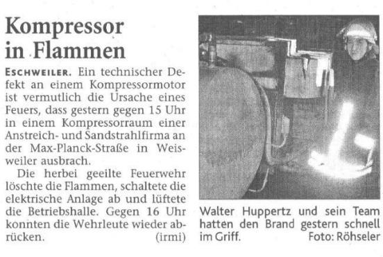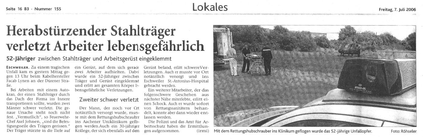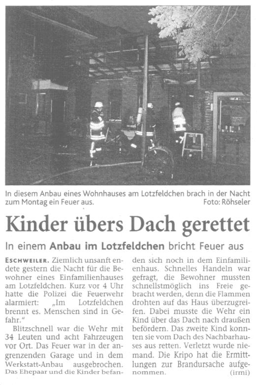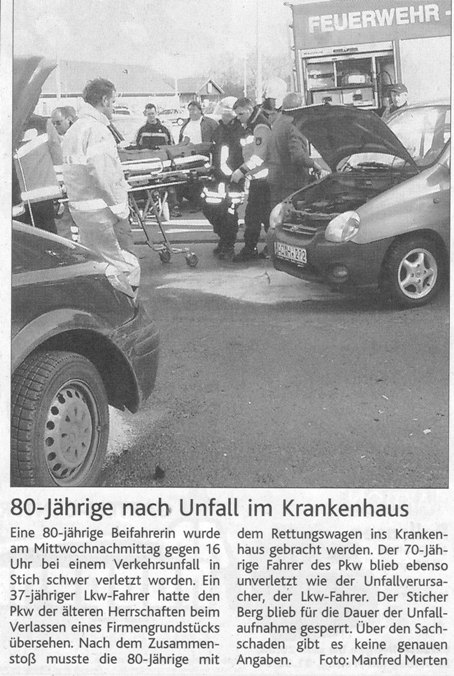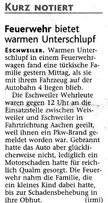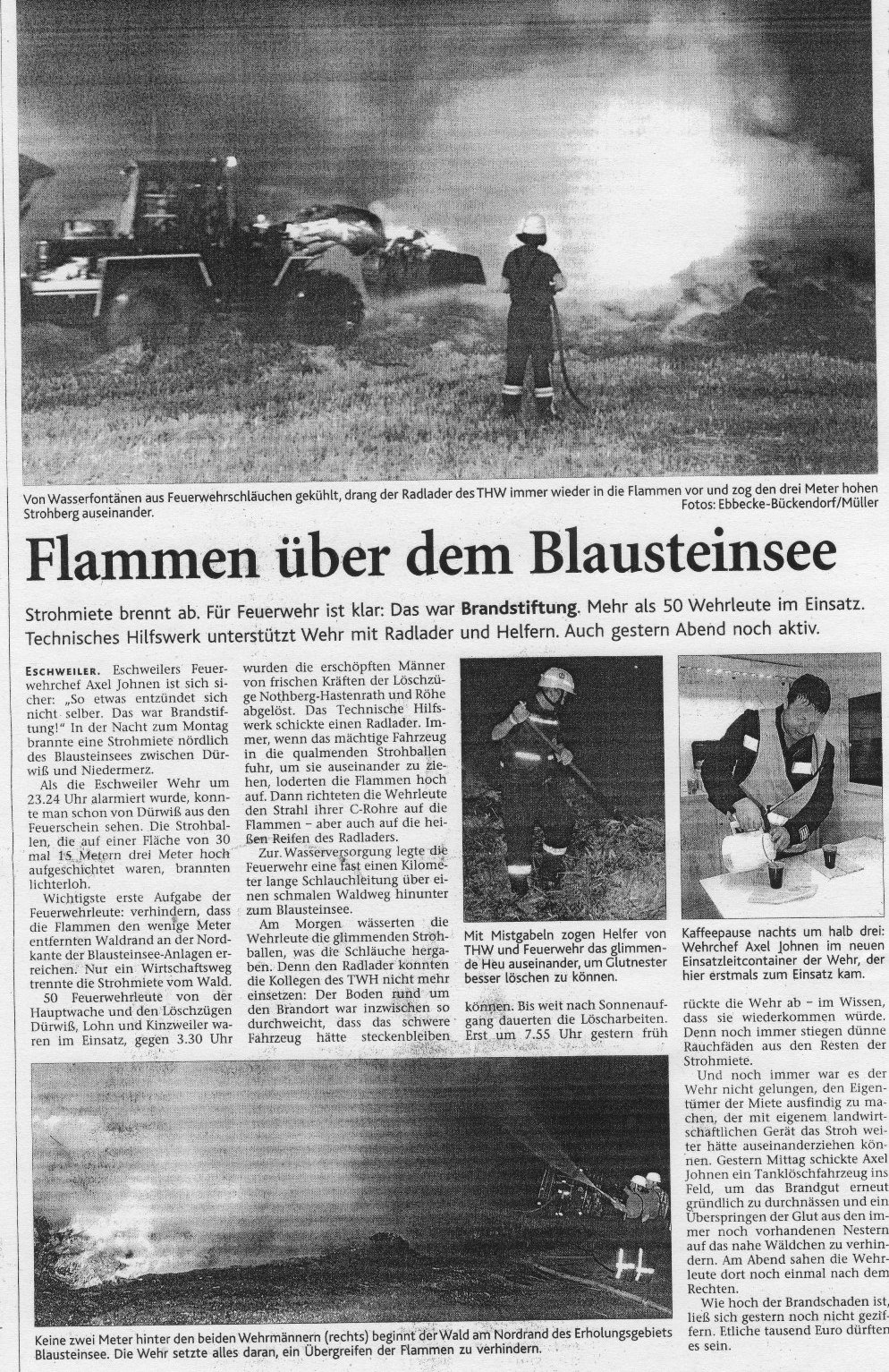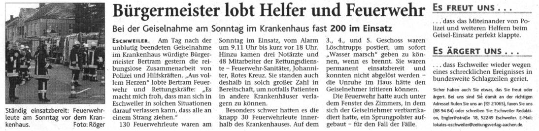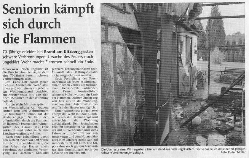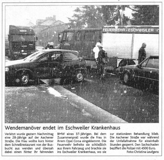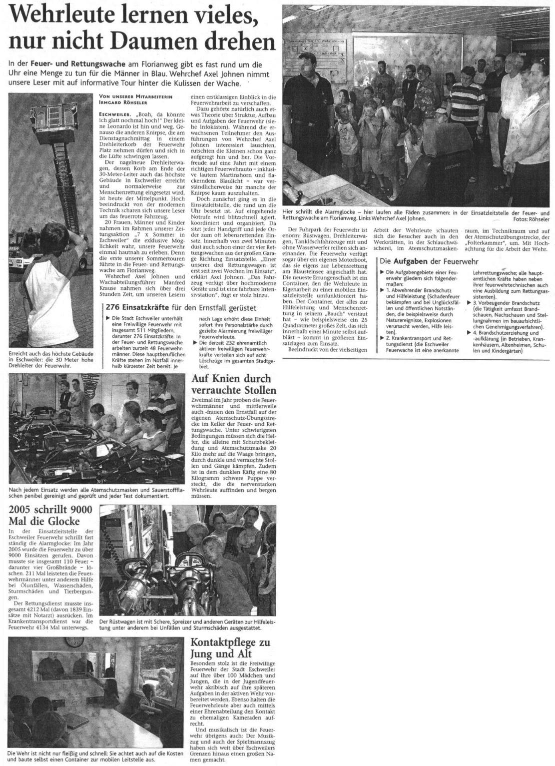 2006 31.12.2006 Geld in die Sicherheit investiert EN / EZ 22.12.2006 Feuerwehr spart, aber nicht am falschen Ende EN / EZ 26.11.2006 Tödlicher Unfall - Zusammenstoß mit Lkw Super Sonntag 24.11.2006 Bei der Feuerwehr wird begeistert getrommelt... EN / EZ 23.11.2006 Die Gefahren sollen weggebaggert werden EN / EZ 23.11.2006 Auch harte Männer dürfen weinen EN / EZ 23.11.2006 Schock und Trauer nach den tödlichen Unfällen EN / EZ 22.11.2006 Drei Tote bei schwerem Unfall gestern Abend... EN / EZ 21.11.2006 Vier Menschen aus Eschweiler sterben bei... EN / EZ 16.11.2006 Seniorin kämpft sich durch die Flammen EN / EZ 30.10.2006 Auch zwei Damen büffeln für den Ernstfall EN / EZ 28.10.2006 Küchenbrand im Restaurant zerstört die Abluftanlage EN / EZ 25.10.2006 Weg in Weisweiler nach Sturmschaden entsperrt EN / EZ 23.10.2006 Fünf Vermisste im Flammenmeer EN / EZ 19.10.2006 Leitstelle nicht zum Call-Center abstufen EN / EZ 16.10.2006 Im Hochhaus-Keller brennt Unrat EN / EZ 28.09.2006 Kochtopf auf dem Herd vergessen EN / EZ 16.09.2006 Brennende Kartons an der Marktstraße EN / EZ 12.09.2006 Lkw in der Kaserne kippt auf die Seite EN / EZ 02.09.2006 Feuerwehr rettet Menschen aus brennendem Haus EN / EZ 28.08.2006 Schleudertour mit Wagen endet auf den Schienen... EN / EZ 25.08.2006 Drei Verletzte nach frontalem Zusammenstoß auf... EN / EZ 23.08.2006 Fataler Dreh am falschen Griff EN / EZ 21.08.2006 24 Stunden lang löschen, bergen, retten EN / EZ 17.08.2006 Feuerwehreinsatz nach Trinkgelage EN / EZ 14.08.2006 Rauchmelder rettet Familie das Leben EN / EZ 08.08.2006 Feuerwehr unterhält auch die Kinder EN / EZ 29.07.2006 Hunderte Keller nach Unwetter unter Wasser EN / EZ 27.07.2006 Nach 90 Minuten ist Arentino gerettet EN / EZ 25.07.2006 Flammen über dem Blausteinsee EN / EZ 07.07.2006 Herabstürzender Stahlträger verletzt Arbeiter... EN / EZ 06.07.2006 Wehrleute lernen vieles, nur nicht Daumen drehen EN / EZ 06.07.2006 Feuerwehr birgt Regenfass aus der Inde EN / EZ 05.07.2006 Feuer in der Uferstraße: 50 000 Euro Schaden EN / EZ 27.06.2006 Blitz schlägt in Haus an der Luisenstraße ein EN / EZ 27.06.2006 Lohner Wehr feiert mit Groß und Klein EN / EZ 26.06.2006 Rauch und Ruß legen ganze Häuserzeile lahm EN / EZ 24.06.2006 Bohls Jugendfeuerwehr schaut Kölner Kollegen... EN / EZ 20.06.2006 Panik, wenn es brennt? Das ist falsch, lernen... EN / EZ 06.06.2006 Küche brennt: Mutter und Kind verletzt EN / EZ 30.05.2006 Kinder übers Dach gerettet EN / EZ 22.05.2006 Orkanböen sorgen nicht nur im Wald für eine... EN / EZ 18.05.2006 Timo will jetzt zur Feuerwehr EN / EZ 17.05.2006 Nach Autobahn-Unfall Stunden im Stau EN / EZ 11.05.2006 Kellerbrand in der Elbinger Straße EN / EZ 09.05.2006 Feuer im Tagebau löst Großeinsatz der Wehren aus EN / EZ 06.05.2006 Land unter in der Kinzweiler Grundschule EN / EZ 26.04.2006 Vorreiterrolle bei der ABC-Gefahrenabwehr EN / EZ 24.04.2006 Dichter Rauch über der Mülldeponie EN / EZ 18.04.2006 Insgesamt 9040 Mal rückt die Feuerwehr aus EN / EZ 13.04.2006 Kommunen im Kreis bilden ihren... EN / EZ 12.04.2006 Wehrleute sammeln Müll im Grünen EN / EZ 09.04.2006 Feuerwehrleute lernen gemeinsam EN / EZ 03.04.2006 Ein musikalisches Feuerwerk EN / EZ 24.03.2006 80-Jährige nach Unfall im Krankenhaus EN / EZ 14.03.2006 Bürgermeister lobt Helfer und Feuerwehr EN / EZ 13.03.2006 Vater nimmt sein Neugeborenes als Geisel EN / EZ 07.03.2006 Wendemanöver endet im Eschweiler Krankenhaus EN / EZ 01.03.2006 Rettungskräfte rücken weniger oft aus EN / EZ 27.02.2006 Hauptwache der Feuerwehr drei Stunden außer... EN / EZ 18.02.2006 Starker Rauch aus dem Obergeschoss EN / EZ 14.02.2006 Nachwuchssorgen für die Feuerwehr kein Thema EN / EZ 11.02.2006 Breite Ölspur an der Wasserwiese EN / EZ 09.02.2006 Feuerwehr rettet zwei Männer von einer Hebebühne EN / EZ 09.02.2006 Straße im Stadtteil Aue stundenlang überflutet EN / EZ 08.02.2006 Kripo: Es war Branddstiftung EN / EZ 08.02.2006 Der alte Löschwagen der Röher Feuerwehr ist nach... EN / EZ 04.02.2006 Panische Hilfeschreie vom Dach EN / EZ 24.01.2006 Tödlicher Unfall bei Kinzweiler EN / EZ 21.01.2006 Gardetenöre LZ31 EN / EZ 16.01.2006 Zucker ausgelaufen: Feuerwehr schrubbt die... EN / EZ 10.01.2006 Kompressor in Flammen EN / EZ 09.01.2006 Kurz notiert: Feuerwehr bietet warmen Unterschlupf EN / EZ 09.01.2006 Hinter Weisweiler landet wieder ein Fahrzeug auf... EN / EZ 02.01.2006 Feuerwehr legt die Füße hoch: So ruhig war's an Silverster selten EN / EZ