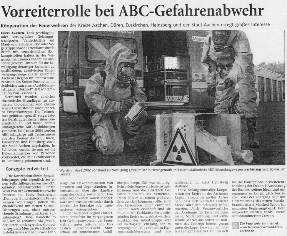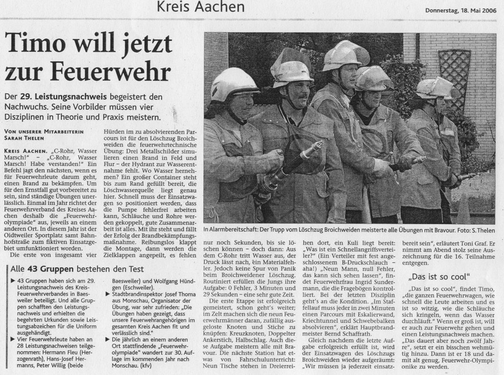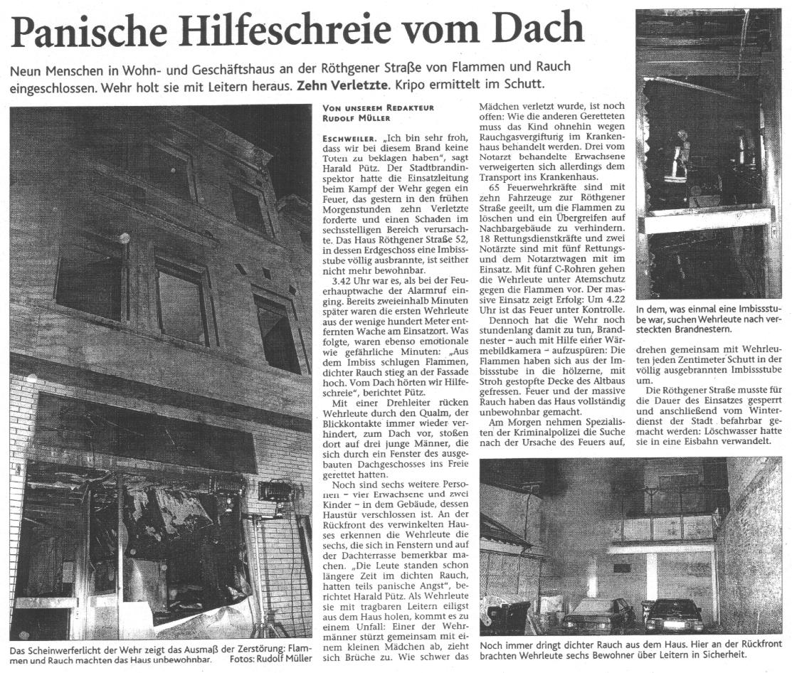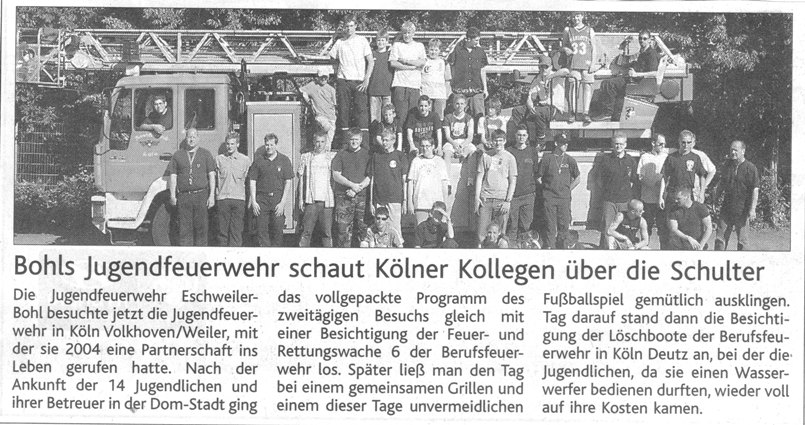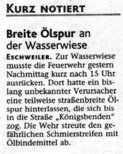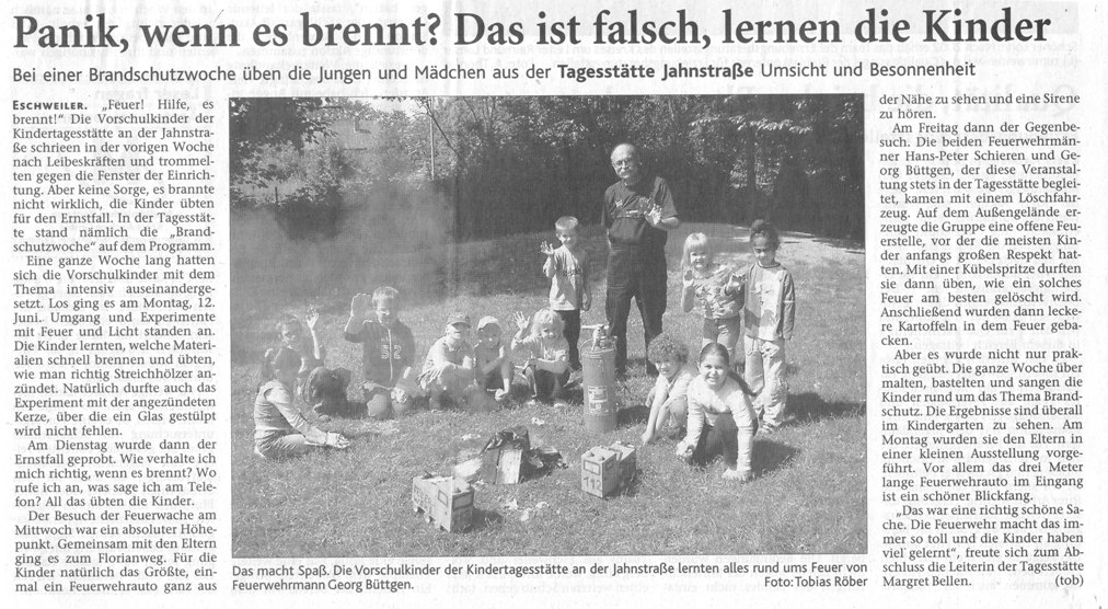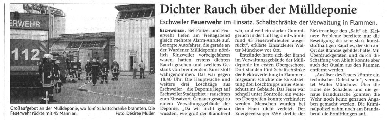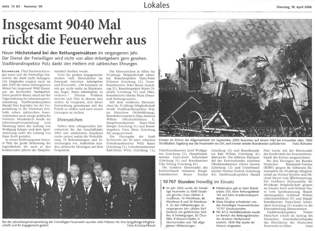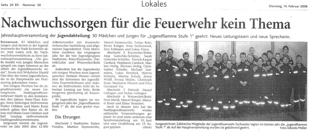 2006 31.12.2006 Geld in die Sicherheit investiert EN / EZ 22.12.2006 Feuerwehr spart, aber nicht am falschen Ende EN / EZ 26.11.2006 Tödlicher Unfall - Zusammenstoß mit Lkw Super Sonntag 24.11.2006 Bei der Feuerwehr wird begeistert getrommelt... EN / EZ 23.11.2006 Die Gefahren sollen weggebaggert werden EN / EZ 23.11.2006 Auch harte Männer dürfen weinen EN / EZ 23.11.2006 Schock und Trauer nach den tödlichen Unfällen EN / EZ 22.11.2006 Drei Tote bei schwerem Unfall gestern Abend... EN / EZ 21.11.2006 Vier Menschen aus Eschweiler sterben bei... EN / EZ 16.11.2006 Seniorin kämpft sich durch die Flammen EN / EZ 30.10.2006 Auch zwei Damen büffeln für den Ernstfall EN / EZ 28.10.2006 Küchenbrand im Restaurant zerstört die Abluftanlage EN / EZ 25.10.2006 Weg in Weisweiler nach Sturmschaden entsperrt EN / EZ 23.10.2006 Fünf Vermisste im Flammenmeer EN / EZ 19.10.2006 Leitstelle nicht zum Call-Center abstufen EN / EZ 16.10.2006 Im Hochhaus-Keller brennt Unrat EN / EZ 28.09.2006 Kochtopf auf dem Herd vergessen EN / EZ 16.09.2006 Brennende Kartons an der Marktstraße EN / EZ 12.09.2006 Lkw in der Kaserne kippt auf die Seite EN / EZ 02.09.2006 Feuerwehr rettet Menschen aus brennendem Haus EN / EZ 28.08.2006 Schleudertour mit Wagen endet auf den Schienen... EN / EZ 25.08.2006 Drei Verletzte nach frontalem Zusammenstoß auf... EN / EZ 23.08.2006 Fataler Dreh am falschen Griff EN / EZ 21.08.2006 24 Stunden lang löschen, bergen, retten EN / EZ 17.08.2006 Feuerwehreinsatz nach Trinkgelage EN / EZ 14.08.2006 Rauchmelder rettet Familie das Leben EN / EZ 08.08.2006 Feuerwehr unterhält auch die Kinder EN / EZ 29.07.2006 Hunderte Keller nach Unwetter unter Wasser EN / EZ 27.07.2006 Nach 90 Minuten ist Arentino gerettet EN / EZ 25.07.2006 Flammen über dem Blausteinsee EN / EZ 07.07.2006 Herabstürzender Stahlträger verletzt Arbeiter... EN / EZ 06.07.2006 Wehrleute lernen vieles, nur nicht Daumen drehen EN / EZ 06.07.2006 Feuerwehr birgt Regenfass aus der Inde EN / EZ 05.07.2006 Feuer in der Uferstraße: 50 000 Euro Schaden EN / EZ 27.06.2006 Blitz schlägt in Haus an der Luisenstraße ein EN / EZ 27.06.2006 Lohner Wehr feiert mit Groß und Klein EN / EZ 26.06.2006 Rauch und Ruß legen ganze Häuserzeile lahm EN / EZ 24.06.2006 Bohls Jugendfeuerwehr schaut Kölner Kollegen... EN / EZ 20.06.2006 Panik, wenn es brennt? Das ist falsch, lernen... EN / EZ 06.06.2006 Küche brennt: Mutter und Kind verletzt EN / EZ 30.05.2006 Kinder übers Dach gerettet EN / EZ 22.05.2006 Orkanböen sorgen nicht nur im Wald für eine... EN / EZ 18.05.2006 Timo will jetzt zur Feuerwehr EN / EZ 17.05.2006 Nach Autobahn-Unfall Stunden im Stau EN / EZ 11.05.2006 Kellerbrand in der Elbinger Straße EN / EZ 09.05.2006 Feuer im Tagebau löst Großeinsatz der Wehren aus EN / EZ 06.05.2006 Land unter in der Kinzweiler Grundschule EN / EZ 26.04.2006 Vorreiterrolle bei der ABC-Gefahrenabwehr EN / EZ 24.04.2006 Dichter Rauch über der Mülldeponie EN / EZ 18.04.2006 Insgesamt 9040 Mal rückt die Feuerwehr aus EN / EZ 13.04.2006 Kommunen im Kreis bilden ihren... EN / EZ 12.04.2006 Wehrleute sammeln Müll im Grünen EN / EZ 09.04.2006 Feuerwehrleute lernen gemeinsam EN / EZ 03.04.2006 Ein musikalisches Feuerwerk EN / EZ 24.03.2006 80-Jährige nach Unfall im Krankenhaus EN / EZ 14.03.2006 Bürgermeister lobt Helfer und Feuerwehr EN / EZ 13.03.2006 Vater nimmt sein Neugeborenes als Geisel EN / EZ 07.03.2006 Wendemanöver endet im Eschweiler Krankenhaus EN / EZ 01.03.2006 Rettungskräfte rücken weniger oft aus EN / EZ 27.02.2006 Hauptwache der Feuerwehr drei Stunden außer... EN / EZ 18.02.2006 Starker Rauch aus dem Obergeschoss EN / EZ 14.02.2006 Nachwuchssorgen für die Feuerwehr kein Thema EN / EZ 11.02.2006 Breite Ölspur an der Wasserwiese EN / EZ 09.02.2006 Feuerwehr rettet zwei Männer von einer Hebebühne EN / EZ 09.02.2006 Straße im Stadtteil Aue stundenlang überflutet EN / EZ 08.02.2006 Kripo: Es war Branddstiftung EN / EZ 08.02.2006 Der alte Löschwagen der Röher Feuerwehr ist nach... EN / EZ 04.02.2006 Panische Hilfeschreie vom Dach EN / EZ 24.01.2006 Tödlicher Unfall bei Kinzweiler EN / EZ 21.01.2006 Gardetenöre LZ31 EN / EZ 16.01.2006 Zucker ausgelaufen: Feuerwehr schrubbt die... EN / EZ 10.01.2006 Kompressor in Flammen EN / EZ 09.01.2006 Kurz notiert: Feuerwehr bietet warmen Unterschlupf EN / EZ 09.01.2006 Hinter Weisweiler landet wieder ein Fahrzeug auf... EN / EZ 02.01.2006 Feuerwehr legt die Füße hoch: So ruhig war's an Silverster selten EN / EZ