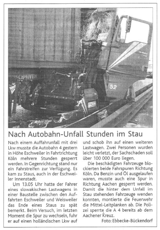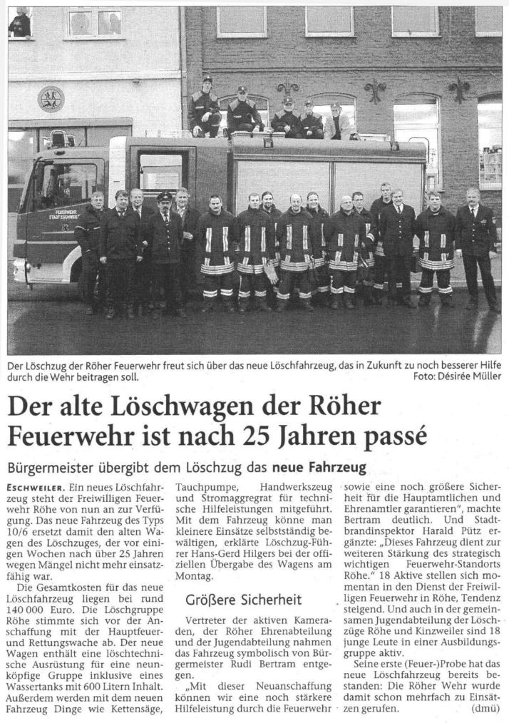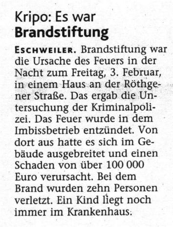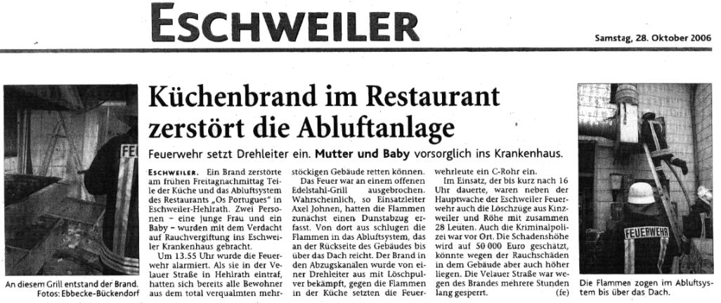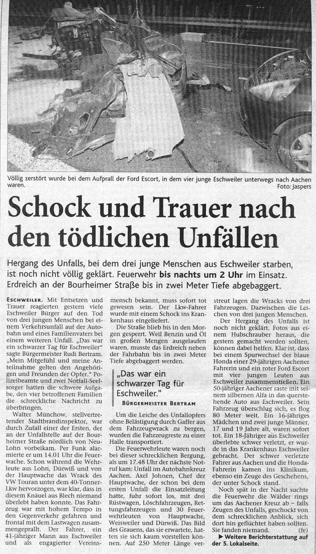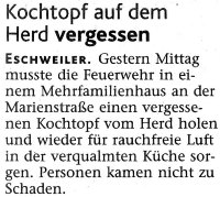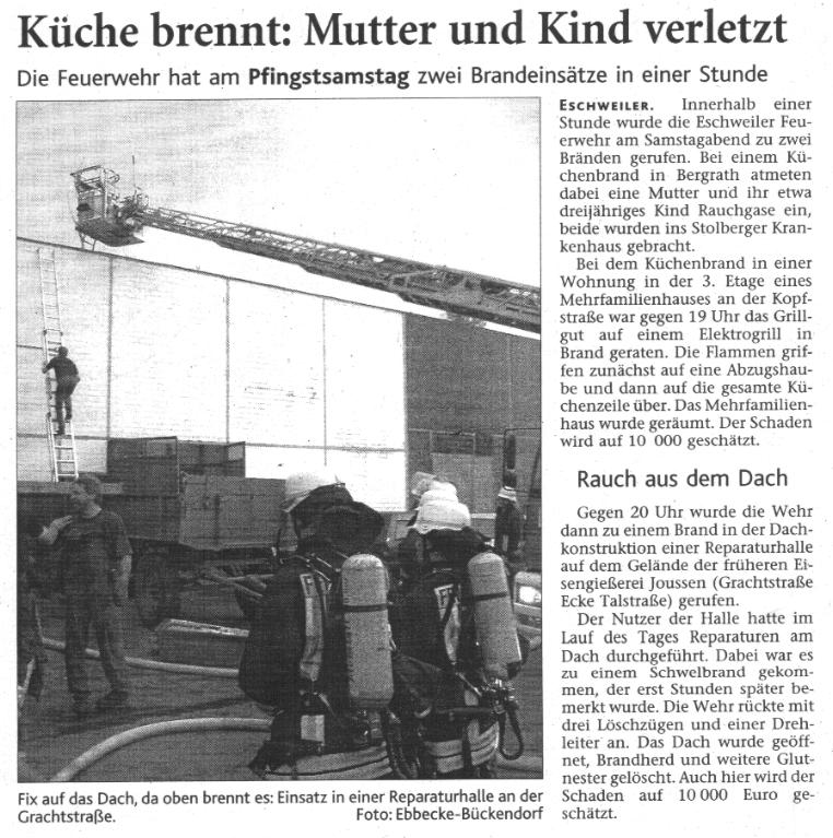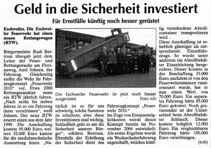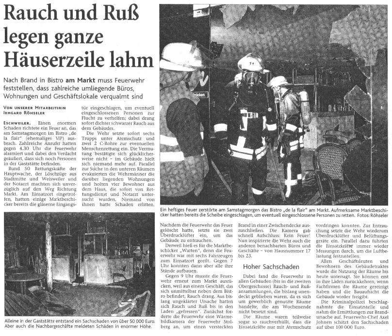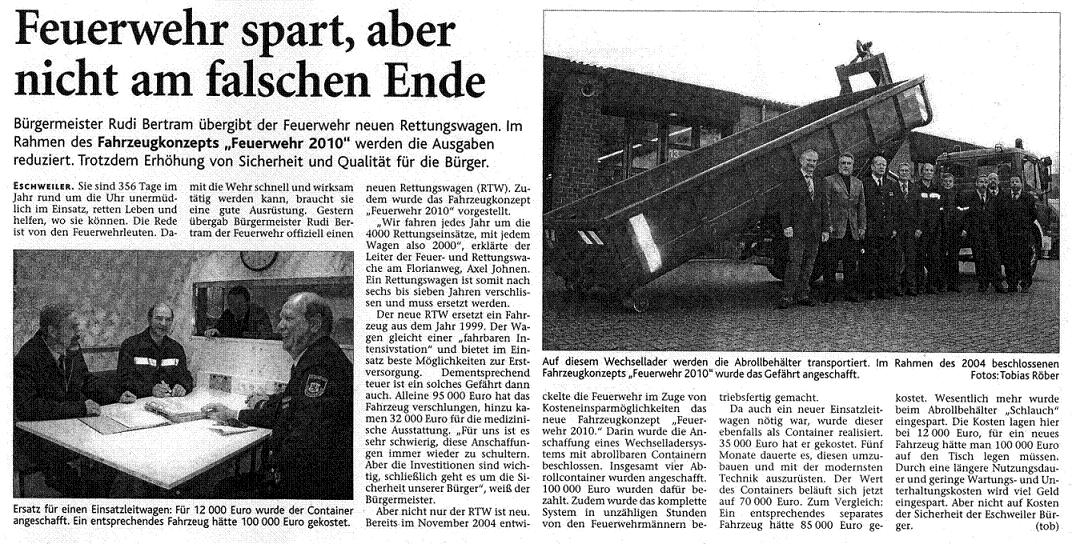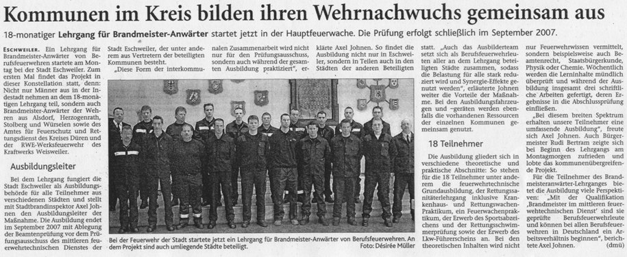 2006 31.12.2006 Geld in die Sicherheit investiert EN / EZ 22.12.2006 Feuerwehr spart, aber nicht am falschen Ende EN / EZ 26.11.2006 Tödlicher Unfall - Zusammenstoß mit Lkw Super Sonntag 24.11.2006 Bei der Feuerwehr wird begeistert getrommelt... EN / EZ 23.11.2006 Die Gefahren sollen weggebaggert werden EN / EZ 23.11.2006 Auch harte Männer dürfen weinen EN / EZ 23.11.2006 Schock und Trauer nach den tödlichen Unfällen EN / EZ 22.11.2006 Drei Tote bei schwerem Unfall gestern Abend... EN / EZ 21.11.2006 Vier Menschen aus Eschweiler sterben bei... EN / EZ 16.11.2006 Seniorin kämpft sich durch die Flammen EN / EZ 30.10.2006 Auch zwei Damen büffeln für den Ernstfall EN / EZ 28.10.2006 Küchenbrand im Restaurant zerstört die Abluftanlage EN / EZ 25.10.2006 Weg in Weisweiler nach Sturmschaden entsperrt EN / EZ 23.10.2006 Fünf Vermisste im Flammenmeer EN / EZ 19.10.2006 Leitstelle nicht zum Call-Center abstufen EN / EZ 16.10.2006 Im Hochhaus-Keller brennt Unrat EN / EZ 28.09.2006 Kochtopf auf dem Herd vergessen EN / EZ 16.09.2006 Brennende Kartons an der Marktstraße EN / EZ 12.09.2006 Lkw in der Kaserne kippt auf die Seite EN / EZ 02.09.2006 Feuerwehr rettet Menschen aus brennendem Haus EN / EZ 28.08.2006 Schleudertour mit Wagen endet auf den Schienen... EN / EZ 25.08.2006 Drei Verletzte nach frontalem Zusammenstoß auf... EN / EZ 23.08.2006 Fataler Dreh am falschen Griff EN / EZ 21.08.2006 24 Stunden lang löschen, bergen, retten EN / EZ 17.08.2006 Feuerwehreinsatz nach Trinkgelage EN / EZ 14.08.2006 Rauchmelder rettet Familie das Leben EN / EZ 08.08.2006 Feuerwehr unterhält auch die Kinder EN / EZ 29.07.2006 Hunderte Keller nach Unwetter unter Wasser EN / EZ 27.07.2006 Nach 90 Minuten ist Arentino gerettet EN / EZ 25.07.2006 Flammen über dem Blausteinsee EN / EZ 07.07.2006 Herabstürzender Stahlträger verletzt Arbeiter... EN / EZ 06.07.2006 Wehrleute lernen vieles, nur nicht Daumen drehen EN / EZ 06.07.2006 Feuerwehr birgt Regenfass aus der Inde EN / EZ 05.07.2006 Feuer in der Uferstraße: 50 000 Euro Schaden EN / EZ 27.06.2006 Blitz schlägt in Haus an der Luisenstraße ein EN / EZ 27.06.2006 Lohner Wehr feiert mit Groß und Klein EN / EZ 26.06.2006 Rauch und Ruß legen ganze Häuserzeile lahm EN / EZ 24.06.2006 Bohls Jugendfeuerwehr schaut Kölner Kollegen... EN / EZ 20.06.2006 Panik, wenn es brennt? Das ist falsch, lernen... EN / EZ 06.06.2006 Küche brennt: Mutter und Kind verletzt EN / EZ 30.05.2006 Kinder übers Dach gerettet EN / EZ 22.05.2006 Orkanböen sorgen nicht nur im Wald für eine... EN / EZ 18.05.2006 Timo will jetzt zur Feuerwehr EN / EZ 17.05.2006 Nach Autobahn-Unfall Stunden im Stau EN / EZ 11.05.2006 Kellerbrand in der Elbinger Straße EN / EZ 09.05.2006 Feuer im Tagebau löst Großeinsatz der Wehren aus EN / EZ 06.05.2006 Land unter in der Kinzweiler Grundschule EN / EZ 26.04.2006 Vorreiterrolle bei der ABC-Gefahrenabwehr EN / EZ 24.04.2006 Dichter Rauch über der Mülldeponie EN / EZ 18.04.2006 Insgesamt 9040 Mal rückt die Feuerwehr aus EN / EZ 13.04.2006 Kommunen im Kreis bilden ihren... EN / EZ 12.04.2006 Wehrleute sammeln Müll im Grünen EN / EZ 09.04.2006 Feuerwehrleute lernen gemeinsam EN / EZ 03.04.2006 Ein musikalisches Feuerwerk EN / EZ 24.03.2006 80-Jährige nach Unfall im Krankenhaus EN / EZ 14.03.2006 Bürgermeister lobt Helfer und Feuerwehr EN / EZ 13.03.2006 Vater nimmt sein Neugeborenes als Geisel EN / EZ 07.03.2006 Wendemanöver endet im Eschweiler Krankenhaus EN / EZ 01.03.2006 Rettungskräfte rücken weniger oft aus EN / EZ 27.02.2006 Hauptwache der Feuerwehr drei Stunden außer... EN / EZ 18.02.2006 Starker Rauch aus dem Obergeschoss EN / EZ 14.02.2006 Nachwuchssorgen für die Feuerwehr kein Thema EN / EZ 11.02.2006 Breite Ölspur an der Wasserwiese EN / EZ 09.02.2006 Feuerwehr rettet zwei Männer von einer Hebebühne EN / EZ 09.02.2006 Straße im Stadtteil Aue stundenlang überflutet EN / EZ 08.02.2006 Kripo: Es war Branddstiftung EN / EZ 08.02.2006 Der alte Löschwagen der Röher Feuerwehr ist nach... EN / EZ 04.02.2006 Panische Hilfeschreie vom Dach EN / EZ 24.01.2006 Tödlicher Unfall bei Kinzweiler EN / EZ 21.01.2006 Gardetenöre LZ31 EN / EZ 16.01.2006 Zucker ausgelaufen: Feuerwehr schrubbt die... EN / EZ 10.01.2006 Kompressor in Flammen EN / EZ 09.01.2006 Kurz notiert: Feuerwehr bietet warmen Unterschlupf EN / EZ 09.01.2006 Hinter Weisweiler landet wieder ein Fahrzeug auf... EN / EZ 02.01.2006 Feuerwehr legt die Füße hoch: So ruhig war's an Silverster selten EN / EZ