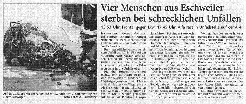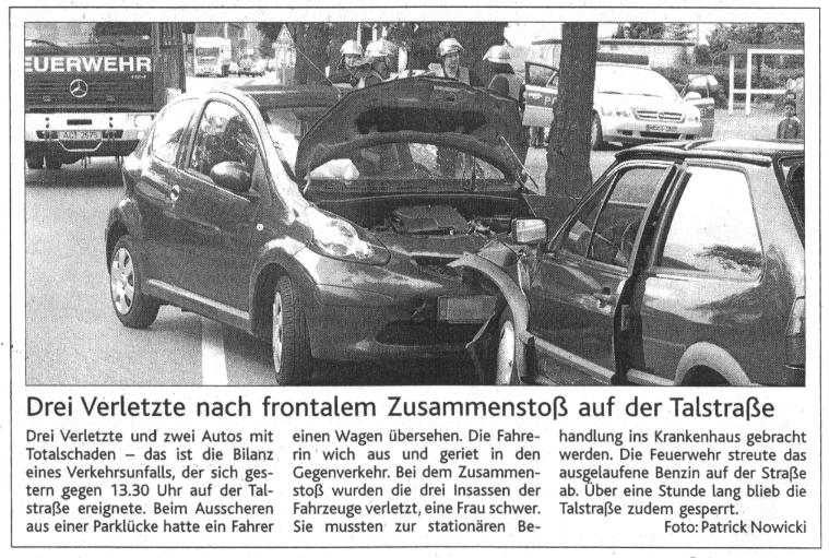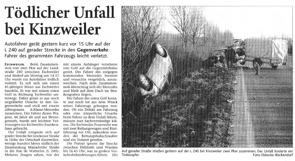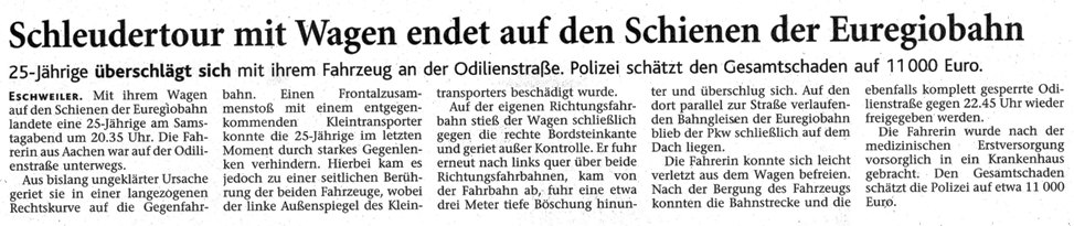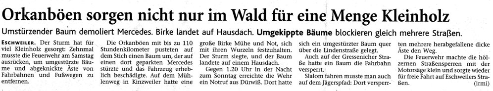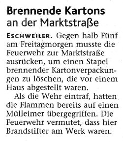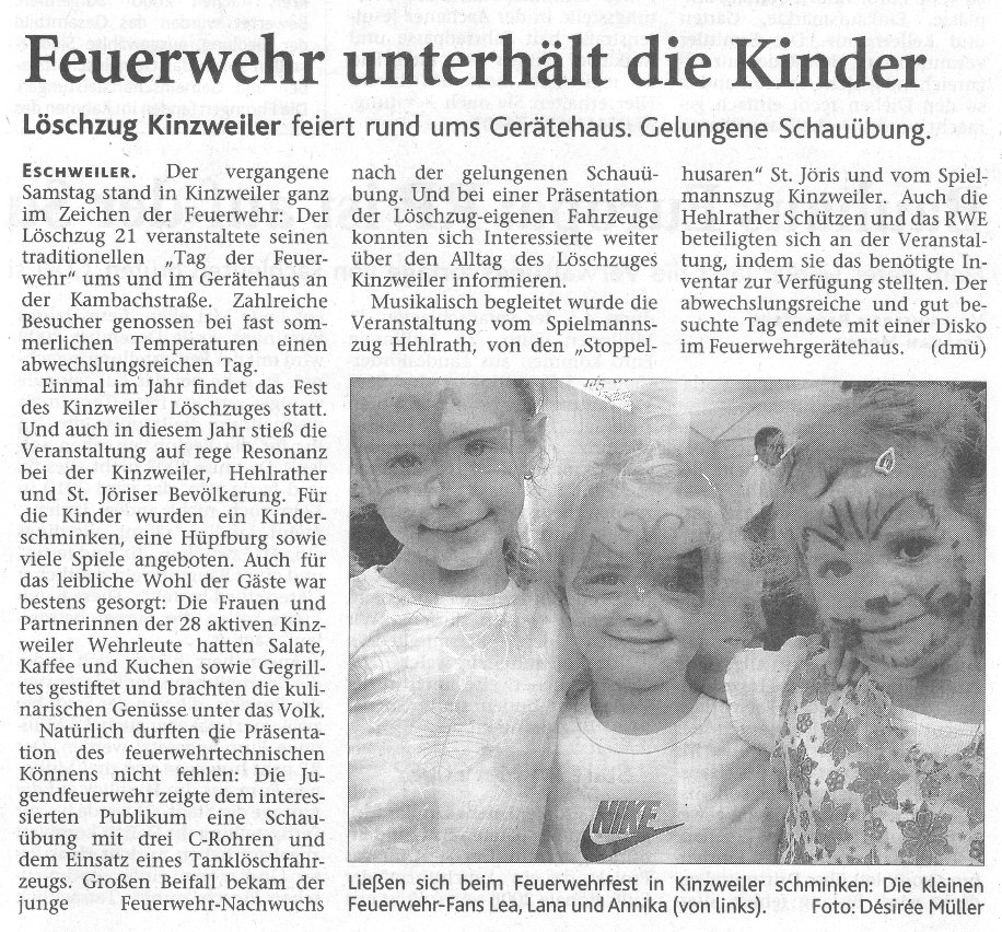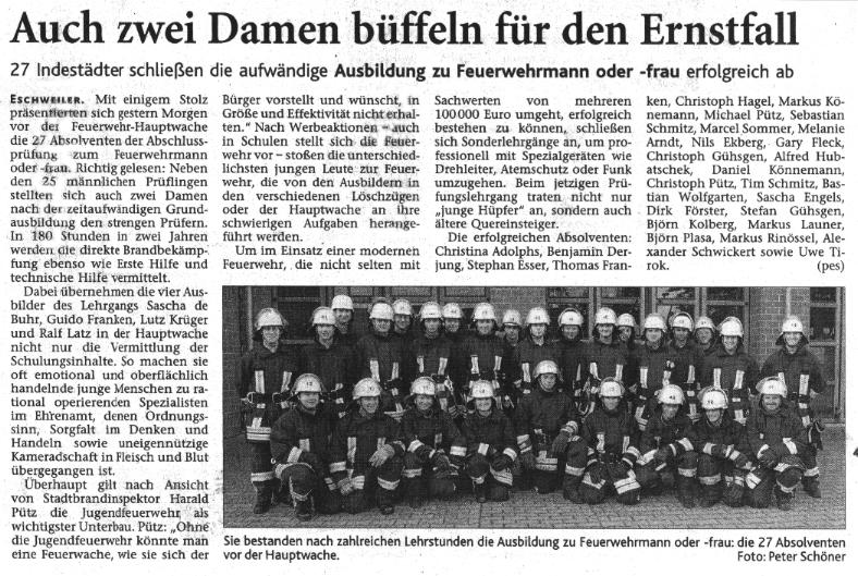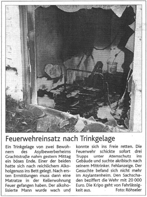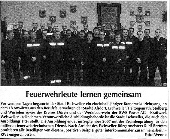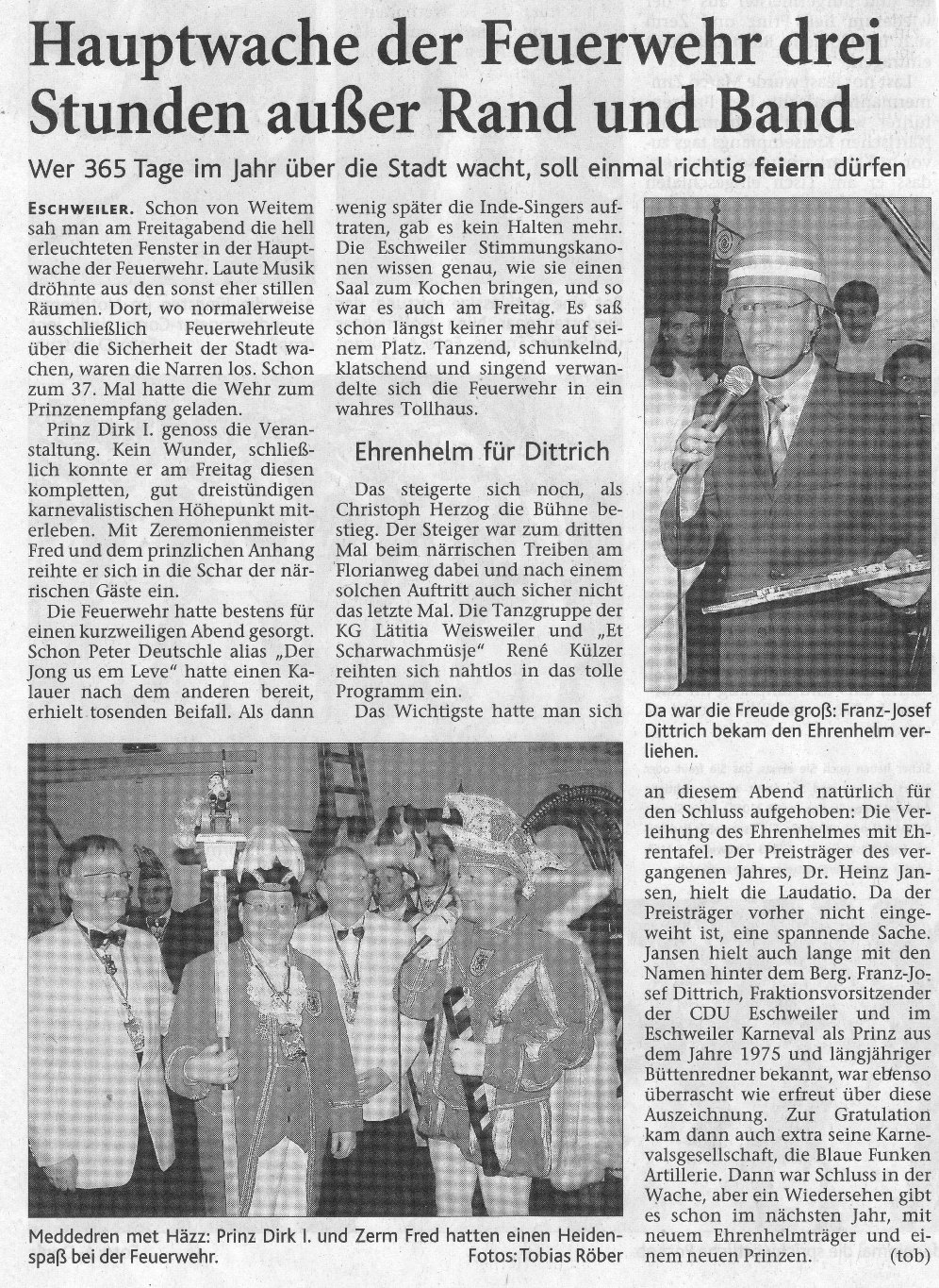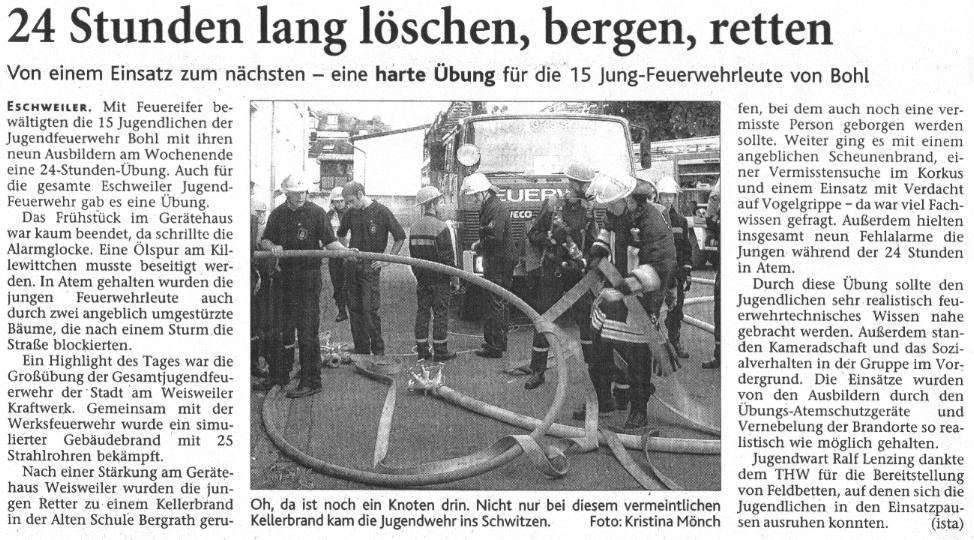 2006 31.12.2006 Geld in die Sicherheit investiert EN / EZ 22.12.2006 Feuerwehr spart, aber nicht am falschen Ende EN / EZ 26.11.2006 Tödlicher Unfall - Zusammenstoß mit Lkw Super Sonntag 24.11.2006 Bei der Feuerwehr wird begeistert getrommelt... EN / EZ 23.11.2006 Die Gefahren sollen weggebaggert werden EN / EZ 23.11.2006 Auch harte Männer dürfen weinen EN / EZ 23.11.2006 Schock und Trauer nach den tödlichen Unfällen EN / EZ 22.11.2006 Drei Tote bei schwerem Unfall gestern Abend... EN / EZ 21.11.2006 Vier Menschen aus Eschweiler sterben bei... EN / EZ 16.11.2006 Seniorin kämpft sich durch die Flammen EN / EZ 30.10.2006 Auch zwei Damen büffeln für den Ernstfall EN / EZ 28.10.2006 Küchenbrand im Restaurant zerstört die Abluftanlage EN / EZ 25.10.2006 Weg in Weisweiler nach Sturmschaden entsperrt EN / EZ 23.10.2006 Fünf Vermisste im Flammenmeer EN / EZ 19.10.2006 Leitstelle nicht zum Call-Center abstufen EN / EZ 16.10.2006 Im Hochhaus-Keller brennt Unrat EN / EZ 28.09.2006 Kochtopf auf dem Herd vergessen EN / EZ 16.09.2006 Brennende Kartons an der Marktstraße EN / EZ 12.09.2006 Lkw in der Kaserne kippt auf die Seite EN / EZ 02.09.2006 Feuerwehr rettet Menschen aus brennendem Haus EN / EZ 28.08.2006 Schleudertour mit Wagen endet auf den Schienen... EN / EZ 25.08.2006 Drei Verletzte nach frontalem Zusammenstoß auf... EN / EZ 23.08.2006 Fataler Dreh am falschen Griff EN / EZ 21.08.2006 24 Stunden lang löschen, bergen, retten EN / EZ 17.08.2006 Feuerwehreinsatz nach Trinkgelage EN / EZ 14.08.2006 Rauchmelder rettet Familie das Leben EN / EZ 08.08.2006 Feuerwehr unterhält auch die Kinder EN / EZ 29.07.2006 Hunderte Keller nach Unwetter unter Wasser EN / EZ 27.07.2006 Nach 90 Minuten ist Arentino gerettet EN / EZ 25.07.2006 Flammen über dem Blausteinsee EN / EZ 07.07.2006 Herabstürzender Stahlträger verletzt Arbeiter... EN / EZ 06.07.2006 Wehrleute lernen vieles, nur nicht Daumen drehen EN / EZ 06.07.2006 Feuerwehr birgt Regenfass aus der Inde EN / EZ 05.07.2006 Feuer in der Uferstraße: 50 000 Euro Schaden EN / EZ 27.06.2006 Blitz schlägt in Haus an der Luisenstraße ein EN / EZ 27.06.2006 Lohner Wehr feiert mit Groß und Klein EN / EZ 26.06.2006 Rauch und Ruß legen ganze Häuserzeile lahm EN / EZ 24.06.2006 Bohls Jugendfeuerwehr schaut Kölner Kollegen... EN / EZ 20.06.2006 Panik, wenn es brennt? Das ist falsch, lernen... EN / EZ 06.06.2006 Küche brennt: Mutter und Kind verletzt EN / EZ 30.05.2006 Kinder übers Dach gerettet EN / EZ 22.05.2006 Orkanböen sorgen nicht nur im Wald für eine... EN / EZ 18.05.2006 Timo will jetzt zur Feuerwehr EN / EZ 17.05.2006 Nach Autobahn-Unfall Stunden im Stau EN / EZ 11.05.2006 Kellerbrand in der Elbinger Straße EN / EZ 09.05.2006 Feuer im Tagebau löst Großeinsatz der Wehren aus EN / EZ 06.05.2006 Land unter in der Kinzweiler Grundschule EN / EZ 26.04.2006 Vorreiterrolle bei der ABC-Gefahrenabwehr EN / EZ 24.04.2006 Dichter Rauch über der Mülldeponie EN / EZ 18.04.2006 Insgesamt 9040 Mal rückt die Feuerwehr aus EN / EZ 13.04.2006 Kommunen im Kreis bilden ihren... EN / EZ 12.04.2006 Wehrleute sammeln Müll im Grünen EN / EZ 09.04.2006 Feuerwehrleute lernen gemeinsam EN / EZ 03.04.2006 Ein musikalisches Feuerwerk EN / EZ 24.03.2006 80-Jährige nach Unfall im Krankenhaus EN / EZ 14.03.2006 Bürgermeister lobt Helfer und Feuerwehr EN / EZ 13.03.2006 Vater nimmt sein Neugeborenes als Geisel EN / EZ 07.03.2006 Wendemanöver endet im Eschweiler Krankenhaus EN / EZ 01.03.2006 Rettungskräfte rücken weniger oft aus EN / EZ 27.02.2006 Hauptwache der Feuerwehr drei Stunden außer... EN / EZ 18.02.2006 Starker Rauch aus dem Obergeschoss EN / EZ 14.02.2006 Nachwuchssorgen für die Feuerwehr kein Thema EN / EZ 11.02.2006 Breite Ölspur an der Wasserwiese EN / EZ 09.02.2006 Feuerwehr rettet zwei Männer von einer Hebebühne EN / EZ 09.02.2006 Straße im Stadtteil Aue stundenlang überflutet EN / EZ 08.02.2006 Kripo: Es war Branddstiftung EN / EZ 08.02.2006 Der alte Löschwagen der Röher Feuerwehr ist nach... EN / EZ 04.02.2006 Panische Hilfeschreie vom Dach EN / EZ 24.01.2006 Tödlicher Unfall bei Kinzweiler EN / EZ 21.01.2006 Gardetenöre LZ31 EN / EZ 16.01.2006 Zucker ausgelaufen: Feuerwehr schrubbt die... EN / EZ 10.01.2006 Kompressor in Flammen EN / EZ 09.01.2006 Kurz notiert: Feuerwehr bietet warmen Unterschlupf EN / EZ 09.01.2006 Hinter Weisweiler landet wieder ein Fahrzeug auf... EN / EZ 02.01.2006 Feuerwehr legt die Füße hoch: So ruhig war's an Silverster selten EN / EZ