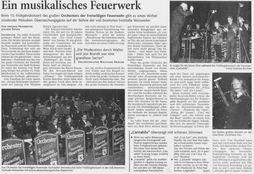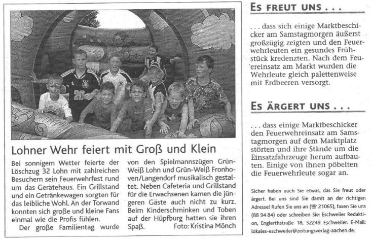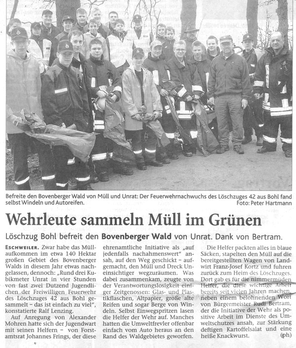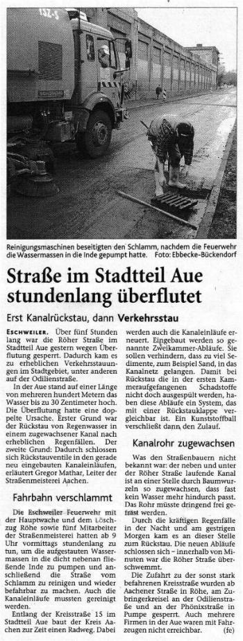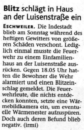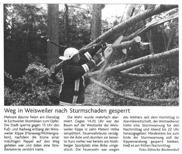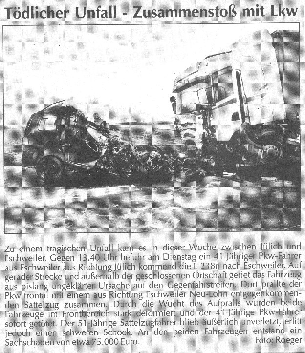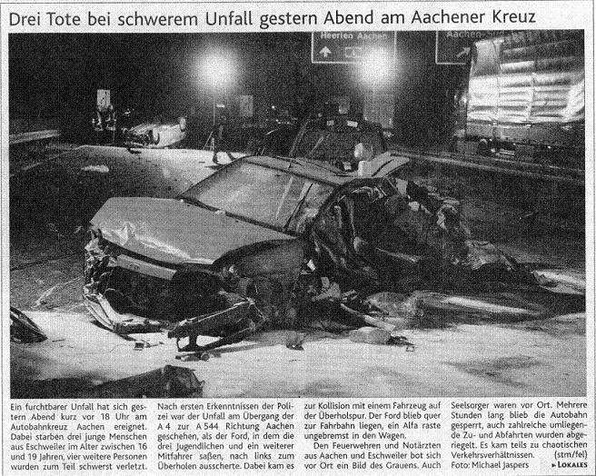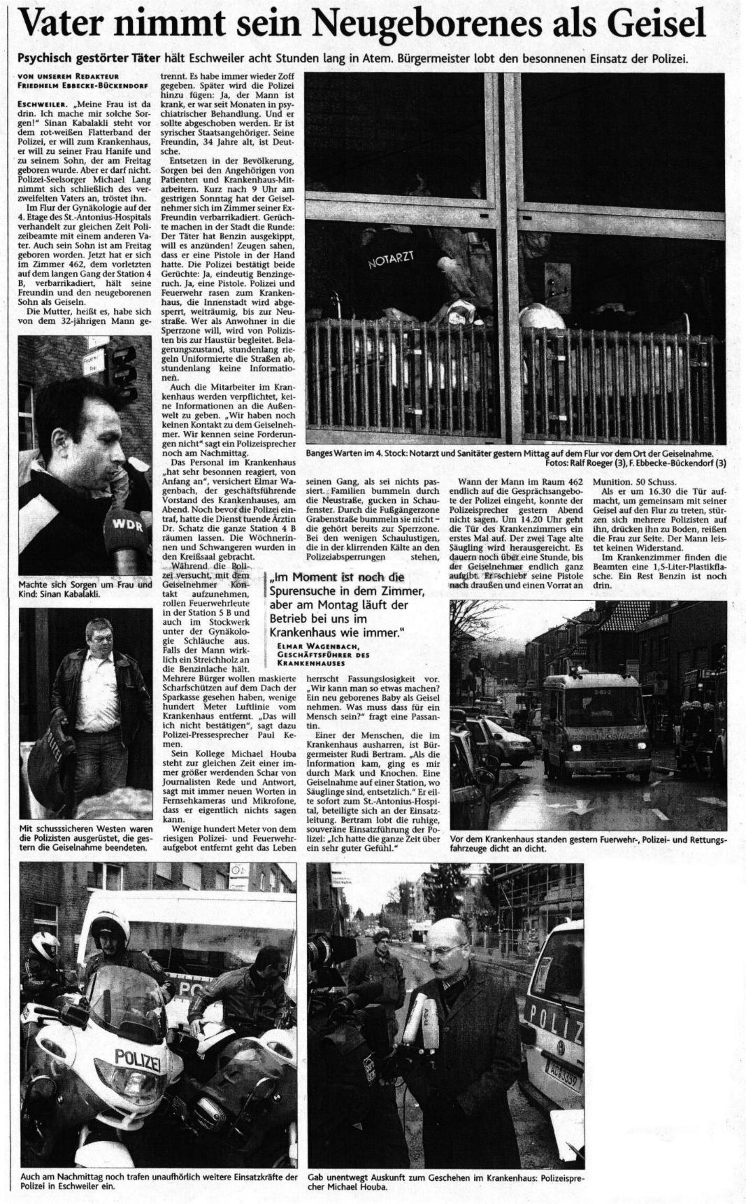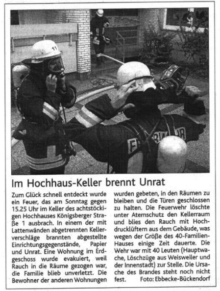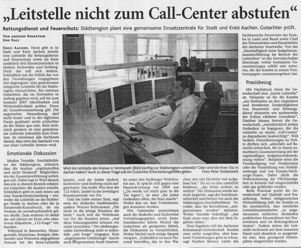 2006 31.12.2006 Geld in die Sicherheit investiert EN / EZ 22.12.2006 Feuerwehr spart, aber nicht am falschen Ende EN / EZ 26.11.2006 Tödlicher Unfall - Zusammenstoß mit Lkw Super Sonntag 24.11.2006 Bei der Feuerwehr wird begeistert getrommelt... EN / EZ 23.11.2006 Die Gefahren sollen weggebaggert werden EN / EZ 23.11.2006 Auch harte Männer dürfen weinen EN / EZ 23.11.2006 Schock und Trauer nach den tödlichen Unfällen EN / EZ 22.11.2006 Drei Tote bei schwerem Unfall gestern Abend... EN / EZ 21.11.2006 Vier Menschen aus Eschweiler sterben bei... EN / EZ 16.11.2006 Seniorin kämpft sich durch die Flammen EN / EZ 30.10.2006 Auch zwei Damen büffeln für den Ernstfall EN / EZ 28.10.2006 Küchenbrand im Restaurant zerstört die Abluftanlage EN / EZ 25.10.2006 Weg in Weisweiler nach Sturmschaden entsperrt EN / EZ 23.10.2006 Fünf Vermisste im Flammenmeer EN / EZ 19.10.2006 Leitstelle nicht zum Call-Center abstufen EN / EZ 16.10.2006 Im Hochhaus-Keller brennt Unrat EN / EZ 28.09.2006 Kochtopf auf dem Herd vergessen EN / EZ 16.09.2006 Brennende Kartons an der Marktstraße EN / EZ 12.09.2006 Lkw in der Kaserne kippt auf die Seite EN / EZ 02.09.2006 Feuerwehr rettet Menschen aus brennendem Haus EN / EZ 28.08.2006 Schleudertour mit Wagen endet auf den Schienen... EN / EZ 25.08.2006 Drei Verletzte nach frontalem Zusammenstoß auf... EN / EZ 23.08.2006 Fataler Dreh am falschen Griff EN / EZ 21.08.2006 24 Stunden lang löschen, bergen, retten EN / EZ 17.08.2006 Feuerwehreinsatz nach Trinkgelage EN / EZ 14.08.2006 Rauchmelder rettet Familie das Leben EN / EZ 08.08.2006 Feuerwehr unterhält auch die Kinder EN / EZ 29.07.2006 Hunderte Keller nach Unwetter unter Wasser EN / EZ 27.07.2006 Nach 90 Minuten ist Arentino gerettet EN / EZ 25.07.2006 Flammen über dem Blausteinsee EN / EZ 07.07.2006 Herabstürzender Stahlträger verletzt Arbeiter... EN / EZ 06.07.2006 Wehrleute lernen vieles, nur nicht Daumen drehen EN / EZ 06.07.2006 Feuerwehr birgt Regenfass aus der Inde EN / EZ 05.07.2006 Feuer in der Uferstraße: 50 000 Euro Schaden EN / EZ 27.06.2006 Blitz schlägt in Haus an der Luisenstraße ein EN / EZ 27.06.2006 Lohner Wehr feiert mit Groß und Klein EN / EZ 26.06.2006 Rauch und Ruß legen ganze Häuserzeile lahm EN / EZ 24.06.2006 Bohls Jugendfeuerwehr schaut Kölner Kollegen... EN / EZ 20.06.2006 Panik, wenn es brennt? Das ist falsch, lernen... EN / EZ 06.06.2006 Küche brennt: Mutter und Kind verletzt EN / EZ 30.05.2006 Kinder übers Dach gerettet EN / EZ 22.05.2006 Orkanböen sorgen nicht nur im Wald für eine... EN / EZ 18.05.2006 Timo will jetzt zur Feuerwehr EN / EZ 17.05.2006 Nach Autobahn-Unfall Stunden im Stau EN / EZ 11.05.2006 Kellerbrand in der Elbinger Straße EN / EZ 09.05.2006 Feuer im Tagebau löst Großeinsatz der Wehren aus EN / EZ 06.05.2006 Land unter in der Kinzweiler Grundschule EN / EZ 26.04.2006 Vorreiterrolle bei der ABC-Gefahrenabwehr EN / EZ 24.04.2006 Dichter Rauch über der Mülldeponie EN / EZ 18.04.2006 Insgesamt 9040 Mal rückt die Feuerwehr aus EN / EZ 13.04.2006 Kommunen im Kreis bilden ihren... EN / EZ 12.04.2006 Wehrleute sammeln Müll im Grünen EN / EZ 09.04.2006 Feuerwehrleute lernen gemeinsam EN / EZ 03.04.2006 Ein musikalisches Feuerwerk EN / EZ 24.03.2006 80-Jährige nach Unfall im Krankenhaus EN / EZ 14.03.2006 Bürgermeister lobt Helfer und Feuerwehr EN / EZ 13.03.2006 Vater nimmt sein Neugeborenes als Geisel EN / EZ 07.03.2006 Wendemanöver endet im Eschweiler Krankenhaus EN / EZ 01.03.2006 Rettungskräfte rücken weniger oft aus EN / EZ 27.02.2006 Hauptwache der Feuerwehr drei Stunden außer... EN / EZ 18.02.2006 Starker Rauch aus dem Obergeschoss EN / EZ 14.02.2006 Nachwuchssorgen für die Feuerwehr kein Thema EN / EZ 11.02.2006 Breite Ölspur an der Wasserwiese EN / EZ 09.02.2006 Feuerwehr rettet zwei Männer von einer Hebebühne EN / EZ 09.02.2006 Straße im Stadtteil Aue stundenlang überflutet EN / EZ 08.02.2006 Kripo: Es war Branddstiftung EN / EZ 08.02.2006 Der alte Löschwagen der Röher Feuerwehr ist nach... EN / EZ 04.02.2006 Panische Hilfeschreie vom Dach EN / EZ 24.01.2006 Tödlicher Unfall bei Kinzweiler EN / EZ 21.01.2006 Gardetenöre LZ31 EN / EZ 16.01.2006 Zucker ausgelaufen: Feuerwehr schrubbt die... EN / EZ 10.01.2006 Kompressor in Flammen EN / EZ 09.01.2006 Kurz notiert: Feuerwehr bietet warmen Unterschlupf EN / EZ 09.01.2006 Hinter Weisweiler landet wieder ein Fahrzeug auf... EN / EZ 02.01.2006 Feuerwehr legt die Füße hoch: So ruhig war's an Silverster selten EN / EZ