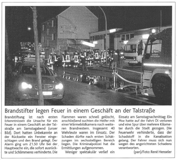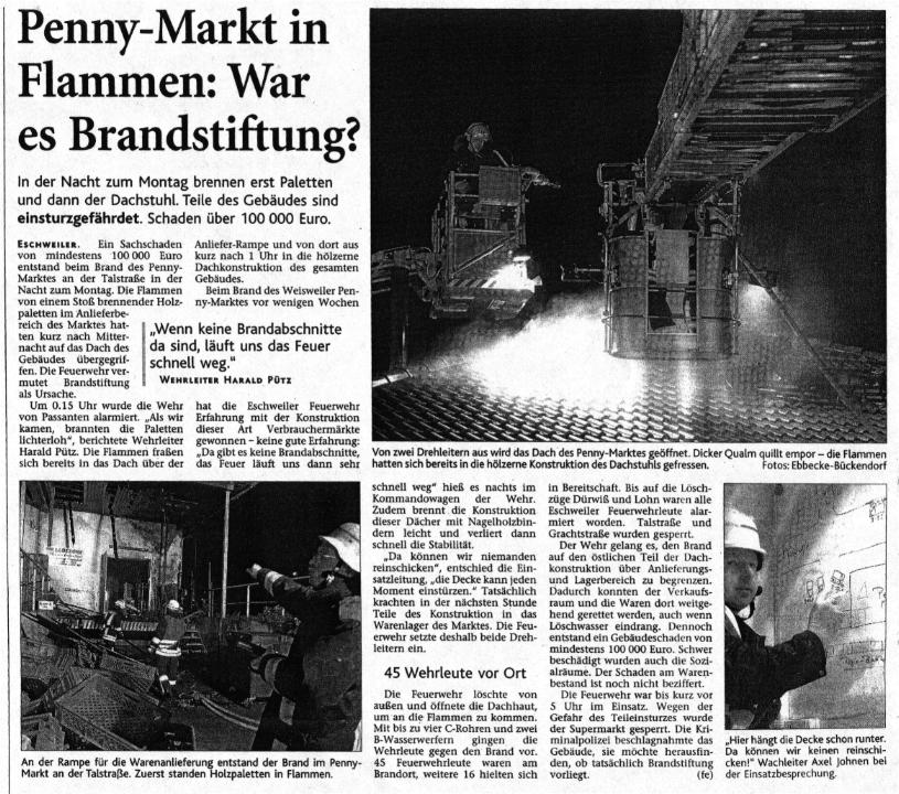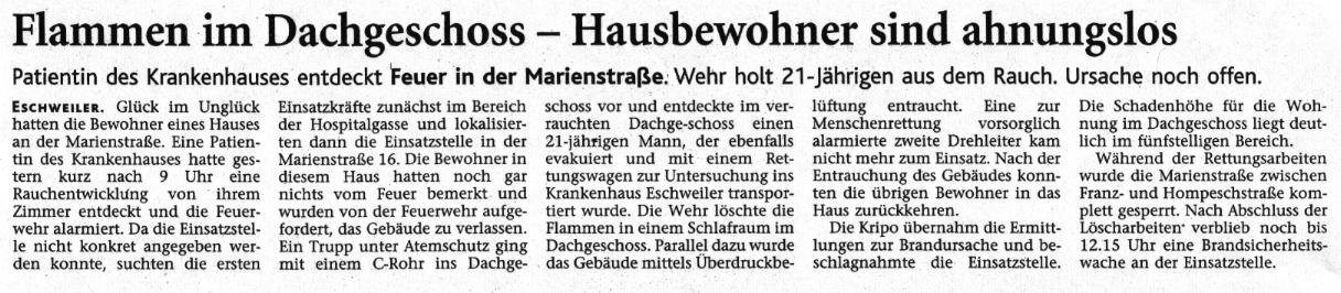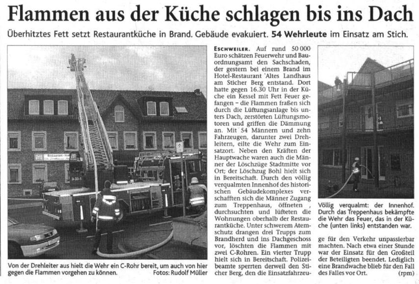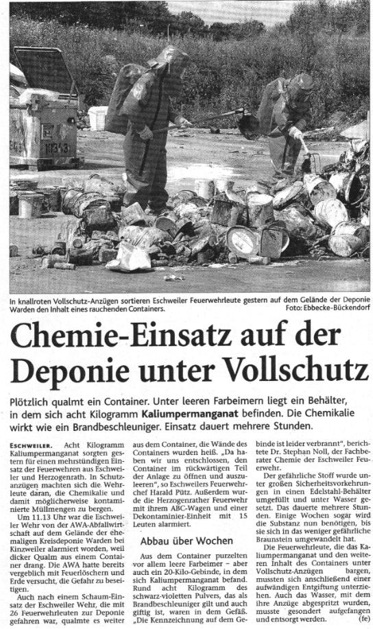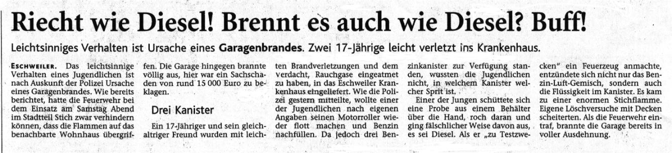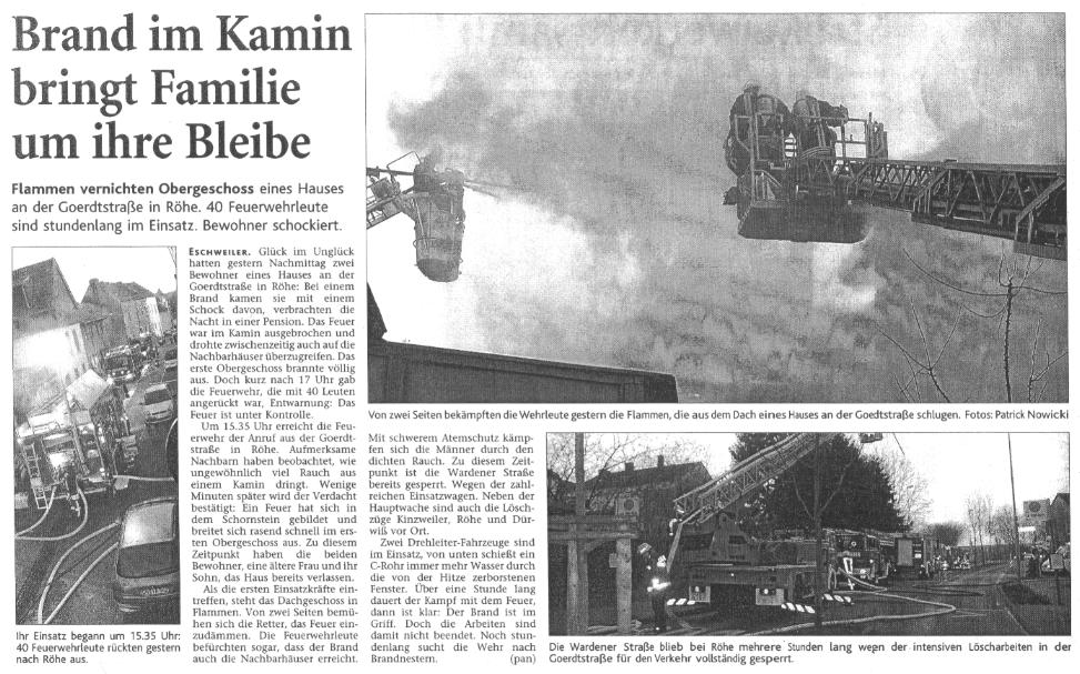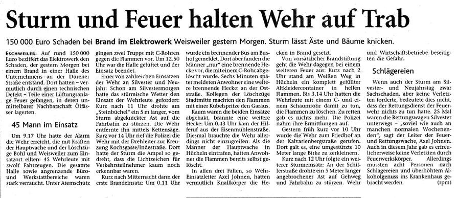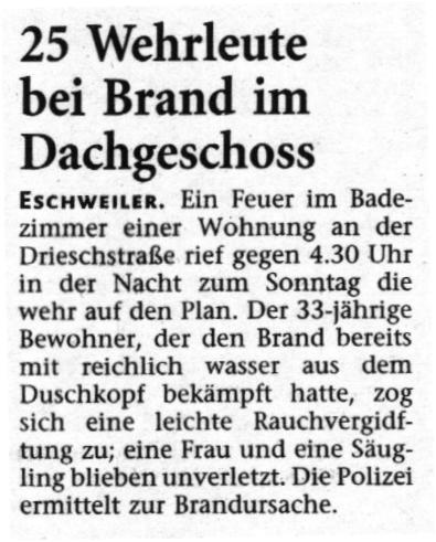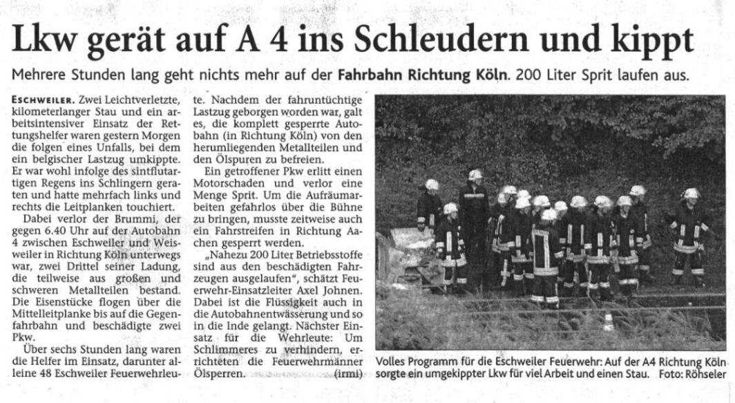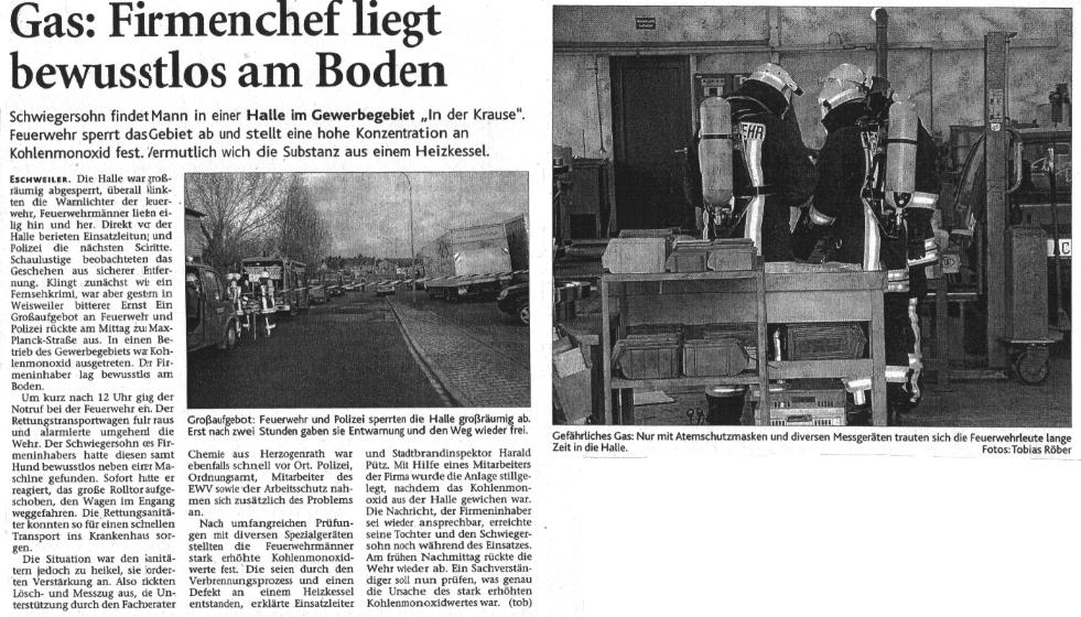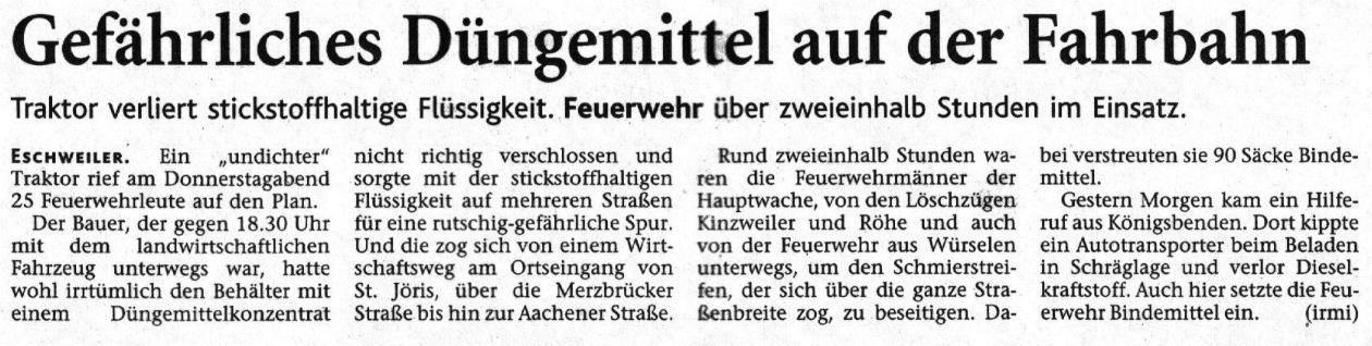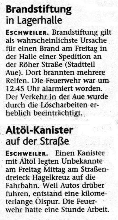 2007 31.12.2007 Brandstifter legen Feuer in einem Geschäft... EN / EZ 29.12.2007 Gas: Firmenchef liegt bewusstlos am Boden EN / EZ 27.12.2007 Kurz notiert: Zwei Kamine fangen Feuer EN / EZ 19.12.2007 Brand im Kamin bringt Familie um ihre Bleibe EN / EZ 29.11.2007 Wehrleute flöten sich ins Jubeljahr EN / EZ 19.10.2007 Frau verletzt bei Pkw-Überschlag EN / EZ 16.10.2007 Michel nun Ehrenmitglied der Feuerwehr EN / EZ 05.10.2007 Schlammmassen wälzen sich in Bergrather Keller EN / EZ 29.09.2007 Wehren bilden gemeinsam aus EN / EZ 29.09.2007 Ohne Gummistiefel geht nichts mehr EN / EZ 22.09.2007 Liebes Tagebuch... EN / EZ 18.09.2007 Penny-Markt in Flammen: War es Brandstiftung? EN / EZ 15.09.2007 Nichts geht mehr: Fahrer verliert Kontrolle... EN / EZ 14.09.2007 Schwer erkrankte Patientin mit der Drehleiter... EN / EZ 10.08.2007 Lkw gerät auf A4 ins Schleudern und kippt EN / EZ 01.08.2007 Chemie-Einsatz auf der Deponie unter Vollschutz EN / EZ 28.07.2007 Faule Jugendliche? Von Wegen! EN / EZ 15.06.2007 Zwischen Lastwagen eingeklemmt... EN / EZ 12.06.2007 Riecht wie Diesel! Brennt es auch wie Diesel? Buff! EN / EZ 11.06.2007 Blitz sprengt Kamin vom Dach, Land unter an... EN / EZ 03.06.2007 Realistische Übung mit geschminkten Verletzten EN / EZ 19.05.2007 Plötzlich ist der Bus voller Qualm EN / EZ 18.05.2007 Discountmarkt ist keinen Penny mehr wert EN / EZ 17.05.2007 Nachwuchs von Feuerwehr und THW schauen sich... EN / EZ 15.05.2007 Hinterm Kreisel stoppt Baum Schleuderfahrt EN / EZ 09.05.2007 Mutter und drei Kinder ins Krankenhaus EN / EZ 30.04.2007 Fflammen im Dachgeschoss - Hausbewohner sind... EN / EZ 29.04.2007 Tolles Erlebnis: "Girl's Day" bei der Eschweiler... EN / EZ 28.04.2007 THW OV Eschweiler übt in Schutzkleidung bei 30°C EN / EZ 27.04.2007 Dort müssen Frauen starke Nerven haben EN / EZ 17.04.2007 Aus dem Müllwagen schlagen plötzlich die Flammen EN / EZ 16.04.2007 Fuhrpark der Wehr zieht die Kleinen magisch an EN / EZ 14.04.2007 Gefährliches Düngemittel auf der Fahrbahn EN / EZ 11.04.2007 Feuerwehren zählen mehr als 3000 Mitglieder EN / EZ 10.04.2007 Rekord-Spritspur hält die Wehr gehörig auf Trab EN / EZ 10.04.2007 25 Wehrleute bei Brand im Dachgeschoss EN / EZ 31.03.2007 Martinshorn ertönt aus neuem Feuerwehrwagen EN / EZ 26.03.2007 8338 Mal ertönt das Martinshorn der Feuerwehr EN / EZ 24.03.2007 Brandstiftung in Lagerhalle EN / EZ 07.03.2007 Flammen aus der Küche schlagen bis ins Dach EN / EZ 06.03.2007 Ganze Säcke voller Müll und Unrat aus dem... EN / EZ 06.03.2007 Kurz notiert: Unfallfahrer mit fast drei Promille EN / EZ 05.03.2007 22-Jähriger aus Eschweiler stirbt bei Unfall... EN / EZ 03.03.2007 Dem Wehrdienst entgangen, aber bei Feuerwehr... EN / EZ 27.02.2007 Rauchmelder schlägt rechtzeitig Alarm EN / EZ 23.02.2007 Kurz notiert: Wegen Ölspur Ausfahrt gesperrt EN / EZ 19.02.2007 Jetzt trägt das "Müsje" einen Feuerwehrhelm EN / EZ 29.01.2007 Statt der Waldsäuberung eine Stadtwald-Gipfeltour EN / EZ 25.01.2007 44-Jähriger im Schutt-Shredder eingeklemmt EN / EZ 21.01.2007 Eschweiler kommt mit blauem Auge aus dem Sturm EN / EZ 20.01.2007 Am Morgen beginnt das große Reinemachen EN / EZ 12.01.2007 Wagen knickt Laterne und kanllt gegen Hauswand EN / EZ 03.01.2007 Vier Verletzte im Autowrack nach dem Salto... EN / EZ 02.01.2007 Sturm und Feuer halten Wehr auf Trab EN / EZ