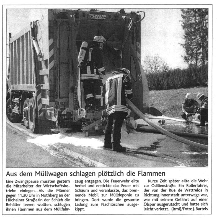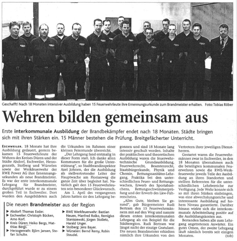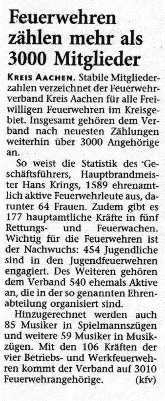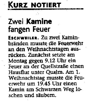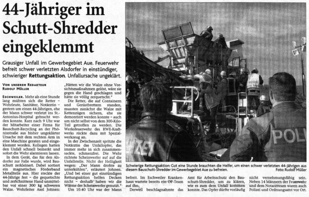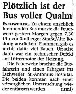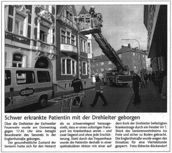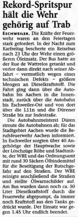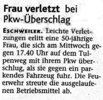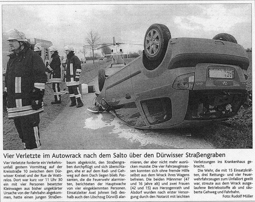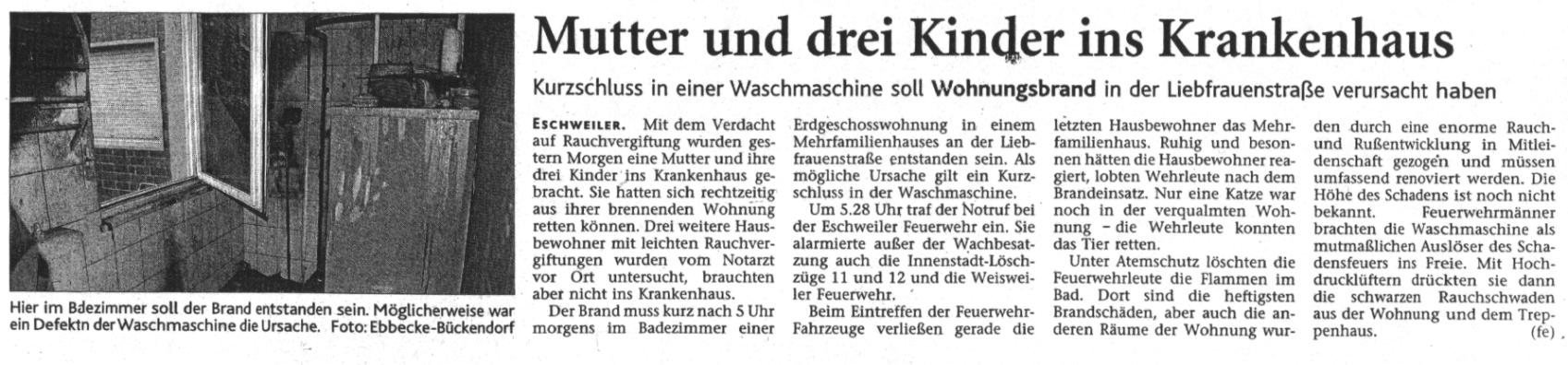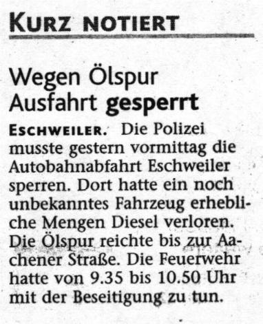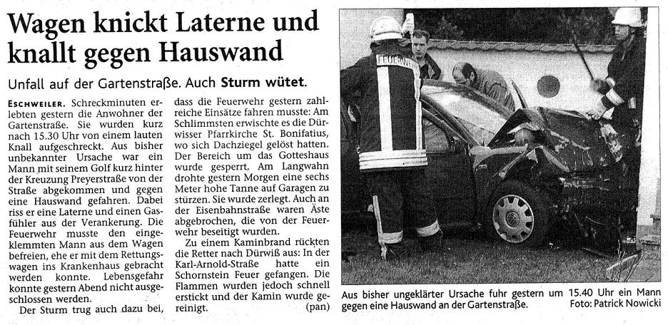 2007 31.12.2007 Brandstifter legen Feuer in einem Geschäft... EN / EZ 29.12.2007 Gas: Firmenchef liegt bewusstlos am Boden EN / EZ 27.12.2007 Kurz notiert: Zwei Kamine fangen Feuer EN / EZ 19.12.2007 Brand im Kamin bringt Familie um ihre Bleibe EN / EZ 29.11.2007 Wehrleute flöten sich ins Jubeljahr EN / EZ 19.10.2007 Frau verletzt bei Pkw-Überschlag EN / EZ 16.10.2007 Michel nun Ehrenmitglied der Feuerwehr EN / EZ 05.10.2007 Schlammmassen wälzen sich in Bergrather Keller EN / EZ 29.09.2007 Wehren bilden gemeinsam aus EN / EZ 29.09.2007 Ohne Gummistiefel geht nichts mehr EN / EZ 22.09.2007 Liebes Tagebuch... EN / EZ 18.09.2007 Penny-Markt in Flammen: War es Brandstiftung? EN / EZ 15.09.2007 Nichts geht mehr: Fahrer verliert Kontrolle... EN / EZ 14.09.2007 Schwer erkrankte Patientin mit der Drehleiter... EN / EZ 10.08.2007 Lkw gerät auf A4 ins Schleudern und kippt EN / EZ 01.08.2007 Chemie-Einsatz auf der Deponie unter Vollschutz EN / EZ 28.07.2007 Faule Jugendliche? Von Wegen! EN / EZ 15.06.2007 Zwischen Lastwagen eingeklemmt... EN / EZ 12.06.2007 Riecht wie Diesel! Brennt es auch wie Diesel? Buff! EN / EZ 11.06.2007 Blitz sprengt Kamin vom Dach, Land unter an... EN / EZ 03.06.2007 Realistische Übung mit geschminkten Verletzten EN / EZ 19.05.2007 Plötzlich ist der Bus voller Qualm EN / EZ 18.05.2007 Discountmarkt ist keinen Penny mehr wert EN / EZ 17.05.2007 Nachwuchs von Feuerwehr und THW schauen sich... EN / EZ 15.05.2007 Hinterm Kreisel stoppt Baum Schleuderfahrt EN / EZ 09.05.2007 Mutter und drei Kinder ins Krankenhaus EN / EZ 30.04.2007 Fflammen im Dachgeschoss - Hausbewohner sind... EN / EZ 29.04.2007 Tolles Erlebnis: "Girl's Day" bei der Eschweiler... EN / EZ 28.04.2007 THW OV Eschweiler übt in Schutzkleidung bei 30°C EN / EZ 27.04.2007 Dort müssen Frauen starke Nerven haben EN / EZ 17.04.2007 Aus dem Müllwagen schlagen plötzlich die Flammen EN / EZ 16.04.2007 Fuhrpark der Wehr zieht die Kleinen magisch an EN / EZ 14.04.2007 Gefährliches Düngemittel auf der Fahrbahn EN / EZ 11.04.2007 Feuerwehren zählen mehr als 3000 Mitglieder EN / EZ 10.04.2007 Rekord-Spritspur hält die Wehr gehörig auf Trab EN / EZ 10.04.2007 25 Wehrleute bei Brand im Dachgeschoss EN / EZ 31.03.2007 Martinshorn ertönt aus neuem Feuerwehrwagen EN / EZ 26.03.2007 8338 Mal ertönt das Martinshorn der Feuerwehr EN / EZ 24.03.2007 Brandstiftung in Lagerhalle EN / EZ 07.03.2007 Flammen aus der Küche schlagen bis ins Dach EN / EZ 06.03.2007 Ganze Säcke voller Müll und Unrat aus dem... EN / EZ 06.03.2007 Kurz notiert: Unfallfahrer mit fast drei Promille EN / EZ 05.03.2007 22-Jähriger aus Eschweiler stirbt bei Unfall... EN / EZ 03.03.2007 Dem Wehrdienst entgangen, aber bei Feuerwehr... EN / EZ 27.02.2007 Rauchmelder schlägt rechtzeitig Alarm EN / EZ 23.02.2007 Kurz notiert: Wegen Ölspur Ausfahrt gesperrt EN / EZ 19.02.2007 Jetzt trägt das "Müsje" einen Feuerwehrhelm EN / EZ 29.01.2007 Statt der Waldsäuberung eine Stadtwald-Gipfeltour EN / EZ 25.01.2007 44-Jähriger im Schutt-Shredder eingeklemmt EN / EZ 21.01.2007 Eschweiler kommt mit blauem Auge aus dem Sturm EN / EZ 20.01.2007 Am Morgen beginnt das große Reinemachen EN / EZ 12.01.2007 Wagen knickt Laterne und kanllt gegen Hauswand EN / EZ 03.01.2007 Vier Verletzte im Autowrack nach dem Salto... EN / EZ 02.01.2007 Sturm und Feuer halten Wehr auf Trab EN / EZ
