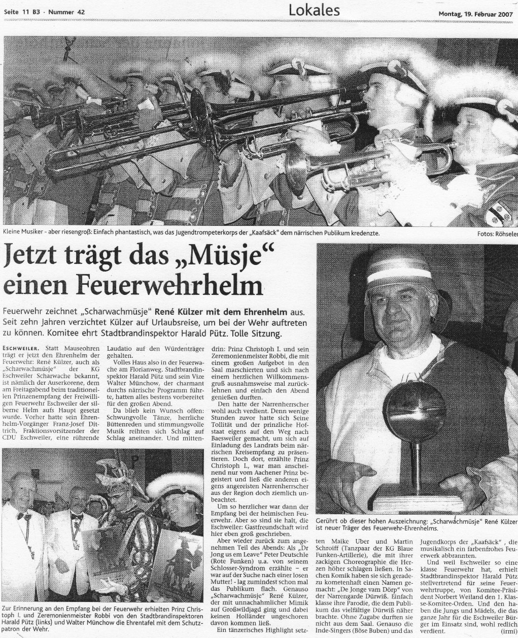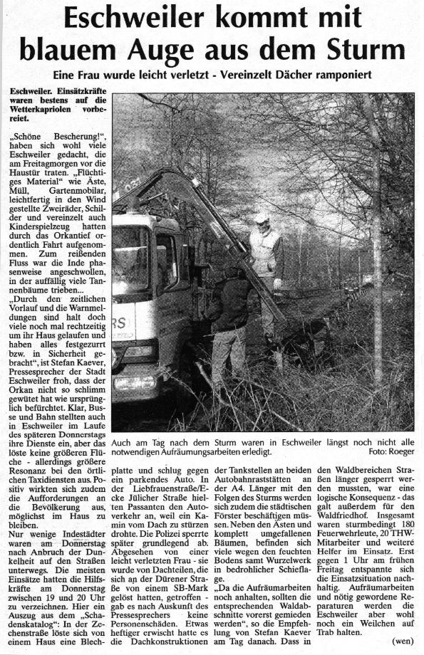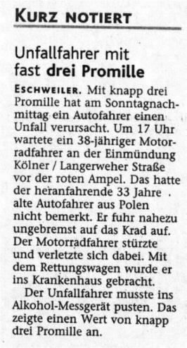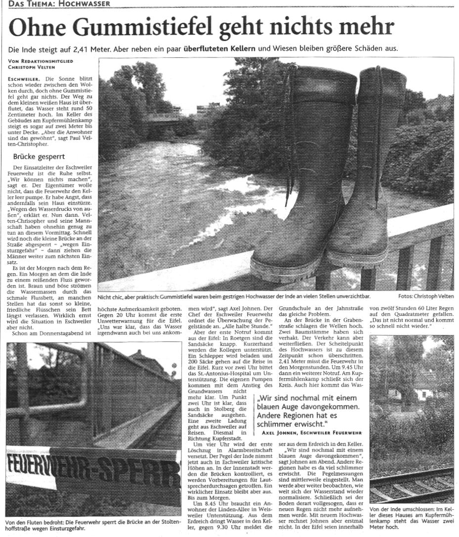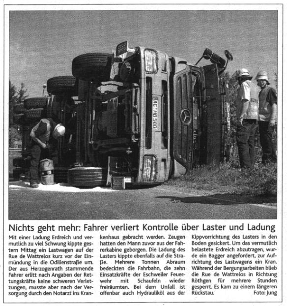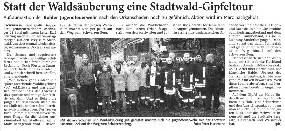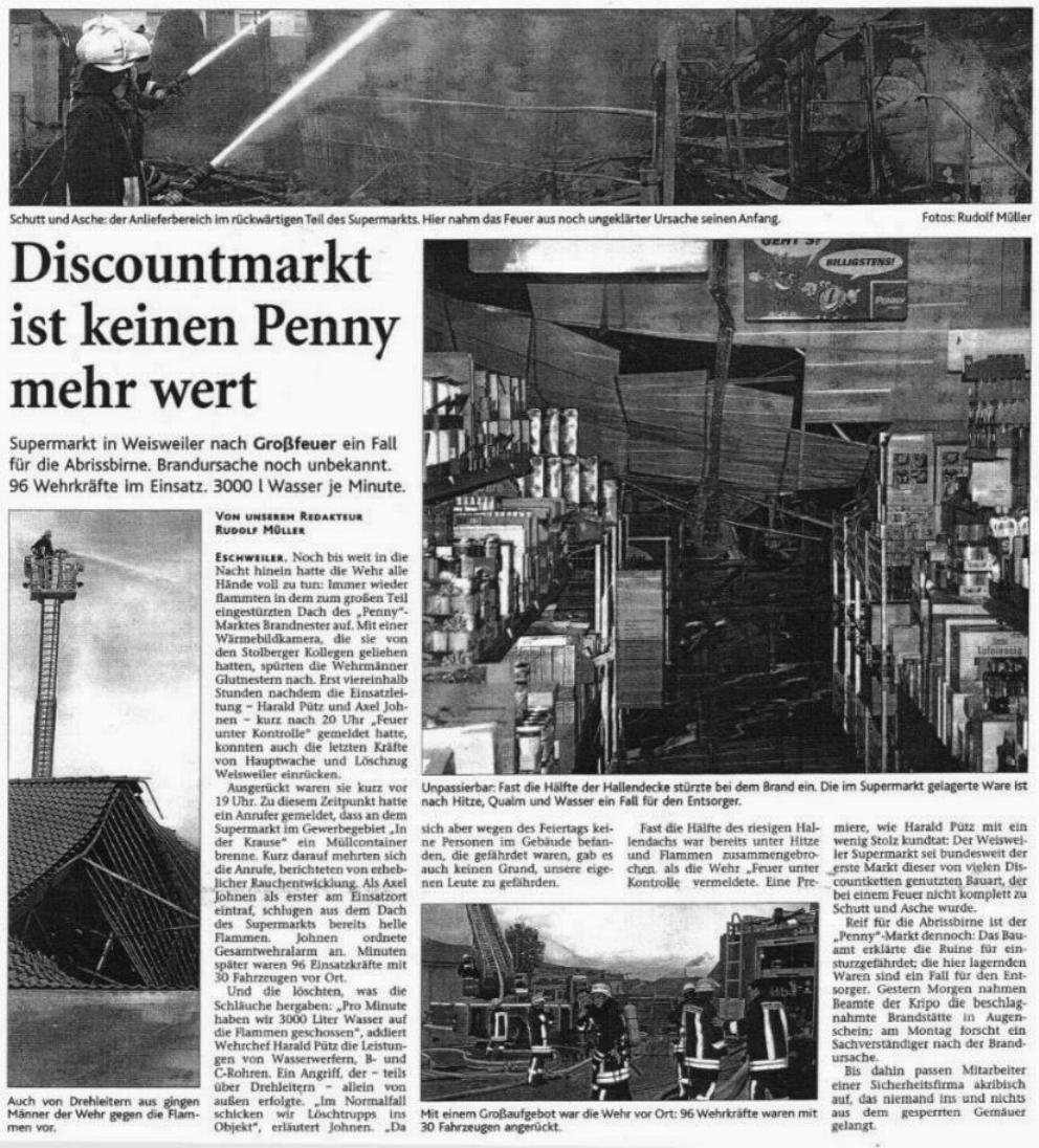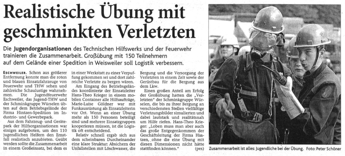 2007 31.12.2007 Brandstifter legen Feuer in einem Geschäft... EN / EZ 29.12.2007 Gas: Firmenchef liegt bewusstlos am Boden EN / EZ 27.12.2007 Kurz notiert: Zwei Kamine fangen Feuer EN / EZ 19.12.2007 Brand im Kamin bringt Familie um ihre Bleibe EN / EZ 29.11.2007 Wehrleute flöten sich ins Jubeljahr EN / EZ 19.10.2007 Frau verletzt bei Pkw-Überschlag EN / EZ 16.10.2007 Michel nun Ehrenmitglied der Feuerwehr EN / EZ 05.10.2007 Schlammmassen wälzen sich in Bergrather Keller EN / EZ 29.09.2007 Wehren bilden gemeinsam aus EN / EZ 29.09.2007 Ohne Gummistiefel geht nichts mehr EN / EZ 22.09.2007 Liebes Tagebuch... EN / EZ 18.09.2007 Penny-Markt in Flammen: War es Brandstiftung? EN / EZ 15.09.2007 Nichts geht mehr: Fahrer verliert Kontrolle... EN / EZ 14.09.2007 Schwer erkrankte Patientin mit der Drehleiter... EN / EZ 10.08.2007 Lkw gerät auf A4 ins Schleudern und kippt EN / EZ 01.08.2007 Chemie-Einsatz auf der Deponie unter Vollschutz EN / EZ 28.07.2007 Faule Jugendliche? Von Wegen! EN / EZ 15.06.2007 Zwischen Lastwagen eingeklemmt... EN / EZ 12.06.2007 Riecht wie Diesel! Brennt es auch wie Diesel? Buff! EN / EZ 11.06.2007 Blitz sprengt Kamin vom Dach, Land unter an... EN / EZ 03.06.2007 Realistische Übung mit geschminkten Verletzten EN / EZ 19.05.2007 Plötzlich ist der Bus voller Qualm EN / EZ 18.05.2007 Discountmarkt ist keinen Penny mehr wert EN / EZ 17.05.2007 Nachwuchs von Feuerwehr und THW schauen sich... EN / EZ 15.05.2007 Hinterm Kreisel stoppt Baum Schleuderfahrt EN / EZ 09.05.2007 Mutter und drei Kinder ins Krankenhaus EN / EZ 30.04.2007 Fflammen im Dachgeschoss - Hausbewohner sind... EN / EZ 29.04.2007 Tolles Erlebnis: "Girl's Day" bei der Eschweiler... EN / EZ 28.04.2007 THW OV Eschweiler übt in Schutzkleidung bei 30°C EN / EZ 27.04.2007 Dort müssen Frauen starke Nerven haben EN / EZ 17.04.2007 Aus dem Müllwagen schlagen plötzlich die Flammen EN / EZ 16.04.2007 Fuhrpark der Wehr zieht die Kleinen magisch an EN / EZ 14.04.2007 Gefährliches Düngemittel auf der Fahrbahn EN / EZ 11.04.2007 Feuerwehren zählen mehr als 3000 Mitglieder EN / EZ 10.04.2007 Rekord-Spritspur hält die Wehr gehörig auf Trab EN / EZ 10.04.2007 25 Wehrleute bei Brand im Dachgeschoss EN / EZ 31.03.2007 Martinshorn ertönt aus neuem Feuerwehrwagen EN / EZ 26.03.2007 8338 Mal ertönt das Martinshorn der Feuerwehr EN / EZ 24.03.2007 Brandstiftung in Lagerhalle EN / EZ 07.03.2007 Flammen aus der Küche schlagen bis ins Dach EN / EZ 06.03.2007 Ganze Säcke voller Müll und Unrat aus dem... EN / EZ 06.03.2007 Kurz notiert: Unfallfahrer mit fast drei Promille EN / EZ 05.03.2007 22-Jähriger aus Eschweiler stirbt bei Unfall... EN / EZ 03.03.2007 Dem Wehrdienst entgangen, aber bei Feuerwehr... EN / EZ 27.02.2007 Rauchmelder schlägt rechtzeitig Alarm EN / EZ 23.02.2007 Kurz notiert: Wegen Ölspur Ausfahrt gesperrt EN / EZ 19.02.2007 Jetzt trägt das "Müsje" einen Feuerwehrhelm EN / EZ 29.01.2007 Statt der Waldsäuberung eine Stadtwald-Gipfeltour EN / EZ 25.01.2007 44-Jähriger im Schutt-Shredder eingeklemmt EN / EZ 21.01.2007 Eschweiler kommt mit blauem Auge aus dem Sturm EN / EZ 20.01.2007 Am Morgen beginnt das große Reinemachen EN / EZ 12.01.2007 Wagen knickt Laterne und kanllt gegen Hauswand EN / EZ 03.01.2007 Vier Verletzte im Autowrack nach dem Salto... EN / EZ 02.01.2007 Sturm und Feuer halten Wehr auf Trab EN / EZ