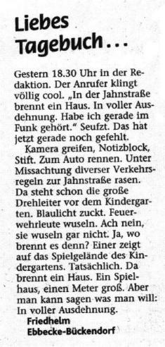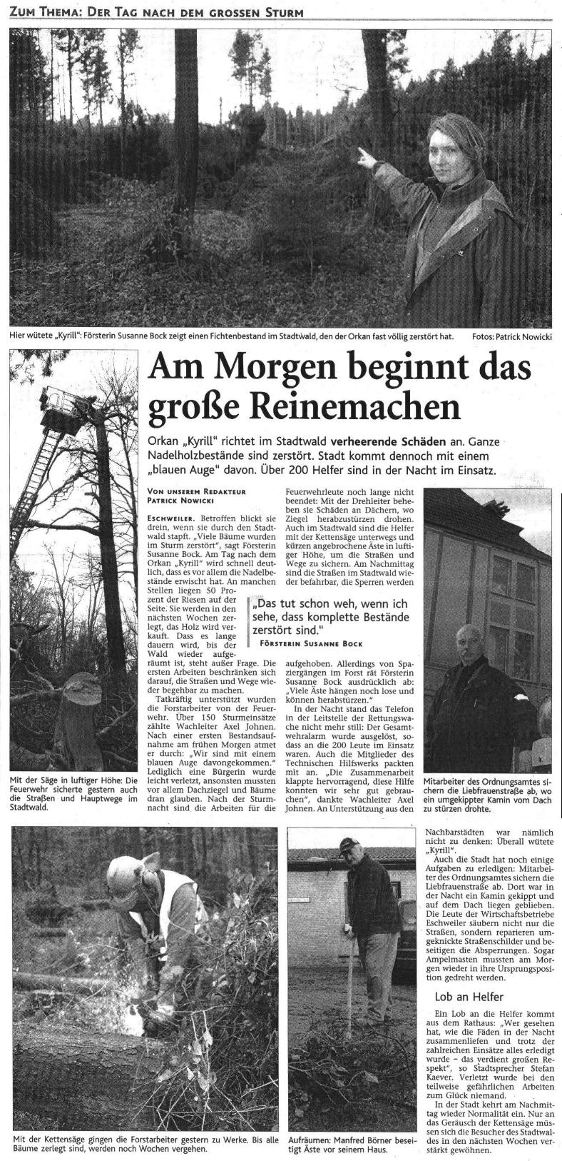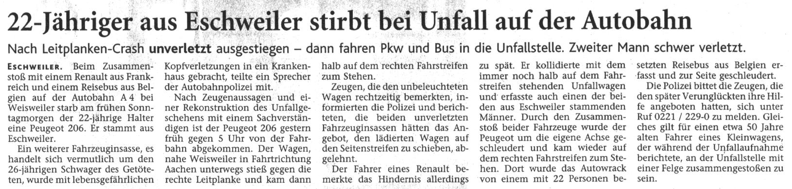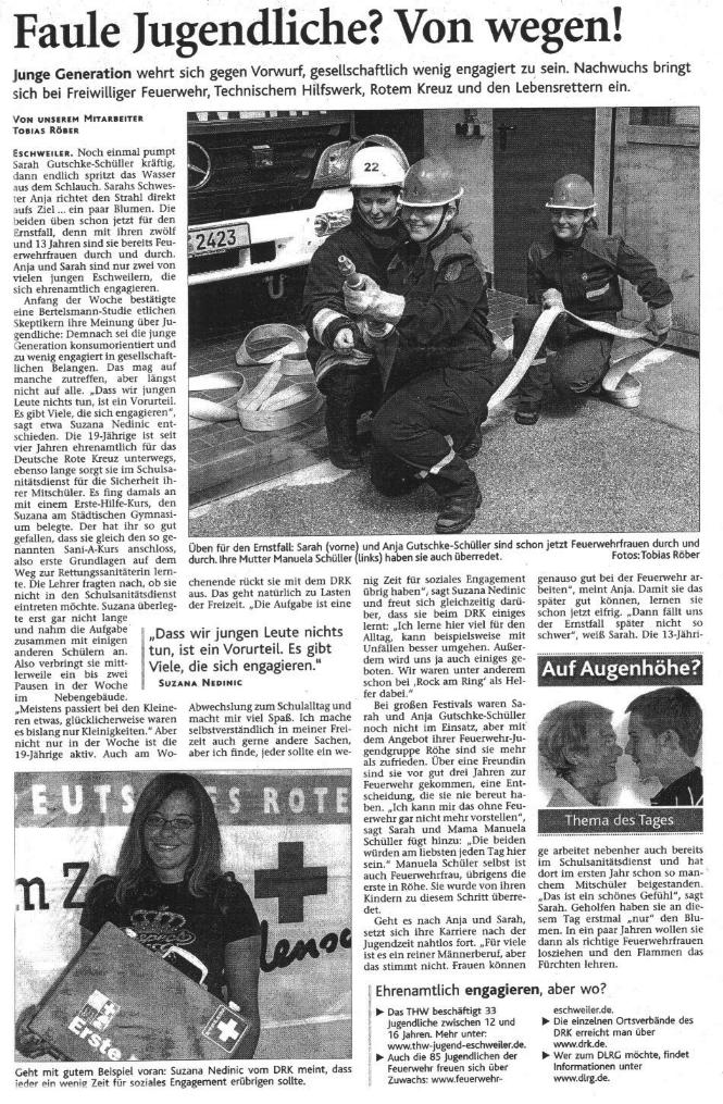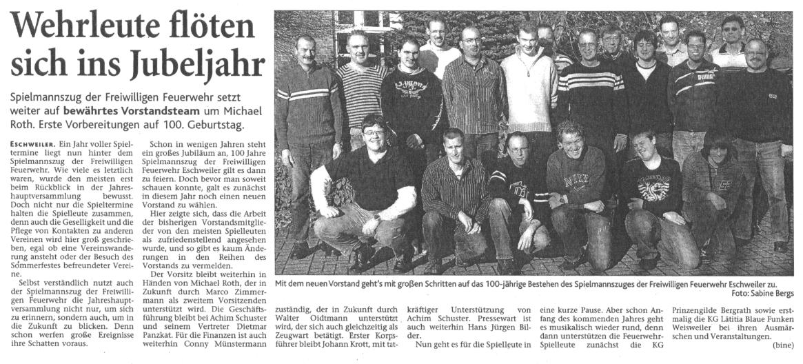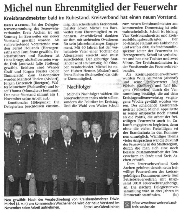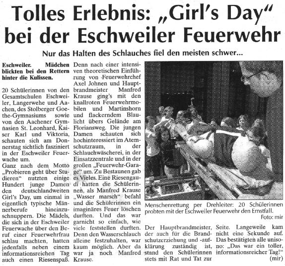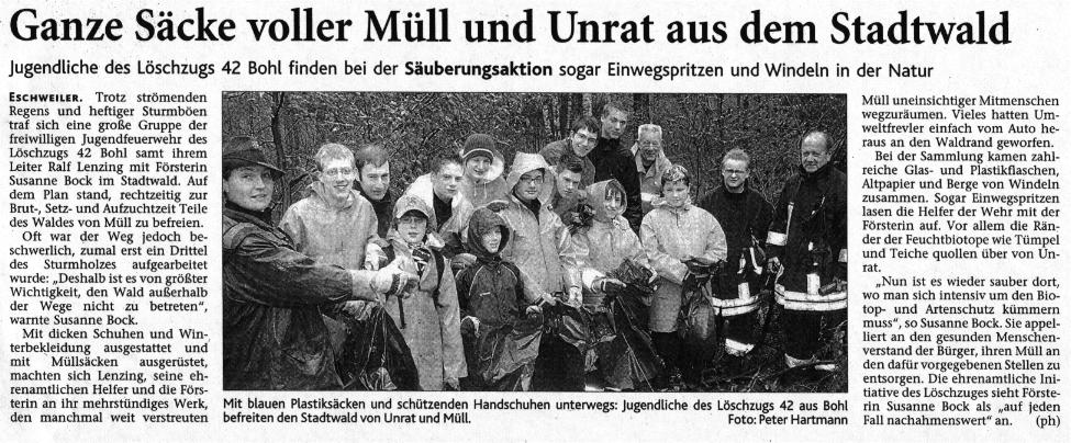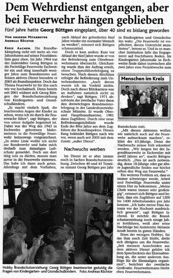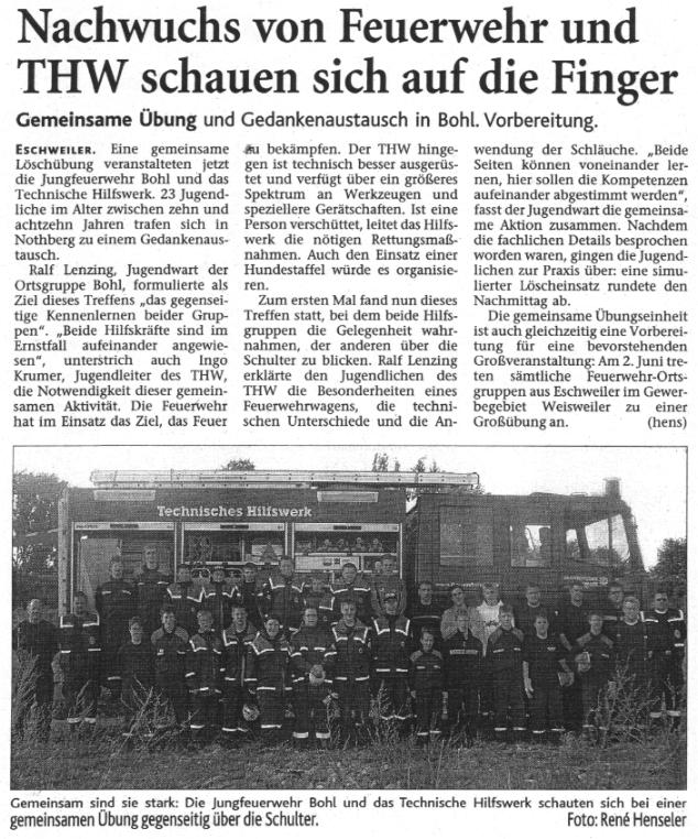 2007 31.12.2007 Brandstifter legen Feuer in einem Geschäft... EN / EZ 29.12.2007 Gas: Firmenchef liegt bewusstlos am Boden EN / EZ 27.12.2007 Kurz notiert: Zwei Kamine fangen Feuer EN / EZ 19.12.2007 Brand im Kamin bringt Familie um ihre Bleibe EN / EZ 29.11.2007 Wehrleute flöten sich ins Jubeljahr EN / EZ 19.10.2007 Frau verletzt bei Pkw-Überschlag EN / EZ 16.10.2007 Michel nun Ehrenmitglied der Feuerwehr EN / EZ 05.10.2007 Schlammmassen wälzen sich in Bergrather Keller EN / EZ 29.09.2007 Wehren bilden gemeinsam aus EN / EZ 29.09.2007 Ohne Gummistiefel geht nichts mehr EN / EZ 22.09.2007 Liebes Tagebuch... EN / EZ 18.09.2007 Penny-Markt in Flammen: War es Brandstiftung? EN / EZ 15.09.2007 Nichts geht mehr: Fahrer verliert Kontrolle... EN / EZ 14.09.2007 Schwer erkrankte Patientin mit der Drehleiter... EN / EZ 10.08.2007 Lkw gerät auf A4 ins Schleudern und kippt EN / EZ 01.08.2007 Chemie-Einsatz auf der Deponie unter Vollschutz EN / EZ 28.07.2007 Faule Jugendliche? Von Wegen! EN / EZ 15.06.2007 Zwischen Lastwagen eingeklemmt... EN / EZ 12.06.2007 Riecht wie Diesel! Brennt es auch wie Diesel? Buff! EN / EZ 11.06.2007 Blitz sprengt Kamin vom Dach, Land unter an... EN / EZ 03.06.2007 Realistische Übung mit geschminkten Verletzten EN / EZ 19.05.2007 Plötzlich ist der Bus voller Qualm EN / EZ 18.05.2007 Discountmarkt ist keinen Penny mehr wert EN / EZ 17.05.2007 Nachwuchs von Feuerwehr und THW schauen sich... EN / EZ 15.05.2007 Hinterm Kreisel stoppt Baum Schleuderfahrt EN / EZ 09.05.2007 Mutter und drei Kinder ins Krankenhaus EN / EZ 30.04.2007 Fflammen im Dachgeschoss - Hausbewohner sind... EN / EZ 29.04.2007 Tolles Erlebnis: "Girl's Day" bei der Eschweiler... EN / EZ 28.04.2007 THW OV Eschweiler übt in Schutzkleidung bei 30°C EN / EZ 27.04.2007 Dort müssen Frauen starke Nerven haben EN / EZ 17.04.2007 Aus dem Müllwagen schlagen plötzlich die Flammen EN / EZ 16.04.2007 Fuhrpark der Wehr zieht die Kleinen magisch an EN / EZ 14.04.2007 Gefährliches Düngemittel auf der Fahrbahn EN / EZ 11.04.2007 Feuerwehren zählen mehr als 3000 Mitglieder EN / EZ 10.04.2007 Rekord-Spritspur hält die Wehr gehörig auf Trab EN / EZ 10.04.2007 25 Wehrleute bei Brand im Dachgeschoss EN / EZ 31.03.2007 Martinshorn ertönt aus neuem Feuerwehrwagen EN / EZ 26.03.2007 8338 Mal ertönt das Martinshorn der Feuerwehr EN / EZ 24.03.2007 Brandstiftung in Lagerhalle EN / EZ 07.03.2007 Flammen aus der Küche schlagen bis ins Dach EN / EZ 06.03.2007 Ganze Säcke voller Müll und Unrat aus dem... EN / EZ 06.03.2007 Kurz notiert: Unfallfahrer mit fast drei Promille EN / EZ 05.03.2007 22-Jähriger aus Eschweiler stirbt bei Unfall... EN / EZ 03.03.2007 Dem Wehrdienst entgangen, aber bei Feuerwehr... EN / EZ 27.02.2007 Rauchmelder schlägt rechtzeitig Alarm EN / EZ 23.02.2007 Kurz notiert: Wegen Ölspur Ausfahrt gesperrt EN / EZ 19.02.2007 Jetzt trägt das "Müsje" einen Feuerwehrhelm EN / EZ 29.01.2007 Statt der Waldsäuberung eine Stadtwald-Gipfeltour EN / EZ 25.01.2007 44-Jähriger im Schutt-Shredder eingeklemmt EN / EZ 21.01.2007 Eschweiler kommt mit blauem Auge aus dem Sturm EN / EZ 20.01.2007 Am Morgen beginnt das große Reinemachen EN / EZ 12.01.2007 Wagen knickt Laterne und kanllt gegen Hauswand EN / EZ 03.01.2007 Vier Verletzte im Autowrack nach dem Salto... EN / EZ 02.01.2007 Sturm und Feuer halten Wehr auf Trab EN / EZ