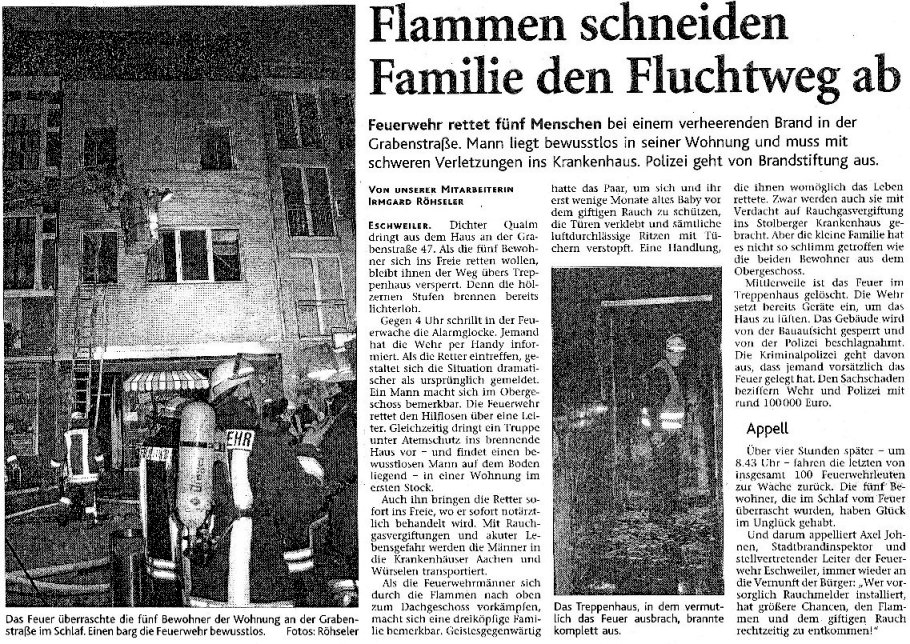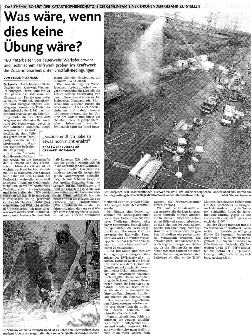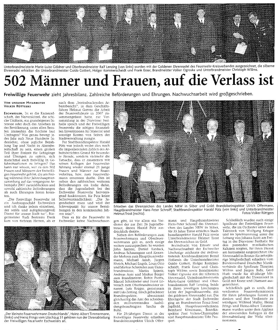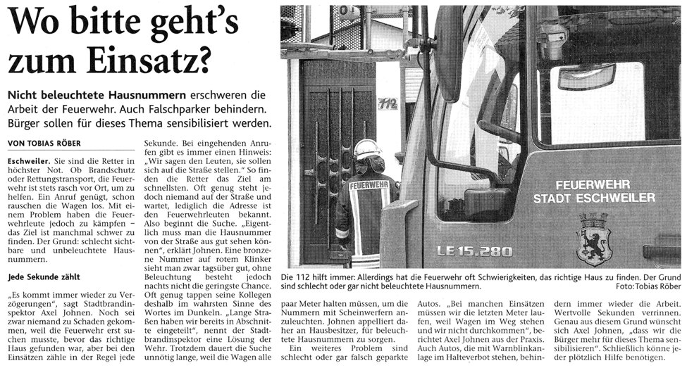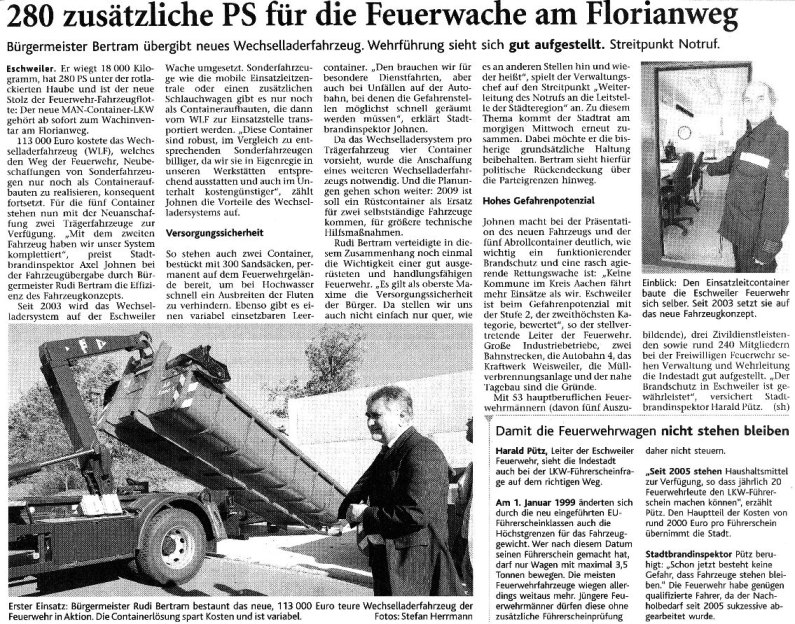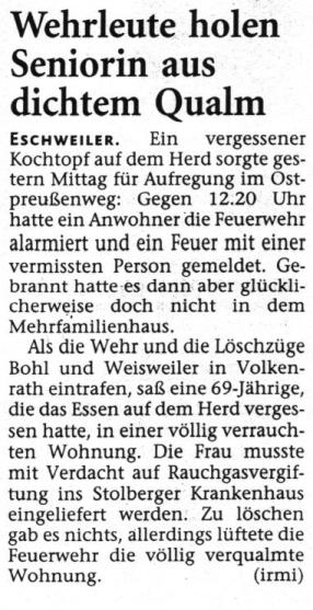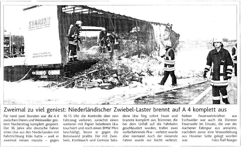 2008 03.11.2008 Feuerprobe nach einem Jahr harter Arbeit EN / EZ 28.10.2008 Mit Helm und Handschuhen durch die Hindernisse EN / EZ 27.10.2008 Was wäre, wenn dies keine Übung wäre? EN / EZ 27.10.2008 L240 bei Kinzweiler nach einem tödlichen Unfall... EN / EZ 23.10.2008 Wo bitte geht's zum Einsatz? EN / EZ 21.10.2008 280 zusätzliche PS für die Feuerwache... EN / EZ 30.09.2008 Brandmeister in spe schauen über den Tellerrand EN / EZ 29.09.2008 Liebes Tagebuch... EN / EZ 01.09.2008 Brandherd ist der Kleiderständer EN / EZ 29.07.2008 Wenn's blitzt, soll der Computer vom Netz EN / EZ 24.07.2008 Schrott in Flammen: 100 Feuerwehrleute... EN / EZ 24.07.2008 Feuerinferno in Bergrath - und dann geht's Schlag... EN / EZ 13.07.2008 Verwahrloste Pferde halb verhungert aufgefunden EN / EZ 26.06.2008 Verkehrschaos in der City nach Lkw-Unfall EN / EZ 19.05.2008 Tausende sehen Wehrleuten über die Schulter EN / EZ 16.05.2008 Liebes Tagebuch... EN / EZ 15.05.2008 Brand in der Grabenstraße: Polizei zieht auch... EN / EZ 14.05.2008 Flammen schneiden Famulie den Fluchtweg ab EN / EZ 20.04.2008 Polizei sucht Zeugen des Eschweiler Flugunfalles EN / EZ 20.04.2008 Bahnanlagen sind keine Spielplätze! EN / EZ 14.04.2008 Schwarzes Wochenende: zwei Tote und sechs... EN / EZ 13.04.2008 Flugzeug stürzt auf Feld bei Fronhoven EN / EZ 17.03.2008 502 Männer und Frauen, auf die Verlass ist EN / EZ 17.03.2008 Fast zwei Millionen Euro gehen 2007 in Rauch auf EN / EZ 14.03.2008 Zweimal zu viel geniest: Niederländischer... EN / EZ 10.03.2008 Der Frühling ist da, zumindest musikalisch EN / EZ 03.03.2008 Emma lässt Bäume kippen, Ziegel fallen EN / EZ 08.02.2008 33-Jähriger stirbt bei Unfall auf tükischem Glatteis EN / EZ 21.01.2008 Wehrleute holen Seniorin aus dichtem Qualm EN / EZ