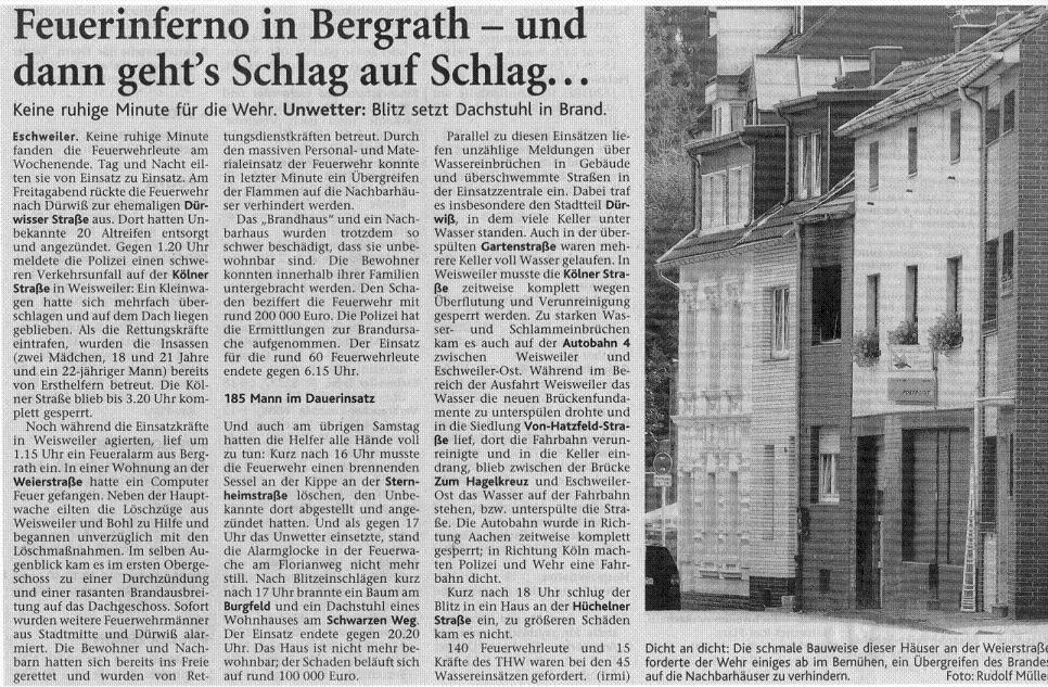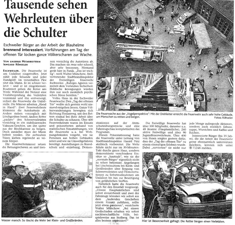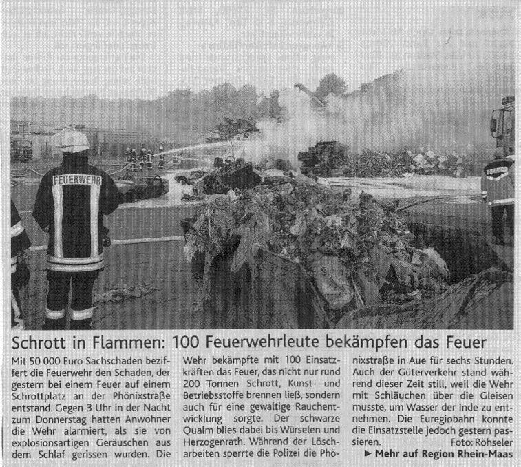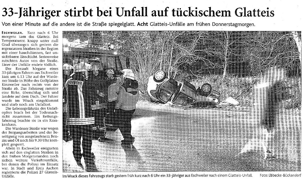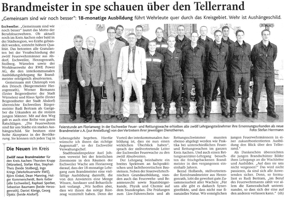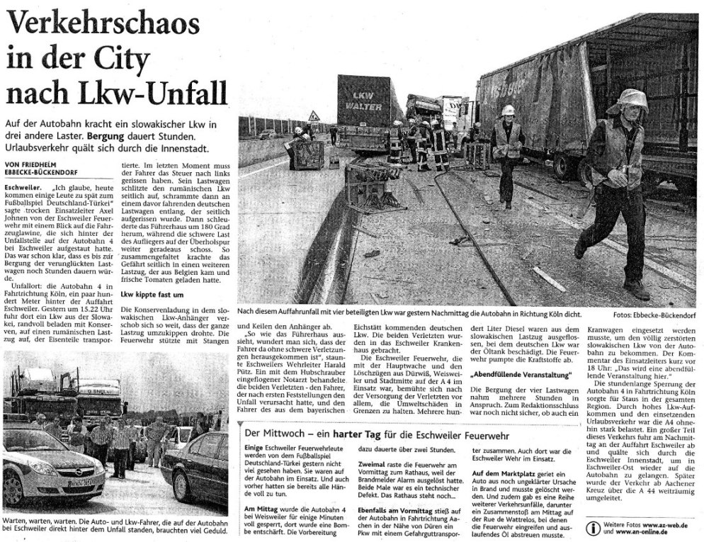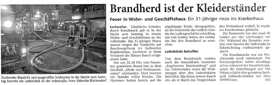 2008 03.11.2008 Feuerprobe nach einem Jahr harter Arbeit EN / EZ 28.10.2008 Mit Helm und Handschuhen durch die Hindernisse EN / EZ 27.10.2008 Was wäre, wenn dies keine Übung wäre? EN / EZ 27.10.2008 L240 bei Kinzweiler nach einem tödlichen Unfall... EN / EZ 23.10.2008 Wo bitte geht's zum Einsatz? EN / EZ 21.10.2008 280 zusätzliche PS für die Feuerwache... EN / EZ 30.09.2008 Brandmeister in spe schauen über den Tellerrand EN / EZ 29.09.2008 Liebes Tagebuch... EN / EZ 01.09.2008 Brandherd ist der Kleiderständer EN / EZ 29.07.2008 Wenn's blitzt, soll der Computer vom Netz EN / EZ 24.07.2008 Schrott in Flammen: 100 Feuerwehrleute... EN / EZ 24.07.2008 Feuerinferno in Bergrath - und dann geht's Schlag... EN / EZ 13.07.2008 Verwahrloste Pferde halb verhungert aufgefunden EN / EZ 26.06.2008 Verkehrschaos in der City nach Lkw-Unfall EN / EZ 19.05.2008 Tausende sehen Wehrleuten über die Schulter EN / EZ 16.05.2008 Liebes Tagebuch... EN / EZ 15.05.2008 Brand in der Grabenstraße: Polizei zieht auch... EN / EZ 14.05.2008 Flammen schneiden Famulie den Fluchtweg ab EN / EZ 20.04.2008 Polizei sucht Zeugen des Eschweiler Flugunfalles EN / EZ 20.04.2008 Bahnanlagen sind keine Spielplätze! EN / EZ 14.04.2008 Schwarzes Wochenende: zwei Tote und sechs... EN / EZ 13.04.2008 Flugzeug stürzt auf Feld bei Fronhoven EN / EZ 17.03.2008 502 Männer und Frauen, auf die Verlass ist EN / EZ 17.03.2008 Fast zwei Millionen Euro gehen 2007 in Rauch auf EN / EZ 14.03.2008 Zweimal zu viel geniest: Niederländischer... EN / EZ 10.03.2008 Der Frühling ist da, zumindest musikalisch EN / EZ 03.03.2008 Emma lässt Bäume kippen, Ziegel fallen EN / EZ 08.02.2008 33-Jähriger stirbt bei Unfall auf tükischem Glatteis EN / EZ 21.01.2008 Wehrleute holen Seniorin aus dichtem Qualm EN / EZ
