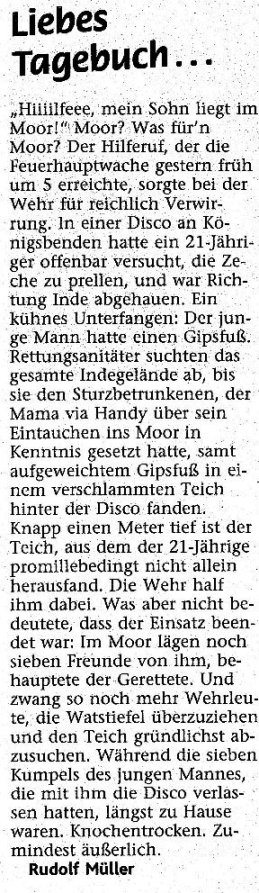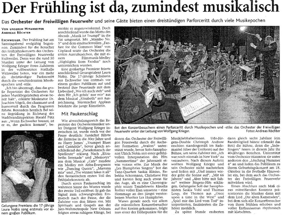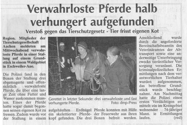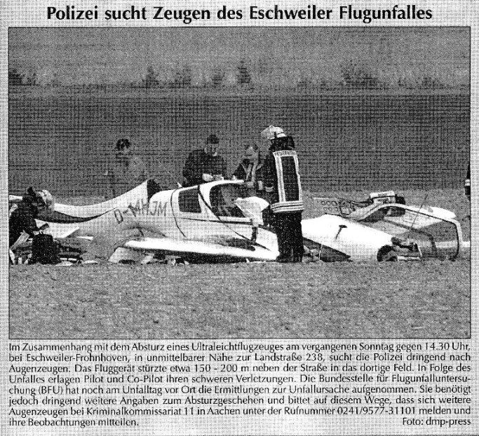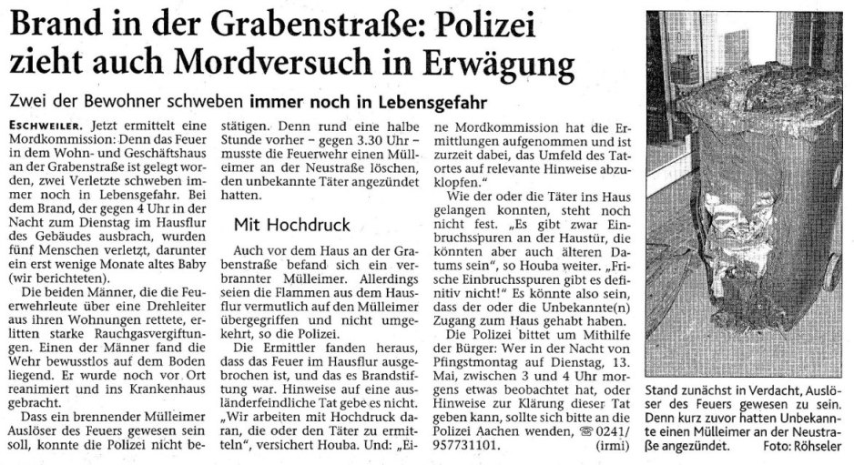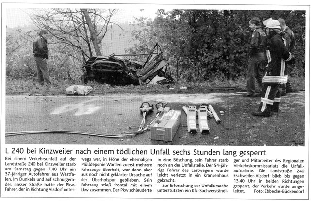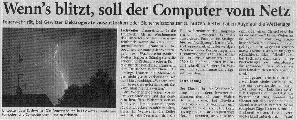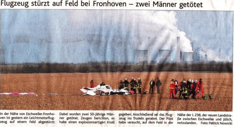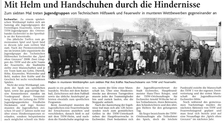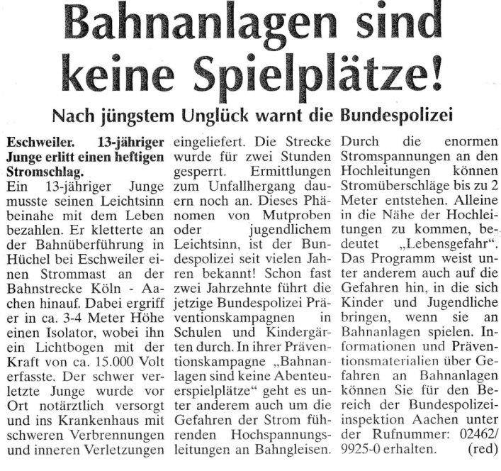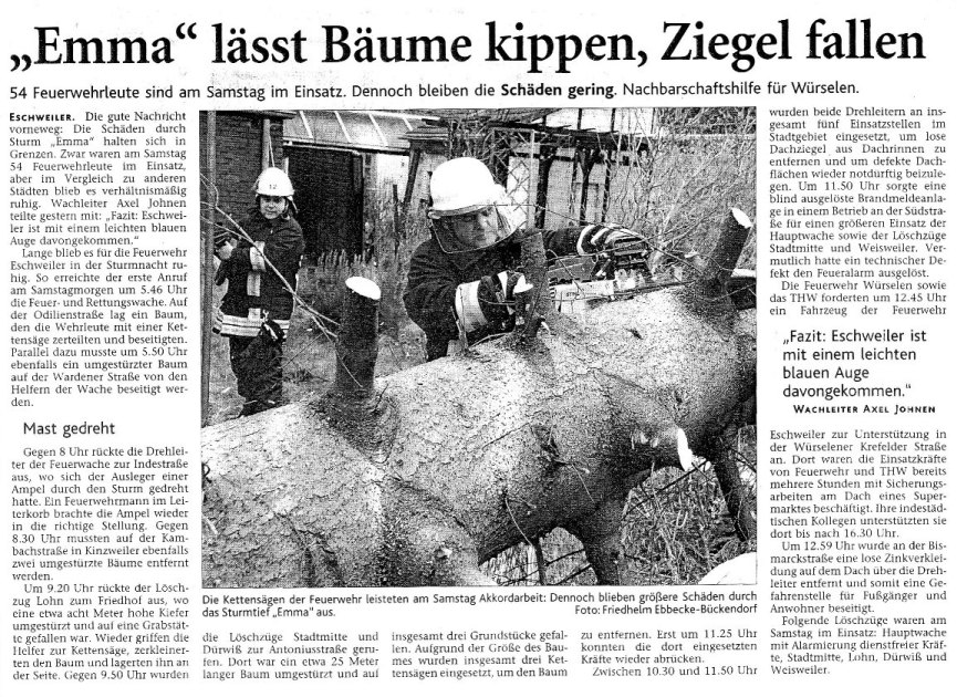 2008 03.11.2008 Feuerprobe nach einem Jahr harter Arbeit EN / EZ 28.10.2008 Mit Helm und Handschuhen durch die Hindernisse EN / EZ 27.10.2008 Was wäre, wenn dies keine Übung wäre? EN / EZ 27.10.2008 L240 bei Kinzweiler nach einem tödlichen Unfall... EN / EZ 23.10.2008 Wo bitte geht's zum Einsatz? EN / EZ 21.10.2008 280 zusätzliche PS für die Feuerwache... EN / EZ 30.09.2008 Brandmeister in spe schauen über den Tellerrand EN / EZ 29.09.2008 Liebes Tagebuch... EN / EZ 01.09.2008 Brandherd ist der Kleiderständer EN / EZ 29.07.2008 Wenn's blitzt, soll der Computer vom Netz EN / EZ 24.07.2008 Schrott in Flammen: 100 Feuerwehrleute... EN / EZ 24.07.2008 Feuerinferno in Bergrath - und dann geht's Schlag... EN / EZ 13.07.2008 Verwahrloste Pferde halb verhungert aufgefunden EN / EZ 26.06.2008 Verkehrschaos in der City nach Lkw-Unfall EN / EZ 19.05.2008 Tausende sehen Wehrleuten über die Schulter EN / EZ 16.05.2008 Liebes Tagebuch... EN / EZ 15.05.2008 Brand in der Grabenstraße: Polizei zieht auch... EN / EZ 14.05.2008 Flammen schneiden Famulie den Fluchtweg ab EN / EZ 20.04.2008 Polizei sucht Zeugen des Eschweiler Flugunfalles EN / EZ 20.04.2008 Bahnanlagen sind keine Spielplätze! EN / EZ 14.04.2008 Schwarzes Wochenende: zwei Tote und sechs... EN / EZ 13.04.2008 Flugzeug stürzt auf Feld bei Fronhoven EN / EZ 17.03.2008 502 Männer und Frauen, auf die Verlass ist EN / EZ 17.03.2008 Fast zwei Millionen Euro gehen 2007 in Rauch auf EN / EZ 14.03.2008 Zweimal zu viel geniest: Niederländischer... EN / EZ 10.03.2008 Der Frühling ist da, zumindest musikalisch EN / EZ 03.03.2008 Emma lässt Bäume kippen, Ziegel fallen EN / EZ 08.02.2008 33-Jähriger stirbt bei Unfall auf tükischem Glatteis EN / EZ 21.01.2008 Wehrleute holen Seniorin aus dichtem Qualm EN / EZ