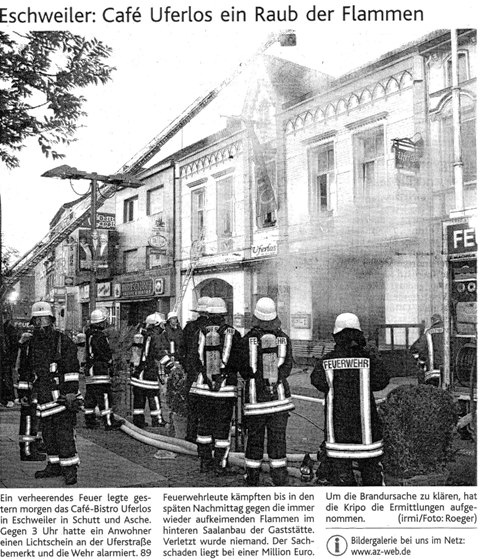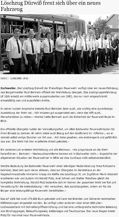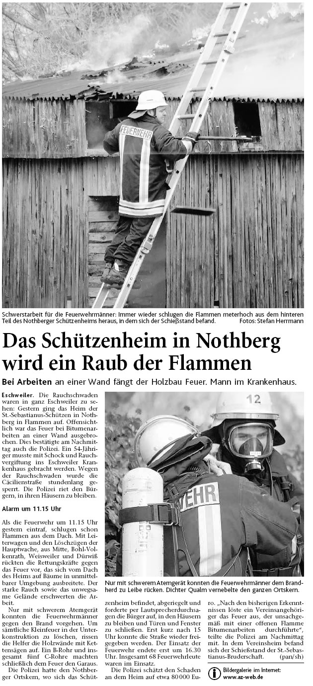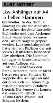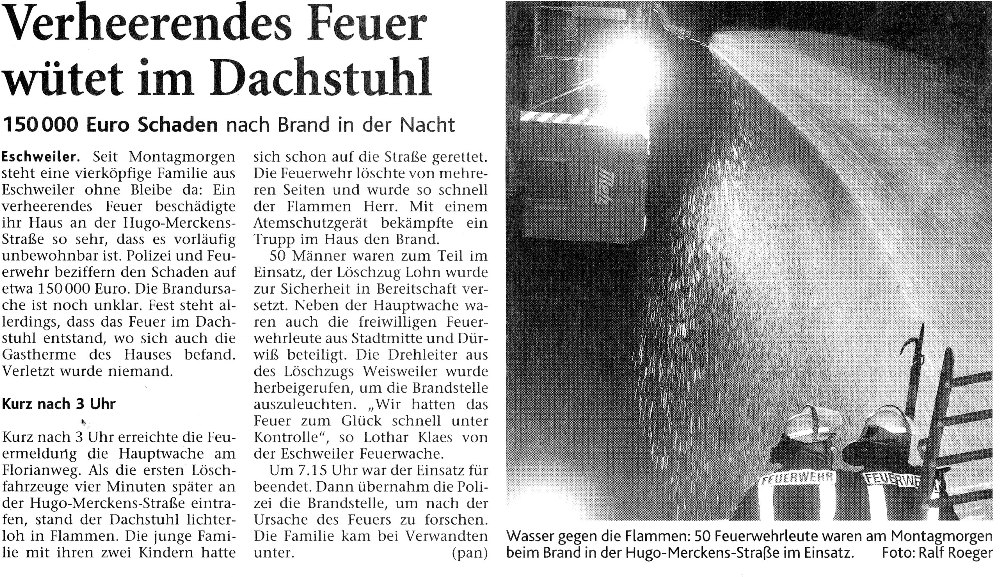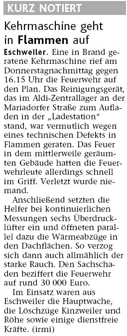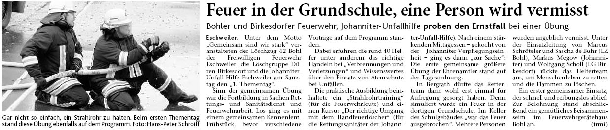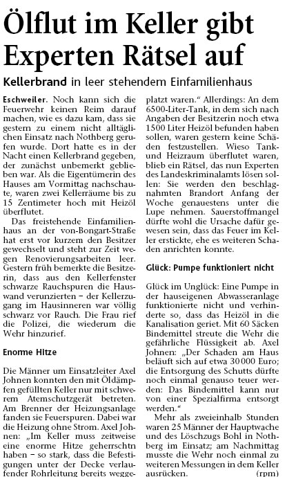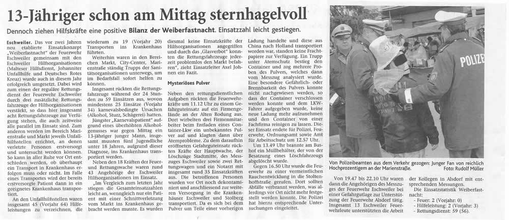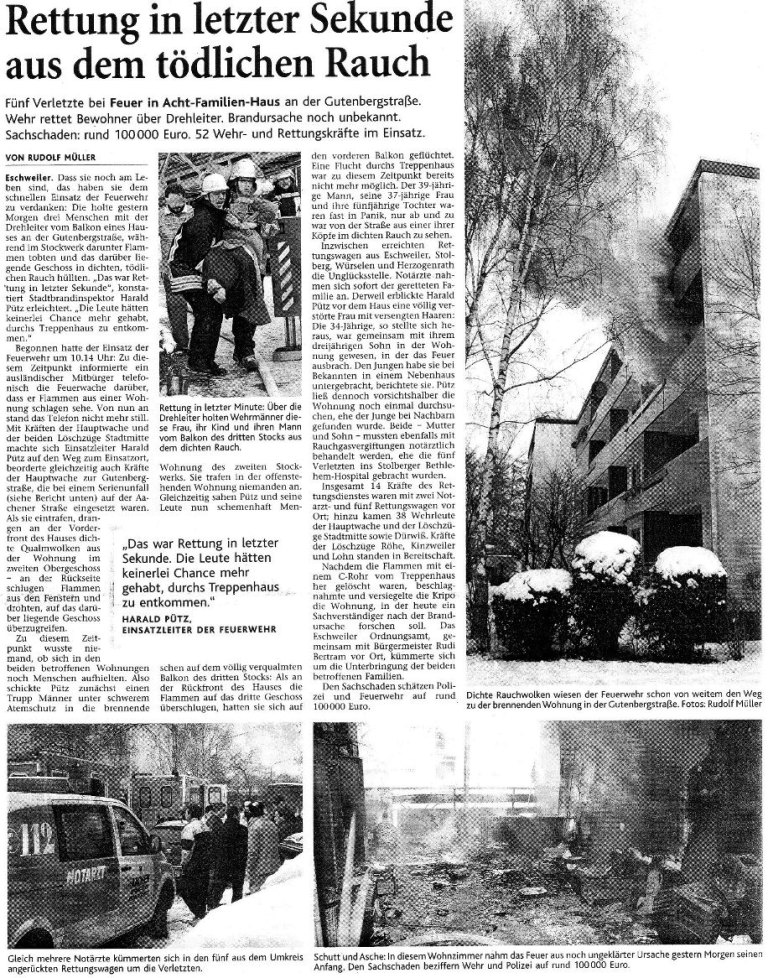2009 09.12.2009 Das Schützenheim in Nothberg wird ein Raub... EN / EZ 03.12.2009 Für ihre Ausbildung arbeiten die Städte Hand in Hand EN / EZ 23.11.2009 Vier Verletzte an der Auffahrt West EN / EZ 28.10.2009 Feuerwehr-Kran birgt Tresor und Geldautomat... EN / EZ 24.10.2009 Ölflut im Keller gibt Experten Rätsel auf EN / EZ 17.10.2009 Kurz notiert: Kehrmaschine geht in Flammen auf EN / EZ 16.10.2009 Kreisbrandmeister Scholl zeichnet beim Treffen... EN / EZ 13.10.2009 Kurz notiert: Ölspur zieht sich durch die halbe Stadt EN / EZ 12.10.2009 Feuer in der Grundschule, eine Person wird vermisst EN / EZ 05.10.2009 Kurz notiert: Lkw-Anhänger auf A4 in hellen Flammen EN / EZ 02.10.2009 Linienbus verliert Getriebeöl: Sperrung auf der... EN / EZ 14.09.2009 29 junge Männer drücken nun wieder die Schulbank EN / EZ 09.09.2009 Verheerendes Feuer wütet im Dachstuhl EN / EZ 31.08.2009 Im Garten wüten die Flammen EN / EZ 16.08.2009 Löschzug Dürwiß freut sich über ein neues Fahrzeug Super Sonntag 10.08.2009 Noch weiß keiner, wie hoch der Schaden ist EN / EZ 09.08.2009 Land unter in der Region: Feuerwehr im Dauerstress Super Sonntag 29.07.2009 Beherzte Zeugen helfen: Im Blausteinsee gerät... EN / EZ 28.07.2009 Funke löst Brand aus EN / EZ 21.07.2009 27-jähriger Taucher wird tot im See gefunden EN / EZ 20.07.2009 Suche nach Taucher wird heute fortgesetzt EN / EZ 20.07.2009 Kurz notiert: Piepender Rauchmelder verhindert... EN / EZ 09.07.2009 Stahlgerüst stürzt ein und begräbt zwei Männer... EN / EZ 29.06.2009 Kurz notiert: Uferlos: Brandursache weiter unklar EN / EZ 29.06.2009 Land unter in der ganzen Stadt EN / EZ 25.06.2009 Vom "Uferlos" bleibt nur ein Haufen Schutt EN / EZ 25.06.2009 Eschweiler: Café Uferlos ein Raub der Flammen EN / EZ 16.05.2009 Feuerwehrleute zeigen ihr Können EN / EZ 28.04.2009 Junge Wehrleute wehren sich gegen Müll EN / EZ 09.04.2009 Der Lehrgang wir für Sie kein Spaziergang EN / EZ 02.04.2009 Nach der Schule greifen sie zum Feuerwehrschlauch EN / EZ 01.04.2009 Silberne Ehrenzeichen des Landes verliehen EN / EZ 30.03.2009 Jeder Cent für die Feuerwehr ist gut investiertes Geld EN / EZ 16.03.2009 Landeanflug mussglückt: Flugzeug kracht neben... EN / EZ 07.03.2009 Heftiger Kaminbrand verqualmt das ganze... EN / EZ 05.03.2009 Tod am Steuer: Auto kracht in eine Hotelhalle EN / EZ 23.02.2009 So ein Hut, der steht ihm gut! EN / EZ 23.02.2009 13-Jähriger schon am Mittag sternhagelvoll EN / EZ 09.01.2009 Rettung in letzter Sekunde aus dem tödlichen Rauch EN / EZ 04.01.2009 Neuer Transporter für die Wehr Super Sonntag