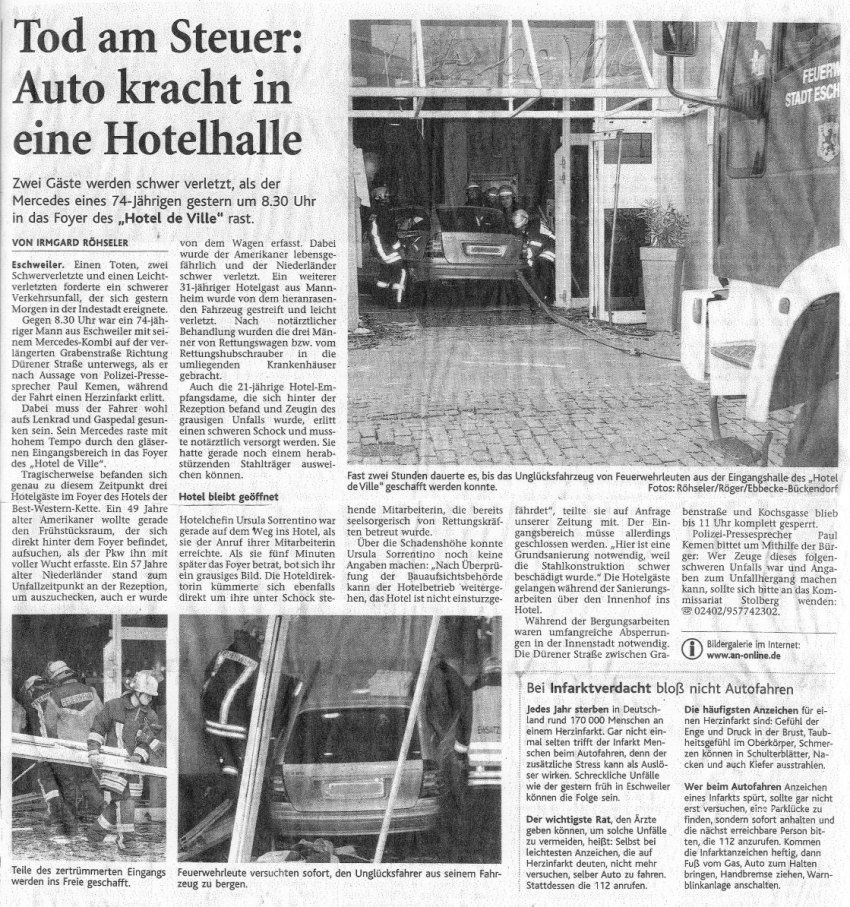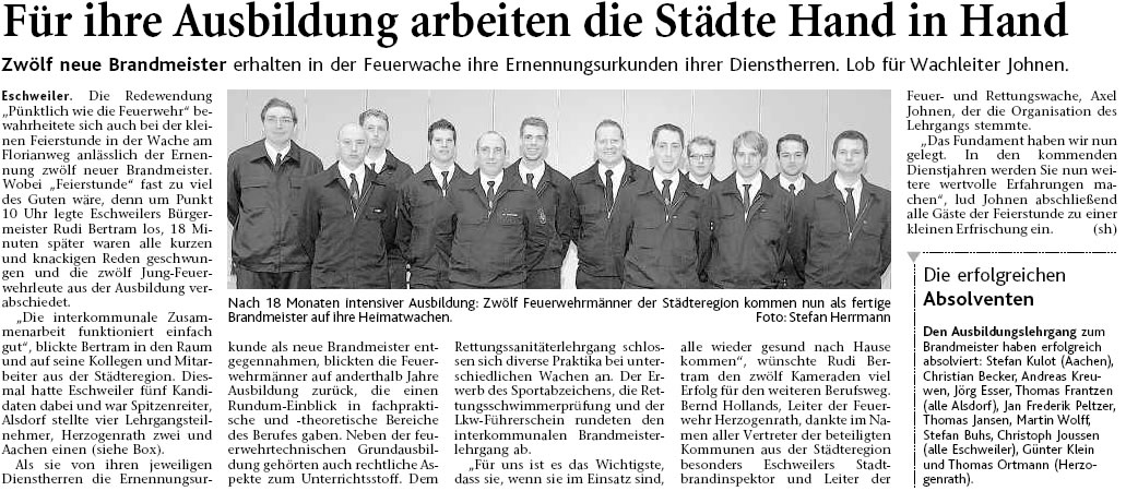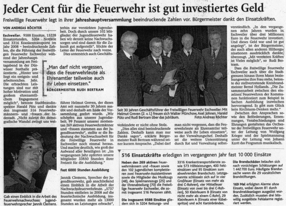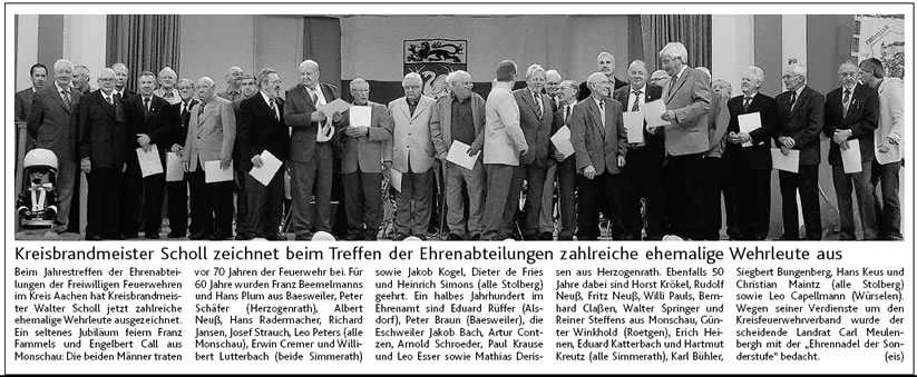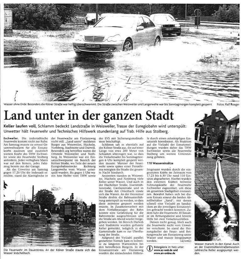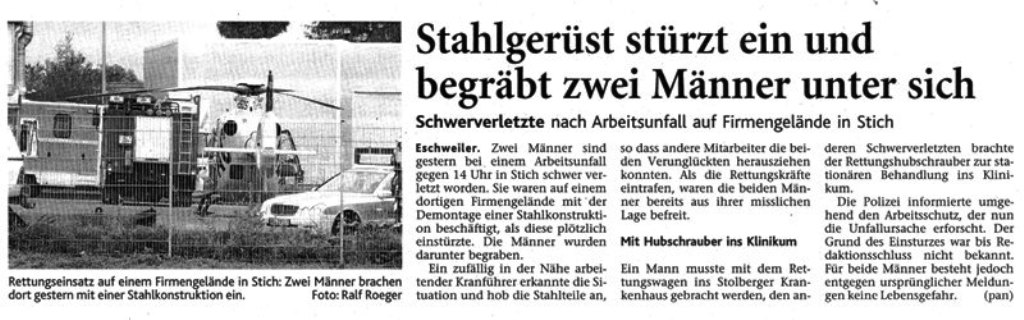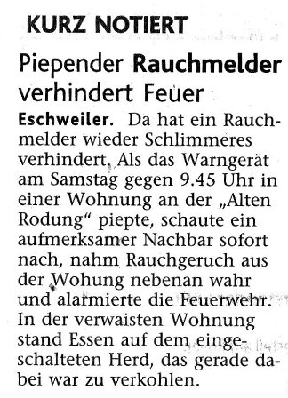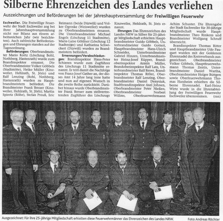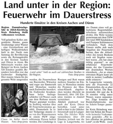 2009 09.12.2009 Das Schützenheim in Nothberg wird ein Raub... EN / EZ 03.12.2009 Für ihre Ausbildung arbeiten die Städte Hand in Hand EN / EZ 23.11.2009 Vier Verletzte an der Auffahrt West EN / EZ 28.10.2009 Feuerwehr-Kran birgt Tresor und Geldautomat... EN / EZ 24.10.2009 Ölflut im Keller gibt Experten Rätsel auf EN / EZ 17.10.2009 Kurz notiert: Kehrmaschine geht in Flammen auf EN / EZ 16.10.2009 Kreisbrandmeister Scholl zeichnet beim Treffen... EN / EZ 13.10.2009 Kurz notiert: Ölspur zieht sich durch die halbe Stadt EN / EZ 12.10.2009 Feuer in der Grundschule, eine Person wird vermisst EN / EZ 05.10.2009 Kurz notiert: Lkw-Anhänger auf A4 in hellen Flammen EN / EZ 02.10.2009 Linienbus verliert Getriebeöl: Sperrung auf der... EN / EZ 14.09.2009 29 junge Männer drücken nun wieder die Schulbank EN / EZ 09.09.2009 Verheerendes Feuer wütet im Dachstuhl EN / EZ 31.08.2009 Im Garten wüten die Flammen EN / EZ 16.08.2009 Löschzug Dürwiß freut sich über ein neues Fahrzeug Super Sonntag 10.08.2009 Noch weiß keiner, wie hoch der Schaden ist EN / EZ 09.08.2009 Land unter in der Region: Feuerwehr im Dauerstress Super Sonntag 29.07.2009 Beherzte Zeugen helfen: Im Blausteinsee gerät... EN / EZ 28.07.2009 Funke löst Brand aus EN / EZ 21.07.2009 27-jähriger Taucher wird tot im See gefunden EN / EZ 20.07.2009 Suche nach Taucher wird heute fortgesetzt EN / EZ 20.07.2009 Kurz notiert: Piepender Rauchmelder verhindert... EN / EZ 09.07.2009 Stahlgerüst stürzt ein und begräbt zwei Männer... EN / EZ 29.06.2009 Kurz notiert: Uferlos: Brandursache weiter unklar EN / EZ 29.06.2009 Land unter in der ganzen Stadt EN / EZ 25.06.2009 Vom "Uferlos" bleibt nur ein Haufen Schutt EN / EZ 25.06.2009 Eschweiler: Café Uferlos ein Raub der Flammen EN / EZ 16.05.2009 Feuerwehrleute zeigen ihr Können EN / EZ 28.04.2009 Junge Wehrleute wehren sich gegen Müll EN / EZ 09.04.2009 Der Lehrgang wir für Sie kein Spaziergang EN / EZ 02.04.2009 Nach der Schule greifen sie zum Feuerwehrschlauch EN / EZ 01.04.2009 Silberne Ehrenzeichen des Landes verliehen EN / EZ 30.03.2009 Jeder Cent für die Feuerwehr ist gut investiertes Geld EN / EZ 16.03.2009 Landeanflug mussglückt: Flugzeug kracht neben... EN / EZ 07.03.2009 Heftiger Kaminbrand verqualmt das ganze... EN / EZ 05.03.2009 Tod am Steuer: Auto kracht in eine Hotelhalle EN / EZ 23.02.2009 So ein Hut, der steht ihm gut! EN / EZ 23.02.2009 13-Jähriger schon am Mittag sternhagelvoll EN / EZ 09.01.2009 Rettung in letzter Sekunde aus dem tödlichen Rauch EN / EZ 04.01.2009 Neuer Transporter für die Wehr Super Sonntag