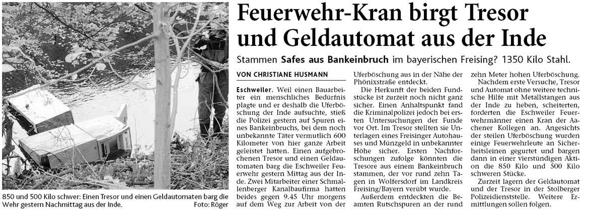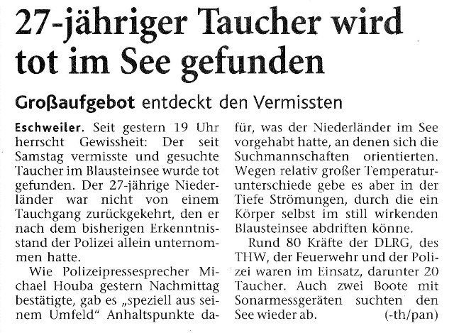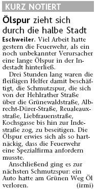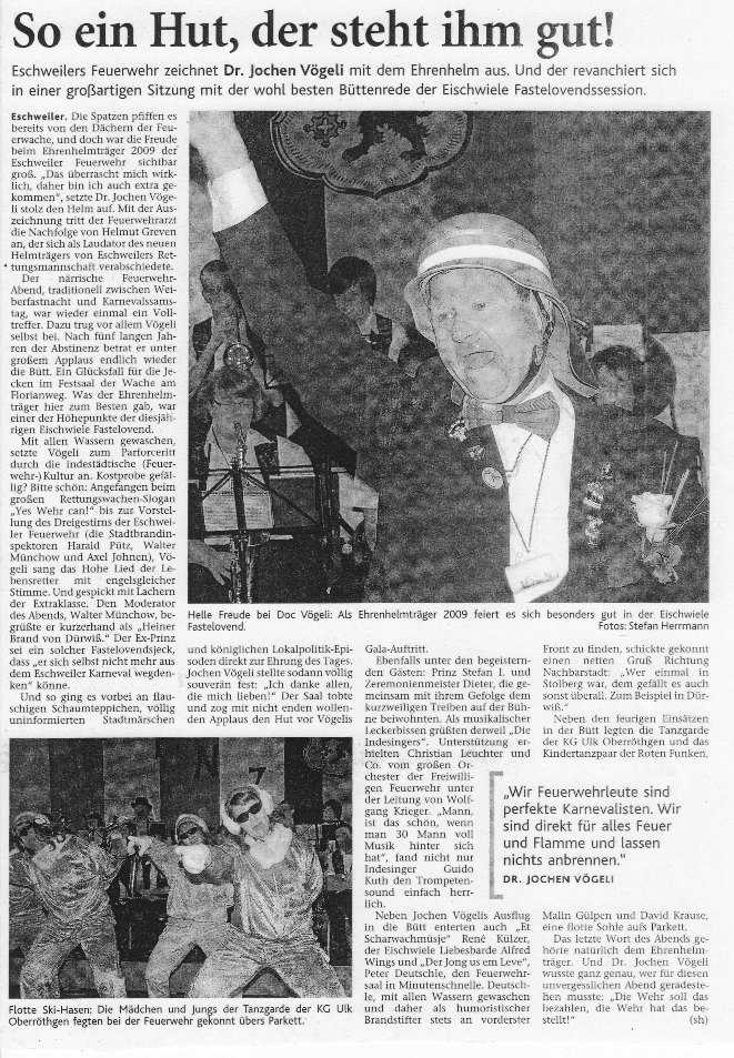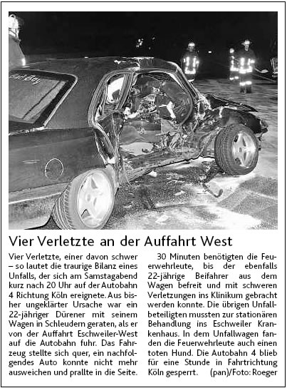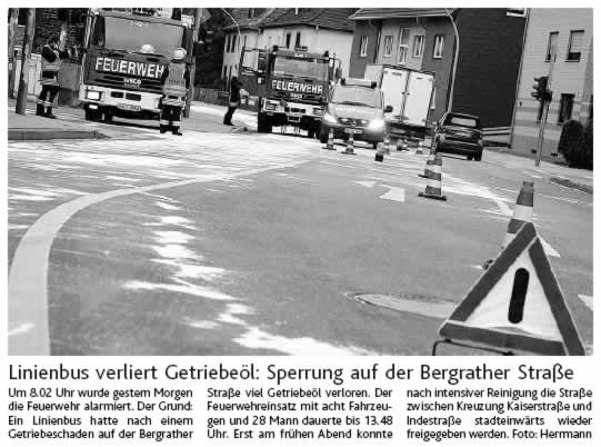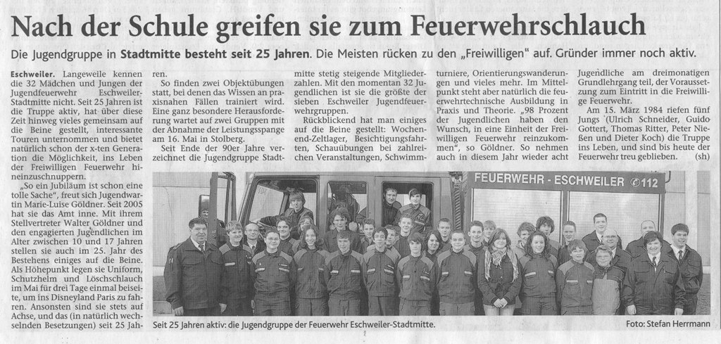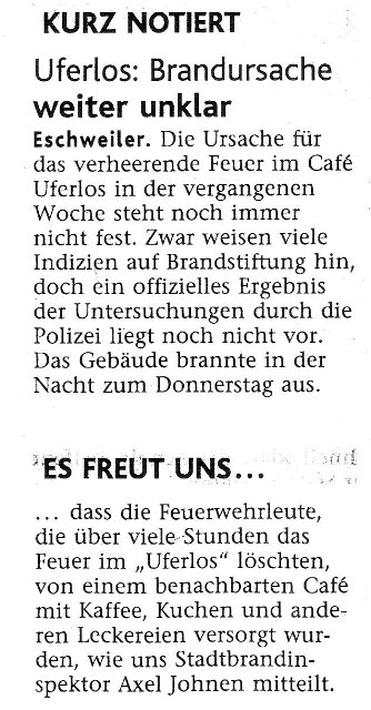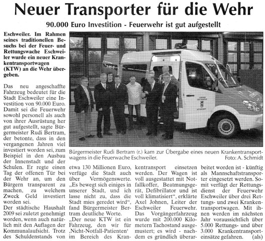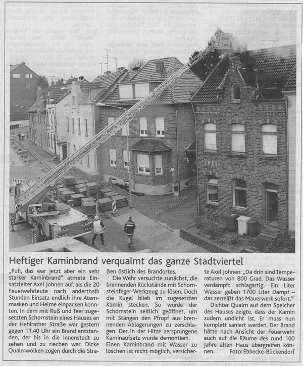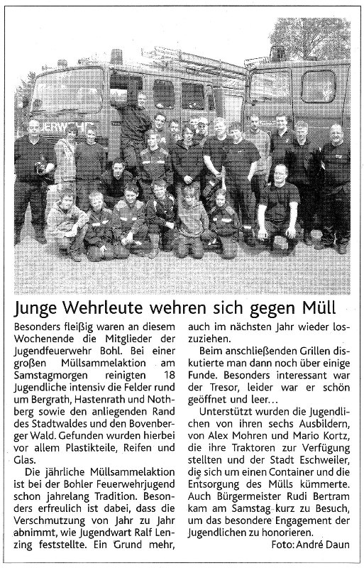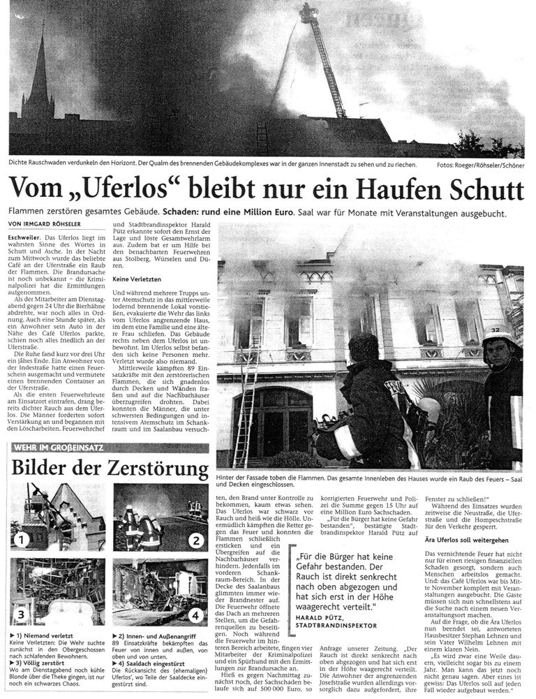 2009 09.12.2009 Das Schützenheim in Nothberg wird ein Raub... EN / EZ 03.12.2009 Für ihre Ausbildung arbeiten die Städte Hand in Hand EN / EZ 23.11.2009 Vier Verletzte an der Auffahrt West EN / EZ 28.10.2009 Feuerwehr-Kran birgt Tresor und Geldautomat... EN / EZ 24.10.2009 Ölflut im Keller gibt Experten Rätsel auf EN / EZ 17.10.2009 Kurz notiert: Kehrmaschine geht in Flammen auf EN / EZ 16.10.2009 Kreisbrandmeister Scholl zeichnet beim Treffen... EN / EZ 13.10.2009 Kurz notiert: Ölspur zieht sich durch die halbe Stadt EN / EZ 12.10.2009 Feuer in der Grundschule, eine Person wird vermisst EN / EZ 05.10.2009 Kurz notiert: Lkw-Anhänger auf A4 in hellen Flammen EN / EZ 02.10.2009 Linienbus verliert Getriebeöl: Sperrung auf der... EN / EZ 14.09.2009 29 junge Männer drücken nun wieder die Schulbank EN / EZ 09.09.2009 Verheerendes Feuer wütet im Dachstuhl EN / EZ 31.08.2009 Im Garten wüten die Flammen EN / EZ 16.08.2009 Löschzug Dürwiß freut sich über ein neues Fahrzeug Super Sonntag 10.08.2009 Noch weiß keiner, wie hoch der Schaden ist EN / EZ 09.08.2009 Land unter in der Region: Feuerwehr im Dauerstress Super Sonntag 29.07.2009 Beherzte Zeugen helfen: Im Blausteinsee gerät... EN / EZ 28.07.2009 Funke löst Brand aus EN / EZ 21.07.2009 27-jähriger Taucher wird tot im See gefunden EN / EZ 20.07.2009 Suche nach Taucher wird heute fortgesetzt EN / EZ 20.07.2009 Kurz notiert: Piepender Rauchmelder verhindert... EN / EZ 09.07.2009 Stahlgerüst stürzt ein und begräbt zwei Männer... EN / EZ 29.06.2009 Kurz notiert: Uferlos: Brandursache weiter unklar EN / EZ 29.06.2009 Land unter in der ganzen Stadt EN / EZ 25.06.2009 Vom "Uferlos" bleibt nur ein Haufen Schutt EN / EZ 25.06.2009 Eschweiler: Café Uferlos ein Raub der Flammen EN / EZ 16.05.2009 Feuerwehrleute zeigen ihr Können EN / EZ 28.04.2009 Junge Wehrleute wehren sich gegen Müll EN / EZ 09.04.2009 Der Lehrgang wir für Sie kein Spaziergang EN / EZ 02.04.2009 Nach der Schule greifen sie zum Feuerwehrschlauch EN / EZ 01.04.2009 Silberne Ehrenzeichen des Landes verliehen EN / EZ 30.03.2009 Jeder Cent für die Feuerwehr ist gut investiertes Geld EN / EZ 16.03.2009 Landeanflug mussglückt: Flugzeug kracht neben... EN / EZ 07.03.2009 Heftiger Kaminbrand verqualmt das ganze... EN / EZ 05.03.2009 Tod am Steuer: Auto kracht in eine Hotelhalle EN / EZ 23.02.2009 So ein Hut, der steht ihm gut! EN / EZ 23.02.2009 13-Jähriger schon am Mittag sternhagelvoll EN / EZ 09.01.2009 Rettung in letzter Sekunde aus dem tödlichen Rauch EN / EZ 04.01.2009 Neuer Transporter für die Wehr Super Sonntag