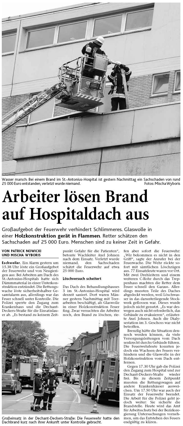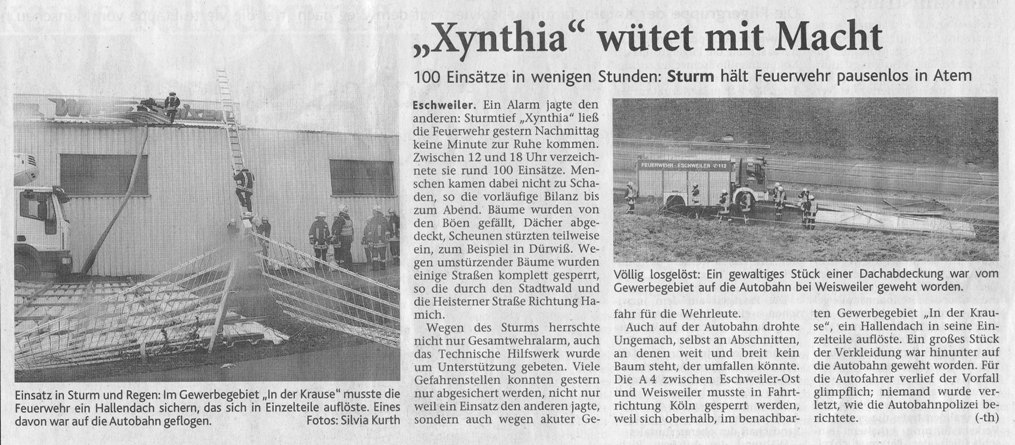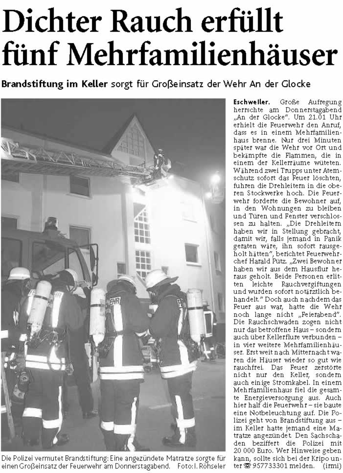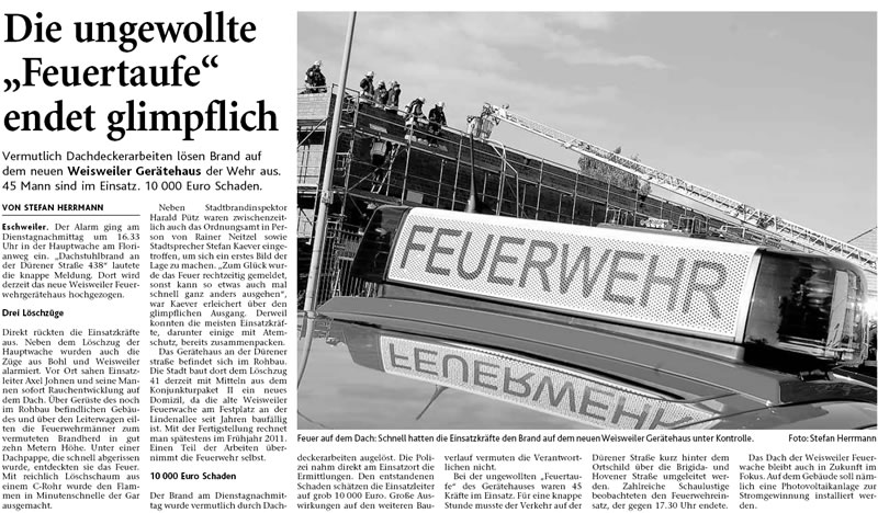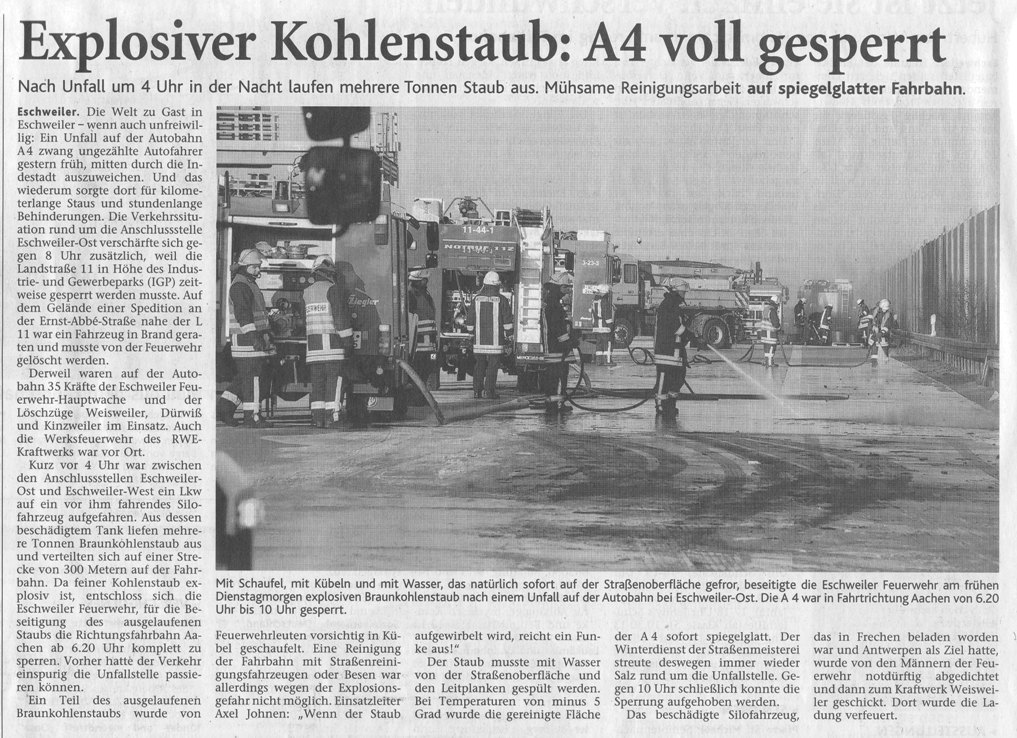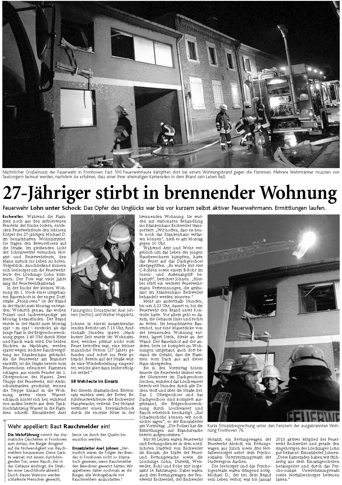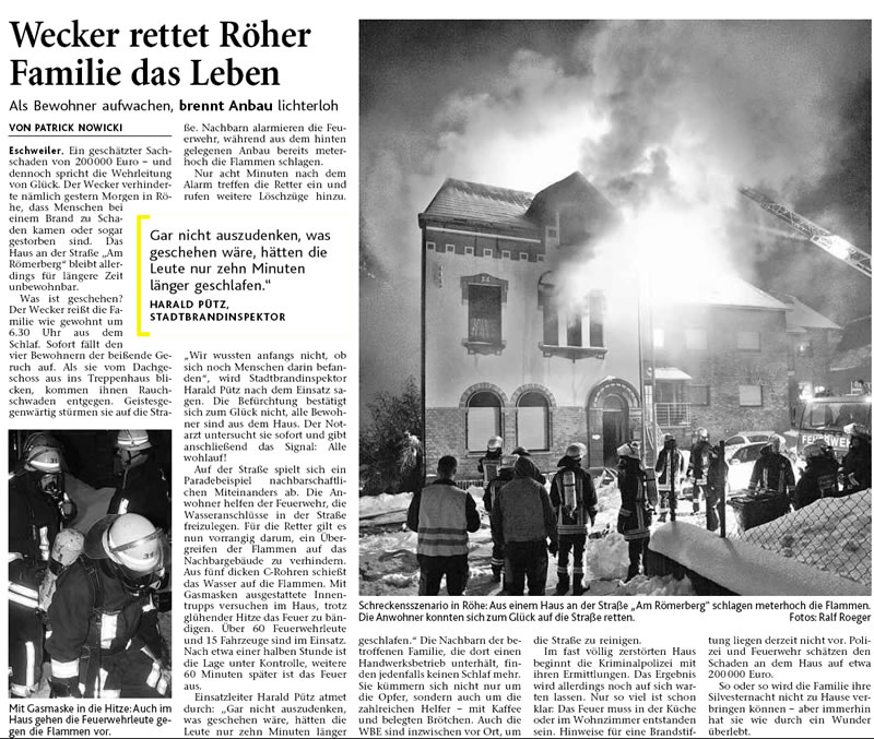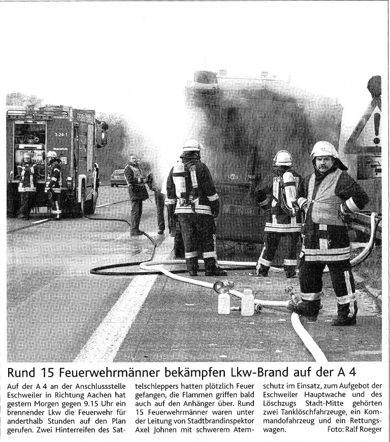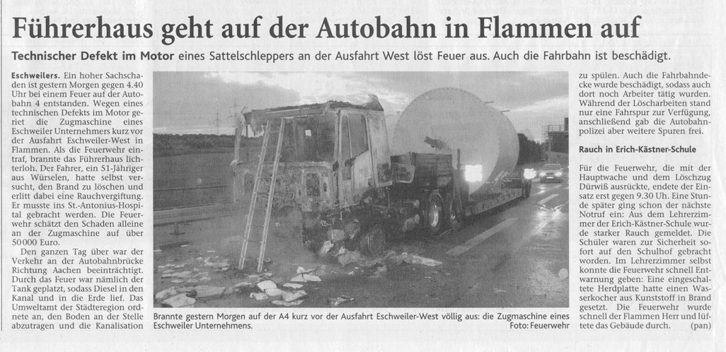 2010 31.12.2010 Es freut uns... EN / EZ 31.12.2010 Wecker rettet Röher Familie das Leben EN / EZ 27.12.2010 Auch in Weisweiler bricht Reithalle unter... EN / EZ 16.12.2010 Keine Hektik bei der Wehr, wenn Solardach brennt EN / EZ 14.12.2010 Rund 15 Feuerwehrmänner bekämpfen Lkw-Brand... EN / EZ 15.11.2010 Carmen hält die Teams der Wehr ganz schön auf... EN / EZ 08.11.2010 26-Jähriger stirbt bei Horror-Unfall in Weisweiler EN / EZ 29.10.2010 Plötzlich läuft unbekannte Chemikalie aus EN / EZ 13.10.2010 180 Stunde Vorbereitung auf gefährliche Einsätze EN / EZ 09.10.2010 Norden der Stadt ist jetzt sicherer EN / EZ 04.10.2010 24-Jähriger stirbt am Morgen auf der Autobahn EN / EZ 01.10.2010 Geballte Kompetenz von Morgen EN / EZ 23.09.2010 Die ungewollte "Feuertaufe" endet glimpflich EN / EZ 19.09.2010 Putzmunter die 100 genommen (farbe) Super Sonntag 19.09.2010 Putzmunter die 100 genommen Super Sonntag 15.09.2010 Arbeiter lösen Brand auf Hospitaldach aus EN / EZ 13.09.2010 Fulminanter Festzug zum 100. Geburtstag EN / EZ 13.09.2010 Rauschende Party zum Jubiläum im Festzelt EN / EZ 10.09.2010 Feuerwehr lädt ein zum dreitägigen Feier-Marathon... EN / EZ 06.09.2010 Leute strömen zum Fest im Sonnenschein EN / EZ 30.08.2010 100 Jahre Spielmannszug EN / EZ 04.08.2010 Wechselladermaschinistenlehrgang EN / EZ 30.07.2010 Mit Blaulicht und Martinshorn rund um die Wache EN / EZ 13.07.2010 Essen auf Herd vergessen - Küche ruiniert EN / EZ 12.07.2010 Flammen schlagen aus Turm des Zanderhofs EN / EZ 29.06.2010 Im Einsatz zählt plötzlich jede Sekunde EN / EZ 09.06.2010 Führerhaus geht auf der Autobahn in Flammen auf EN / EZ 25.05.2010 Kurz notiert: Feuerwhr beweist großes Herz für Tiere EN / EZ 08.05.2010 Ehe der Wehr das Dach auf den Kopf fällt... EN / EZ 04.05.2010 Liebes Tagebuch... EN / EZ 01.05.2010 Neues Gesicht im Leitungsteam der Freiwilligen... EN / EZ 01.05.2010 Dichter Rauch erfüllt fünf Mehrfamilienhäuser EN / EZ 01.05.2010 Auf diese fixe Truppe können Bürger bauen EN / EZ 20.04.2010 27-Jähriger stirbt in brennender Wohnung EN / EZ 03.04.2010 Wehr fährt im Oldtimer vor EN / EZ 10.03.2010 Explosiver Kohlenstaub: A4 voll gesperrt EN / EZ 02.03.2010 Xynthia wütet wie die Axt im Walde EN / EZ 01.03.2010 Xynthia wütet mit Macht EN / EZ 22.02.2010 Auch Zocken am PC kann zur Sucht werden EN / EZ 17.02.2010 Das Winterwetter beschert weniger Rettungseinsätze EN / EZ