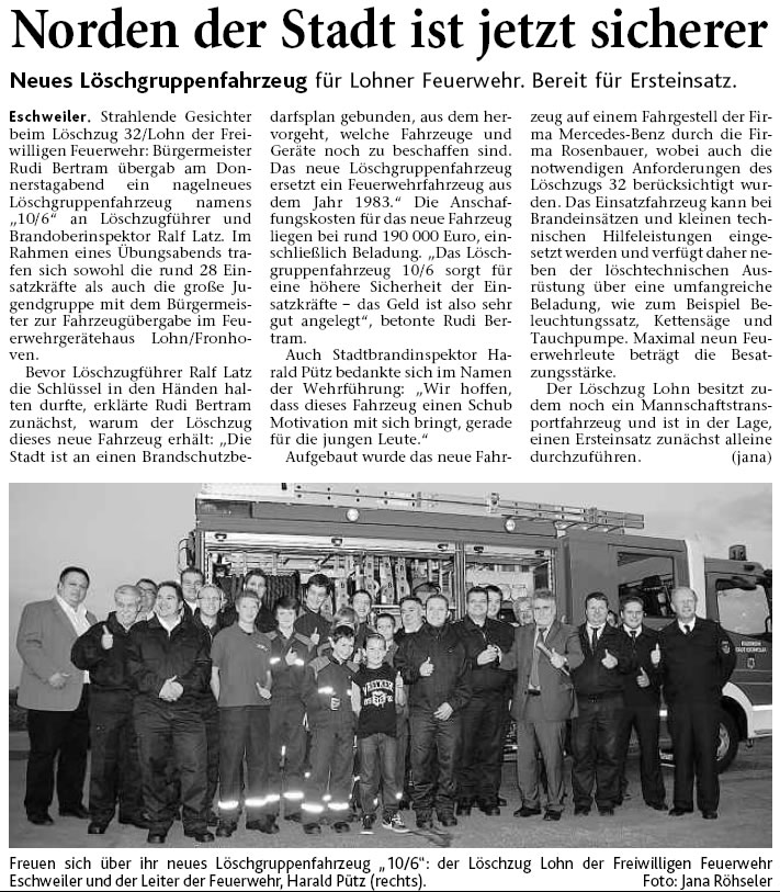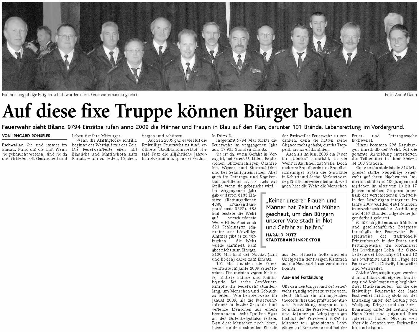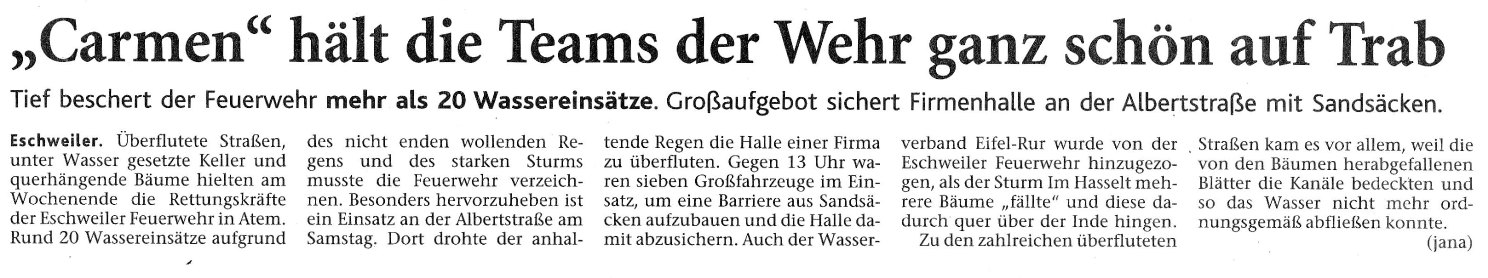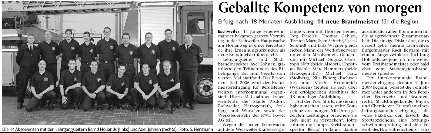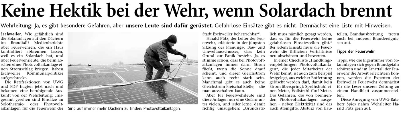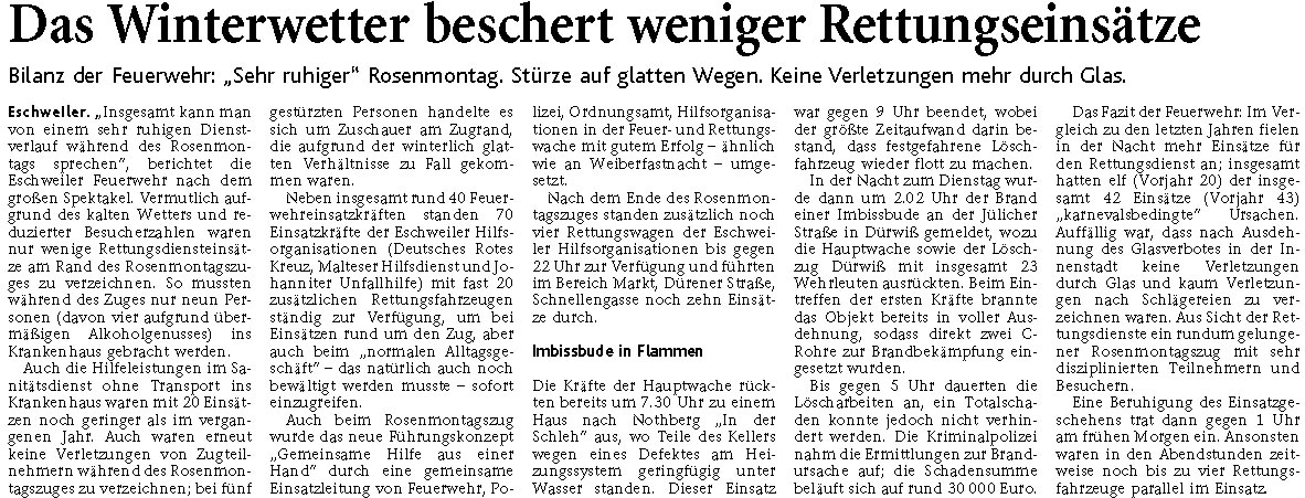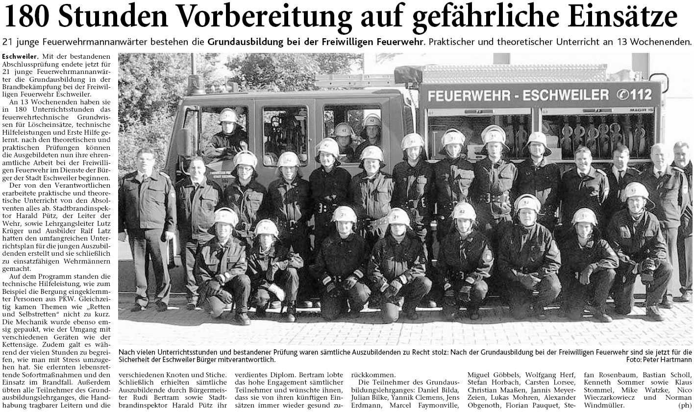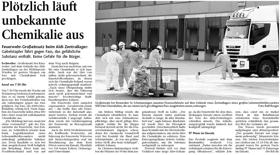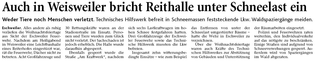 2010 31.12.2010 Es freut uns... EN / EZ 31.12.2010 Wecker rettet Röher Familie das Leben EN / EZ 27.12.2010 Auch in Weisweiler bricht Reithalle unter... EN / EZ 16.12.2010 Keine Hektik bei der Wehr, wenn Solardach brennt EN / EZ 14.12.2010 Rund 15 Feuerwehrmänner bekämpfen Lkw-Brand... EN / EZ 15.11.2010 Carmen hält die Teams der Wehr ganz schön auf... EN / EZ 08.11.2010 26-Jähriger stirbt bei Horror-Unfall in Weisweiler EN / EZ 29.10.2010 Plötzlich läuft unbekannte Chemikalie aus EN / EZ 13.10.2010 180 Stunde Vorbereitung auf gefährliche Einsätze EN / EZ 09.10.2010 Norden der Stadt ist jetzt sicherer EN / EZ 04.10.2010 24-Jähriger stirbt am Morgen auf der Autobahn EN / EZ 01.10.2010 Geballte Kompetenz von Morgen EN / EZ 23.09.2010 Die ungewollte "Feuertaufe" endet glimpflich EN / EZ 19.09.2010 Putzmunter die 100 genommen (farbe) Super Sonntag 19.09.2010 Putzmunter die 100 genommen Super Sonntag 15.09.2010 Arbeiter lösen Brand auf Hospitaldach aus EN / EZ 13.09.2010 Fulminanter Festzug zum 100. Geburtstag EN / EZ 13.09.2010 Rauschende Party zum Jubiläum im Festzelt EN / EZ 10.09.2010 Feuerwehr lädt ein zum dreitägigen Feier-Marathon... EN / EZ 06.09.2010 Leute strömen zum Fest im Sonnenschein EN / EZ 30.08.2010 100 Jahre Spielmannszug EN / EZ 04.08.2010 Wechselladermaschinistenlehrgang EN / EZ 30.07.2010 Mit Blaulicht und Martinshorn rund um die Wache EN / EZ 13.07.2010 Essen auf Herd vergessen - Küche ruiniert EN / EZ 12.07.2010 Flammen schlagen aus Turm des Zanderhofs EN / EZ 29.06.2010 Im Einsatz zählt plötzlich jede Sekunde EN / EZ 09.06.2010 Führerhaus geht auf der Autobahn in Flammen auf EN / EZ 25.05.2010 Kurz notiert: Feuerwhr beweist großes Herz für Tiere EN / EZ 08.05.2010 Ehe der Wehr das Dach auf den Kopf fällt... EN / EZ 04.05.2010 Liebes Tagebuch... EN / EZ 01.05.2010 Neues Gesicht im Leitungsteam der Freiwilligen... EN / EZ 01.05.2010 Dichter Rauch erfüllt fünf Mehrfamilienhäuser EN / EZ 01.05.2010 Auf diese fixe Truppe können Bürger bauen EN / EZ 20.04.2010 27-Jähriger stirbt in brennender Wohnung EN / EZ 03.04.2010 Wehr fährt im Oldtimer vor EN / EZ 10.03.2010 Explosiver Kohlenstaub: A4 voll gesperrt EN / EZ 02.03.2010 Xynthia wütet wie die Axt im Walde EN / EZ 01.03.2010 Xynthia wütet mit Macht EN / EZ 22.02.2010 Auch Zocken am PC kann zur Sucht werden EN / EZ 17.02.2010 Das Winterwetter beschert weniger Rettungseinsätze EN / EZ