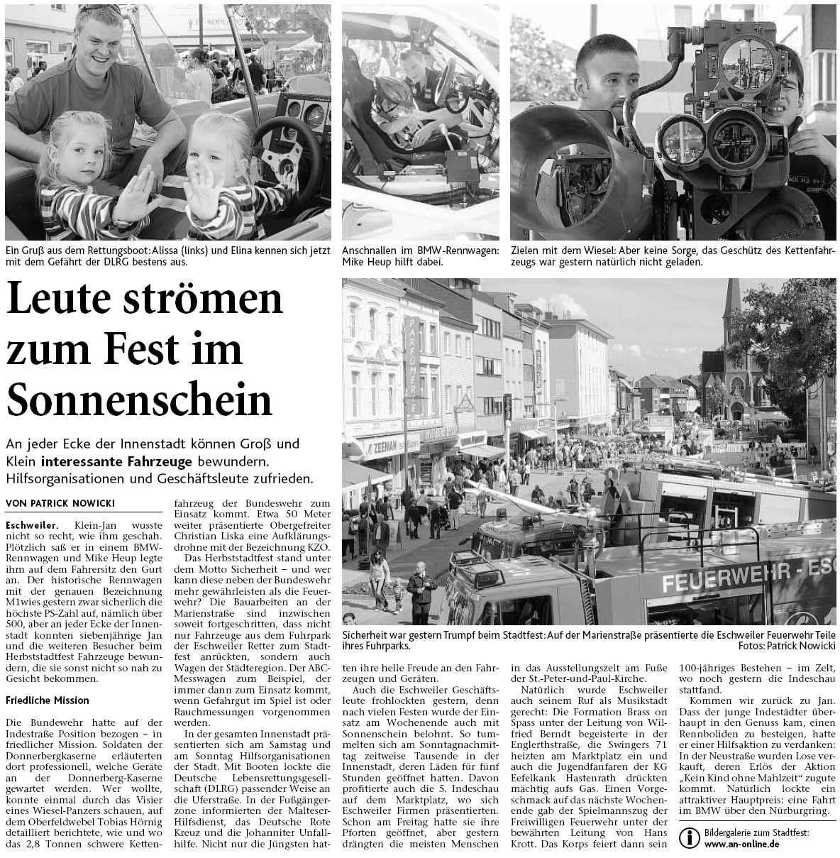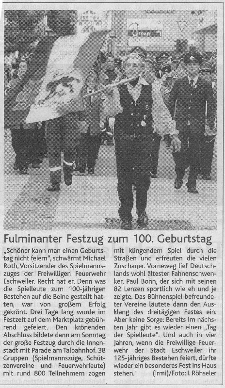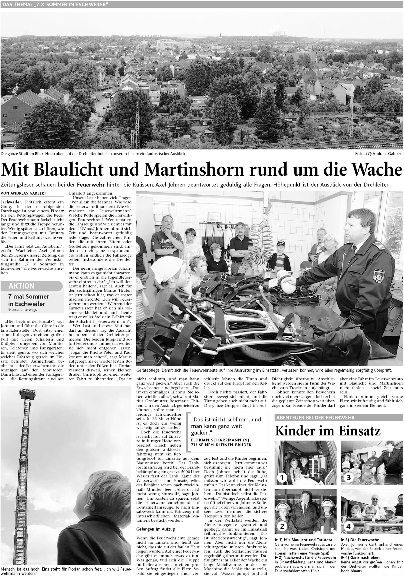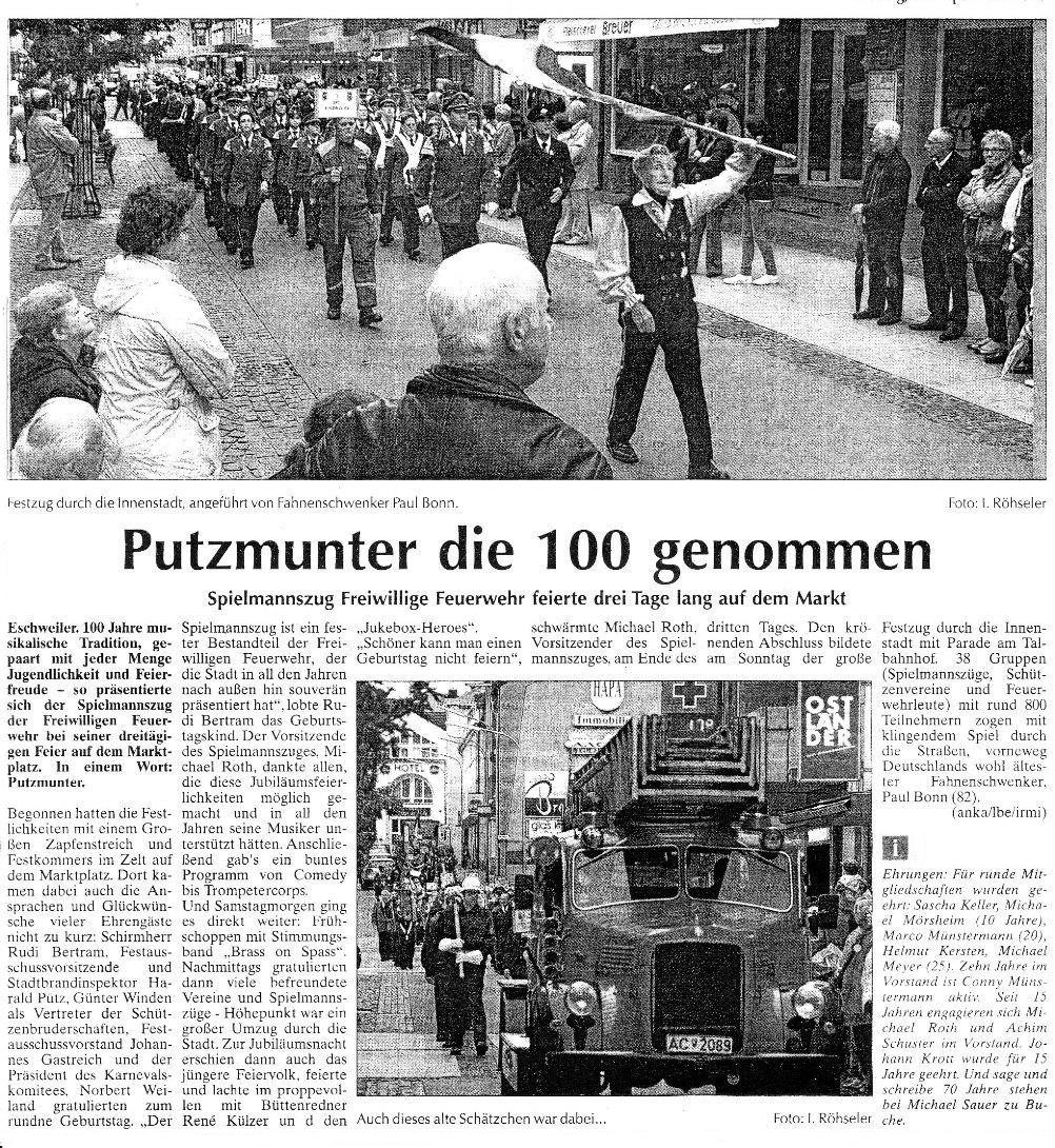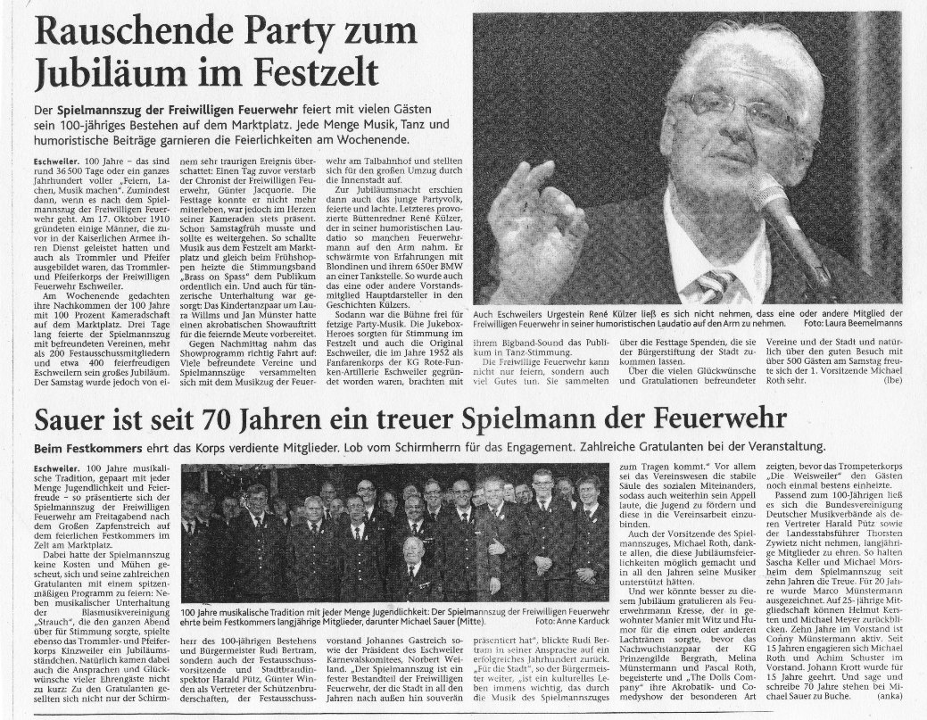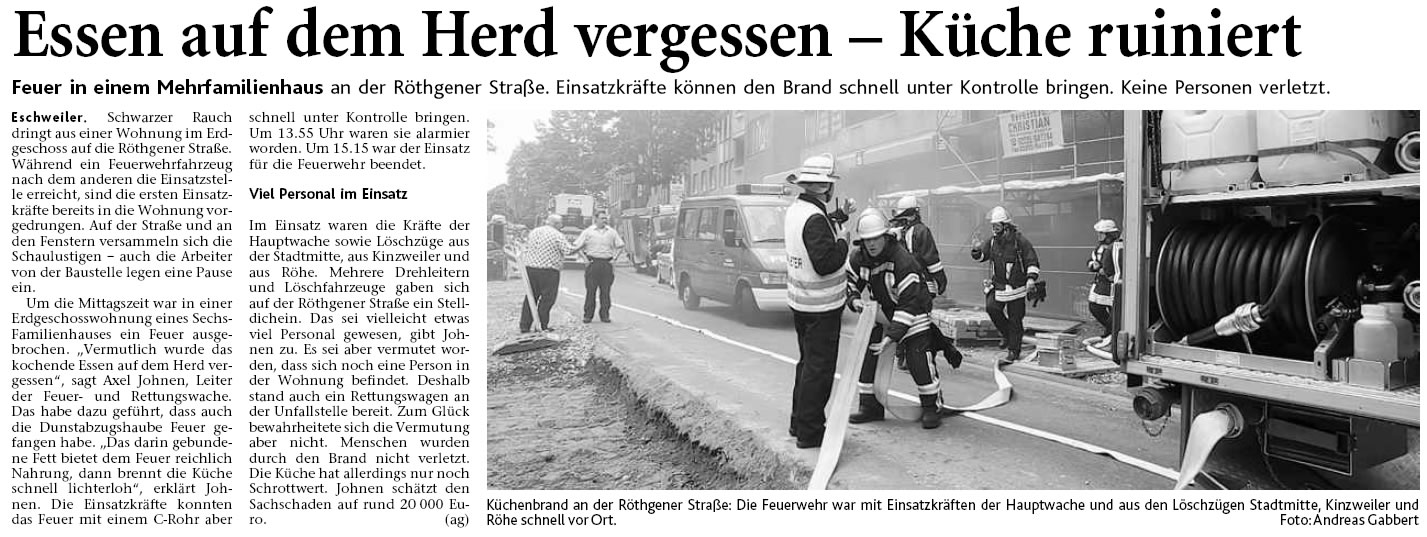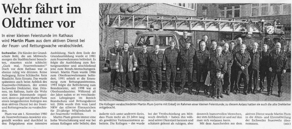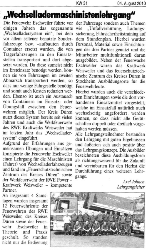 2010 31.12.2010 Es freut uns... EN / EZ 31.12.2010 Wecker rettet Röher Familie das Leben EN / EZ 27.12.2010 Auch in Weisweiler bricht Reithalle unter... EN / EZ 16.12.2010 Keine Hektik bei der Wehr, wenn Solardach brennt EN / EZ 14.12.2010 Rund 15 Feuerwehrmänner bekämpfen Lkw-Brand... EN / EZ 15.11.2010 Carmen hält die Teams der Wehr ganz schön auf... EN / EZ 08.11.2010 26-Jähriger stirbt bei Horror-Unfall in Weisweiler EN / EZ 29.10.2010 Plötzlich läuft unbekannte Chemikalie aus EN / EZ 13.10.2010 180 Stunde Vorbereitung auf gefährliche Einsätze EN / EZ 09.10.2010 Norden der Stadt ist jetzt sicherer EN / EZ 04.10.2010 24-Jähriger stirbt am Morgen auf der Autobahn EN / EZ 01.10.2010 Geballte Kompetenz von Morgen EN / EZ 23.09.2010 Die ungewollte "Feuertaufe" endet glimpflich EN / EZ 19.09.2010 Putzmunter die 100 genommen (farbe) Super Sonntag 19.09.2010 Putzmunter die 100 genommen Super Sonntag 15.09.2010 Arbeiter lösen Brand auf Hospitaldach aus EN / EZ 13.09.2010 Fulminanter Festzug zum 100. Geburtstag EN / EZ 13.09.2010 Rauschende Party zum Jubiläum im Festzelt EN / EZ 10.09.2010 Feuerwehr lädt ein zum dreitägigen Feier-Marathon... EN / EZ 06.09.2010 Leute strömen zum Fest im Sonnenschein EN / EZ 30.08.2010 100 Jahre Spielmannszug EN / EZ 04.08.2010 Wechselladermaschinistenlehrgang EN / EZ 30.07.2010 Mit Blaulicht und Martinshorn rund um die Wache EN / EZ 13.07.2010 Essen auf Herd vergessen - Küche ruiniert EN / EZ 12.07.2010 Flammen schlagen aus Turm des Zanderhofs EN / EZ 29.06.2010 Im Einsatz zählt plötzlich jede Sekunde EN / EZ 09.06.2010 Führerhaus geht auf der Autobahn in Flammen auf EN / EZ 25.05.2010 Kurz notiert: Feuerwhr beweist großes Herz für Tiere EN / EZ 08.05.2010 Ehe der Wehr das Dach auf den Kopf fällt... EN / EZ 04.05.2010 Liebes Tagebuch... EN / EZ 01.05.2010 Neues Gesicht im Leitungsteam der Freiwilligen... EN / EZ 01.05.2010 Dichter Rauch erfüllt fünf Mehrfamilienhäuser EN / EZ 01.05.2010 Auf diese fixe Truppe können Bürger bauen EN / EZ 20.04.2010 27-Jähriger stirbt in brennender Wohnung EN / EZ 03.04.2010 Wehr fährt im Oldtimer vor EN / EZ 10.03.2010 Explosiver Kohlenstaub: A4 voll gesperrt EN / EZ 02.03.2010 Xynthia wütet wie die Axt im Walde EN / EZ 01.03.2010 Xynthia wütet mit Macht EN / EZ 22.02.2010 Auch Zocken am PC kann zur Sucht werden EN / EZ 17.02.2010 Das Winterwetter beschert weniger Rettungseinsätze EN / EZ