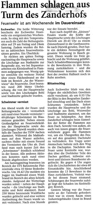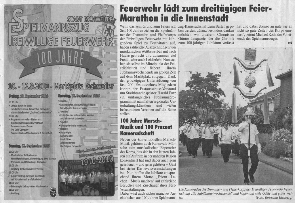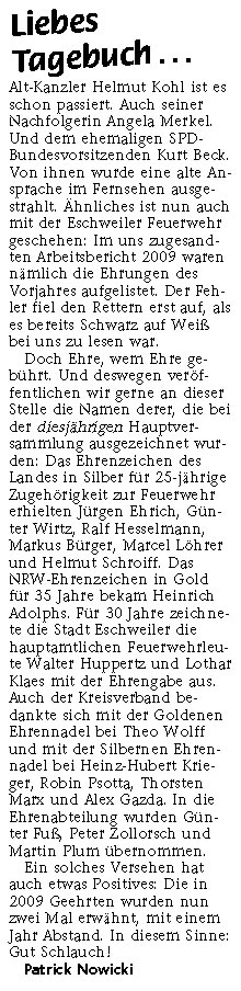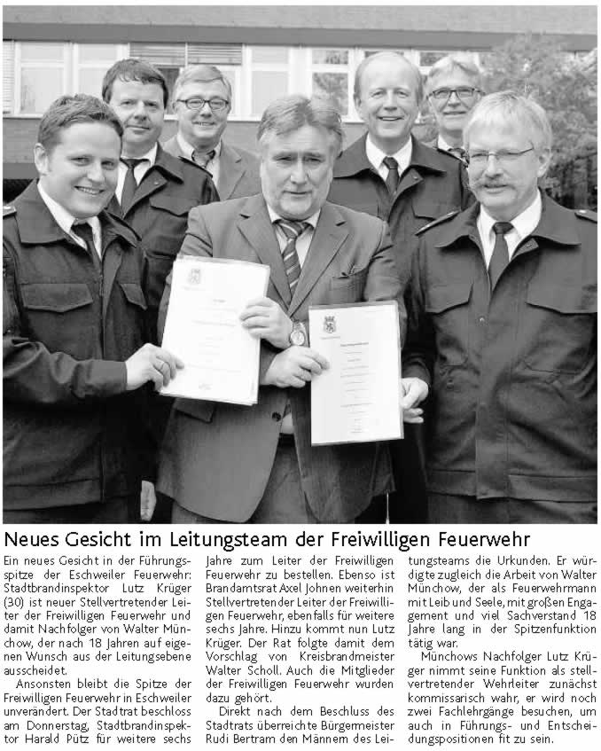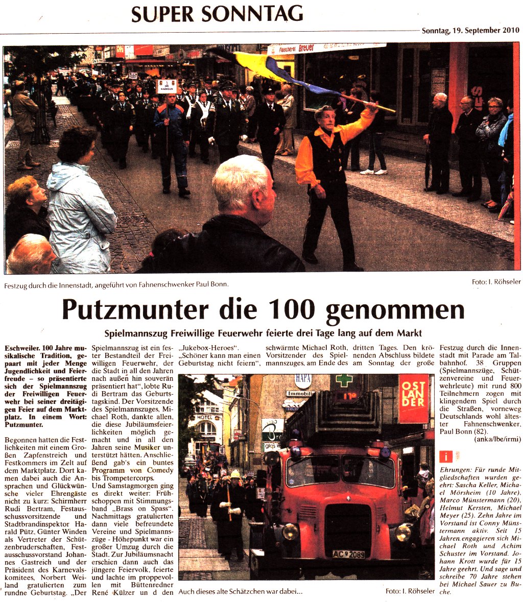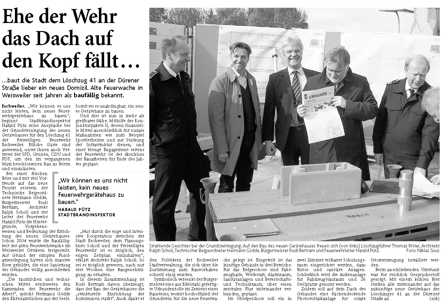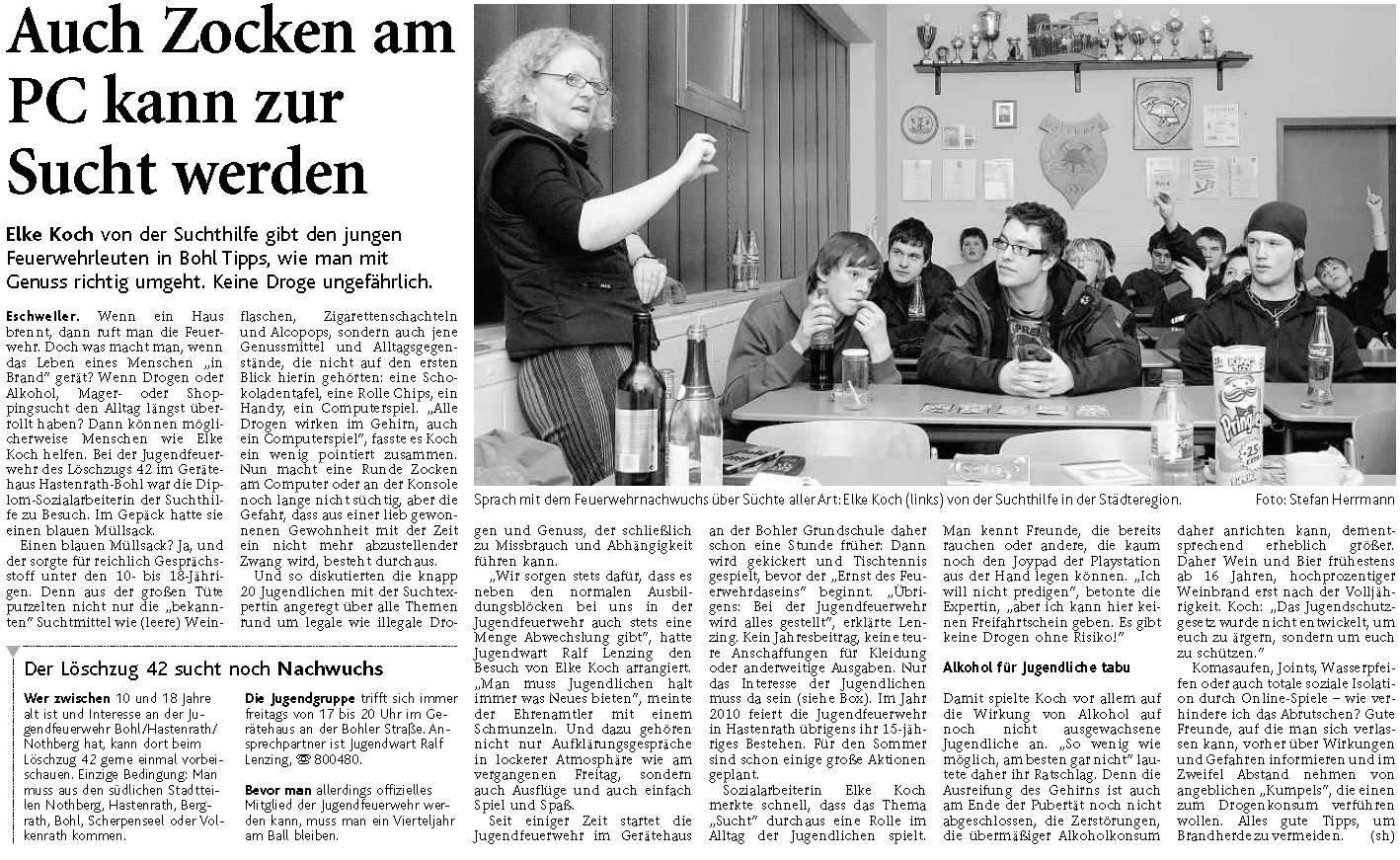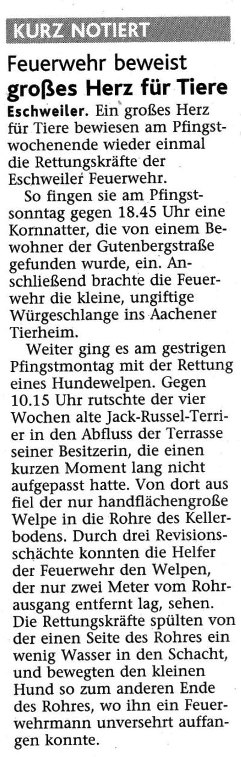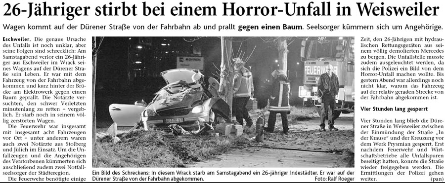 2010 31.12.2010 Es freut uns... EN / EZ 31.12.2010 Wecker rettet Röher Familie das Leben EN / EZ 27.12.2010 Auch in Weisweiler bricht Reithalle unter... EN / EZ 16.12.2010 Keine Hektik bei der Wehr, wenn Solardach brennt EN / EZ 14.12.2010 Rund 15 Feuerwehrmänner bekämpfen Lkw-Brand... EN / EZ 15.11.2010 Carmen hält die Teams der Wehr ganz schön auf... EN / EZ 08.11.2010 26-Jähriger stirbt bei Horror-Unfall in Weisweiler EN / EZ 29.10.2010 Plötzlich läuft unbekannte Chemikalie aus EN / EZ 13.10.2010 180 Stunde Vorbereitung auf gefährliche Einsätze EN / EZ 09.10.2010 Norden der Stadt ist jetzt sicherer EN / EZ 04.10.2010 24-Jähriger stirbt am Morgen auf der Autobahn EN / EZ 01.10.2010 Geballte Kompetenz von Morgen EN / EZ 23.09.2010 Die ungewollte "Feuertaufe" endet glimpflich EN / EZ 19.09.2010 Putzmunter die 100 genommen (farbe) Super Sonntag 19.09.2010 Putzmunter die 100 genommen Super Sonntag 15.09.2010 Arbeiter lösen Brand auf Hospitaldach aus EN / EZ 13.09.2010 Fulminanter Festzug zum 100. Geburtstag EN / EZ 13.09.2010 Rauschende Party zum Jubiläum im Festzelt EN / EZ 10.09.2010 Feuerwehr lädt ein zum dreitägigen Feier-Marathon... EN / EZ 06.09.2010 Leute strömen zum Fest im Sonnenschein EN / EZ 30.08.2010 100 Jahre Spielmannszug EN / EZ 04.08.2010 Wechselladermaschinistenlehrgang EN / EZ 30.07.2010 Mit Blaulicht und Martinshorn rund um die Wache EN / EZ 13.07.2010 Essen auf Herd vergessen - Küche ruiniert EN / EZ 12.07.2010 Flammen schlagen aus Turm des Zanderhofs EN / EZ 29.06.2010 Im Einsatz zählt plötzlich jede Sekunde EN / EZ 09.06.2010 Führerhaus geht auf der Autobahn in Flammen auf EN / EZ 25.05.2010 Kurz notiert: Feuerwhr beweist großes Herz für Tiere EN / EZ 08.05.2010 Ehe der Wehr das Dach auf den Kopf fällt... EN / EZ 04.05.2010 Liebes Tagebuch... EN / EZ 01.05.2010 Neues Gesicht im Leitungsteam der Freiwilligen... EN / EZ 01.05.2010 Dichter Rauch erfüllt fünf Mehrfamilienhäuser EN / EZ 01.05.2010 Auf diese fixe Truppe können Bürger bauen EN / EZ 20.04.2010 27-Jähriger stirbt in brennender Wohnung EN / EZ 03.04.2010 Wehr fährt im Oldtimer vor EN / EZ 10.03.2010 Explosiver Kohlenstaub: A4 voll gesperrt EN / EZ 02.03.2010 Xynthia wütet wie die Axt im Walde EN / EZ 01.03.2010 Xynthia wütet mit Macht EN / EZ 22.02.2010 Auch Zocken am PC kann zur Sucht werden EN / EZ 17.02.2010 Das Winterwetter beschert weniger Rettungseinsätze EN / EZ