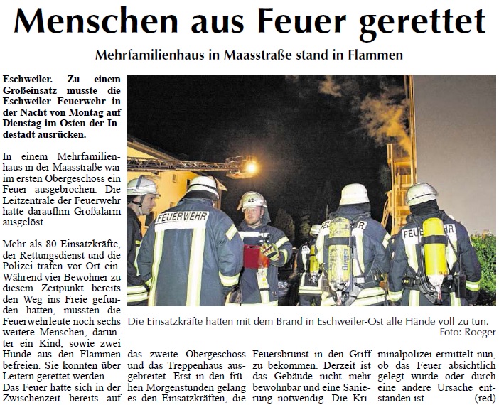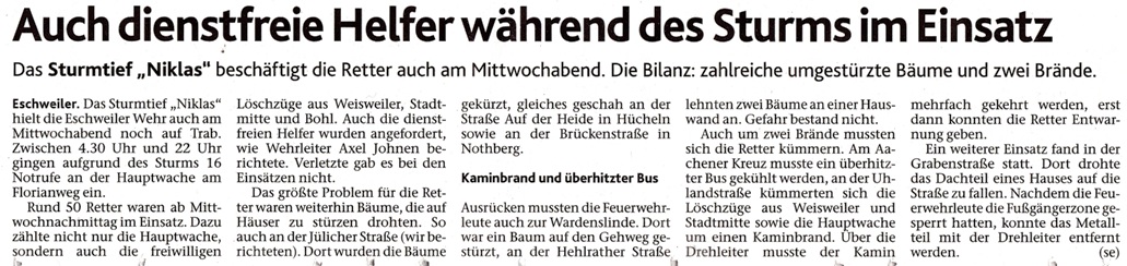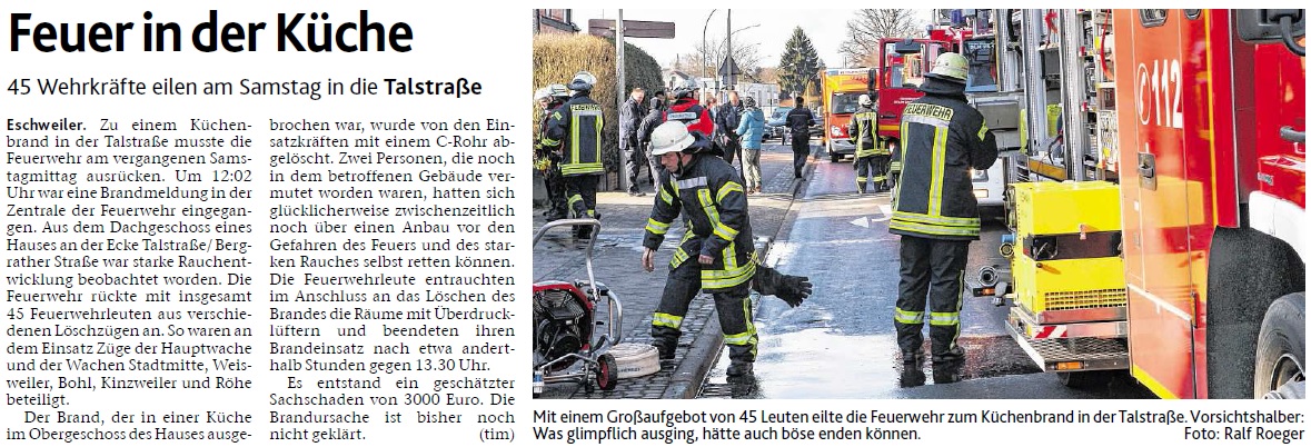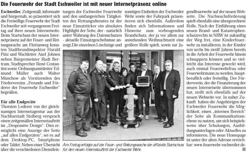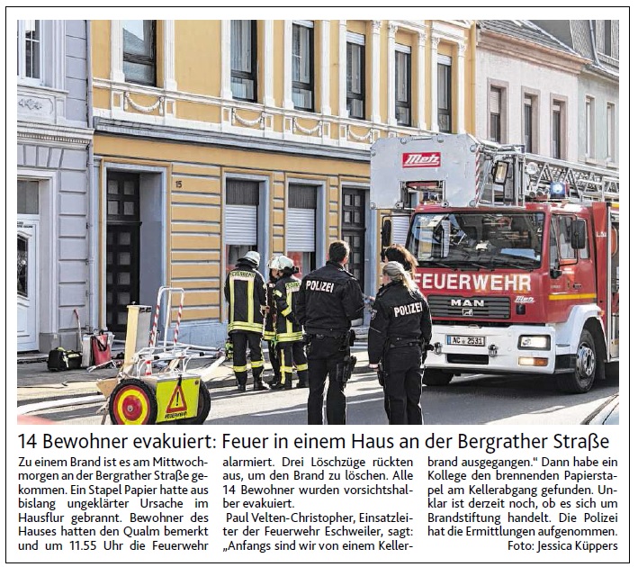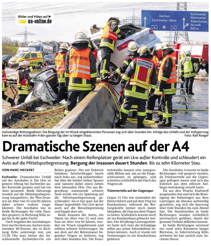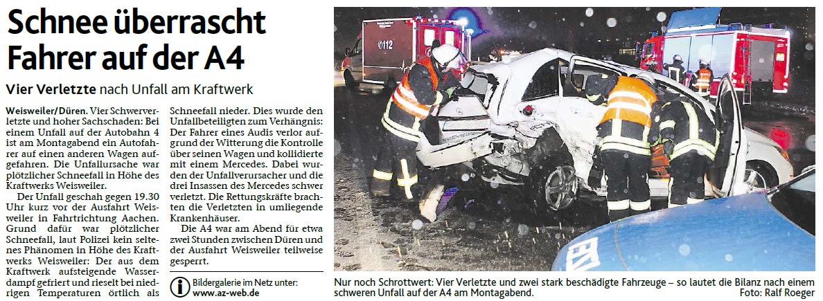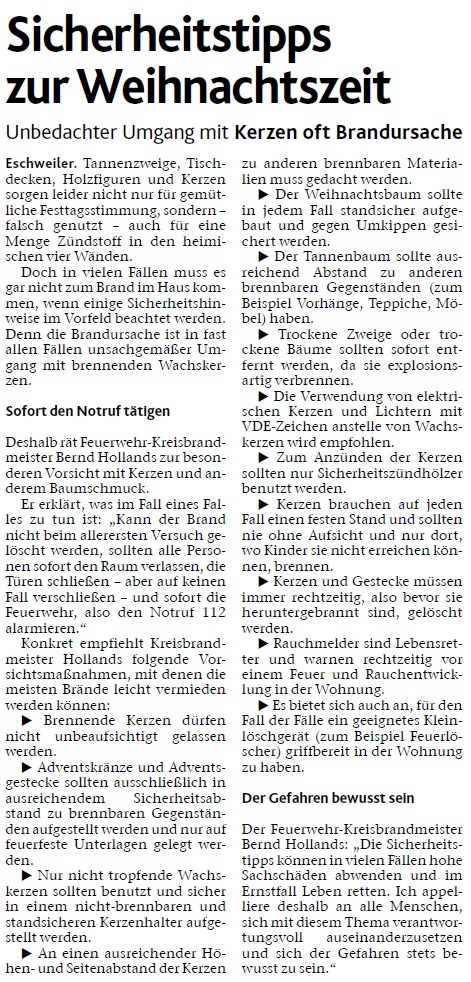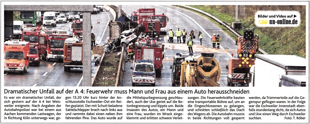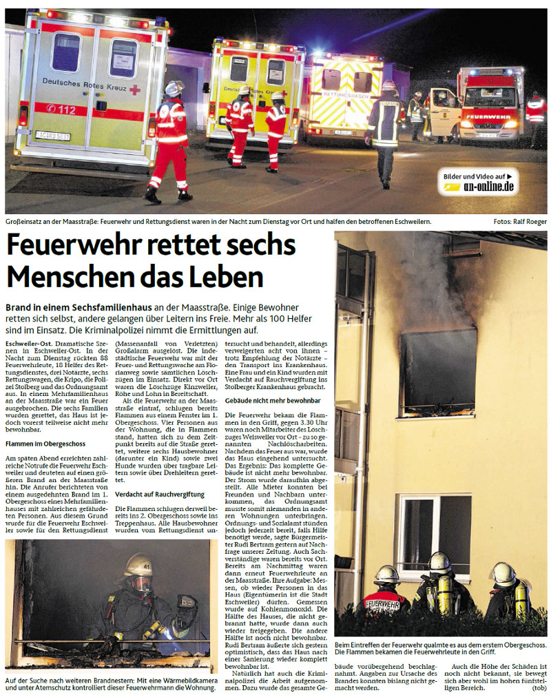 2015 21.12.2015 Sicherheitstipps zur Weihnachtszeit EN / EZ 21.12.2015 Kurz notiert: Bestätigt: Brandopfer... EN / EZ 19.12.2015 Toter bei Hausbrand in Kinzweiler EN / EZ 16.12.2015 Die letzten Handgriffe ... EN / EZ 15.12.2015 Dank gilt den Helfern EN / EZ 12.12.2015 Für den Richtigen Umgang mit der Säge EN / EZ 10.12.2015 14 Bewohner evakuiert: Feuer in einem Haus... EN / EZ 07.12.2015 Brennendes Matratzenlager ruft die Wehr auf... EN / EZ 02.12.2015 Schritt für Schritt in Richtung Feuerwehr-Zukunft EN / EZ 25.11.2015 Ohne Ehrenamt kommt die Wehr nicht aus EN / EZ 19.11.2015 Drossel im Kondensator macht ordentlich Qualm EN / EZ 19.11.2015 Kurz notiert: Nobelcoupé brennt nach Überschlag... EN / EZ 27.10.2015 Veteranen sind Vorbilder für die heutigen Wehrleute EN / EZ 23.10.2015 Kurz notiert: Unfall auf der A4 EN / EZ 22.10.2015 Kurz notiert: Amgebranntes Essen EN / EZ 14.10.2015 Die Feuerwehr der Stadt Eschweiler ... Filmpost 12.10.2015 "Internet Marsch!" bei der Feuerwehr EN / EZ 10.10.2015 Es freut uns EN / EZ 10.10.2015 Jugendfeuerwehr fit: Feuer gelöscht, ... EN / EZ 10.10.2015 Der Karnevalsvirus hat ihn (noch) nicht befallen EN / EZ 07.10.2015 Die Hälfte ist geschafft: ... Filmpost 05.10.2015 Kurz notiert: Topf auf Herd löst... EN / EZ 04.10.2015 Tödlicher Unfall auf der A 4 Super Sonntag 02.10.2015 Retter in spe nehmen zwei Hürden EN / EZ 02.10.2015 A4: In kurzer Zeit sterben drei Menschen EN / EZ 02.10.2015 Schwere Unfälle auf der A4 fordern... EN / EZ 30.09.2015 Junge Frau übersteht Salto leicht verletzt EN / EZ 29.09.2015 Aufgerissener Lkw verteilt Brot auf der A4 EN / EZ 29.09.2015 Kurz notiert: Unfall auf der A 4 EN / EZ 28.09.2015 Kurz notiert: Flüchtiger Fahrer lässt... EN / EZ 27.09.2015 Überholmanöver schlug fehl Super Sonntag 22.09.2015 Kleine Gäste üben sich im Schlauchkegeln EN / EZ 20.09.2015 Alle Situationen wurden mit Bravour gemeistert Super Sonntag 19.09.2015 Heute feiert die Weisweiler Wehr EN / EZ 16.09.2015 Großübung der Jugendfeuerwehren in der MVA Filmpost 12.09.2015 Zwei Schwerverletzte und 20000 Euro Sachschaden EN / EZ 10.09.2015 Großeinsatz an der MVA - alles Übung EN / EZ 10.09.2015 Stundenlange Sperrung auf A4 EN / EZ 27.08.2015 Nachwuchs probt den Ernstfall EN / EZ 24.08.2015 Feuer bringt Mutter mit drei Kindern um ihre Habe EN / EZ 23.08.2015 Wichtige Übung Super Sonntag 20.08.2015 Mehr Patienten und einige Nacktbader EN / EZ 18.08.2015 Auch Löschen und Retten muss gelernt sein EN / EZ 18.08.2015 Es ärgert uns,... EN / EZ 15.08.2015 52-Jähriger in Eschweiler zündet sich selbst an EN / EZ 11.08.2015 Kuchen, Cocktails, kühle Blonde EN / EZ 30.07.2015 Langeweile ist bei der Feuerwehr ein Fremdwort EN / EZ 27.07.2015 Kurz notiert: Zahlreiche Einsätze für die Feuerwehr EN / EZ 22.07.2015 Motorradfahrer nach schwerem Unfall in Klinik EN / EZ 21.07.2015 Hunderte strömen zum Wiesenfest der Wehr EN / EZ 20.07.2015 Kurz notiert: Kinzweiler Wehr wirft die Kohle ... EN / EZ 19.07.2015 Eschweiler Bürger besuchten den Landtag Super Sonntag 16.07.2015 Jagd nach der Jugendflamme EN / EZ 06.07.2015 Im kühlen Nass lauert der Tod EN / EZ 01.07.2015 Jugendfeuerwehren aus dem Kreis Aachen ... Filmpost 16.06.2015 Knoten, Stiche und knifflige Aufgaben EN / EZ 14.06.2015 Menschen aus Feuer gerettet Super Sonntag 10.06.2015 Feuerwehr rettet sechs Menschen das Leben EN / EZ 19.05.2015 Flammen vernichten Hanf-Plantage EN / EZ 02.04.2015 Auch dienstfreie Helfer während des Sturms ... EN / EZ 02.04.2015 Dramatischer Unfall auf der A4: ... EN / EZ 02.04.2015 Dramatische Szenen auf der A4 EN / EZ 01.04.2015 "Niklas" hat Indestadt im Griff EN / EZ 31.03.2015 Sie finden sich auch im Rauch zurecht EN / EZ 25.03.2015 Neues Domizil für Stadtmitte-Löschzüge EN / EZ 23.03.2015 Einsatzkräfte der Wehr hoch motiviert EN / EZ 23.03.2015 "Golden Hour": 60 dramatische Minuten EN / EZ 22.03.2015 Auf Florians Spuren Super Sonntag 17.03.2015 Soviel Engagement ist keineswegs ... EN / EZ 16.03.2015 Scheunendach am Bushof in Flammen EN / EZ 13.03.2015 Wache erhält mehr Feuerwehrleute ... EN / EZ 10.03.2015 Hart arbeitende Wehr soll´s leichter haben EN / EZ 02.03.2015 Gestohlenes Kennzeichen: Unfallfahrer ... EN / EZ 24.02.2015 Die Sirenen kehren auf die Dächer zurück EN / EZ 24.02.2015 Alter Öltank gerät bei Arbeiten in Flammen EN / EZ 20.02.2015 Sparsame Beleuchtung für die Wache EN / EZ 18.02.2015 Weniger Arbeit für die Retter EN / EZ 16.02.2015 Stefan Kaever trägt jetzt den Ehrenhelm EN / EZ 14.02.2015 Einer säuft, der andere sprüht Pfefferspray EN / EZ 08.02.2015 In den Ruhestand verabschiedet Super Sonntag 02.02.2015 Feuer in der Küche EN / EZ 24.01.2015 Feuerwehrleute fit für die Zukunft EN / EZ 21.01.2015 Schnee überrascht Fahrer auf der A4 EN / EZ 04.01.2015 Aus der Feuersbrunst gerettet Super Sonntag 02.01.2015 Wohnung brennt völlig aus EN / EZ