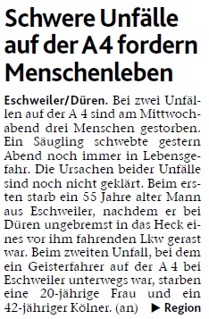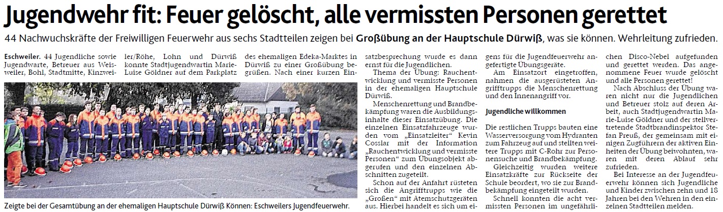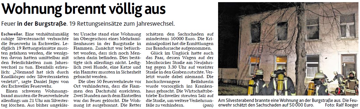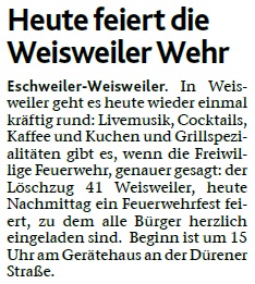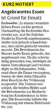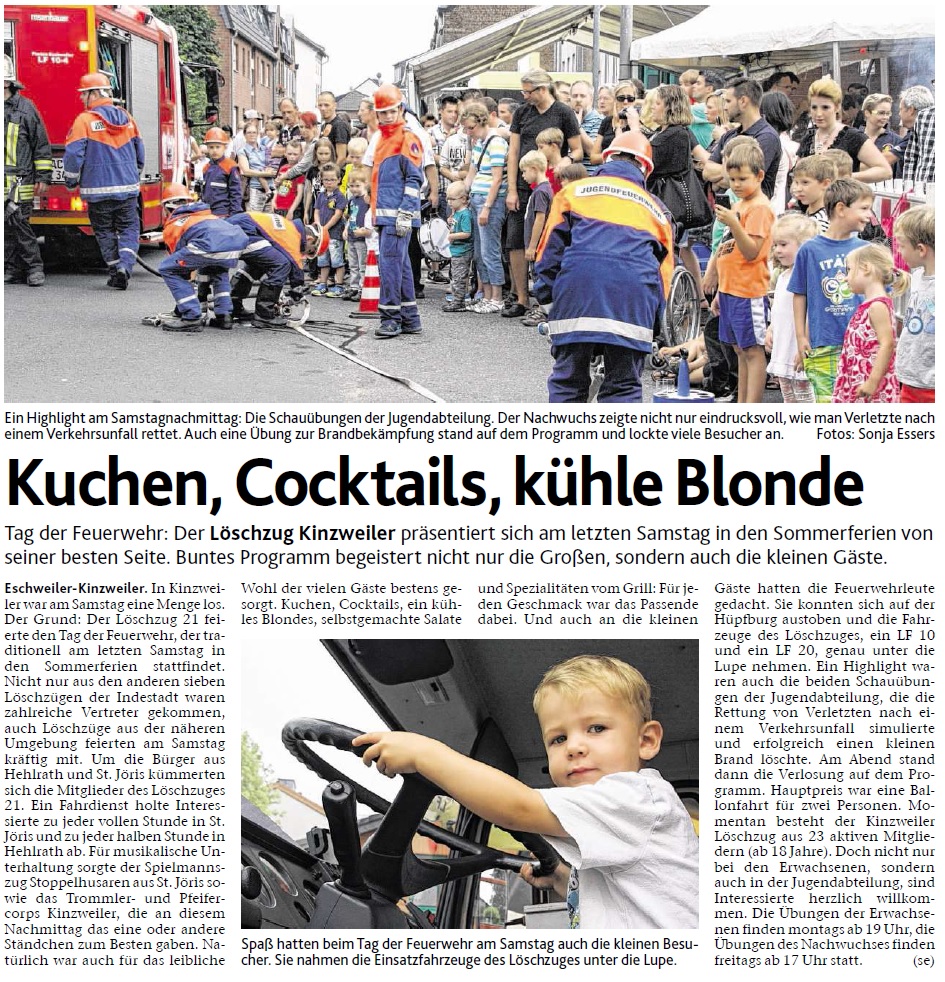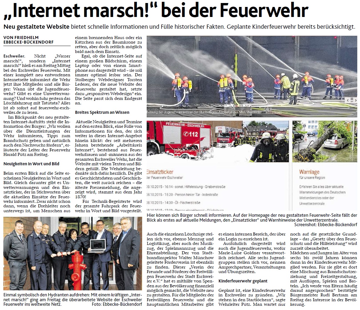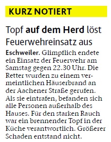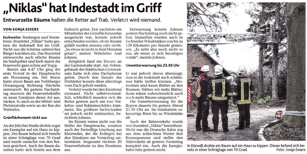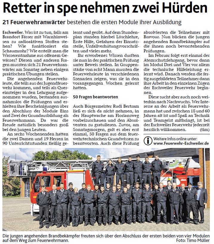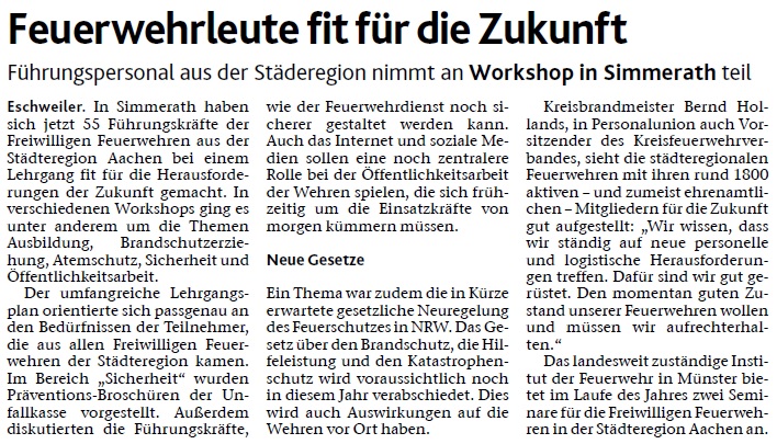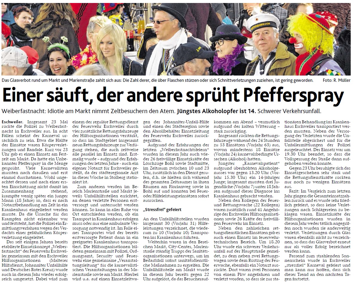 2015 21.12.2015 Sicherheitstipps zur Weihnachtszeit EN / EZ 21.12.2015 Kurz notiert: Bestätigt: Brandopfer... EN / EZ 19.12.2015 Toter bei Hausbrand in Kinzweiler EN / EZ 16.12.2015 Die letzten Handgriffe ... EN / EZ 15.12.2015 Dank gilt den Helfern EN / EZ 12.12.2015 Für den Richtigen Umgang mit der Säge EN / EZ 10.12.2015 14 Bewohner evakuiert: Feuer in einem Haus... EN / EZ 07.12.2015 Brennendes Matratzenlager ruft die Wehr auf... EN / EZ 02.12.2015 Schritt für Schritt in Richtung Feuerwehr-Zukunft EN / EZ 25.11.2015 Ohne Ehrenamt kommt die Wehr nicht aus EN / EZ 19.11.2015 Drossel im Kondensator macht ordentlich Qualm EN / EZ 19.11.2015 Kurz notiert: Nobelcoupé brennt nach Überschlag... EN / EZ 27.10.2015 Veteranen sind Vorbilder für die heutigen Wehrleute EN / EZ 23.10.2015 Kurz notiert: Unfall auf der A4 EN / EZ 22.10.2015 Kurz notiert: Amgebranntes Essen EN / EZ 14.10.2015 Die Feuerwehr der Stadt Eschweiler ... Filmpost 12.10.2015 "Internet Marsch!" bei der Feuerwehr EN / EZ 10.10.2015 Es freut uns EN / EZ 10.10.2015 Jugendfeuerwehr fit: Feuer gelöscht, ... EN / EZ 10.10.2015 Der Karnevalsvirus hat ihn (noch) nicht befallen EN / EZ 07.10.2015 Die Hälfte ist geschafft: ... Filmpost 05.10.2015 Kurz notiert: Topf auf Herd löst... EN / EZ 04.10.2015 Tödlicher Unfall auf der A 4 Super Sonntag 02.10.2015 Retter in spe nehmen zwei Hürden EN / EZ 02.10.2015 A4: In kurzer Zeit sterben drei Menschen EN / EZ 02.10.2015 Schwere Unfälle auf der A4 fordern... EN / EZ 30.09.2015 Junge Frau übersteht Salto leicht verletzt EN / EZ 29.09.2015 Aufgerissener Lkw verteilt Brot auf der A4 EN / EZ 29.09.2015 Kurz notiert: Unfall auf der A 4 EN / EZ 28.09.2015 Kurz notiert: Flüchtiger Fahrer lässt... EN / EZ 27.09.2015 Überholmanöver schlug fehl Super Sonntag 22.09.2015 Kleine Gäste üben sich im Schlauchkegeln EN / EZ 20.09.2015 Alle Situationen wurden mit Bravour gemeistert Super Sonntag 19.09.2015 Heute feiert die Weisweiler Wehr EN / EZ 16.09.2015 Großübung der Jugendfeuerwehren in der MVA Filmpost 12.09.2015 Zwei Schwerverletzte und 20000 Euro Sachschaden EN / EZ 10.09.2015 Großeinsatz an der MVA - alles Übung EN / EZ 10.09.2015 Stundenlange Sperrung auf A4 EN / EZ 27.08.2015 Nachwuchs probt den Ernstfall EN / EZ 24.08.2015 Feuer bringt Mutter mit drei Kindern um ihre Habe EN / EZ 23.08.2015 Wichtige Übung Super Sonntag 20.08.2015 Mehr Patienten und einige Nacktbader EN / EZ 18.08.2015 Auch Löschen und Retten muss gelernt sein EN / EZ 18.08.2015 Es ärgert uns,... EN / EZ 15.08.2015 52-Jähriger in Eschweiler zündet sich selbst an EN / EZ 11.08.2015 Kuchen, Cocktails, kühle Blonde EN / EZ 30.07.2015 Langeweile ist bei der Feuerwehr ein Fremdwort EN / EZ 27.07.2015 Kurz notiert: Zahlreiche Einsätze für die Feuerwehr EN / EZ 22.07.2015 Motorradfahrer nach schwerem Unfall in Klinik EN / EZ 21.07.2015 Hunderte strömen zum Wiesenfest der Wehr EN / EZ 20.07.2015 Kurz notiert: Kinzweiler Wehr wirft die Kohle ... EN / EZ 19.07.2015 Eschweiler Bürger besuchten den Landtag Super Sonntag 16.07.2015 Jagd nach der Jugendflamme EN / EZ 06.07.2015 Im kühlen Nass lauert der Tod EN / EZ 01.07.2015 Jugendfeuerwehren aus dem Kreis Aachen ... Filmpost 16.06.2015 Knoten, Stiche und knifflige Aufgaben EN / EZ 14.06.2015 Menschen aus Feuer gerettet Super Sonntag 10.06.2015 Feuerwehr rettet sechs Menschen das Leben EN / EZ 19.05.2015 Flammen vernichten Hanf-Plantage EN / EZ 02.04.2015 Auch dienstfreie Helfer während des Sturms ... EN / EZ 02.04.2015 Dramatischer Unfall auf der A4: ... EN / EZ 02.04.2015 Dramatische Szenen auf der A4 EN / EZ 01.04.2015 "Niklas" hat Indestadt im Griff EN / EZ 31.03.2015 Sie finden sich auch im Rauch zurecht EN / EZ 25.03.2015 Neues Domizil für Stadtmitte-Löschzüge EN / EZ 23.03.2015 Einsatzkräfte der Wehr hoch motiviert EN / EZ 23.03.2015 "Golden Hour": 60 dramatische Minuten EN / EZ 22.03.2015 Auf Florians Spuren Super Sonntag 17.03.2015 Soviel Engagement ist keineswegs ... EN / EZ 16.03.2015 Scheunendach am Bushof in Flammen EN / EZ 13.03.2015 Wache erhält mehr Feuerwehrleute ... EN / EZ 10.03.2015 Hart arbeitende Wehr soll´s leichter haben EN / EZ 02.03.2015 Gestohlenes Kennzeichen: Unfallfahrer ... EN / EZ 24.02.2015 Die Sirenen kehren auf die Dächer zurück EN / EZ 24.02.2015 Alter Öltank gerät bei Arbeiten in Flammen EN / EZ 20.02.2015 Sparsame Beleuchtung für die Wache EN / EZ 18.02.2015 Weniger Arbeit für die Retter EN / EZ 16.02.2015 Stefan Kaever trägt jetzt den Ehrenhelm EN / EZ 14.02.2015 Einer säuft, der andere sprüht Pfefferspray EN / EZ 08.02.2015 In den Ruhestand verabschiedet Super Sonntag 02.02.2015 Feuer in der Küche EN / EZ 24.01.2015 Feuerwehrleute fit für die Zukunft EN / EZ 21.01.2015 Schnee überrascht Fahrer auf der A4 EN / EZ 04.01.2015 Aus der Feuersbrunst gerettet Super Sonntag 02.01.2015 Wohnung brennt völlig aus EN / EZ