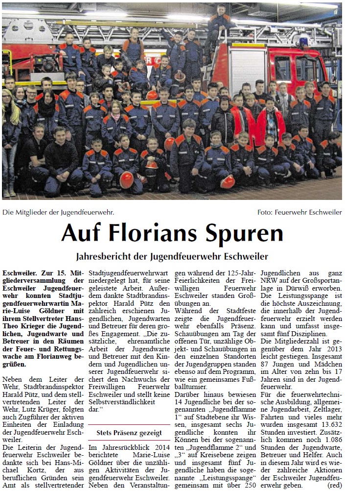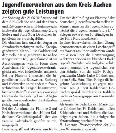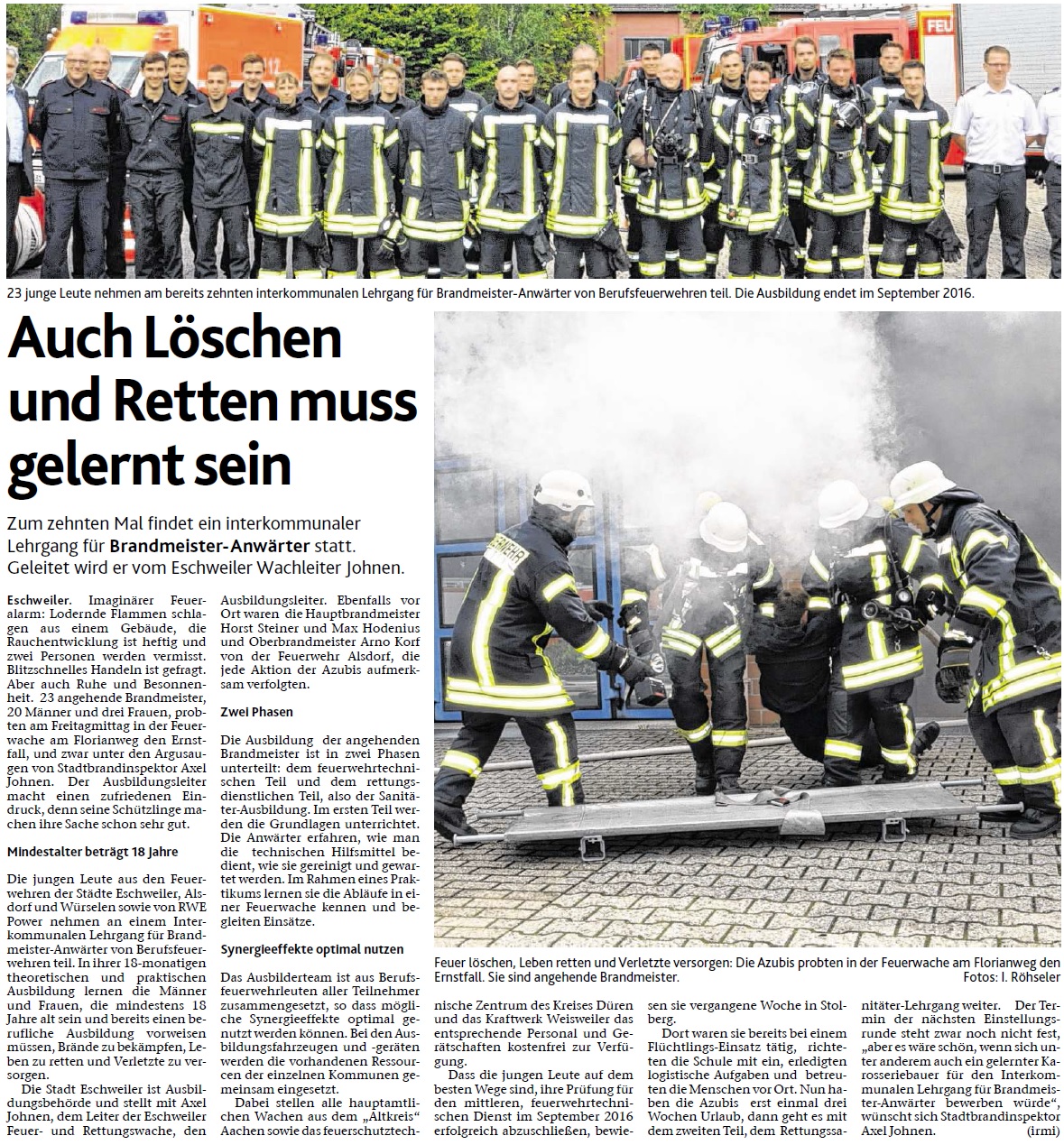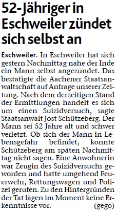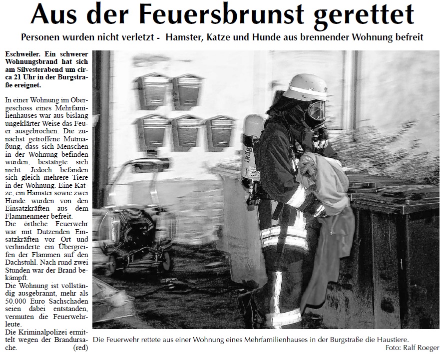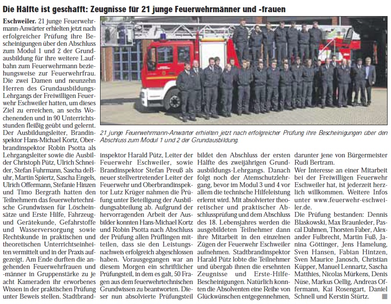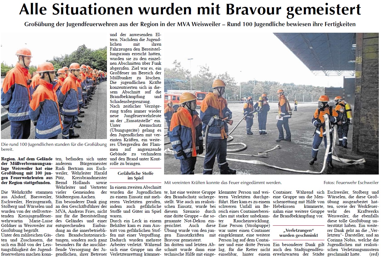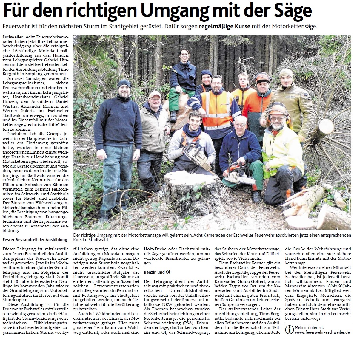 2015 21.12.2015 Sicherheitstipps zur Weihnachtszeit EN / EZ 21.12.2015 Kurz notiert: Bestätigt: Brandopfer... EN / EZ 19.12.2015 Toter bei Hausbrand in Kinzweiler EN / EZ 16.12.2015 Die letzten Handgriffe ... EN / EZ 15.12.2015 Dank gilt den Helfern EN / EZ 12.12.2015 Für den Richtigen Umgang mit der Säge EN / EZ 10.12.2015 14 Bewohner evakuiert: Feuer in einem Haus... EN / EZ 07.12.2015 Brennendes Matratzenlager ruft die Wehr auf... EN / EZ 02.12.2015 Schritt für Schritt in Richtung Feuerwehr-Zukunft EN / EZ 25.11.2015 Ohne Ehrenamt kommt die Wehr nicht aus EN / EZ 19.11.2015 Drossel im Kondensator macht ordentlich Qualm EN / EZ 19.11.2015 Kurz notiert: Nobelcoupé brennt nach Überschlag... EN / EZ 27.10.2015 Veteranen sind Vorbilder für die heutigen Wehrleute EN / EZ 23.10.2015 Kurz notiert: Unfall auf der A4 EN / EZ 22.10.2015 Kurz notiert: Amgebranntes Essen EN / EZ 14.10.2015 Die Feuerwehr der Stadt Eschweiler ... Filmpost 12.10.2015 "Internet Marsch!" bei der Feuerwehr EN / EZ 10.10.2015 Es freut uns EN / EZ 10.10.2015 Jugendfeuerwehr fit: Feuer gelöscht, ... EN / EZ 10.10.2015 Der Karnevalsvirus hat ihn (noch) nicht befallen EN / EZ 07.10.2015 Die Hälfte ist geschafft: ... Filmpost 05.10.2015 Kurz notiert: Topf auf Herd löst... EN / EZ 04.10.2015 Tödlicher Unfall auf der A 4 Super Sonntag 02.10.2015 Retter in spe nehmen zwei Hürden EN / EZ 02.10.2015 A4: In kurzer Zeit sterben drei Menschen EN / EZ 02.10.2015 Schwere Unfälle auf der A4 fordern... EN / EZ 30.09.2015 Junge Frau übersteht Salto leicht verletzt EN / EZ 29.09.2015 Aufgerissener Lkw verteilt Brot auf der A4 EN / EZ 29.09.2015 Kurz notiert: Unfall auf der A 4 EN / EZ 28.09.2015 Kurz notiert: Flüchtiger Fahrer lässt... EN / EZ 27.09.2015 Überholmanöver schlug fehl Super Sonntag 22.09.2015 Kleine Gäste üben sich im Schlauchkegeln EN / EZ 20.09.2015 Alle Situationen wurden mit Bravour gemeistert Super Sonntag 19.09.2015 Heute feiert die Weisweiler Wehr EN / EZ 16.09.2015 Großübung der Jugendfeuerwehren in der MVA Filmpost 12.09.2015 Zwei Schwerverletzte und 20000 Euro Sachschaden EN / EZ 10.09.2015 Großeinsatz an der MVA - alles Übung EN / EZ 10.09.2015 Stundenlange Sperrung auf A4 EN / EZ 27.08.2015 Nachwuchs probt den Ernstfall EN / EZ 24.08.2015 Feuer bringt Mutter mit drei Kindern um ihre Habe EN / EZ 23.08.2015 Wichtige Übung Super Sonntag 20.08.2015 Mehr Patienten und einige Nacktbader EN / EZ 18.08.2015 Auch Löschen und Retten muss gelernt sein EN / EZ 18.08.2015 Es ärgert uns,... EN / EZ 15.08.2015 52-Jähriger in Eschweiler zündet sich selbst an EN / EZ 11.08.2015 Kuchen, Cocktails, kühle Blonde EN / EZ 30.07.2015 Langeweile ist bei der Feuerwehr ein Fremdwort EN / EZ 27.07.2015 Kurz notiert: Zahlreiche Einsätze für die Feuerwehr EN / EZ 22.07.2015 Motorradfahrer nach schwerem Unfall in Klinik EN / EZ 21.07.2015 Hunderte strömen zum Wiesenfest der Wehr EN / EZ 20.07.2015 Kurz notiert: Kinzweiler Wehr wirft die Kohle ... EN / EZ 19.07.2015 Eschweiler Bürger besuchten den Landtag Super Sonntag 16.07.2015 Jagd nach der Jugendflamme EN / EZ 06.07.2015 Im kühlen Nass lauert der Tod EN / EZ 01.07.2015 Jugendfeuerwehren aus dem Kreis Aachen ... Filmpost 16.06.2015 Knoten, Stiche und knifflige Aufgaben EN / EZ 14.06.2015 Menschen aus Feuer gerettet Super Sonntag 10.06.2015 Feuerwehr rettet sechs Menschen das Leben EN / EZ 19.05.2015 Flammen vernichten Hanf-Plantage EN / EZ 02.04.2015 Auch dienstfreie Helfer während des Sturms ... EN / EZ 02.04.2015 Dramatischer Unfall auf der A4: ... EN / EZ 02.04.2015 Dramatische Szenen auf der A4 EN / EZ 01.04.2015 "Niklas" hat Indestadt im Griff EN / EZ 31.03.2015 Sie finden sich auch im Rauch zurecht EN / EZ 25.03.2015 Neues Domizil für Stadtmitte-Löschzüge EN / EZ 23.03.2015 Einsatzkräfte der Wehr hoch motiviert EN / EZ 23.03.2015 "Golden Hour": 60 dramatische Minuten EN / EZ 22.03.2015 Auf Florians Spuren Super Sonntag 17.03.2015 Soviel Engagement ist keineswegs ... EN / EZ 16.03.2015 Scheunendach am Bushof in Flammen EN / EZ 13.03.2015 Wache erhält mehr Feuerwehrleute ... EN / EZ 10.03.2015 Hart arbeitende Wehr soll´s leichter haben EN / EZ 02.03.2015 Gestohlenes Kennzeichen: Unfallfahrer ... EN / EZ 24.02.2015 Die Sirenen kehren auf die Dächer zurück EN / EZ 24.02.2015 Alter Öltank gerät bei Arbeiten in Flammen EN / EZ 20.02.2015 Sparsame Beleuchtung für die Wache EN / EZ 18.02.2015 Weniger Arbeit für die Retter EN / EZ 16.02.2015 Stefan Kaever trägt jetzt den Ehrenhelm EN / EZ 14.02.2015 Einer säuft, der andere sprüht Pfefferspray EN / EZ 08.02.2015 In den Ruhestand verabschiedet Super Sonntag 02.02.2015 Feuer in der Küche EN / EZ 24.01.2015 Feuerwehrleute fit für die Zukunft EN / EZ 21.01.2015 Schnee überrascht Fahrer auf der A4 EN / EZ 04.01.2015 Aus der Feuersbrunst gerettet Super Sonntag 02.01.2015 Wohnung brennt völlig aus EN / EZ