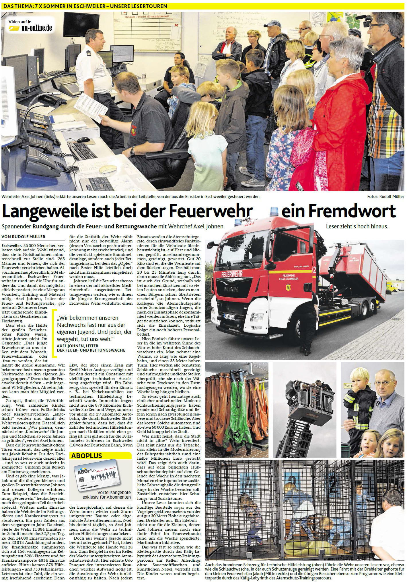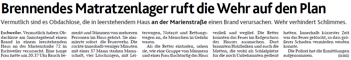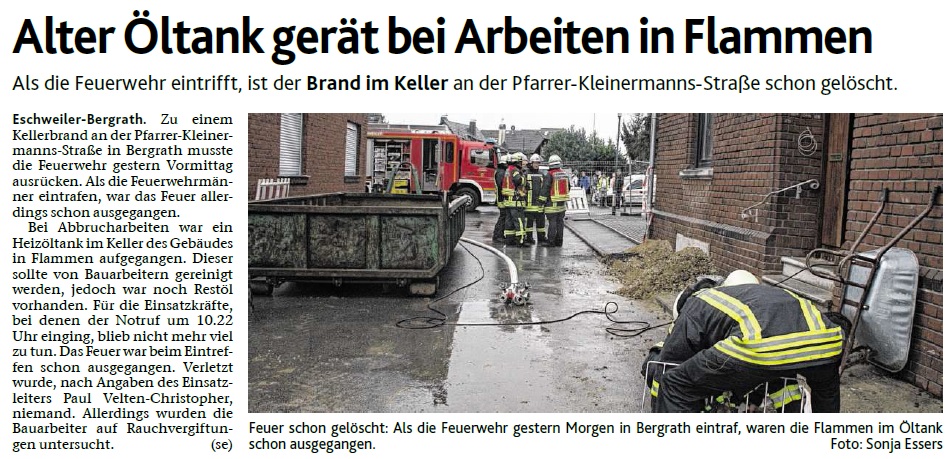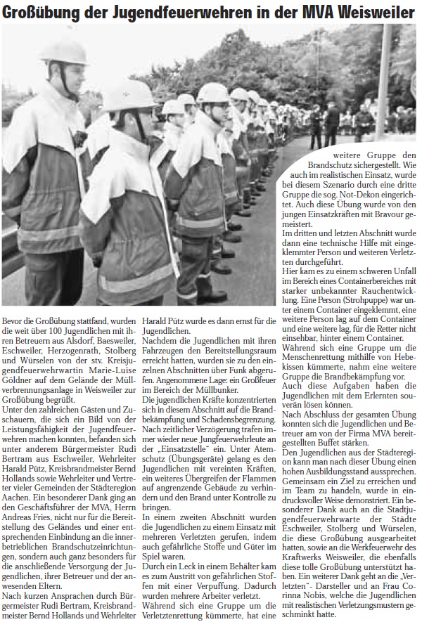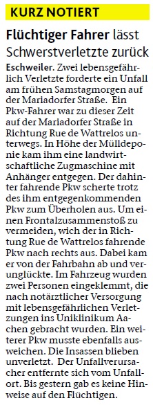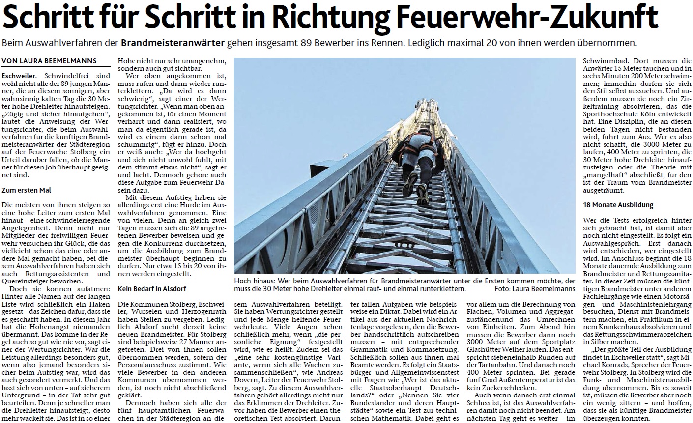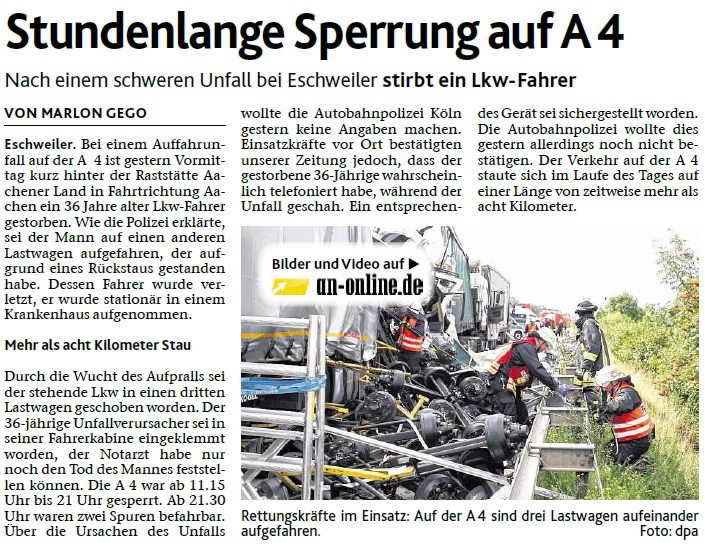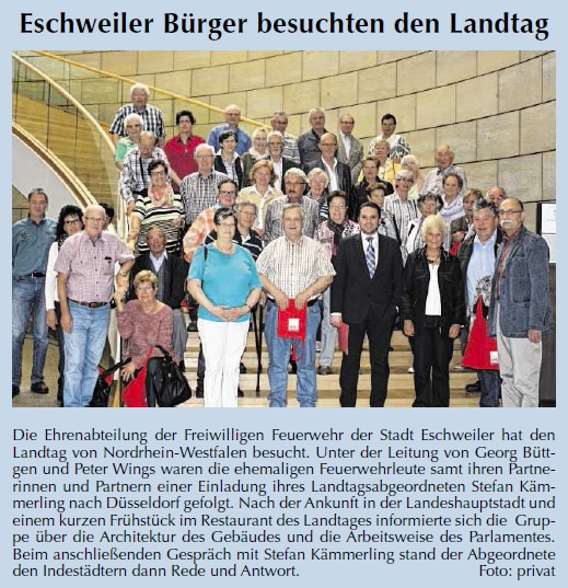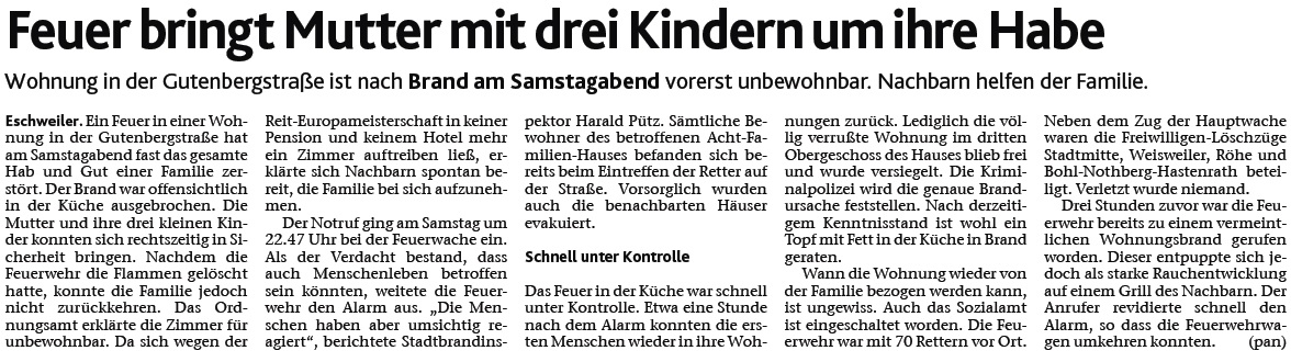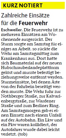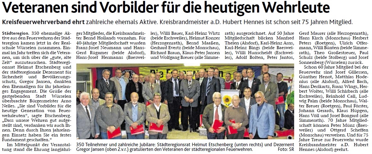 2015 21.12.2015 Sicherheitstipps zur Weihnachtszeit EN / EZ 21.12.2015 Kurz notiert: Bestätigt: Brandopfer... EN / EZ 19.12.2015 Toter bei Hausbrand in Kinzweiler EN / EZ 16.12.2015 Die letzten Handgriffe ... EN / EZ 15.12.2015 Dank gilt den Helfern EN / EZ 12.12.2015 Für den Richtigen Umgang mit der Säge EN / EZ 10.12.2015 14 Bewohner evakuiert: Feuer in einem Haus... EN / EZ 07.12.2015 Brennendes Matratzenlager ruft die Wehr auf... EN / EZ 02.12.2015 Schritt für Schritt in Richtung Feuerwehr-Zukunft EN / EZ 25.11.2015 Ohne Ehrenamt kommt die Wehr nicht aus EN / EZ 19.11.2015 Drossel im Kondensator macht ordentlich Qualm EN / EZ 19.11.2015 Kurz notiert: Nobelcoupé brennt nach Überschlag... EN / EZ 27.10.2015 Veteranen sind Vorbilder für die heutigen Wehrleute EN / EZ 23.10.2015 Kurz notiert: Unfall auf der A4 EN / EZ 22.10.2015 Kurz notiert: Amgebranntes Essen EN / EZ 14.10.2015 Die Feuerwehr der Stadt Eschweiler ... Filmpost 12.10.2015 "Internet Marsch!" bei der Feuerwehr EN / EZ 10.10.2015 Es freut uns EN / EZ 10.10.2015 Jugendfeuerwehr fit: Feuer gelöscht, ... EN / EZ 10.10.2015 Der Karnevalsvirus hat ihn (noch) nicht befallen EN / EZ 07.10.2015 Die Hälfte ist geschafft: ... Filmpost 05.10.2015 Kurz notiert: Topf auf Herd löst... EN / EZ 04.10.2015 Tödlicher Unfall auf der A 4 Super Sonntag 02.10.2015 Retter in spe nehmen zwei Hürden EN / EZ 02.10.2015 A4: In kurzer Zeit sterben drei Menschen EN / EZ 02.10.2015 Schwere Unfälle auf der A4 fordern... EN / EZ 30.09.2015 Junge Frau übersteht Salto leicht verletzt EN / EZ 29.09.2015 Aufgerissener Lkw verteilt Brot auf der A4 EN / EZ 29.09.2015 Kurz notiert: Unfall auf der A 4 EN / EZ 28.09.2015 Kurz notiert: Flüchtiger Fahrer lässt... EN / EZ 27.09.2015 Überholmanöver schlug fehl Super Sonntag 22.09.2015 Kleine Gäste üben sich im Schlauchkegeln EN / EZ 20.09.2015 Alle Situationen wurden mit Bravour gemeistert Super Sonntag 19.09.2015 Heute feiert die Weisweiler Wehr EN / EZ 16.09.2015 Großübung der Jugendfeuerwehren in der MVA Filmpost 12.09.2015 Zwei Schwerverletzte und 20000 Euro Sachschaden EN / EZ 10.09.2015 Großeinsatz an der MVA - alles Übung EN / EZ 10.09.2015 Stundenlange Sperrung auf A4 EN / EZ 27.08.2015 Nachwuchs probt den Ernstfall EN / EZ 24.08.2015 Feuer bringt Mutter mit drei Kindern um ihre Habe EN / EZ 23.08.2015 Wichtige Übung Super Sonntag 20.08.2015 Mehr Patienten und einige Nacktbader EN / EZ 18.08.2015 Auch Löschen und Retten muss gelernt sein EN / EZ 18.08.2015 Es ärgert uns,... EN / EZ 15.08.2015 52-Jähriger in Eschweiler zündet sich selbst an EN / EZ 11.08.2015 Kuchen, Cocktails, kühle Blonde EN / EZ 30.07.2015 Langeweile ist bei der Feuerwehr ein Fremdwort EN / EZ 27.07.2015 Kurz notiert: Zahlreiche Einsätze für die Feuerwehr EN / EZ 22.07.2015 Motorradfahrer nach schwerem Unfall in Klinik EN / EZ 21.07.2015 Hunderte strömen zum Wiesenfest der Wehr EN / EZ 20.07.2015 Kurz notiert: Kinzweiler Wehr wirft die Kohle ... EN / EZ 19.07.2015 Eschweiler Bürger besuchten den Landtag Super Sonntag 16.07.2015 Jagd nach der Jugendflamme EN / EZ 06.07.2015 Im kühlen Nass lauert der Tod EN / EZ 01.07.2015 Jugendfeuerwehren aus dem Kreis Aachen ... Filmpost 16.06.2015 Knoten, Stiche und knifflige Aufgaben EN / EZ 14.06.2015 Menschen aus Feuer gerettet Super Sonntag 10.06.2015 Feuerwehr rettet sechs Menschen das Leben EN / EZ 19.05.2015 Flammen vernichten Hanf-Plantage EN / EZ 02.04.2015 Auch dienstfreie Helfer während des Sturms ... EN / EZ 02.04.2015 Dramatischer Unfall auf der A4: ... EN / EZ 02.04.2015 Dramatische Szenen auf der A4 EN / EZ 01.04.2015 "Niklas" hat Indestadt im Griff EN / EZ 31.03.2015 Sie finden sich auch im Rauch zurecht EN / EZ 25.03.2015 Neues Domizil für Stadtmitte-Löschzüge EN / EZ 23.03.2015 Einsatzkräfte der Wehr hoch motiviert EN / EZ 23.03.2015 "Golden Hour": 60 dramatische Minuten EN / EZ 22.03.2015 Auf Florians Spuren Super Sonntag 17.03.2015 Soviel Engagement ist keineswegs ... EN / EZ 16.03.2015 Scheunendach am Bushof in Flammen EN / EZ 13.03.2015 Wache erhält mehr Feuerwehrleute ... EN / EZ 10.03.2015 Hart arbeitende Wehr soll´s leichter haben EN / EZ 02.03.2015 Gestohlenes Kennzeichen: Unfallfahrer ... EN / EZ 24.02.2015 Die Sirenen kehren auf die Dächer zurück EN / EZ 24.02.2015 Alter Öltank gerät bei Arbeiten in Flammen EN / EZ 20.02.2015 Sparsame Beleuchtung für die Wache EN / EZ 18.02.2015 Weniger Arbeit für die Retter EN / EZ 16.02.2015 Stefan Kaever trägt jetzt den Ehrenhelm EN / EZ 14.02.2015 Einer säuft, der andere sprüht Pfefferspray EN / EZ 08.02.2015 In den Ruhestand verabschiedet Super Sonntag 02.02.2015 Feuer in der Küche EN / EZ 24.01.2015 Feuerwehrleute fit für die Zukunft EN / EZ 21.01.2015 Schnee überrascht Fahrer auf der A4 EN / EZ 04.01.2015 Aus der Feuersbrunst gerettet Super Sonntag 02.01.2015 Wohnung brennt völlig aus EN / EZ
