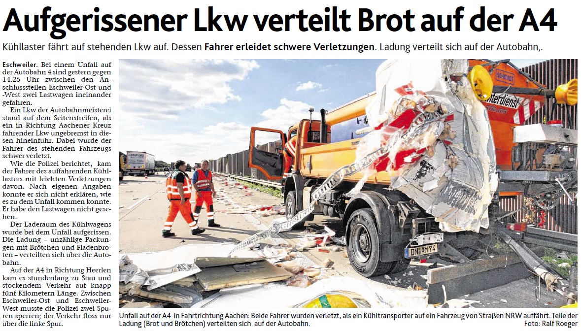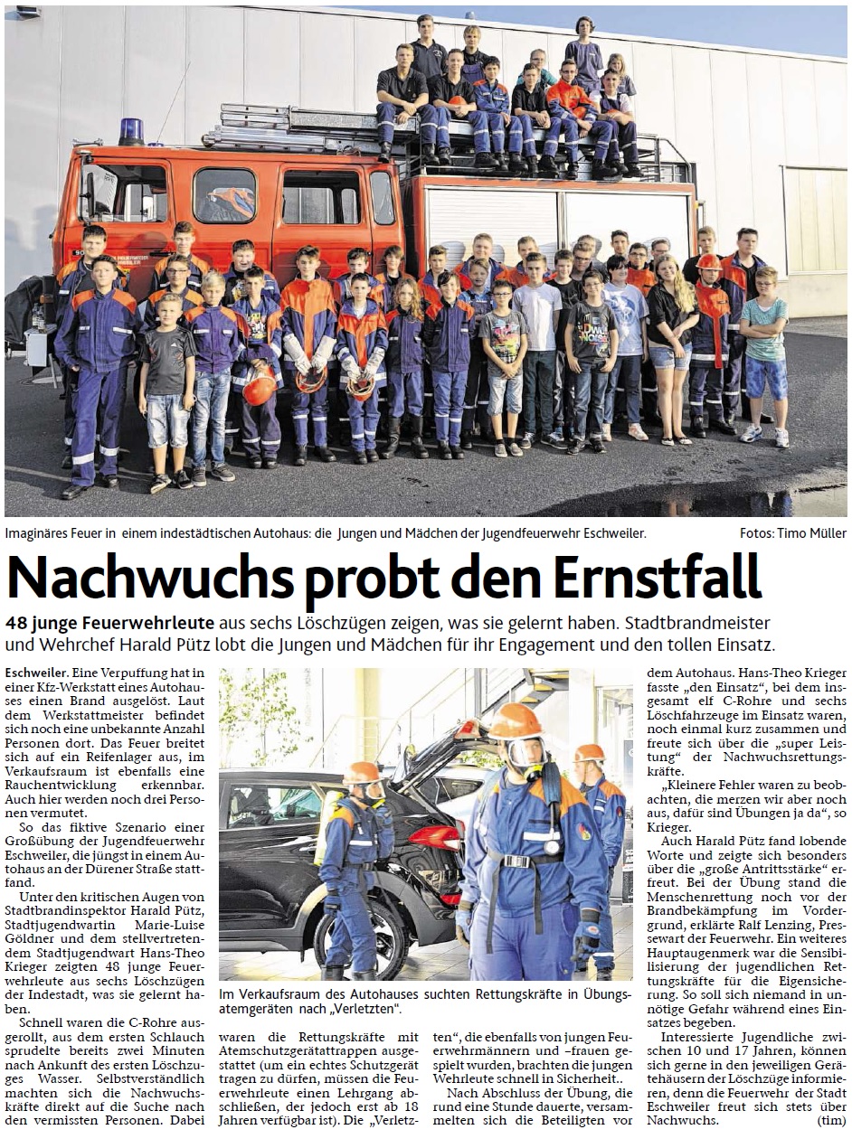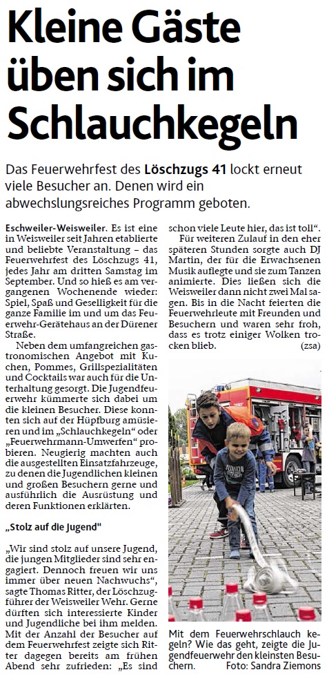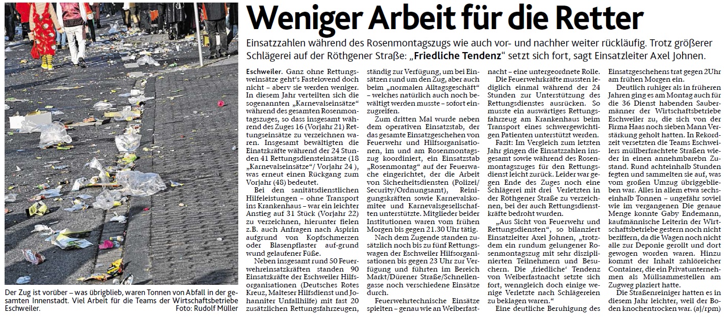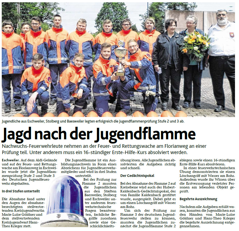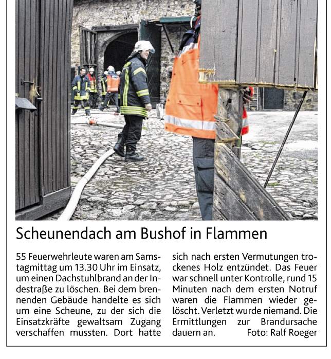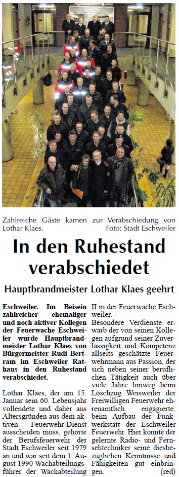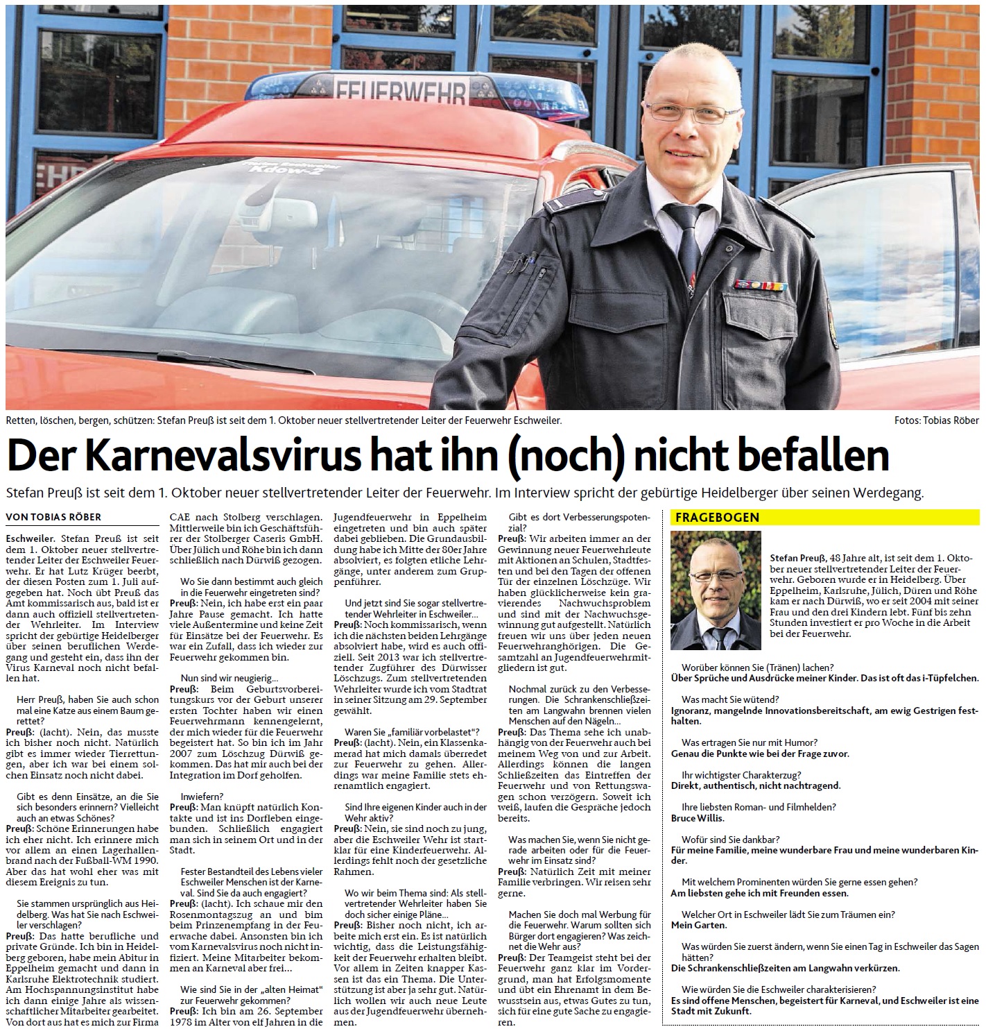 2015 21.12.2015 Sicherheitstipps zur Weihnachtszeit EN / EZ 21.12.2015 Kurz notiert: Bestätigt: Brandopfer... EN / EZ 19.12.2015 Toter bei Hausbrand in Kinzweiler EN / EZ 16.12.2015 Die letzten Handgriffe ... EN / EZ 15.12.2015 Dank gilt den Helfern EN / EZ 12.12.2015 Für den Richtigen Umgang mit der Säge EN / EZ 10.12.2015 14 Bewohner evakuiert: Feuer in einem Haus... EN / EZ 07.12.2015 Brennendes Matratzenlager ruft die Wehr auf... EN / EZ 02.12.2015 Schritt für Schritt in Richtung Feuerwehr-Zukunft EN / EZ 25.11.2015 Ohne Ehrenamt kommt die Wehr nicht aus EN / EZ 19.11.2015 Drossel im Kondensator macht ordentlich Qualm EN / EZ 19.11.2015 Kurz notiert: Nobelcoupé brennt nach Überschlag... EN / EZ 27.10.2015 Veteranen sind Vorbilder für die heutigen Wehrleute EN / EZ 23.10.2015 Kurz notiert: Unfall auf der A4 EN / EZ 22.10.2015 Kurz notiert: Amgebranntes Essen EN / EZ 14.10.2015 Die Feuerwehr der Stadt Eschweiler ... Filmpost 12.10.2015 "Internet Marsch!" bei der Feuerwehr EN / EZ 10.10.2015 Es freut uns EN / EZ 10.10.2015 Jugendfeuerwehr fit: Feuer gelöscht, ... EN / EZ 10.10.2015 Der Karnevalsvirus hat ihn (noch) nicht befallen EN / EZ 07.10.2015 Die Hälfte ist geschafft: ... Filmpost 05.10.2015 Kurz notiert: Topf auf Herd löst... EN / EZ 04.10.2015 Tödlicher Unfall auf der A 4 Super Sonntag 02.10.2015 Retter in spe nehmen zwei Hürden EN / EZ 02.10.2015 A4: In kurzer Zeit sterben drei Menschen EN / EZ 02.10.2015 Schwere Unfälle auf der A4 fordern... EN / EZ 30.09.2015 Junge Frau übersteht Salto leicht verletzt EN / EZ 29.09.2015 Aufgerissener Lkw verteilt Brot auf der A4 EN / EZ 29.09.2015 Kurz notiert: Unfall auf der A 4 EN / EZ 28.09.2015 Kurz notiert: Flüchtiger Fahrer lässt... EN / EZ 27.09.2015 Überholmanöver schlug fehl Super Sonntag 22.09.2015 Kleine Gäste üben sich im Schlauchkegeln EN / EZ 20.09.2015 Alle Situationen wurden mit Bravour gemeistert Super Sonntag 19.09.2015 Heute feiert die Weisweiler Wehr EN / EZ 16.09.2015 Großübung der Jugendfeuerwehren in der MVA Filmpost 12.09.2015 Zwei Schwerverletzte und 20000 Euro Sachschaden EN / EZ 10.09.2015 Großeinsatz an der MVA - alles Übung EN / EZ 10.09.2015 Stundenlange Sperrung auf A4 EN / EZ 27.08.2015 Nachwuchs probt den Ernstfall EN / EZ 24.08.2015 Feuer bringt Mutter mit drei Kindern um ihre Habe EN / EZ 23.08.2015 Wichtige Übung Super Sonntag 20.08.2015 Mehr Patienten und einige Nacktbader EN / EZ 18.08.2015 Auch Löschen und Retten muss gelernt sein EN / EZ 18.08.2015 Es ärgert uns,... EN / EZ 15.08.2015 52-Jähriger in Eschweiler zündet sich selbst an EN / EZ 11.08.2015 Kuchen, Cocktails, kühle Blonde EN / EZ 30.07.2015 Langeweile ist bei der Feuerwehr ein Fremdwort EN / EZ 27.07.2015 Kurz notiert: Zahlreiche Einsätze für die Feuerwehr EN / EZ 22.07.2015 Motorradfahrer nach schwerem Unfall in Klinik EN / EZ 21.07.2015 Hunderte strömen zum Wiesenfest der Wehr EN / EZ 20.07.2015 Kurz notiert: Kinzweiler Wehr wirft die Kohle ... EN / EZ 19.07.2015 Eschweiler Bürger besuchten den Landtag Super Sonntag 16.07.2015 Jagd nach der Jugendflamme EN / EZ 06.07.2015 Im kühlen Nass lauert der Tod EN / EZ 01.07.2015 Jugendfeuerwehren aus dem Kreis Aachen ... Filmpost 16.06.2015 Knoten, Stiche und knifflige Aufgaben EN / EZ 14.06.2015 Menschen aus Feuer gerettet Super Sonntag 10.06.2015 Feuerwehr rettet sechs Menschen das Leben EN / EZ 19.05.2015 Flammen vernichten Hanf-Plantage EN / EZ 02.04.2015 Auch dienstfreie Helfer während des Sturms ... EN / EZ 02.04.2015 Dramatischer Unfall auf der A4: ... EN / EZ 02.04.2015 Dramatische Szenen auf der A4 EN / EZ 01.04.2015 "Niklas" hat Indestadt im Griff EN / EZ 31.03.2015 Sie finden sich auch im Rauch zurecht EN / EZ 25.03.2015 Neues Domizil für Stadtmitte-Löschzüge EN / EZ 23.03.2015 Einsatzkräfte der Wehr hoch motiviert EN / EZ 23.03.2015 "Golden Hour": 60 dramatische Minuten EN / EZ 22.03.2015 Auf Florians Spuren Super Sonntag 17.03.2015 Soviel Engagement ist keineswegs ... EN / EZ 16.03.2015 Scheunendach am Bushof in Flammen EN / EZ 13.03.2015 Wache erhält mehr Feuerwehrleute ... EN / EZ 10.03.2015 Hart arbeitende Wehr soll´s leichter haben EN / EZ 02.03.2015 Gestohlenes Kennzeichen: Unfallfahrer ... EN / EZ 24.02.2015 Die Sirenen kehren auf die Dächer zurück EN / EZ 24.02.2015 Alter Öltank gerät bei Arbeiten in Flammen EN / EZ 20.02.2015 Sparsame Beleuchtung für die Wache EN / EZ 18.02.2015 Weniger Arbeit für die Retter EN / EZ 16.02.2015 Stefan Kaever trägt jetzt den Ehrenhelm EN / EZ 14.02.2015 Einer säuft, der andere sprüht Pfefferspray EN / EZ 08.02.2015 In den Ruhestand verabschiedet Super Sonntag 02.02.2015 Feuer in der Küche EN / EZ 24.01.2015 Feuerwehrleute fit für die Zukunft EN / EZ 21.01.2015 Schnee überrascht Fahrer auf der A4 EN / EZ 04.01.2015 Aus der Feuersbrunst gerettet Super Sonntag 02.01.2015 Wohnung brennt völlig aus EN / EZ