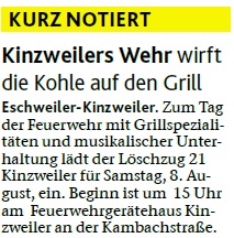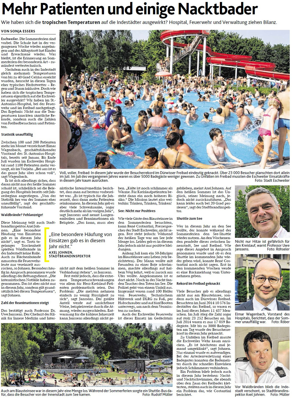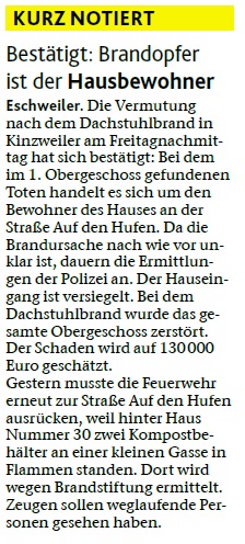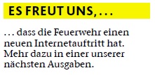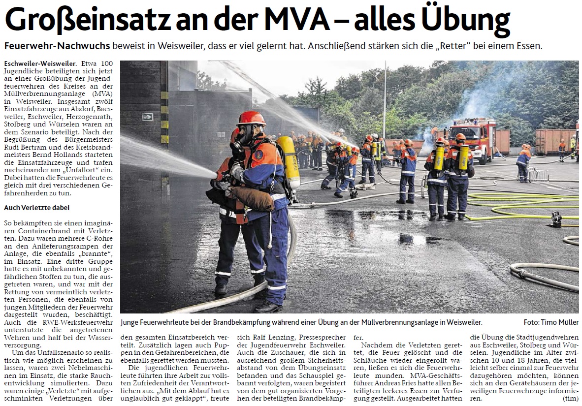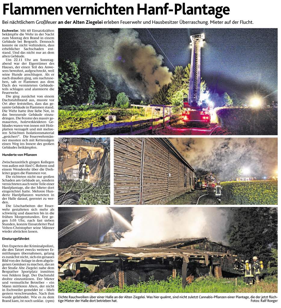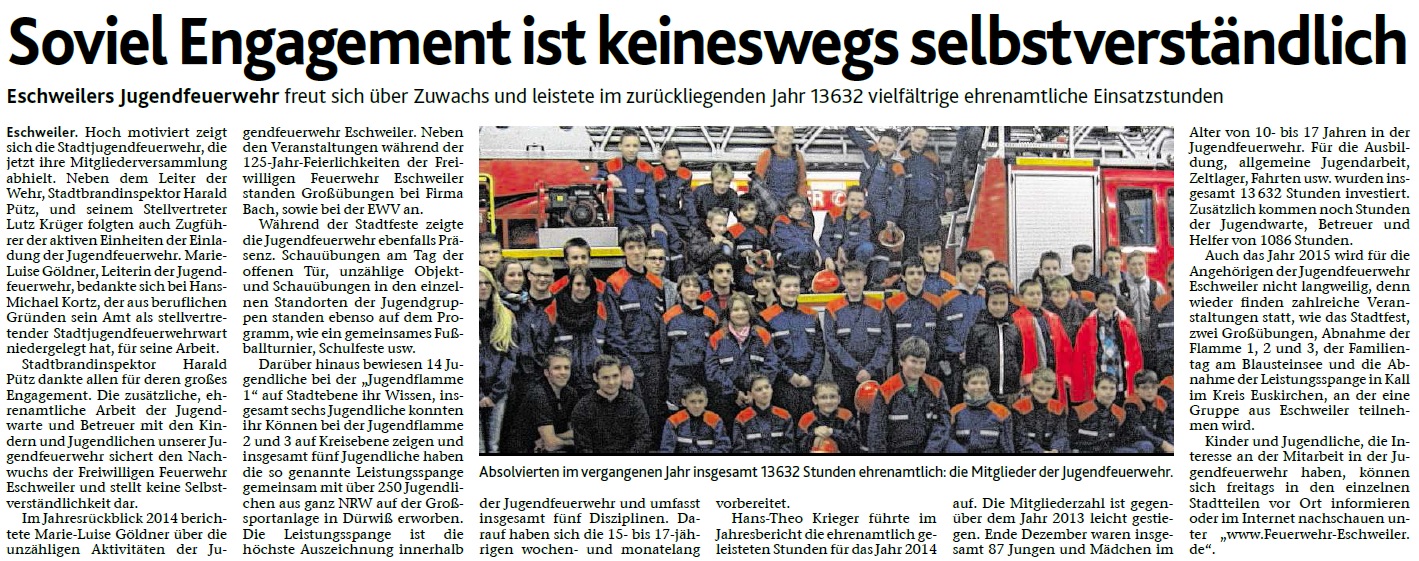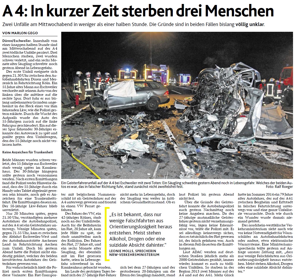 2015 21.12.2015 Sicherheitstipps zur Weihnachtszeit EN / EZ 21.12.2015 Kurz notiert: Bestätigt: Brandopfer... EN / EZ 19.12.2015 Toter bei Hausbrand in Kinzweiler EN / EZ 16.12.2015 Die letzten Handgriffe ... EN / EZ 15.12.2015 Dank gilt den Helfern EN / EZ 12.12.2015 Für den Richtigen Umgang mit der Säge EN / EZ 10.12.2015 14 Bewohner evakuiert: Feuer in einem Haus... EN / EZ 07.12.2015 Brennendes Matratzenlager ruft die Wehr auf... EN / EZ 02.12.2015 Schritt für Schritt in Richtung Feuerwehr-Zukunft EN / EZ 25.11.2015 Ohne Ehrenamt kommt die Wehr nicht aus EN / EZ 19.11.2015 Drossel im Kondensator macht ordentlich Qualm EN / EZ 19.11.2015 Kurz notiert: Nobelcoupé brennt nach Überschlag... EN / EZ 27.10.2015 Veteranen sind Vorbilder für die heutigen Wehrleute EN / EZ 23.10.2015 Kurz notiert: Unfall auf der A4 EN / EZ 22.10.2015 Kurz notiert: Amgebranntes Essen EN / EZ 14.10.2015 Die Feuerwehr der Stadt Eschweiler ... Filmpost 12.10.2015 "Internet Marsch!" bei der Feuerwehr EN / EZ 10.10.2015 Es freut uns EN / EZ 10.10.2015 Jugendfeuerwehr fit: Feuer gelöscht, ... EN / EZ 10.10.2015 Der Karnevalsvirus hat ihn (noch) nicht befallen EN / EZ 07.10.2015 Die Hälfte ist geschafft: ... Filmpost 05.10.2015 Kurz notiert: Topf auf Herd löst... EN / EZ 04.10.2015 Tödlicher Unfall auf der A 4 Super Sonntag 02.10.2015 Retter in spe nehmen zwei Hürden EN / EZ 02.10.2015 A4: In kurzer Zeit sterben drei Menschen EN / EZ 02.10.2015 Schwere Unfälle auf der A4 fordern... EN / EZ 30.09.2015 Junge Frau übersteht Salto leicht verletzt EN / EZ 29.09.2015 Aufgerissener Lkw verteilt Brot auf der A4 EN / EZ 29.09.2015 Kurz notiert: Unfall auf der A 4 EN / EZ 28.09.2015 Kurz notiert: Flüchtiger Fahrer lässt... EN / EZ 27.09.2015 Überholmanöver schlug fehl Super Sonntag 22.09.2015 Kleine Gäste üben sich im Schlauchkegeln EN / EZ 20.09.2015 Alle Situationen wurden mit Bravour gemeistert Super Sonntag 19.09.2015 Heute feiert die Weisweiler Wehr EN / EZ 16.09.2015 Großübung der Jugendfeuerwehren in der MVA Filmpost 12.09.2015 Zwei Schwerverletzte und 20000 Euro Sachschaden EN / EZ 10.09.2015 Großeinsatz an der MVA - alles Übung EN / EZ 10.09.2015 Stundenlange Sperrung auf A4 EN / EZ 27.08.2015 Nachwuchs probt den Ernstfall EN / EZ 24.08.2015 Feuer bringt Mutter mit drei Kindern um ihre Habe EN / EZ 23.08.2015 Wichtige Übung Super Sonntag 20.08.2015 Mehr Patienten und einige Nacktbader EN / EZ 18.08.2015 Auch Löschen und Retten muss gelernt sein EN / EZ 18.08.2015 Es ärgert uns,... EN / EZ 15.08.2015 52-Jähriger in Eschweiler zündet sich selbst an EN / EZ 11.08.2015 Kuchen, Cocktails, kühle Blonde EN / EZ 30.07.2015 Langeweile ist bei der Feuerwehr ein Fremdwort EN / EZ 27.07.2015 Kurz notiert: Zahlreiche Einsätze für die Feuerwehr EN / EZ 22.07.2015 Motorradfahrer nach schwerem Unfall in Klinik EN / EZ 21.07.2015 Hunderte strömen zum Wiesenfest der Wehr EN / EZ 20.07.2015 Kurz notiert: Kinzweiler Wehr wirft die Kohle ... EN / EZ 19.07.2015 Eschweiler Bürger besuchten den Landtag Super Sonntag 16.07.2015 Jagd nach der Jugendflamme EN / EZ 06.07.2015 Im kühlen Nass lauert der Tod EN / EZ 01.07.2015 Jugendfeuerwehren aus dem Kreis Aachen ... Filmpost 16.06.2015 Knoten, Stiche und knifflige Aufgaben EN / EZ 14.06.2015 Menschen aus Feuer gerettet Super Sonntag 10.06.2015 Feuerwehr rettet sechs Menschen das Leben EN / EZ 19.05.2015 Flammen vernichten Hanf-Plantage EN / EZ 02.04.2015 Auch dienstfreie Helfer während des Sturms ... EN / EZ 02.04.2015 Dramatischer Unfall auf der A4: ... EN / EZ 02.04.2015 Dramatische Szenen auf der A4 EN / EZ 01.04.2015 "Niklas" hat Indestadt im Griff EN / EZ 31.03.2015 Sie finden sich auch im Rauch zurecht EN / EZ 25.03.2015 Neues Domizil für Stadtmitte-Löschzüge EN / EZ 23.03.2015 Einsatzkräfte der Wehr hoch motiviert EN / EZ 23.03.2015 "Golden Hour": 60 dramatische Minuten EN / EZ 22.03.2015 Auf Florians Spuren Super Sonntag 17.03.2015 Soviel Engagement ist keineswegs ... EN / EZ 16.03.2015 Scheunendach am Bushof in Flammen EN / EZ 13.03.2015 Wache erhält mehr Feuerwehrleute ... EN / EZ 10.03.2015 Hart arbeitende Wehr soll´s leichter haben EN / EZ 02.03.2015 Gestohlenes Kennzeichen: Unfallfahrer ... EN / EZ 24.02.2015 Die Sirenen kehren auf die Dächer zurück EN / EZ 24.02.2015 Alter Öltank gerät bei Arbeiten in Flammen EN / EZ 20.02.2015 Sparsame Beleuchtung für die Wache EN / EZ 18.02.2015 Weniger Arbeit für die Retter EN / EZ 16.02.2015 Stefan Kaever trägt jetzt den Ehrenhelm EN / EZ 14.02.2015 Einer säuft, der andere sprüht Pfefferspray EN / EZ 08.02.2015 In den Ruhestand verabschiedet Super Sonntag 02.02.2015 Feuer in der Küche EN / EZ 24.01.2015 Feuerwehrleute fit für die Zukunft EN / EZ 21.01.2015 Schnee überrascht Fahrer auf der A4 EN / EZ 04.01.2015 Aus der Feuersbrunst gerettet Super Sonntag 02.01.2015 Wohnung brennt völlig aus EN / EZ