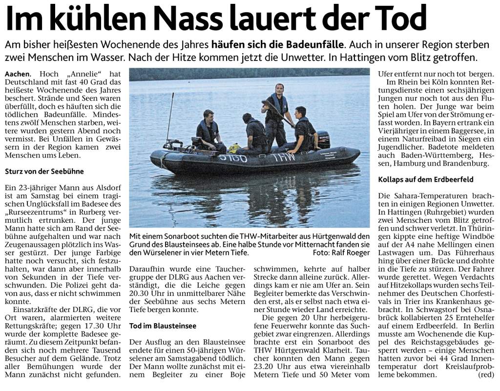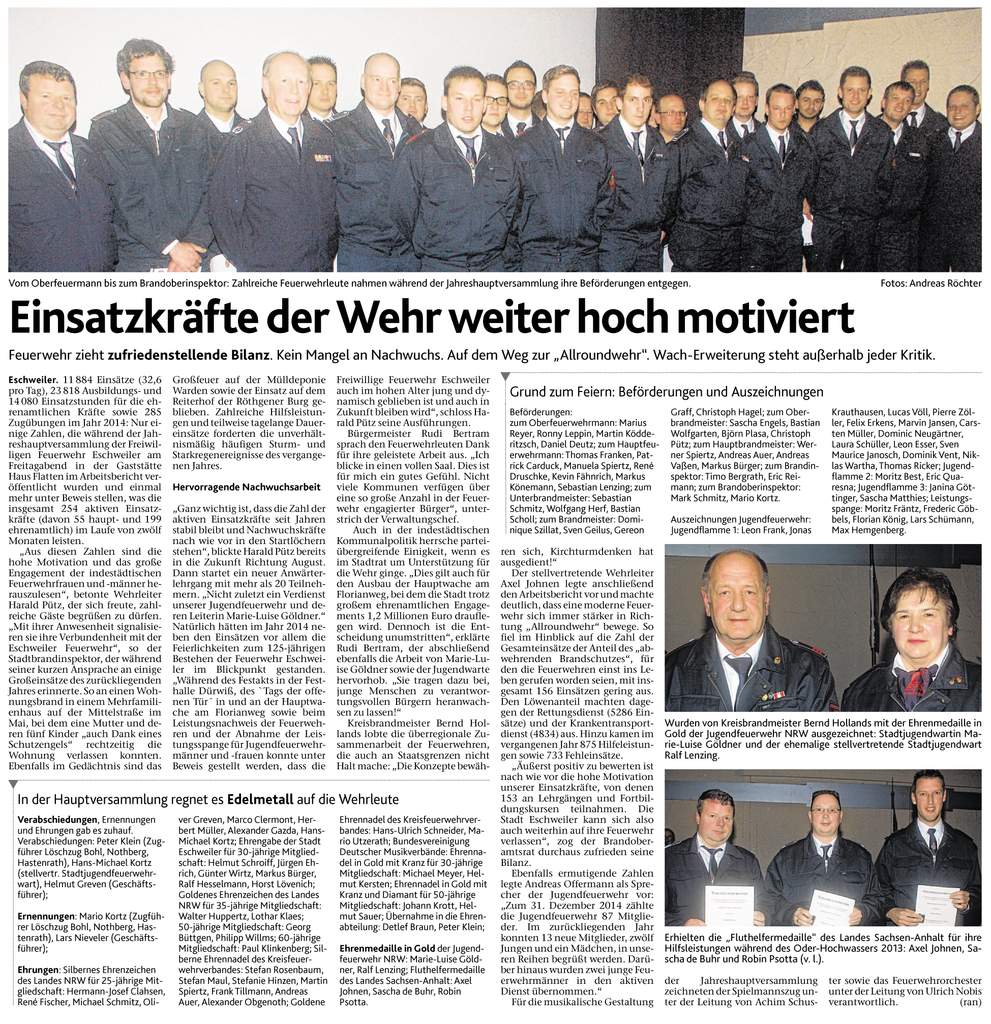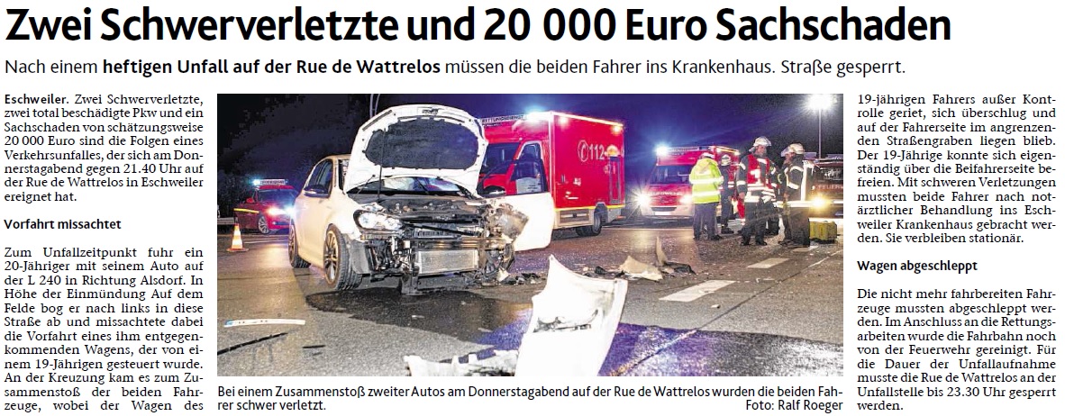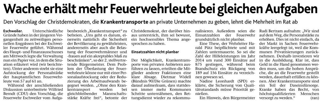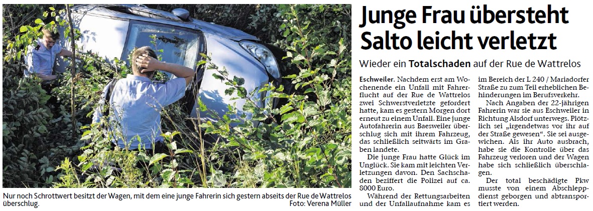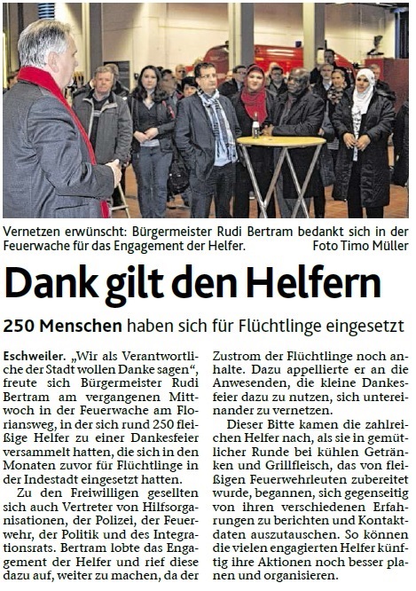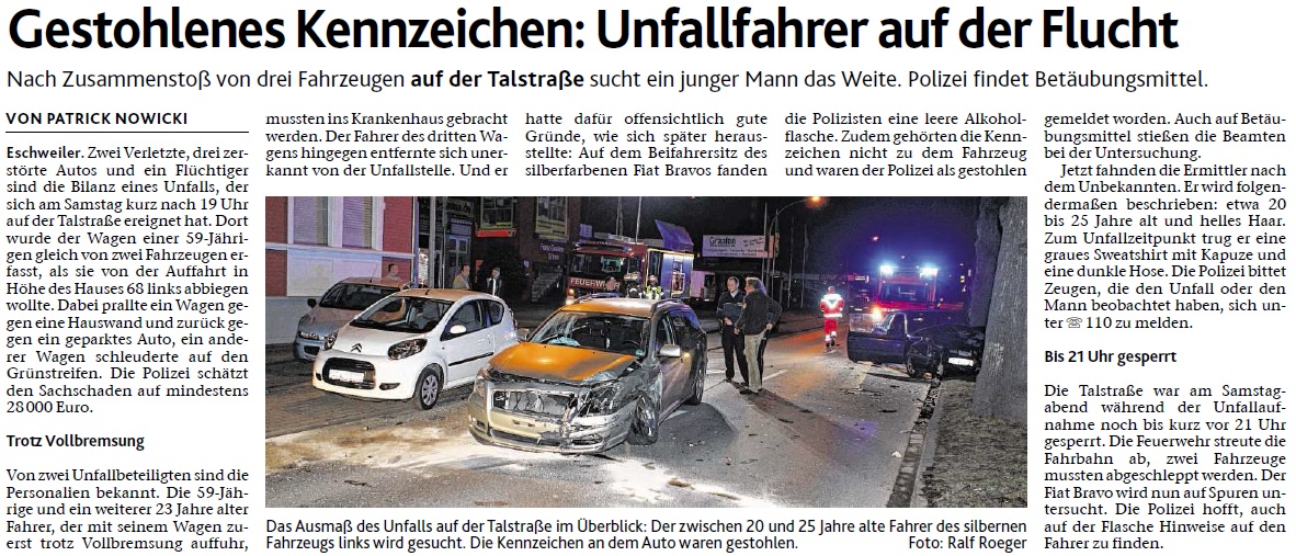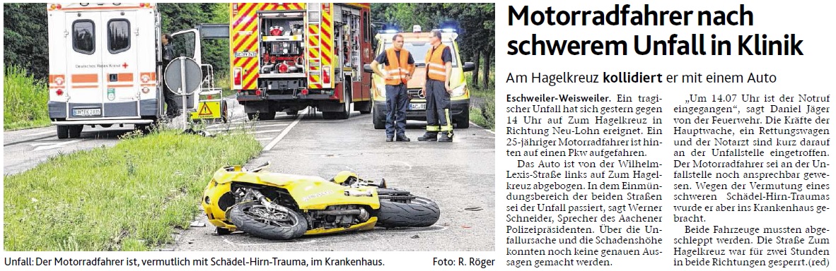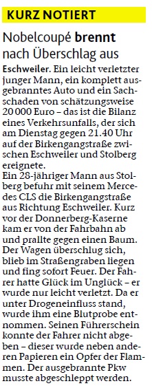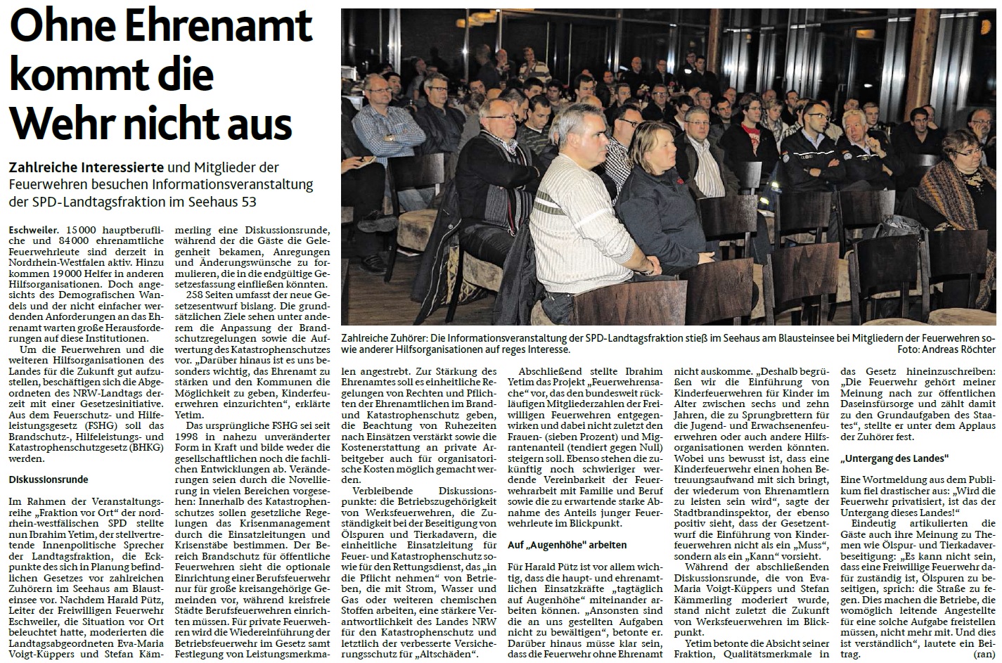 2015 21.12.2015 Sicherheitstipps zur Weihnachtszeit EN / EZ 21.12.2015 Kurz notiert: Bestätigt: Brandopfer... EN / EZ 19.12.2015 Toter bei Hausbrand in Kinzweiler EN / EZ 16.12.2015 Die letzten Handgriffe ... EN / EZ 15.12.2015 Dank gilt den Helfern EN / EZ 12.12.2015 Für den Richtigen Umgang mit der Säge EN / EZ 10.12.2015 14 Bewohner evakuiert: Feuer in einem Haus... EN / EZ 07.12.2015 Brennendes Matratzenlager ruft die Wehr auf... EN / EZ 02.12.2015 Schritt für Schritt in Richtung Feuerwehr-Zukunft EN / EZ 25.11.2015 Ohne Ehrenamt kommt die Wehr nicht aus EN / EZ 19.11.2015 Drossel im Kondensator macht ordentlich Qualm EN / EZ 19.11.2015 Kurz notiert: Nobelcoupé brennt nach Überschlag... EN / EZ 27.10.2015 Veteranen sind Vorbilder für die heutigen Wehrleute EN / EZ 23.10.2015 Kurz notiert: Unfall auf der A4 EN / EZ 22.10.2015 Kurz notiert: Amgebranntes Essen EN / EZ 14.10.2015 Die Feuerwehr der Stadt Eschweiler ... Filmpost 12.10.2015 "Internet Marsch!" bei der Feuerwehr EN / EZ 10.10.2015 Es freut uns EN / EZ 10.10.2015 Jugendfeuerwehr fit: Feuer gelöscht, ... EN / EZ 10.10.2015 Der Karnevalsvirus hat ihn (noch) nicht befallen EN / EZ 07.10.2015 Die Hälfte ist geschafft: ... Filmpost 05.10.2015 Kurz notiert: Topf auf Herd löst... EN / EZ 04.10.2015 Tödlicher Unfall auf der A 4 Super Sonntag 02.10.2015 Retter in spe nehmen zwei Hürden EN / EZ 02.10.2015 A4: In kurzer Zeit sterben drei Menschen EN / EZ 02.10.2015 Schwere Unfälle auf der A4 fordern... EN / EZ 30.09.2015 Junge Frau übersteht Salto leicht verletzt EN / EZ 29.09.2015 Aufgerissener Lkw verteilt Brot auf der A4 EN / EZ 29.09.2015 Kurz notiert: Unfall auf der A 4 EN / EZ 28.09.2015 Kurz notiert: Flüchtiger Fahrer lässt... EN / EZ 27.09.2015 Überholmanöver schlug fehl Super Sonntag 22.09.2015 Kleine Gäste üben sich im Schlauchkegeln EN / EZ 20.09.2015 Alle Situationen wurden mit Bravour gemeistert Super Sonntag 19.09.2015 Heute feiert die Weisweiler Wehr EN / EZ 16.09.2015 Großübung der Jugendfeuerwehren in der MVA Filmpost 12.09.2015 Zwei Schwerverletzte und 20000 Euro Sachschaden EN / EZ 10.09.2015 Großeinsatz an der MVA - alles Übung EN / EZ 10.09.2015 Stundenlange Sperrung auf A4 EN / EZ 27.08.2015 Nachwuchs probt den Ernstfall EN / EZ 24.08.2015 Feuer bringt Mutter mit drei Kindern um ihre Habe EN / EZ 23.08.2015 Wichtige Übung Super Sonntag 20.08.2015 Mehr Patienten und einige Nacktbader EN / EZ 18.08.2015 Auch Löschen und Retten muss gelernt sein EN / EZ 18.08.2015 Es ärgert uns,... EN / EZ 15.08.2015 52-Jähriger in Eschweiler zündet sich selbst an EN / EZ 11.08.2015 Kuchen, Cocktails, kühle Blonde EN / EZ 30.07.2015 Langeweile ist bei der Feuerwehr ein Fremdwort EN / EZ 27.07.2015 Kurz notiert: Zahlreiche Einsätze für die Feuerwehr EN / EZ 22.07.2015 Motorradfahrer nach schwerem Unfall in Klinik EN / EZ 21.07.2015 Hunderte strömen zum Wiesenfest der Wehr EN / EZ 20.07.2015 Kurz notiert: Kinzweiler Wehr wirft die Kohle ... EN / EZ 19.07.2015 Eschweiler Bürger besuchten den Landtag Super Sonntag 16.07.2015 Jagd nach der Jugendflamme EN / EZ 06.07.2015 Im kühlen Nass lauert der Tod EN / EZ 01.07.2015 Jugendfeuerwehren aus dem Kreis Aachen ... Filmpost 16.06.2015 Knoten, Stiche und knifflige Aufgaben EN / EZ 14.06.2015 Menschen aus Feuer gerettet Super Sonntag 10.06.2015 Feuerwehr rettet sechs Menschen das Leben EN / EZ 19.05.2015 Flammen vernichten Hanf-Plantage EN / EZ 02.04.2015 Auch dienstfreie Helfer während des Sturms ... EN / EZ 02.04.2015 Dramatischer Unfall auf der A4: ... EN / EZ 02.04.2015 Dramatische Szenen auf der A4 EN / EZ 01.04.2015 "Niklas" hat Indestadt im Griff EN / EZ 31.03.2015 Sie finden sich auch im Rauch zurecht EN / EZ 25.03.2015 Neues Domizil für Stadtmitte-Löschzüge EN / EZ 23.03.2015 Einsatzkräfte der Wehr hoch motiviert EN / EZ 23.03.2015 "Golden Hour": 60 dramatische Minuten EN / EZ 22.03.2015 Auf Florians Spuren Super Sonntag 17.03.2015 Soviel Engagement ist keineswegs ... EN / EZ 16.03.2015 Scheunendach am Bushof in Flammen EN / EZ 13.03.2015 Wache erhält mehr Feuerwehrleute ... EN / EZ 10.03.2015 Hart arbeitende Wehr soll´s leichter haben EN / EZ 02.03.2015 Gestohlenes Kennzeichen: Unfallfahrer ... EN / EZ 24.02.2015 Die Sirenen kehren auf die Dächer zurück EN / EZ 24.02.2015 Alter Öltank gerät bei Arbeiten in Flammen EN / EZ 20.02.2015 Sparsame Beleuchtung für die Wache EN / EZ 18.02.2015 Weniger Arbeit für die Retter EN / EZ 16.02.2015 Stefan Kaever trägt jetzt den Ehrenhelm EN / EZ 14.02.2015 Einer säuft, der andere sprüht Pfefferspray EN / EZ 08.02.2015 In den Ruhestand verabschiedet Super Sonntag 02.02.2015 Feuer in der Küche EN / EZ 24.01.2015 Feuerwehrleute fit für die Zukunft EN / EZ 21.01.2015 Schnee überrascht Fahrer auf der A4 EN / EZ 04.01.2015 Aus der Feuersbrunst gerettet Super Sonntag 02.01.2015 Wohnung brennt völlig aus EN / EZ
