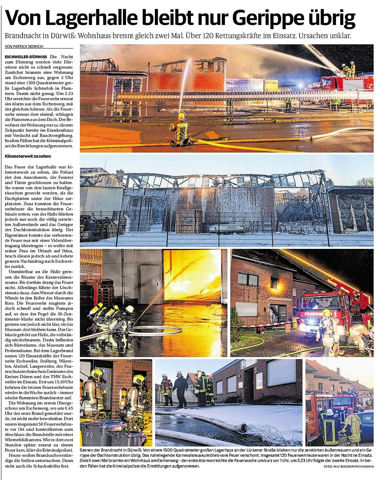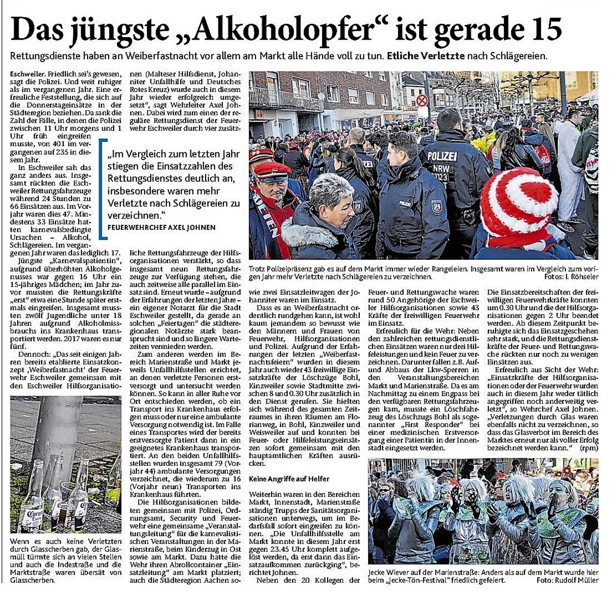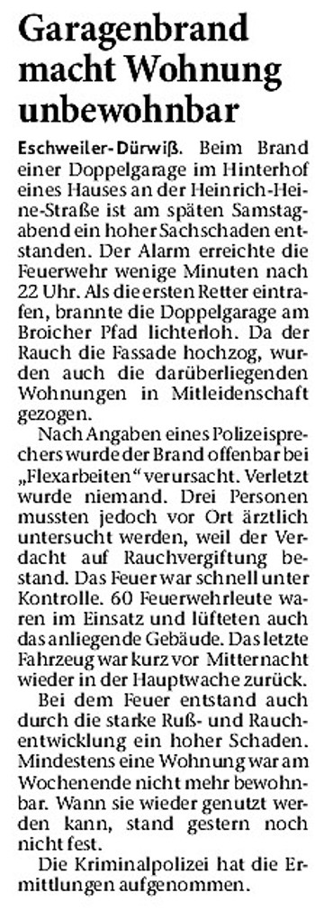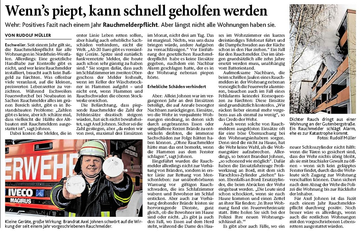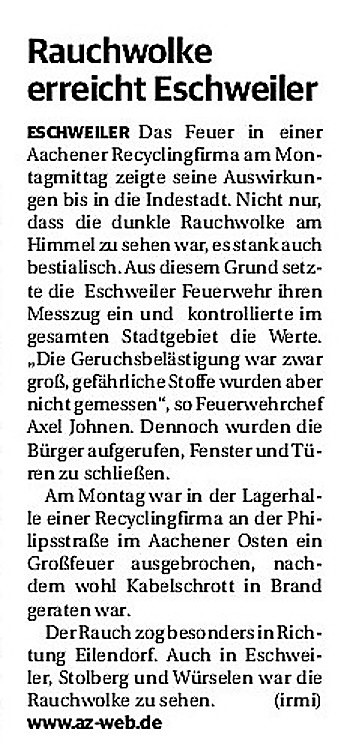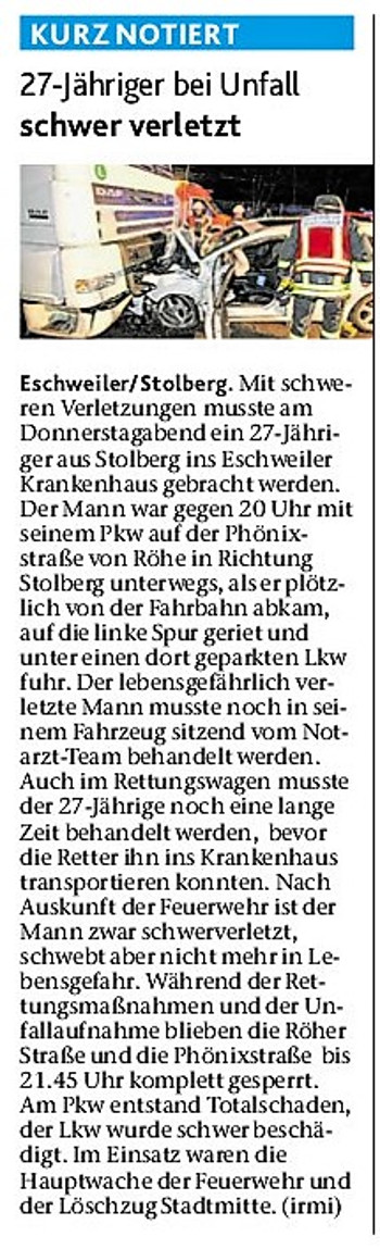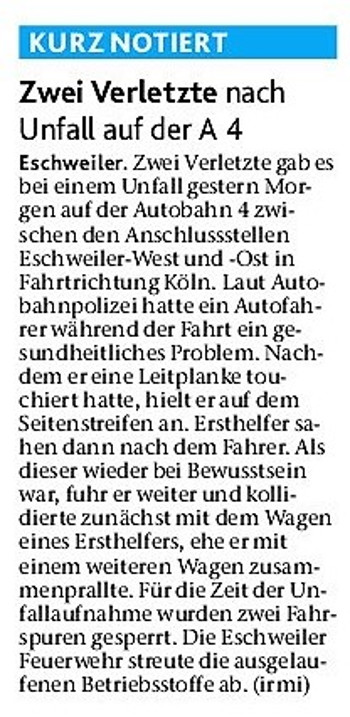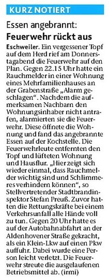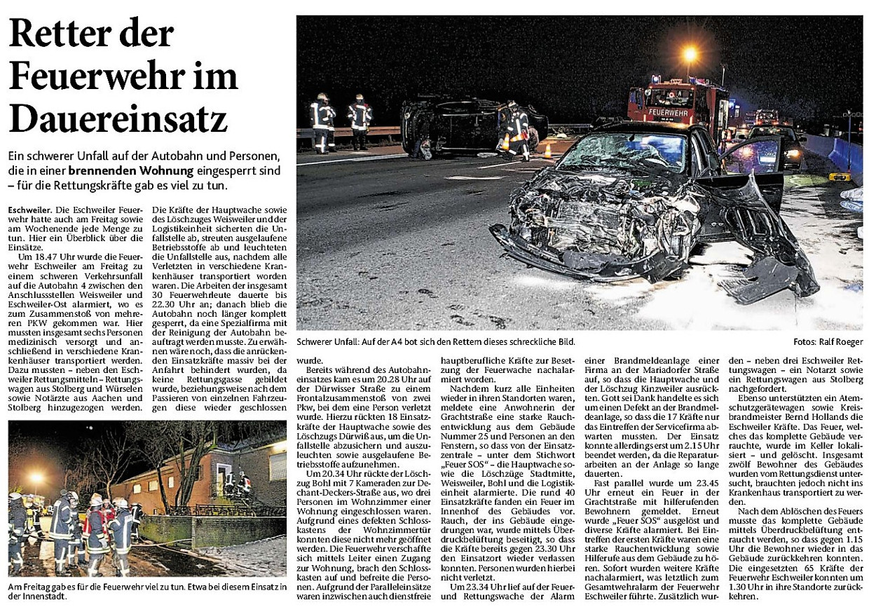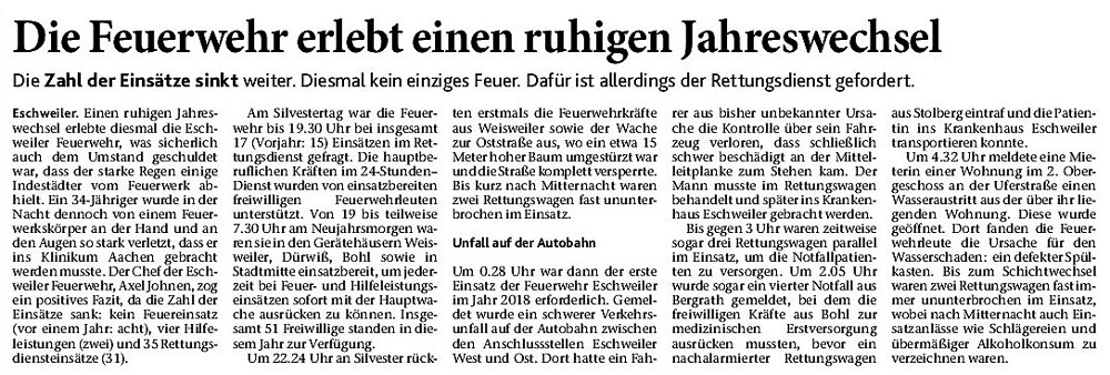 2018 31.12.2018 80-Jährige stirbt bei Brand in Nothberg EN / EZ 31.12.2018 Wenn Retter selbst zu Opfern werden EN / EZ 20.12.2018 Nach Kollision in Lebensgefahr EN / EZ 28.11.2018 Kurz Notiert - Rote Ampel übersehen EN / EZ 10.11.2018 Frontalzusammenstoß in Kinzweiler EN / EZ 08.11.2018 Auch ein Held braucht manchmal Hilfe EN / EZ 08.11.2018 Brandmeisterbewerbung mit Drehleiterübung EN / EZ 01.11.2018 Brandstiftung? Drei Autos brennen in Stich EN / EZ 24.10.2018 Hausfassade in Brand geraten EN / EZ 19.10.2018 Jahrestreffen der Ehrenabteilungen des Kreises EN / EZ 15.10.2018 20 jähriger fährt auf Motorradgruppe EN / EZ 10.10.2018 Abschluss Grundlehrgang Modul EN / EZ 04.10.2018 Jugendfeuerwehr - Gemeinsam im Ernstfall EN / EZ 01.10.2018 Die zwölfte Auflage des B 1 - Lehrgangs EN / EZ 29.09.2018 Verwaltung umstrukturiert - Amt 37 EN / EZ 27.09.2018 Tonnenweise Ecstasy-Chemiemüll? EN / EZ 19.09.2018 Von Lagerhalle bleibt nur Gerippe übrig EN / EZ 04.09.2018 Löschzug 21 - Tag der Feuerwehr EN / EZ 30.08.2018 Kreisbrandmeister Bernd Hollands EN / EZ 28.08.2018 Rauchwolke erreicht Eschweiler EN / EZ 24.08.2018 Feuer zu löschen, ist inzwischen Ausnahme EN / EZ 22.08.2018 Zwei neue Einsatzfahrzeuge EN / EZ 10.08.2018 Und plötzlich bricht die Fassade weg EN / EZ 26.07.2018 Zwischen Vorsatz und Fahrlässigkeit EN / EZ 25.07.2018 Hitzewelle und Waldbrandgefahr EN / EZ 24.07.2018 Wehrleute bei einem dreitägigen Seminar EN / EZ 21.07.2018 Nächtlicher Schwimmer löst Großalarm aus EN / EZ 11.07.2018 Ein Unfall, der sich gewaschen hat EN / EZ 09.07.2018 Ein Flammenmeer im dritten Stock EN / EZ 06.07.2018 86 Liter Säure laufen aus EN / EZ 04.07.2018 Es freut uns EN / EZ 27.06.2018 Akute Platznot in den Rettungswachen EN / EZ 26.06.2018 Feuer vernichtet Kranwagen und Trafo EN / EZ 22.06.2018 Die Feuerwehr bekommt ein eigenes Amt EN / EZ 21.06.2018 Zwei schwere Zusammenstöße mit Verletzten EN / EZ 21.06.2018 Triatlon-Training löst Feuerwehreinatz aus EN / EZ 19.06.2018 Leistungsnachweis der Städteregion EN / EZ 05.06.2018 Unfall auf der Aachener Straße EN / EZ 28.05.2018 Garagenbrand in Dürwiß EN / EZ 01.05.2018 Überflutete Straßen und Keller EN / EZ 23.04.2018 Retter proben den Ernstfall EN / EZ 23.04.2018 Auffahrunfall zweier Busse und Hallenbrand EN / EZ 13.04.2018 Einladung - 6. Rettungsübung am Florianweg EN / EZ 10.04.2018 Der 13. Interkommunale B1-Lehrgang startet EN / EZ 09.04.2018 Dicke Luft in der Indestadt EN / EZ 03.04.2018 Lagerhalle an der Grachtstraße Raub der Flammen EN / EZ 23.03.2018 Verpuffung im Elektrowerk Weisweiler EN / EZ 23.03.2018 Jahreshauptversammlung der Feuerwehr Eschweiler EN / EZ 16.03.2018 Jahreshauptversammlung der Jugendfeuerwehr EN / EZ 10.03.2018 Hohe Einsatzzahlen des Rettungsdienstes EN / EZ 24.02.2018 Kamin steht in Flammen EN / EZ 20.02.2018 Kurz Notiert - Feuer in Hastenrath EN / EZ 14.02.2018 Reizgasangriff am Markt EN / EZ 12.02.2018 Prinzenempfang mit Überraschungen EN / EZ 12.02.2018 Retter der Feuerwehr im Dauereinsatz EN / EZ 10.02.2018 Vor allem am Markt alle Hände voll zu tun EN / EZ 09.02.2018 Nicht alle feiern friedlich EN / EZ 06.02.2018 Kurz Notiert - Zwei Verletzte auf der A 4 EN / EZ 03.02.2018 Kurz Notiert - Essen angebrannt EN / EZ 27.01.2018 Kurz Notiert - Bei Unfall schwer verletzt EN / EZ 24.01.2018 Liebes Tagebuch - Gerätehaus Dürwiß EN / EZ 19.01.2018 Sturm hinterlässt Sach- und Dachschaden EN / EZ 18.01.2018 Abschleppwagen ein Raub der Flammen EN / EZ 12.01.2018 Nach einem Jahr Rauchmelderpflicht EN / EZ 05.01.2018 Entwarnung erst nach 16 harten Stunden EN / EZ 04.01.2018 Tief "Burglind" EN / EZ 02.01.2018 Die Feuerwehr erlebt einen ruhigen Jahreswechsel EN / EZ