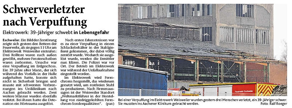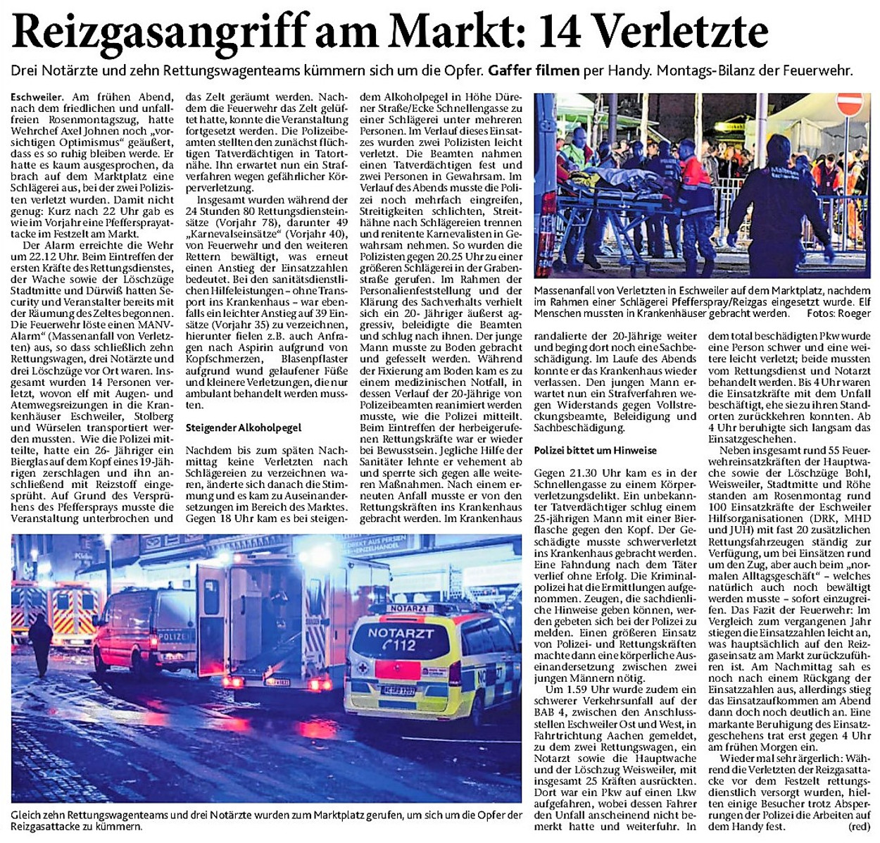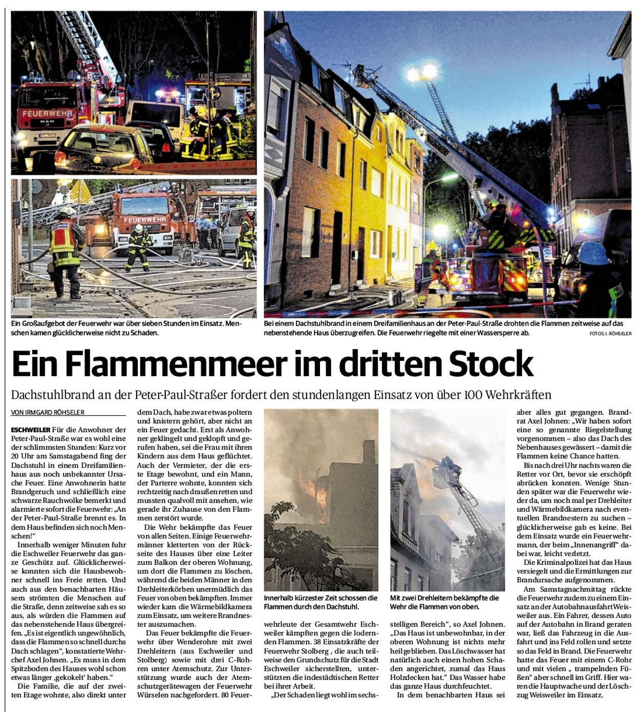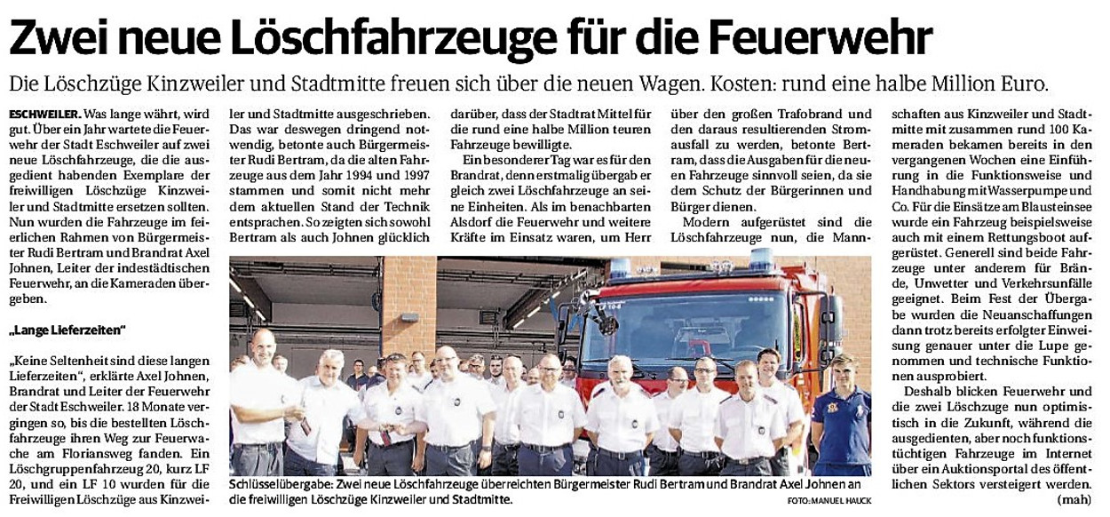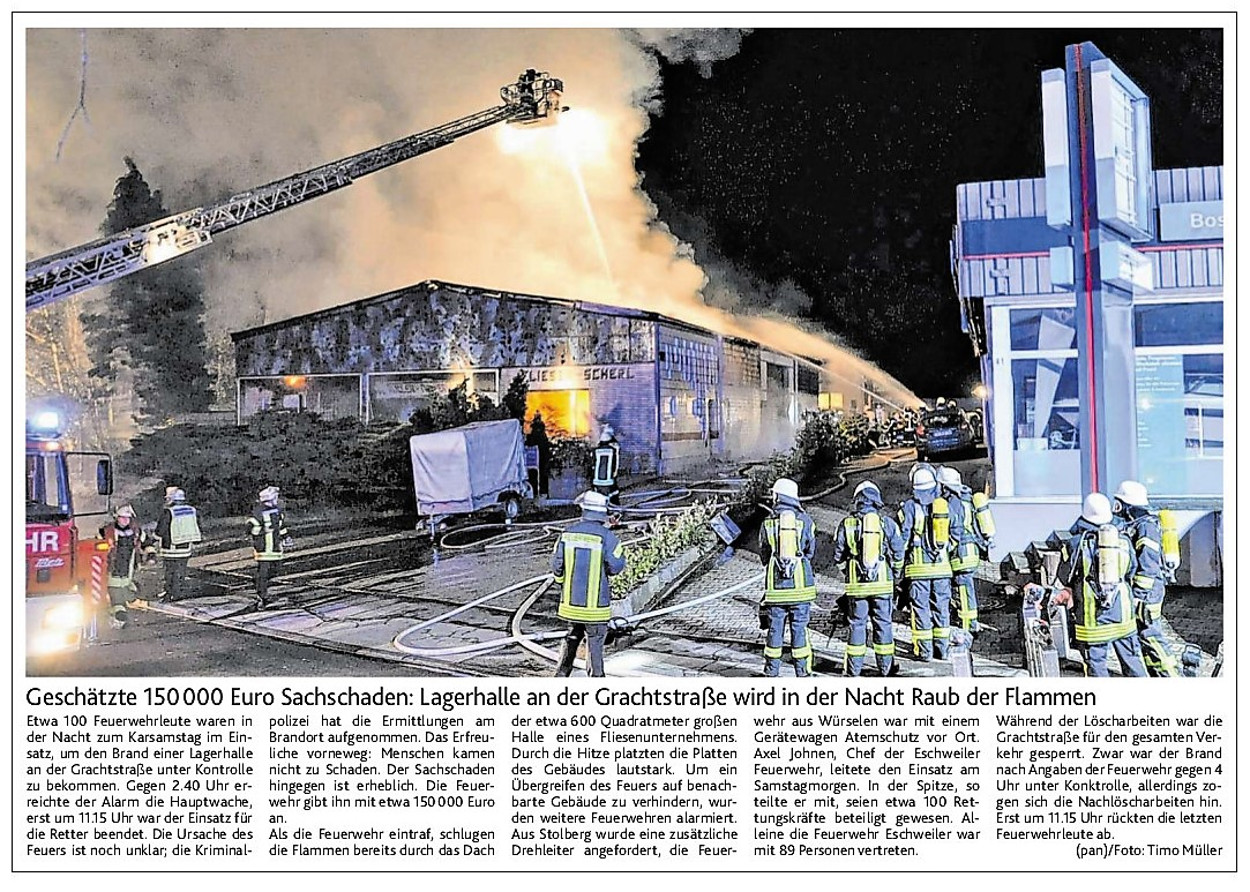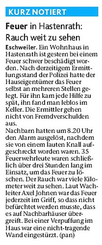 2018 31.12.2018 80-Jährige stirbt bei Brand in Nothberg EN / EZ 31.12.2018 Wenn Retter selbst zu Opfern werden EN / EZ 20.12.2018 Nach Kollision in Lebensgefahr EN / EZ 28.11.2018 Kurz Notiert - Rote Ampel übersehen EN / EZ 10.11.2018 Frontalzusammenstoß in Kinzweiler EN / EZ 08.11.2018 Auch ein Held braucht manchmal Hilfe EN / EZ 08.11.2018 Brandmeisterbewerbung mit Drehleiterübung EN / EZ 01.11.2018 Brandstiftung? Drei Autos brennen in Stich EN / EZ 24.10.2018 Hausfassade in Brand geraten EN / EZ 19.10.2018 Jahrestreffen der Ehrenabteilungen des Kreises EN / EZ 15.10.2018 20 jähriger fährt auf Motorradgruppe EN / EZ 10.10.2018 Abschluss Grundlehrgang Modul EN / EZ 04.10.2018 Jugendfeuerwehr - Gemeinsam im Ernstfall EN / EZ 01.10.2018 Die zwölfte Auflage des B 1 - Lehrgangs EN / EZ 29.09.2018 Verwaltung umstrukturiert - Amt 37 EN / EZ 27.09.2018 Tonnenweise Ecstasy-Chemiemüll? EN / EZ 19.09.2018 Von Lagerhalle bleibt nur Gerippe übrig EN / EZ 04.09.2018 Löschzug 21 - Tag der Feuerwehr EN / EZ 30.08.2018 Kreisbrandmeister Bernd Hollands EN / EZ 28.08.2018 Rauchwolke erreicht Eschweiler EN / EZ 24.08.2018 Feuer zu löschen, ist inzwischen Ausnahme EN / EZ 22.08.2018 Zwei neue Einsatzfahrzeuge EN / EZ 10.08.2018 Und plötzlich bricht die Fassade weg EN / EZ 26.07.2018 Zwischen Vorsatz und Fahrlässigkeit EN / EZ 25.07.2018 Hitzewelle und Waldbrandgefahr EN / EZ 24.07.2018 Wehrleute bei einem dreitägigen Seminar EN / EZ 21.07.2018 Nächtlicher Schwimmer löst Großalarm aus EN / EZ 11.07.2018 Ein Unfall, der sich gewaschen hat EN / EZ 09.07.2018 Ein Flammenmeer im dritten Stock EN / EZ 06.07.2018 86 Liter Säure laufen aus EN / EZ 04.07.2018 Es freut uns EN / EZ 27.06.2018 Akute Platznot in den Rettungswachen EN / EZ 26.06.2018 Feuer vernichtet Kranwagen und Trafo EN / EZ 22.06.2018 Die Feuerwehr bekommt ein eigenes Amt EN / EZ 21.06.2018 Zwei schwere Zusammenstöße mit Verletzten EN / EZ 21.06.2018 Triatlon-Training löst Feuerwehreinatz aus EN / EZ 19.06.2018 Leistungsnachweis der Städteregion EN / EZ 05.06.2018 Unfall auf der Aachener Straße EN / EZ 28.05.2018 Garagenbrand in Dürwiß EN / EZ 01.05.2018 Überflutete Straßen und Keller EN / EZ 23.04.2018 Retter proben den Ernstfall EN / EZ 23.04.2018 Auffahrunfall zweier Busse und Hallenbrand EN / EZ 13.04.2018 Einladung - 6. Rettungsübung am Florianweg EN / EZ 10.04.2018 Der 13. Interkommunale B1-Lehrgang startet EN / EZ 09.04.2018 Dicke Luft in der Indestadt EN / EZ 03.04.2018 Lagerhalle an der Grachtstraße Raub der Flammen EN / EZ 23.03.2018 Verpuffung im Elektrowerk Weisweiler EN / EZ 23.03.2018 Jahreshauptversammlung der Feuerwehr Eschweiler EN / EZ 16.03.2018 Jahreshauptversammlung der Jugendfeuerwehr EN / EZ 10.03.2018 Hohe Einsatzzahlen des Rettungsdienstes EN / EZ 24.02.2018 Kamin steht in Flammen EN / EZ 20.02.2018 Kurz Notiert - Feuer in Hastenrath EN / EZ 14.02.2018 Reizgasangriff am Markt EN / EZ 12.02.2018 Prinzenempfang mit Überraschungen EN / EZ 12.02.2018 Retter der Feuerwehr im Dauereinsatz EN / EZ 10.02.2018 Vor allem am Markt alle Hände voll zu tun EN / EZ 09.02.2018 Nicht alle feiern friedlich EN / EZ 06.02.2018 Kurz Notiert - Zwei Verletzte auf der A 4 EN / EZ 03.02.2018 Kurz Notiert - Essen angebrannt EN / EZ 27.01.2018 Kurz Notiert - Bei Unfall schwer verletzt EN / EZ 24.01.2018 Liebes Tagebuch - Gerätehaus Dürwiß EN / EZ 19.01.2018 Sturm hinterlässt Sach- und Dachschaden EN / EZ 18.01.2018 Abschleppwagen ein Raub der Flammen EN / EZ 12.01.2018 Nach einem Jahr Rauchmelderpflicht EN / EZ 05.01.2018 Entwarnung erst nach 16 harten Stunden EN / EZ 04.01.2018 Tief "Burglind" EN / EZ 02.01.2018 Die Feuerwehr erlebt einen ruhigen Jahreswechsel EN / EZ