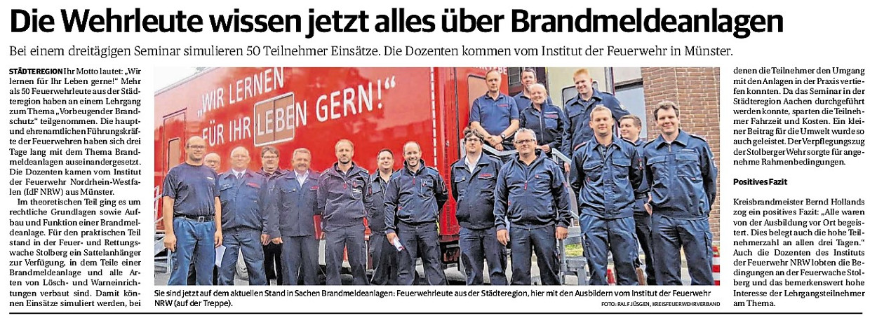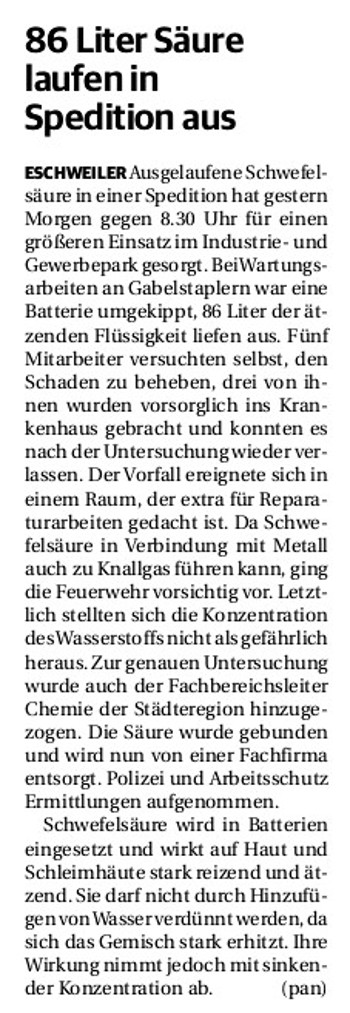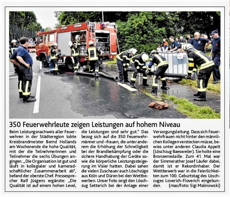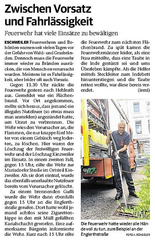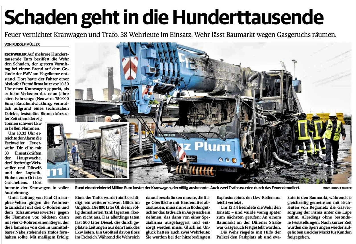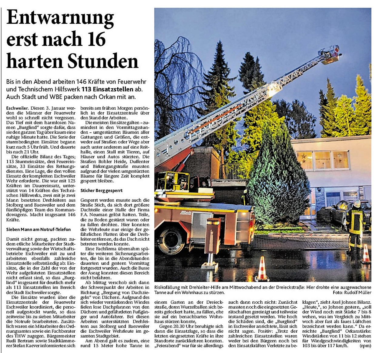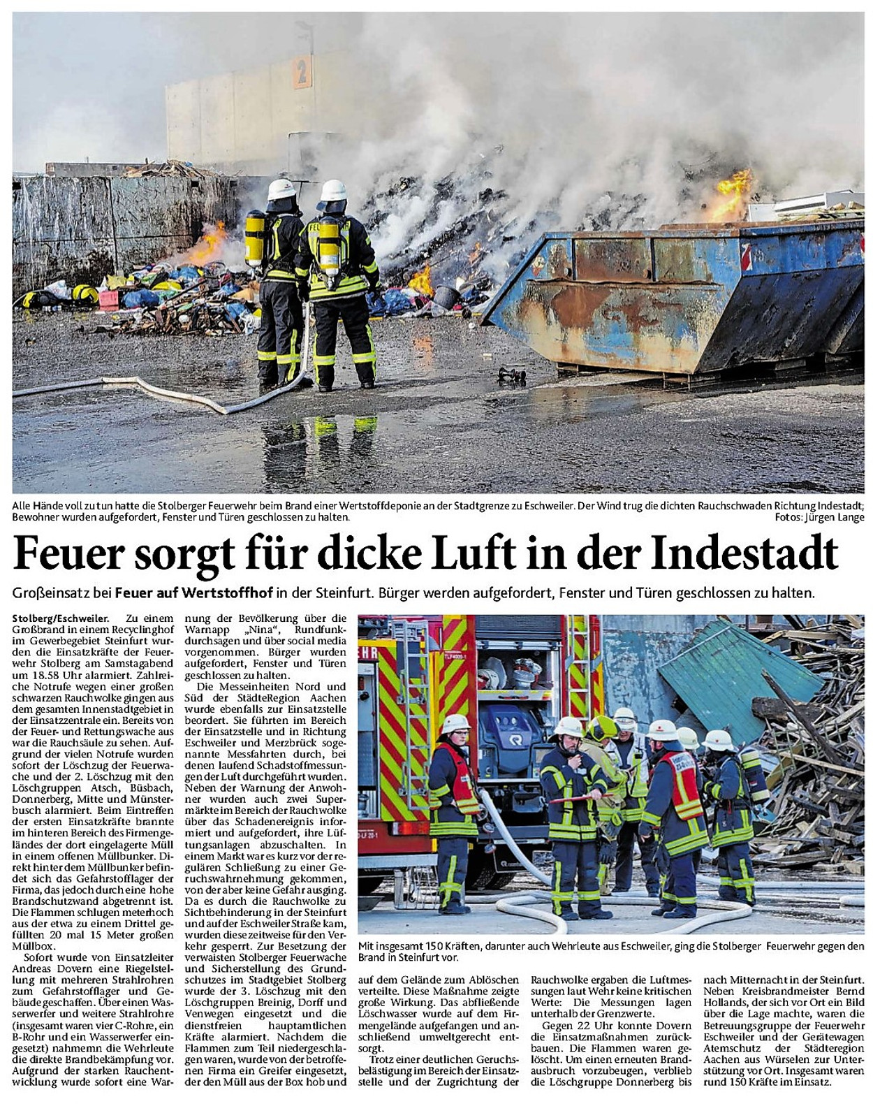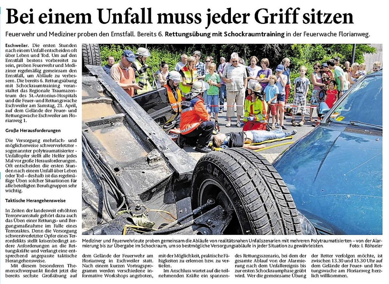 2018 31.12.2018 80-Jährige stirbt bei Brand in Nothberg EN / EZ 31.12.2018 Wenn Retter selbst zu Opfern werden EN / EZ 20.12.2018 Nach Kollision in Lebensgefahr EN / EZ 28.11.2018 Kurz Notiert - Rote Ampel übersehen EN / EZ 10.11.2018 Frontalzusammenstoß in Kinzweiler EN / EZ 08.11.2018 Auch ein Held braucht manchmal Hilfe EN / EZ 08.11.2018 Brandmeisterbewerbung mit Drehleiterübung EN / EZ 01.11.2018 Brandstiftung? Drei Autos brennen in Stich EN / EZ 24.10.2018 Hausfassade in Brand geraten EN / EZ 19.10.2018 Jahrestreffen der Ehrenabteilungen des Kreises EN / EZ 15.10.2018 20 jähriger fährt auf Motorradgruppe EN / EZ 10.10.2018 Abschluss Grundlehrgang Modul EN / EZ 04.10.2018 Jugendfeuerwehr - Gemeinsam im Ernstfall EN / EZ 01.10.2018 Die zwölfte Auflage des B 1 - Lehrgangs EN / EZ 29.09.2018 Verwaltung umstrukturiert - Amt 37 EN / EZ 27.09.2018 Tonnenweise Ecstasy-Chemiemüll? EN / EZ 19.09.2018 Von Lagerhalle bleibt nur Gerippe übrig EN / EZ 04.09.2018 Löschzug 21 - Tag der Feuerwehr EN / EZ 30.08.2018 Kreisbrandmeister Bernd Hollands EN / EZ 28.08.2018 Rauchwolke erreicht Eschweiler EN / EZ 24.08.2018 Feuer zu löschen, ist inzwischen Ausnahme EN / EZ 22.08.2018 Zwei neue Einsatzfahrzeuge EN / EZ 10.08.2018 Und plötzlich bricht die Fassade weg EN / EZ 26.07.2018 Zwischen Vorsatz und Fahrlässigkeit EN / EZ 25.07.2018 Hitzewelle und Waldbrandgefahr EN / EZ 24.07.2018 Wehrleute bei einem dreitägigen Seminar EN / EZ 21.07.2018 Nächtlicher Schwimmer löst Großalarm aus EN / EZ 11.07.2018 Ein Unfall, der sich gewaschen hat EN / EZ 09.07.2018 Ein Flammenmeer im dritten Stock EN / EZ 06.07.2018 86 Liter Säure laufen aus EN / EZ 04.07.2018 Es freut uns EN / EZ 27.06.2018 Akute Platznot in den Rettungswachen EN / EZ 26.06.2018 Feuer vernichtet Kranwagen und Trafo EN / EZ 22.06.2018 Die Feuerwehr bekommt ein eigenes Amt EN / EZ 21.06.2018 Zwei schwere Zusammenstöße mit Verletzten EN / EZ 21.06.2018 Triatlon-Training löst Feuerwehreinatz aus EN / EZ 19.06.2018 Leistungsnachweis der Städteregion EN / EZ 05.06.2018 Unfall auf der Aachener Straße EN / EZ 28.05.2018 Garagenbrand in Dürwiß EN / EZ 01.05.2018 Überflutete Straßen und Keller EN / EZ 23.04.2018 Retter proben den Ernstfall EN / EZ 23.04.2018 Auffahrunfall zweier Busse und Hallenbrand EN / EZ 13.04.2018 Einladung - 6. Rettungsübung am Florianweg EN / EZ 10.04.2018 Der 13. Interkommunale B1-Lehrgang startet EN / EZ 09.04.2018 Dicke Luft in der Indestadt EN / EZ 03.04.2018 Lagerhalle an der Grachtstraße Raub der Flammen EN / EZ 23.03.2018 Verpuffung im Elektrowerk Weisweiler EN / EZ 23.03.2018 Jahreshauptversammlung der Feuerwehr Eschweiler EN / EZ 16.03.2018 Jahreshauptversammlung der Jugendfeuerwehr EN / EZ 10.03.2018 Hohe Einsatzzahlen des Rettungsdienstes EN / EZ 24.02.2018 Kamin steht in Flammen EN / EZ 20.02.2018 Kurz Notiert - Feuer in Hastenrath EN / EZ 14.02.2018 Reizgasangriff am Markt EN / EZ 12.02.2018 Prinzenempfang mit Überraschungen EN / EZ 12.02.2018 Retter der Feuerwehr im Dauereinsatz EN / EZ 10.02.2018 Vor allem am Markt alle Hände voll zu tun EN / EZ 09.02.2018 Nicht alle feiern friedlich EN / EZ 06.02.2018 Kurz Notiert - Zwei Verletzte auf der A 4 EN / EZ 03.02.2018 Kurz Notiert - Essen angebrannt EN / EZ 27.01.2018 Kurz Notiert - Bei Unfall schwer verletzt EN / EZ 24.01.2018 Liebes Tagebuch - Gerätehaus Dürwiß EN / EZ 19.01.2018 Sturm hinterlässt Sach- und Dachschaden EN / EZ 18.01.2018 Abschleppwagen ein Raub der Flammen EN / EZ 12.01.2018 Nach einem Jahr Rauchmelderpflicht EN / EZ 05.01.2018 Entwarnung erst nach 16 harten Stunden EN / EZ 04.01.2018 Tief "Burglind" EN / EZ 02.01.2018 Die Feuerwehr erlebt einen ruhigen Jahreswechsel EN / EZ